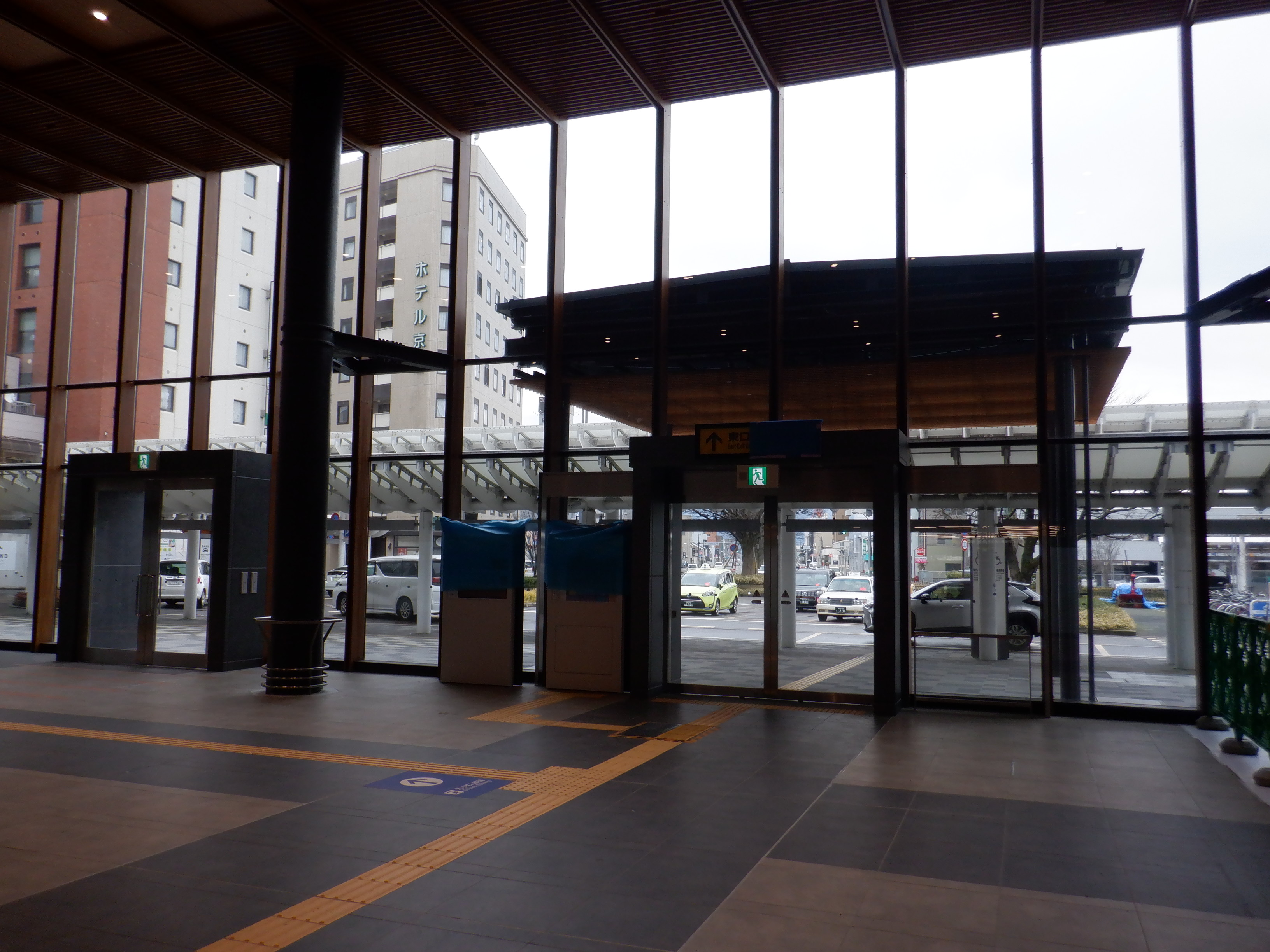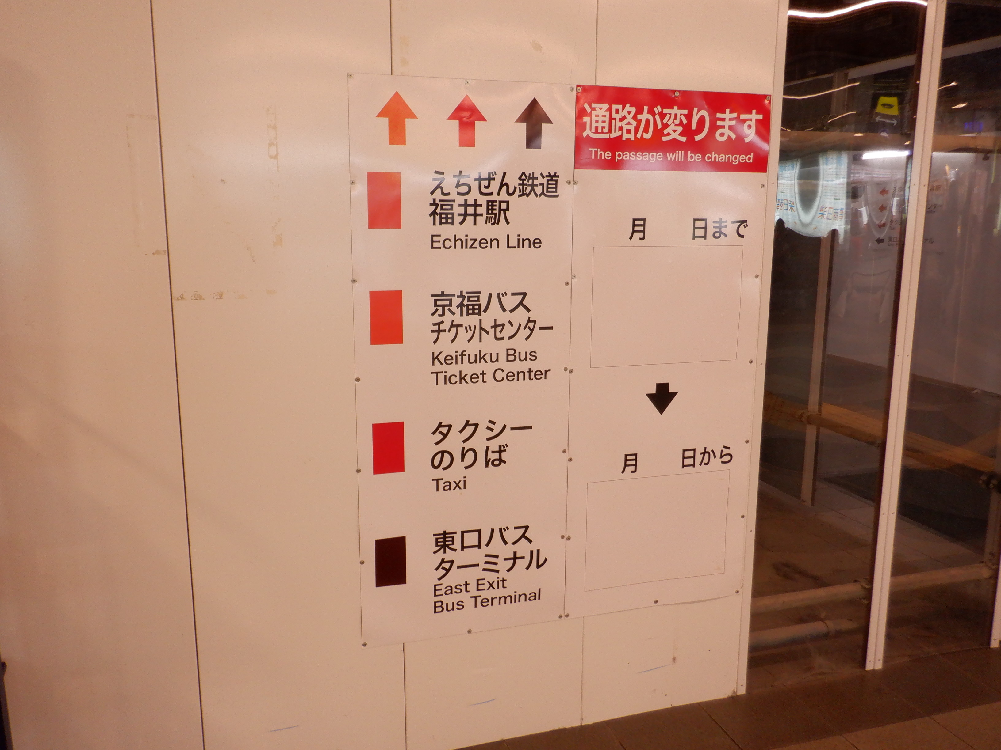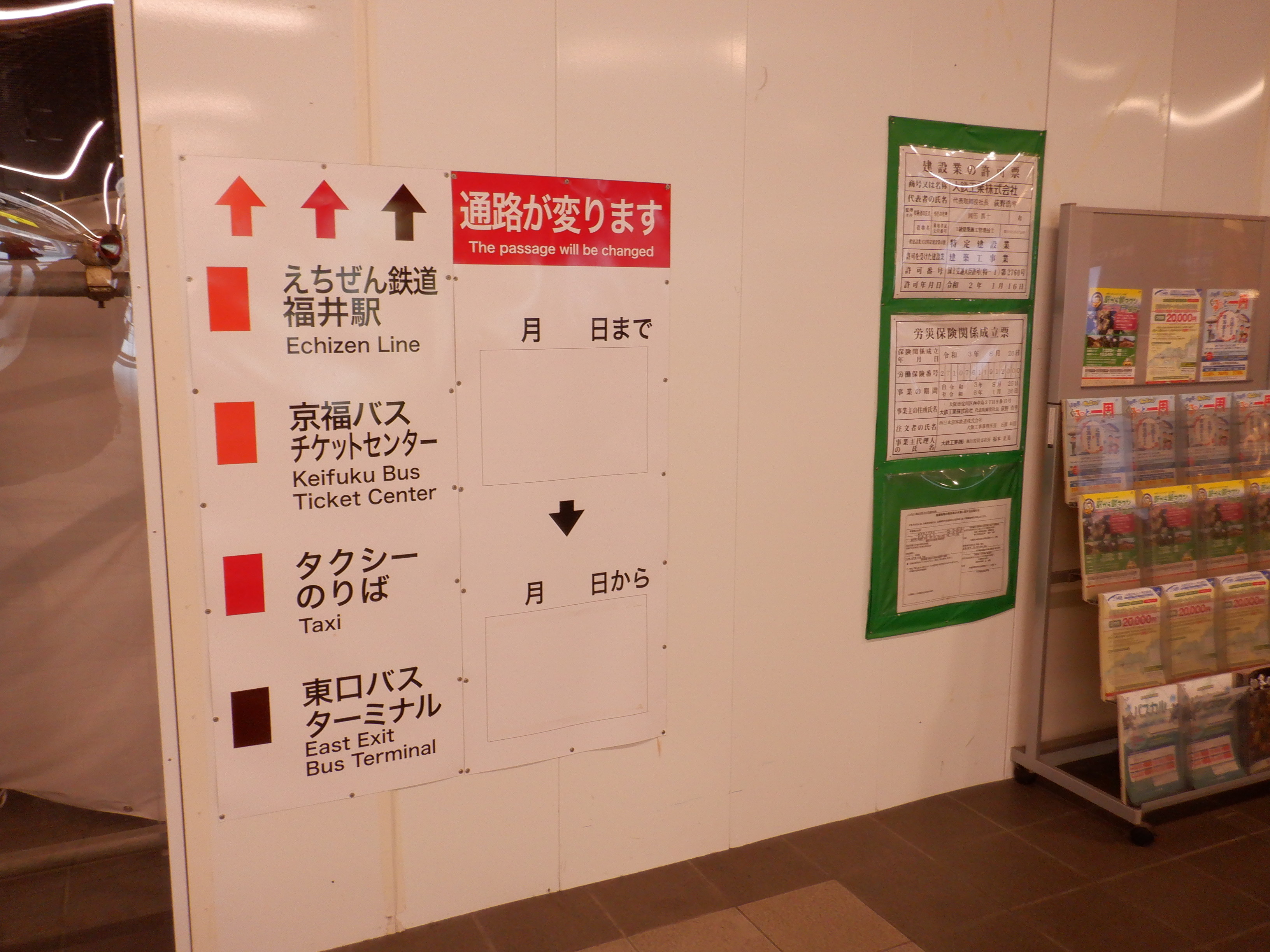 西口から東口へ、えちぜん鉄道福井駅の新福井駅側に抜ける高架下。トイレの部分が工事中のようです。