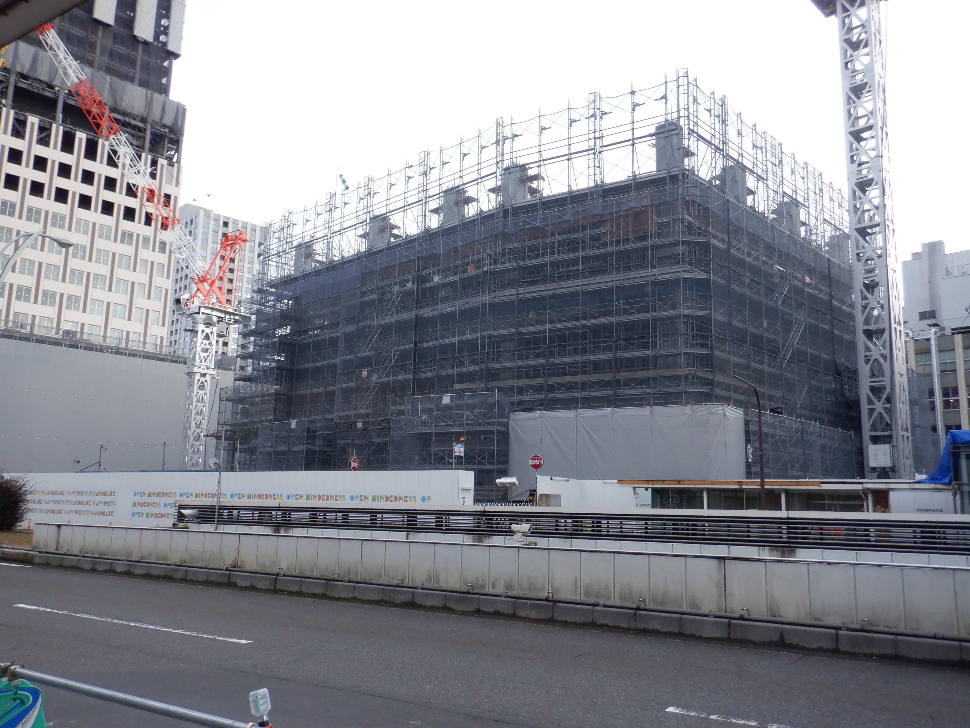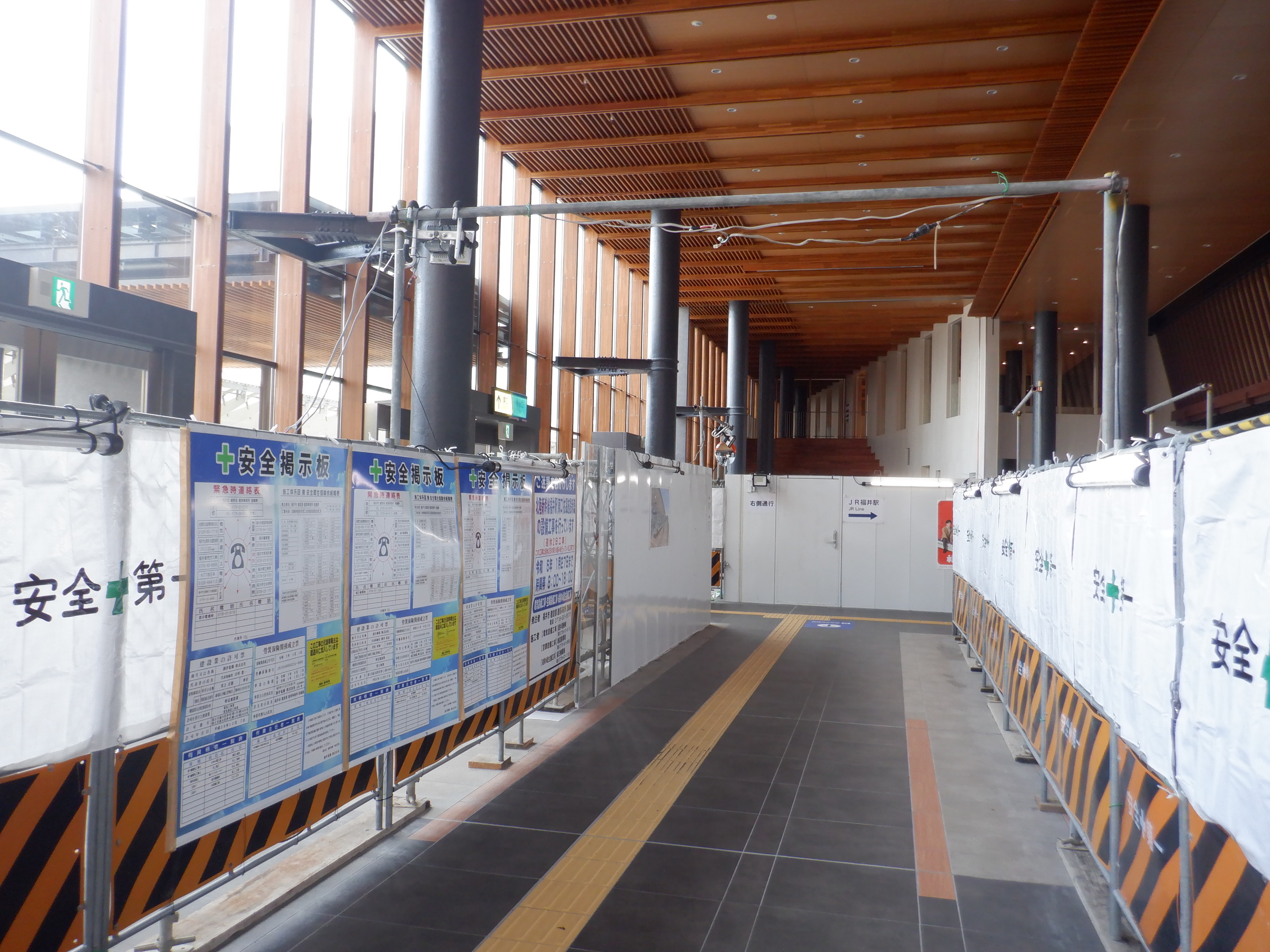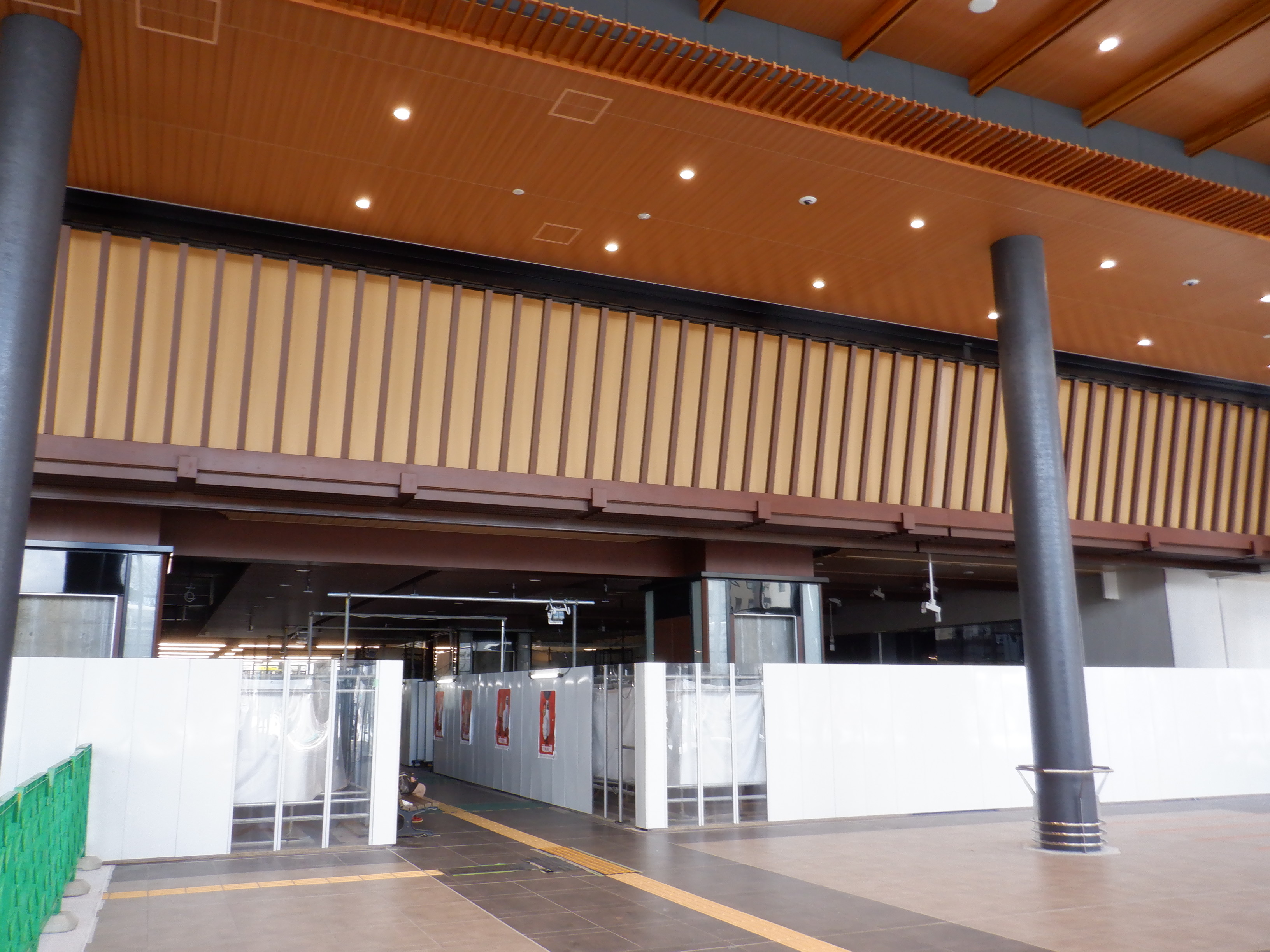 拡張施設周辺の工事が進んでいます。また、乗換改札口になるところに看板らしきものが取り付けられました。
