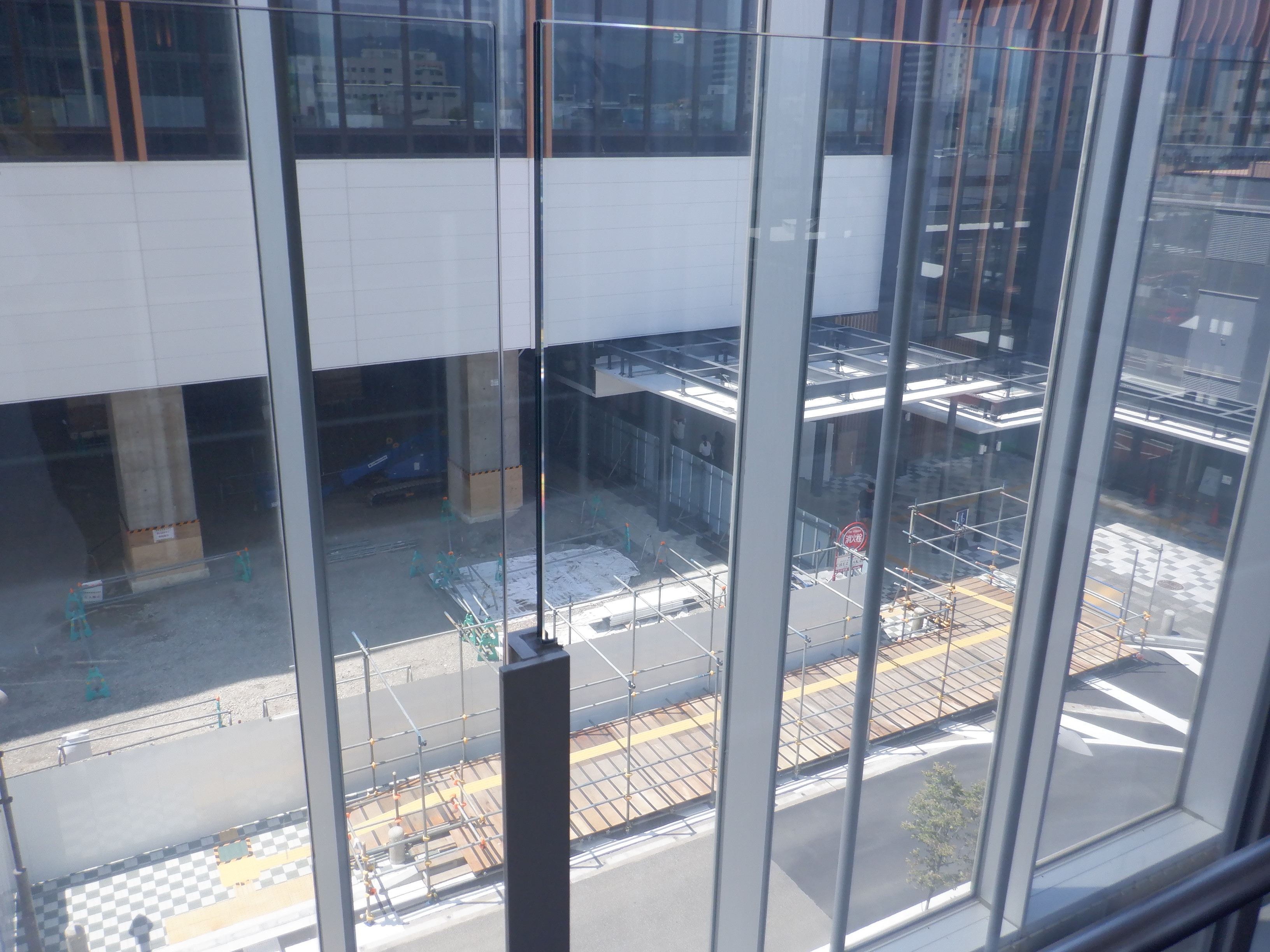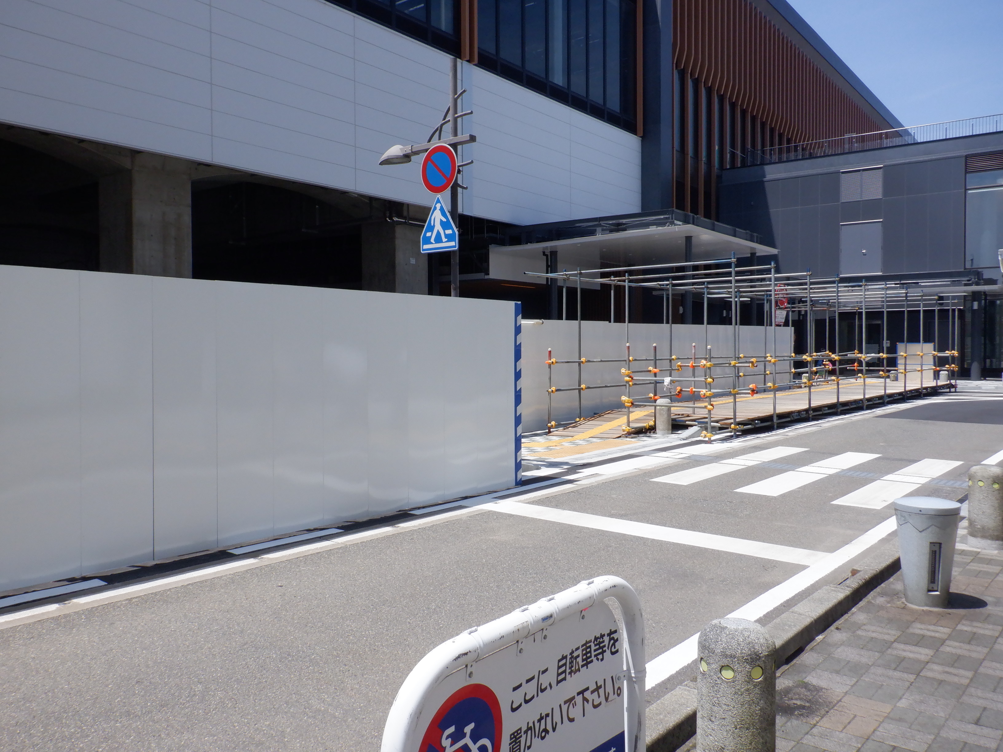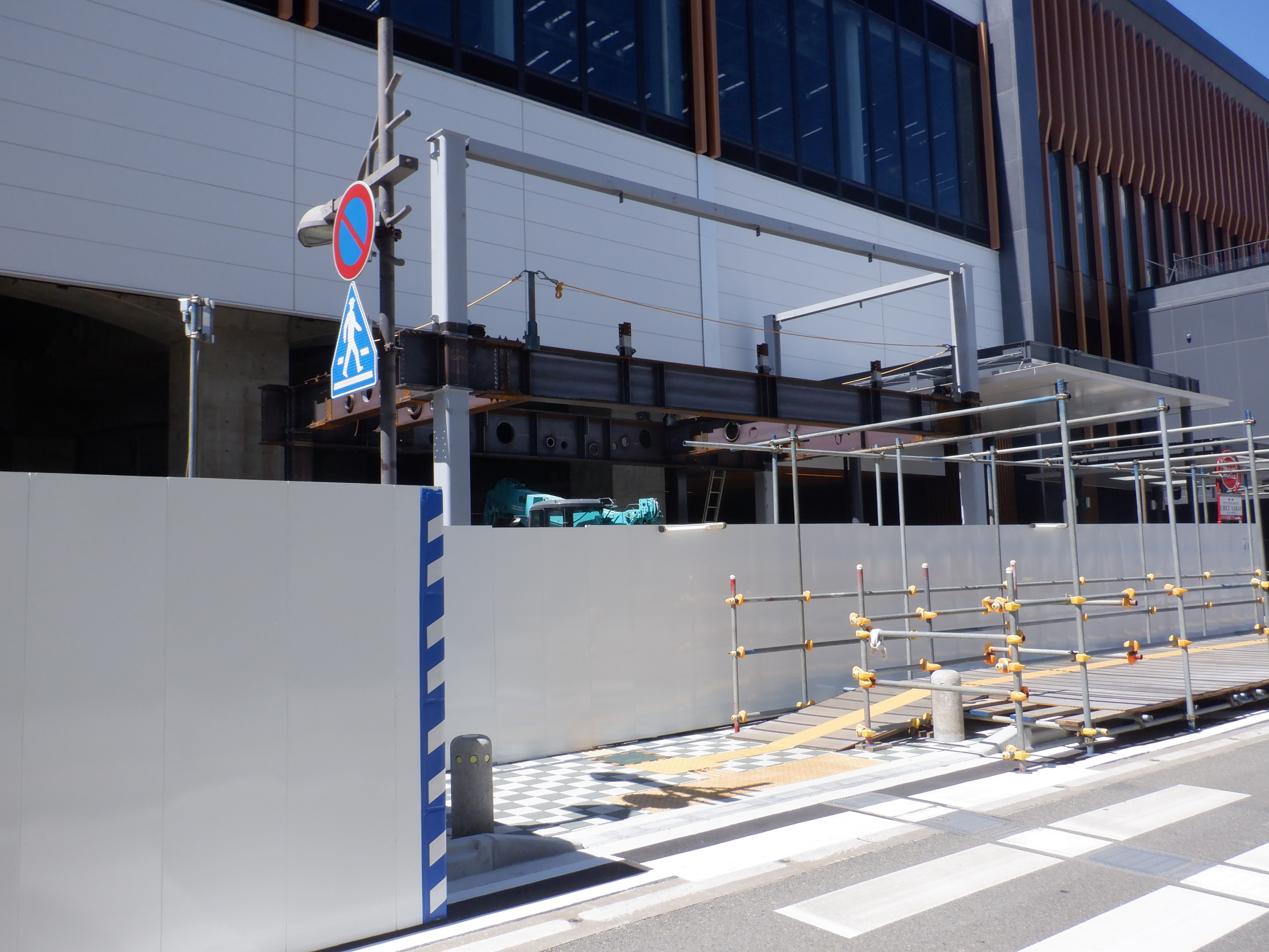 アオッサの前付近から。新しい商業施設建設が始まったことと、アオッサ側に渡る部分の前に仮設の通路ができました。