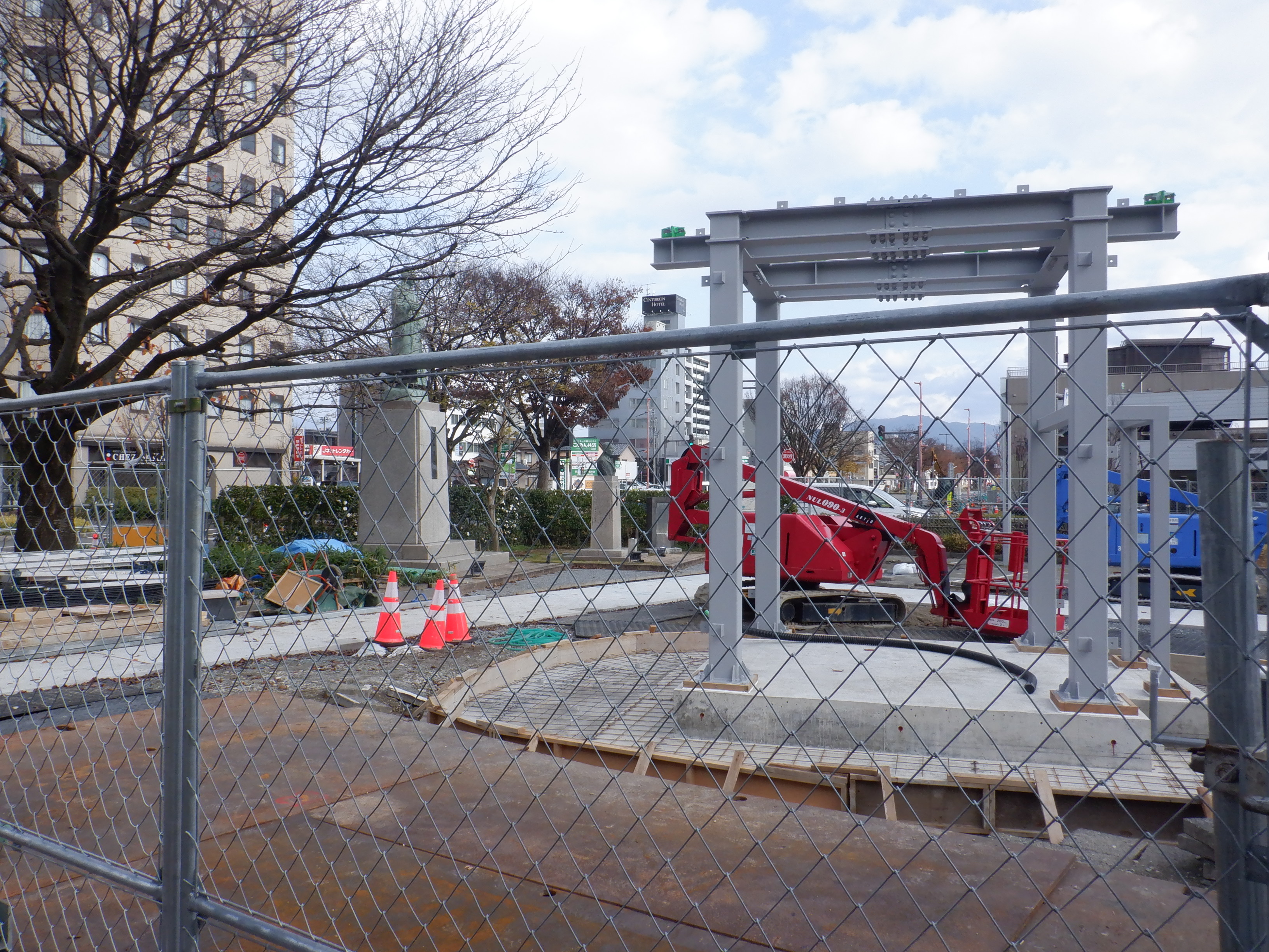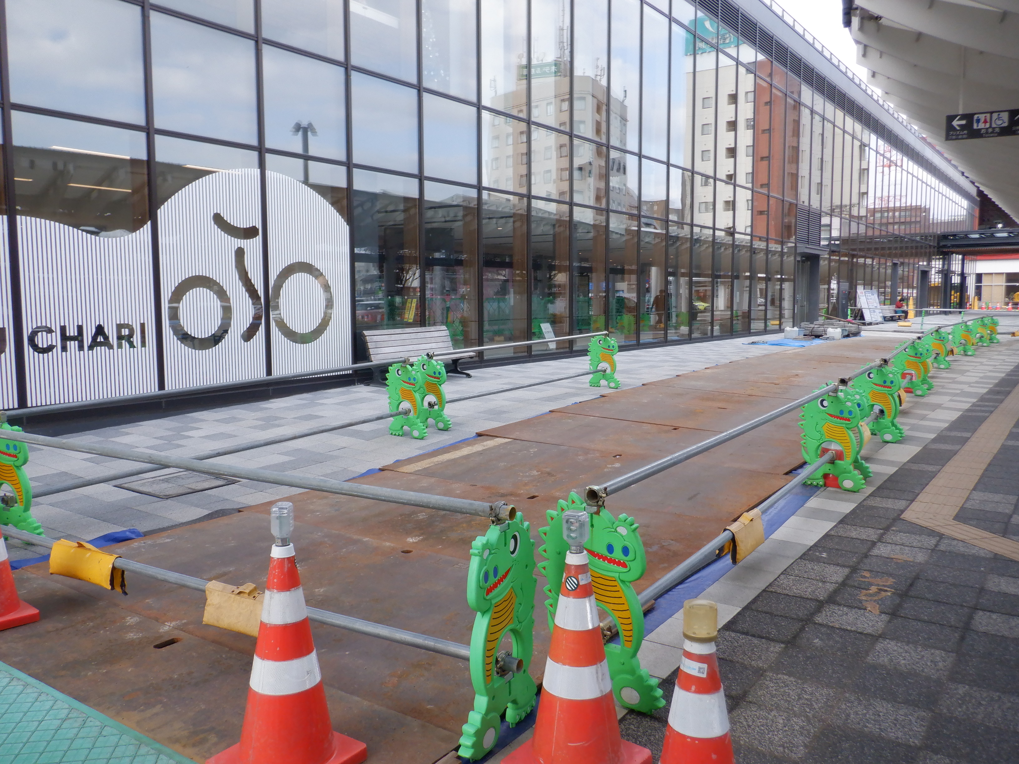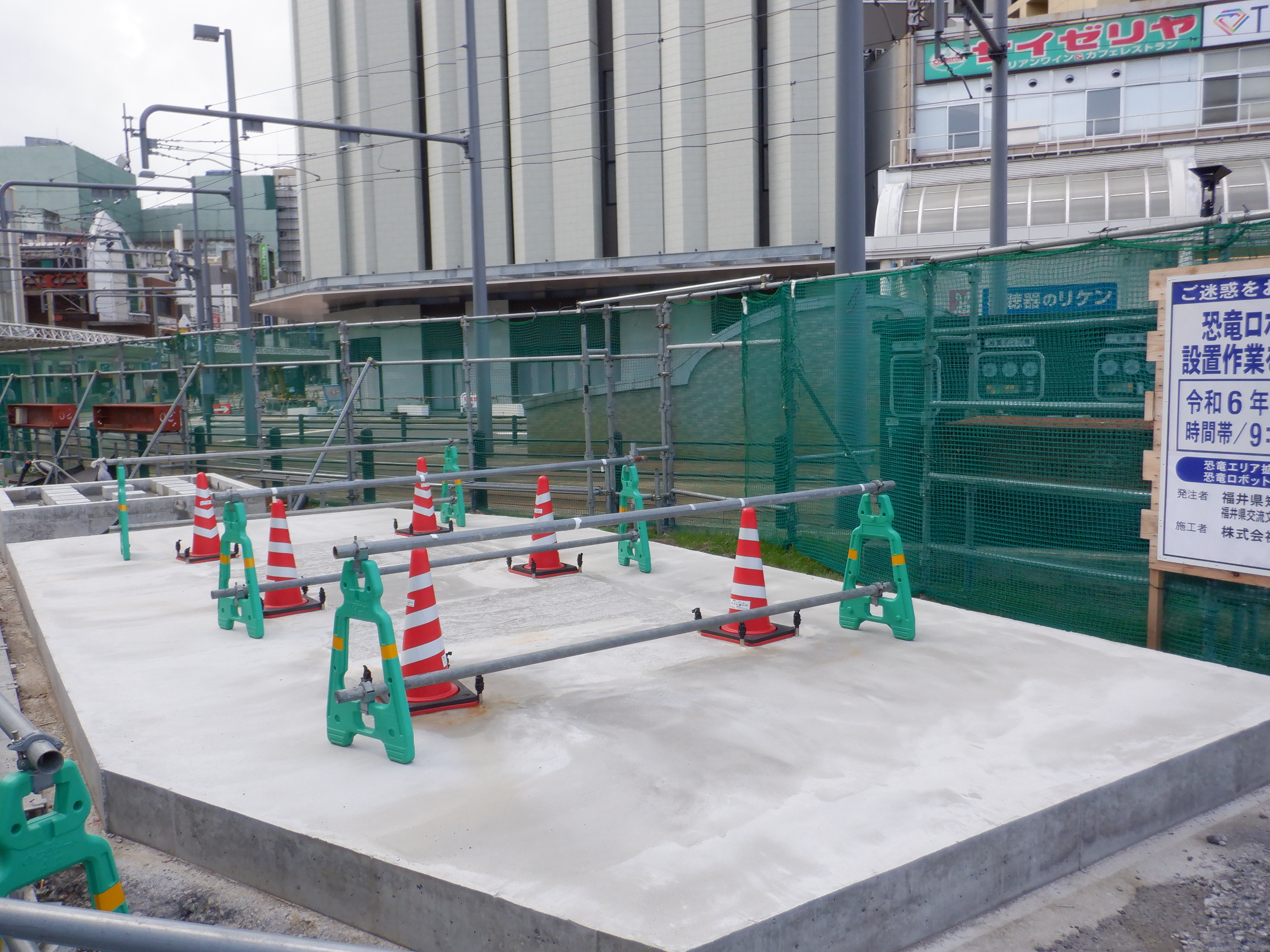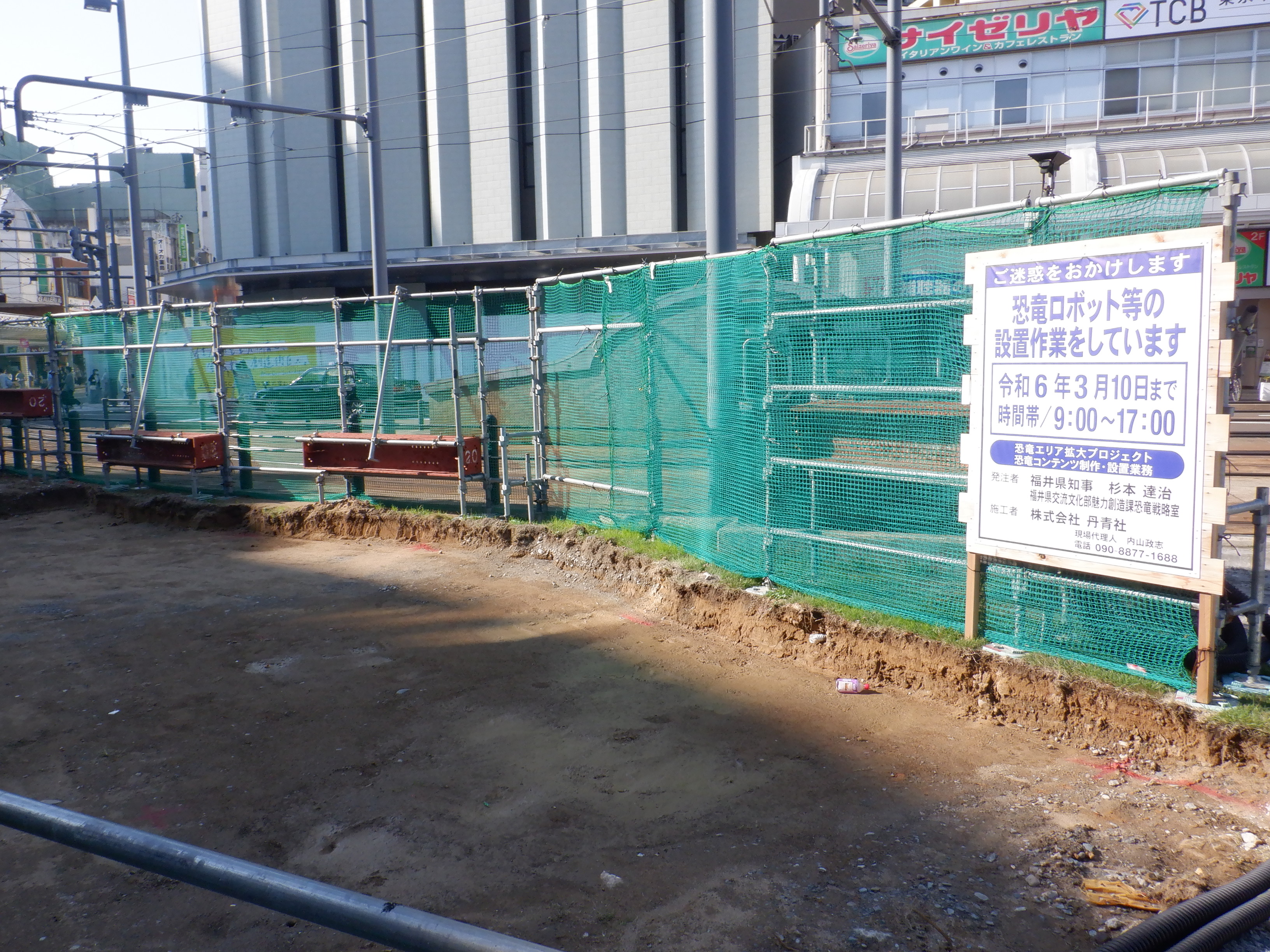 東口の駅前広場の恐竜設備建設中のところは工事が進んでいました。また新たに西口に恐竜ロボット等の建設が始まりました。