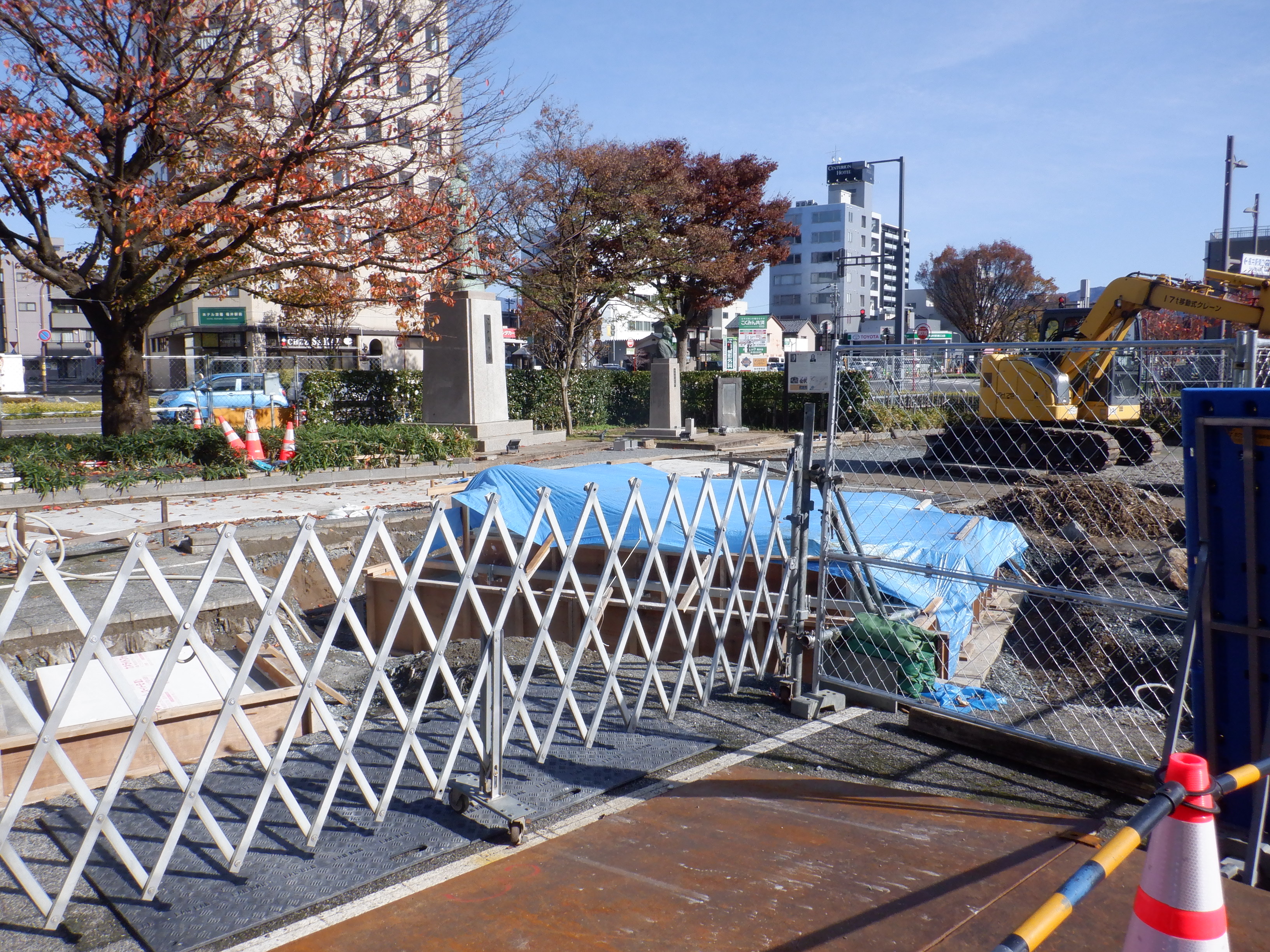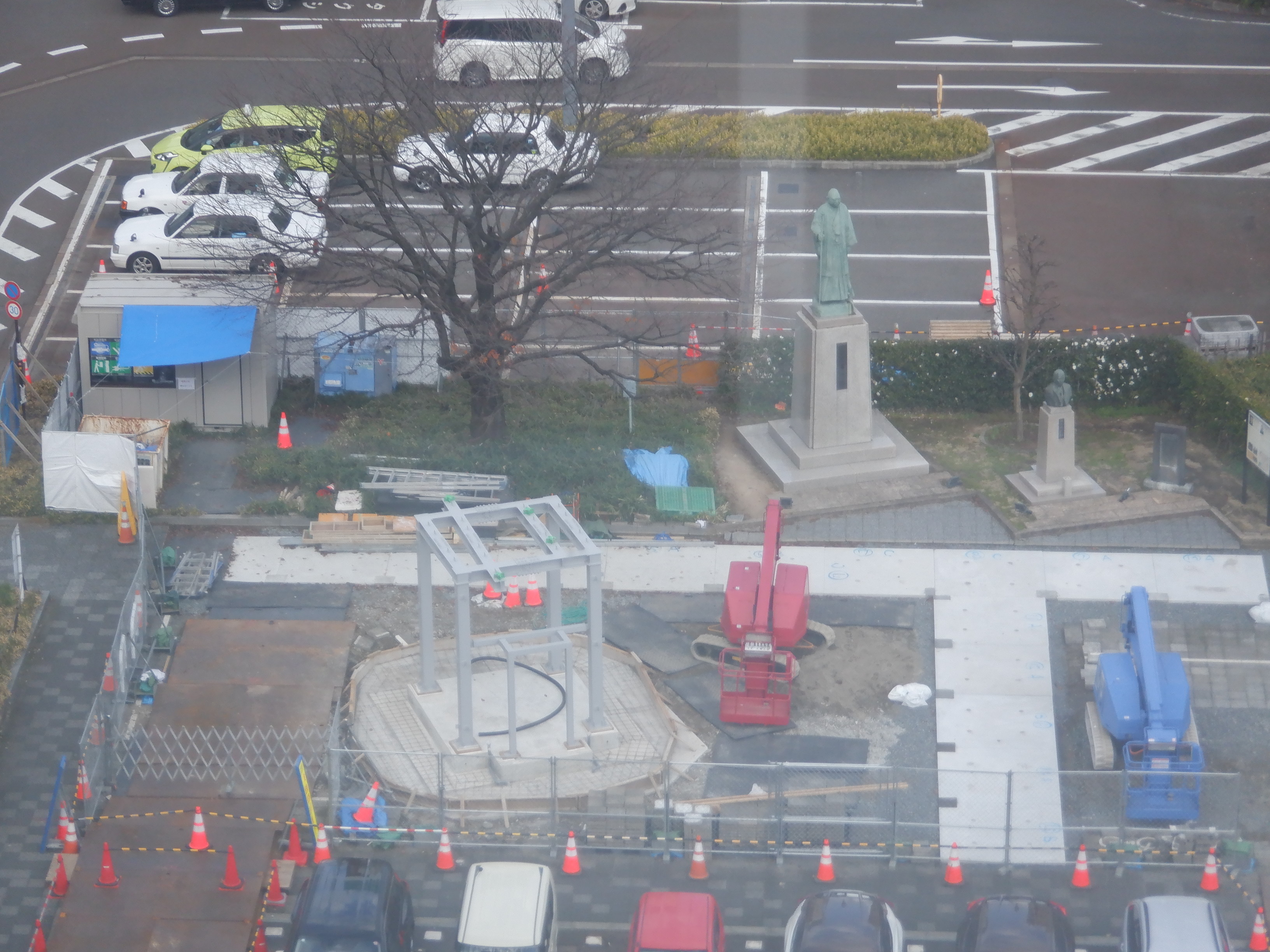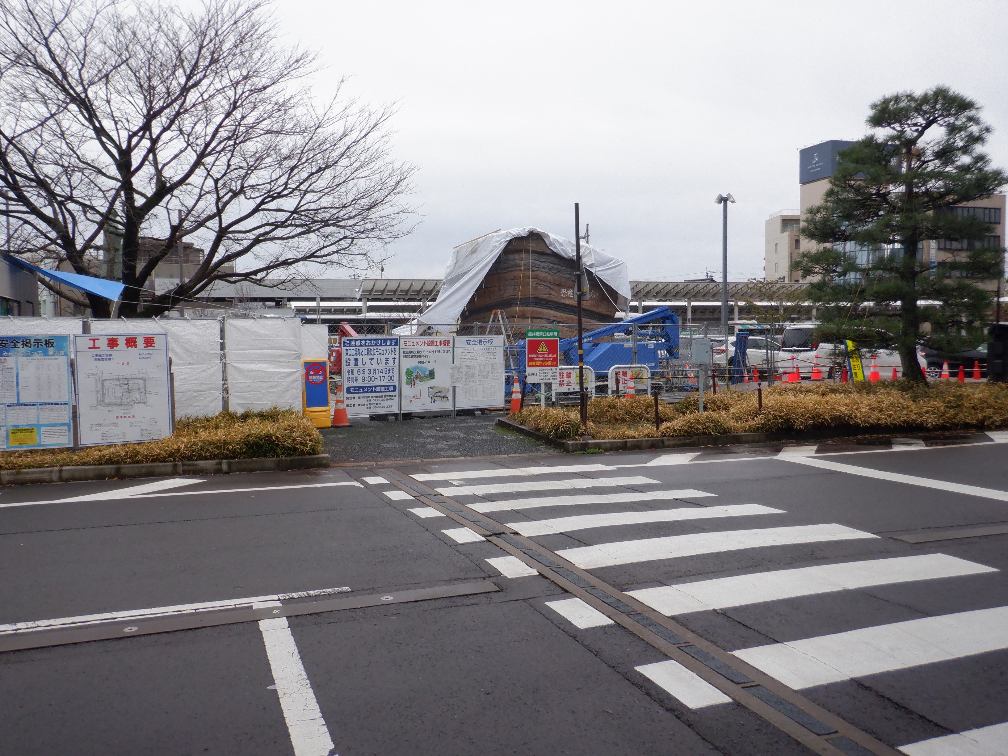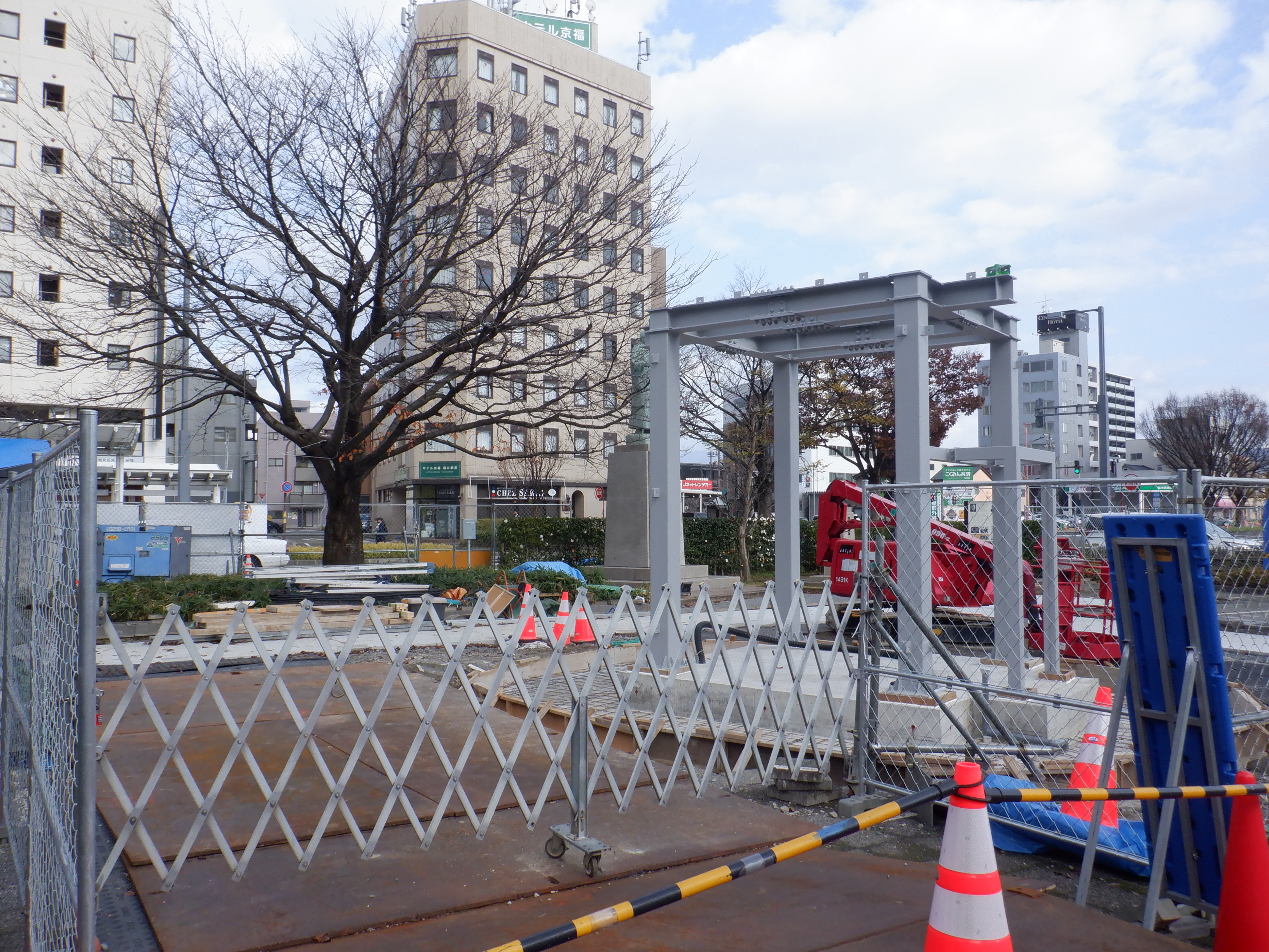 東口の駅前広場の恐竜設備建設中のところは工事が進んでいました。また新たに西口に恐竜ロボット等の建設が始まりました。