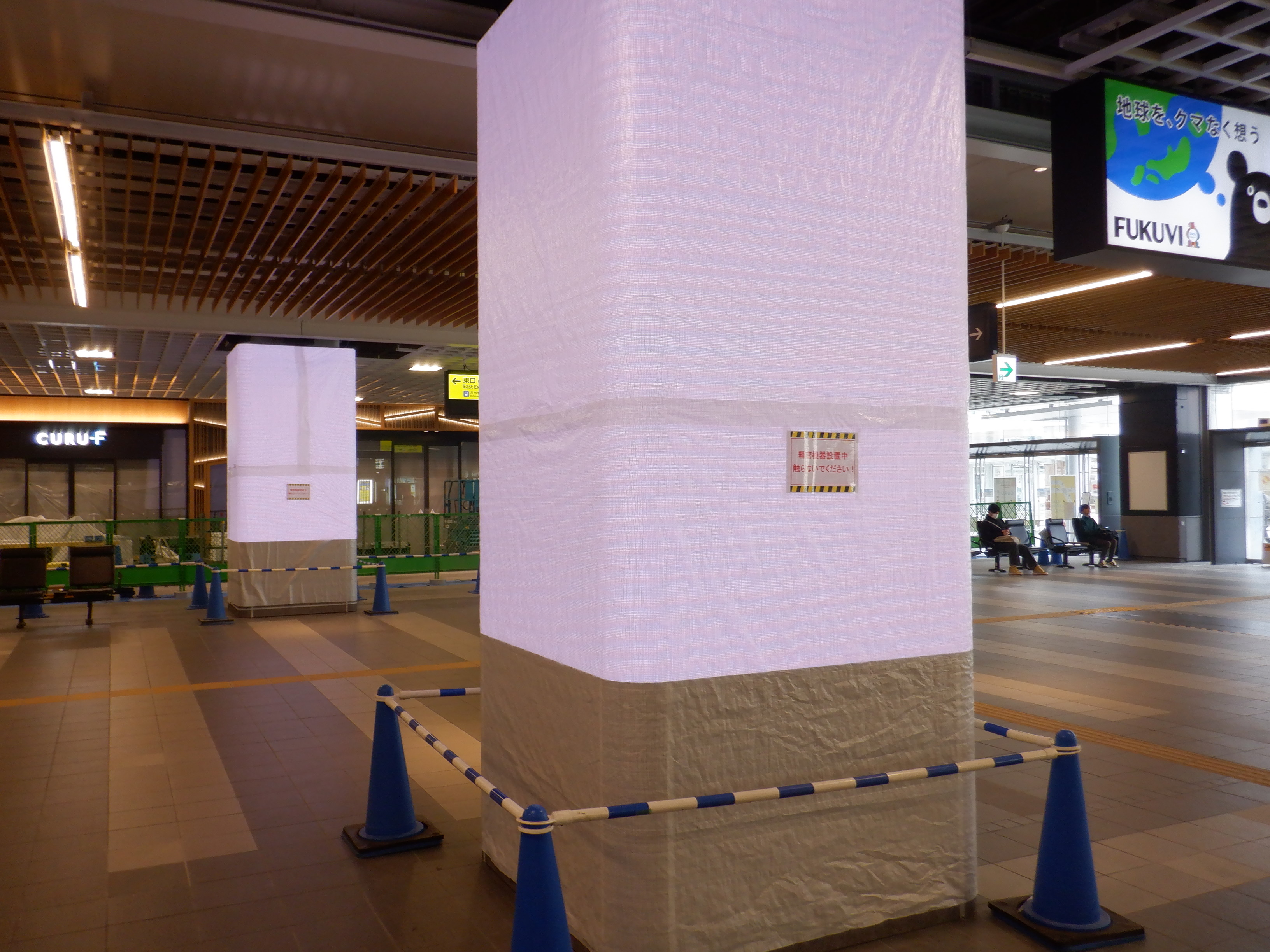 改札口の前の囲いがなくなり、元の広い場所が戻りました。柱が何かに包まれています。北陸発の大型柱巻LEDビジョンが設置されました。