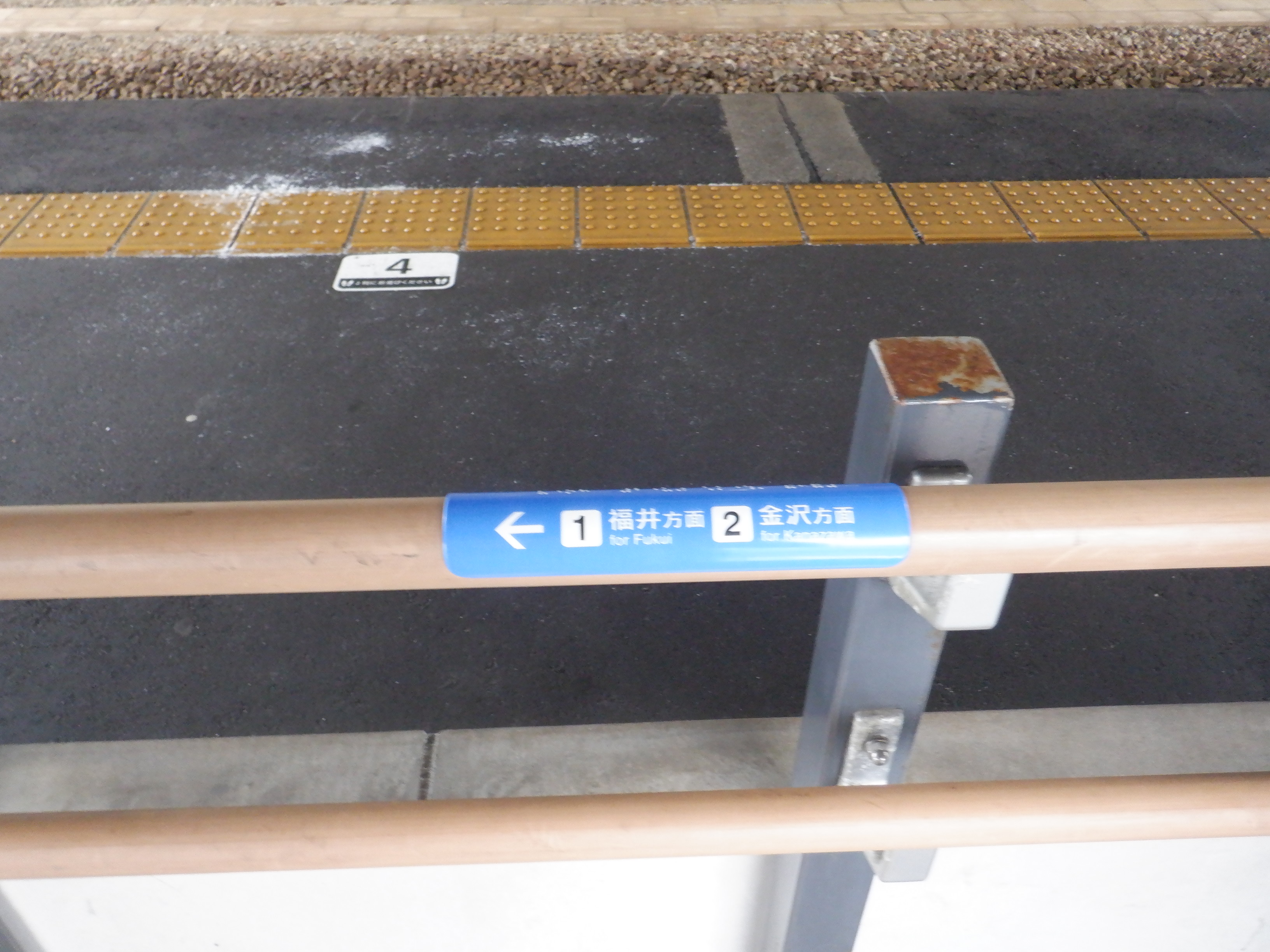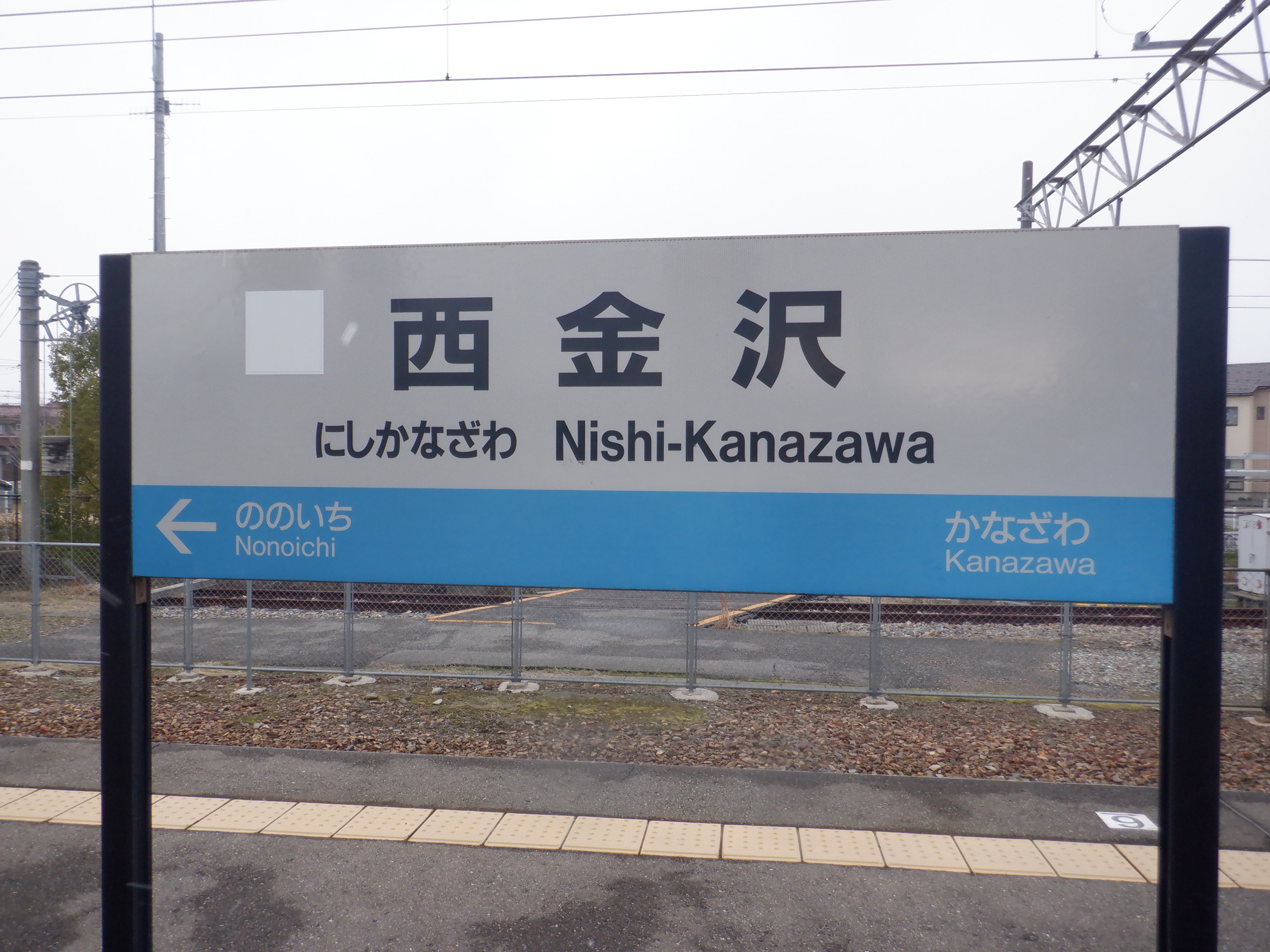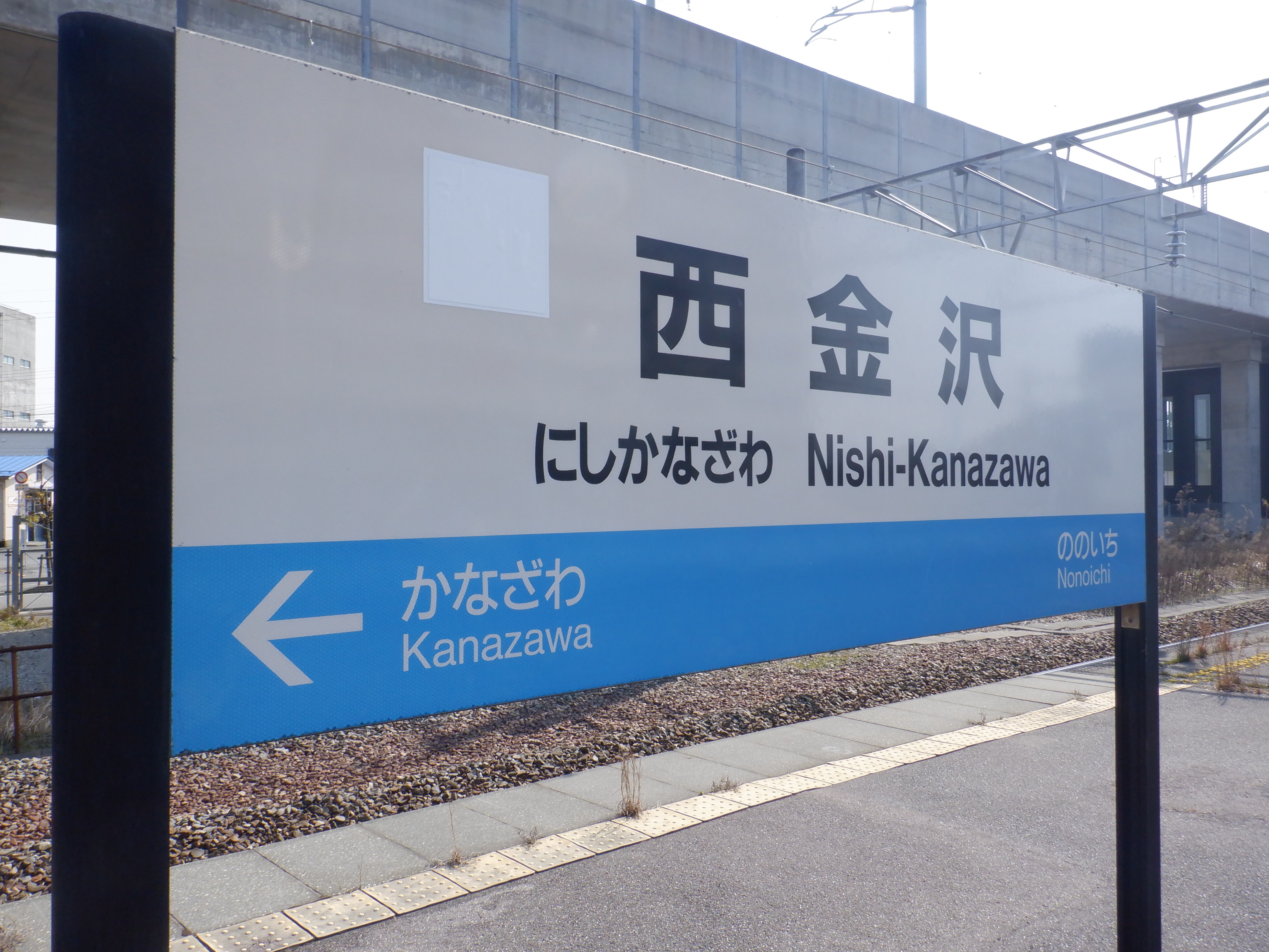 野々市駅側の駅名標。よく見るとシールの部分が二重に貼られています。