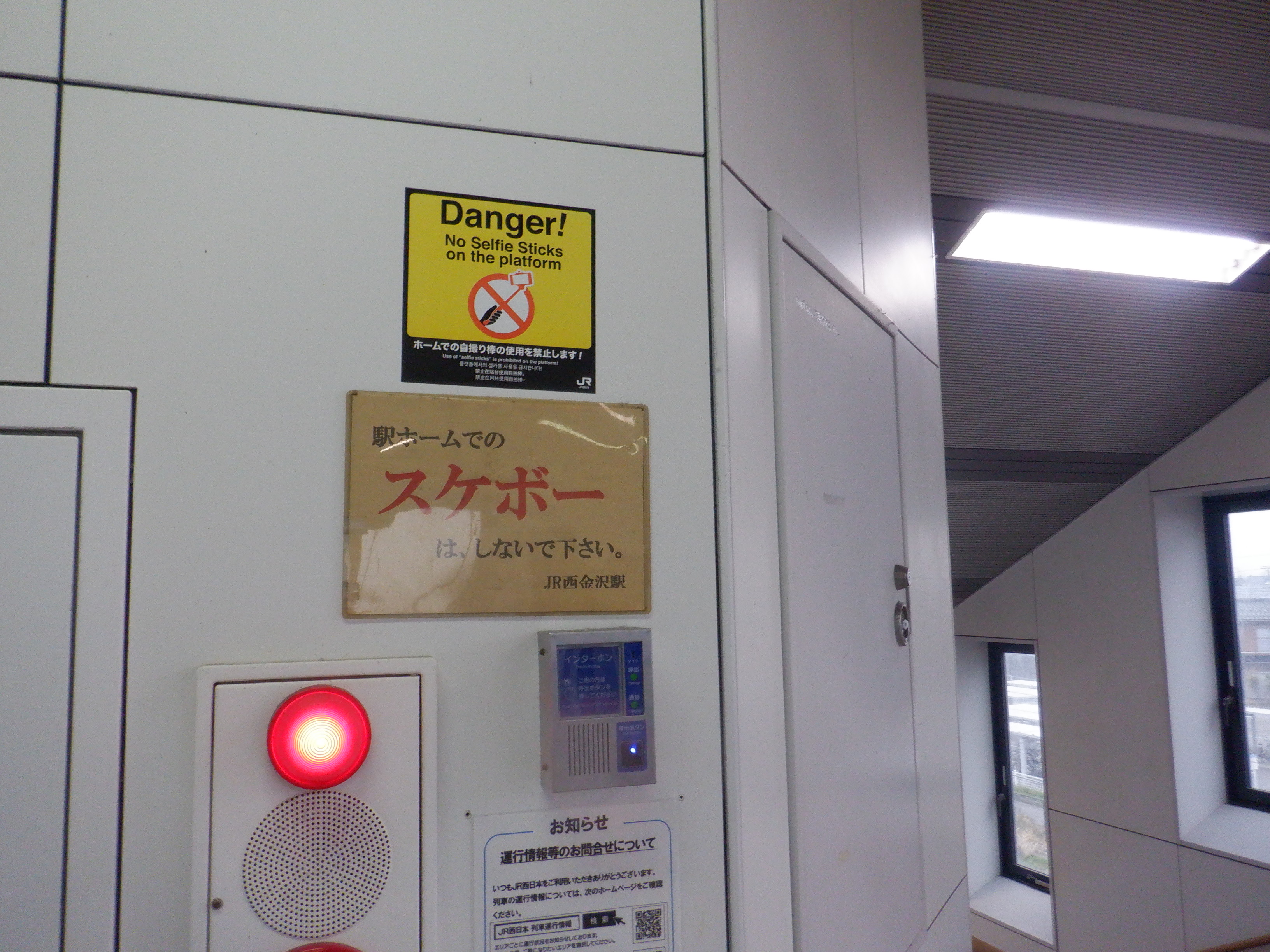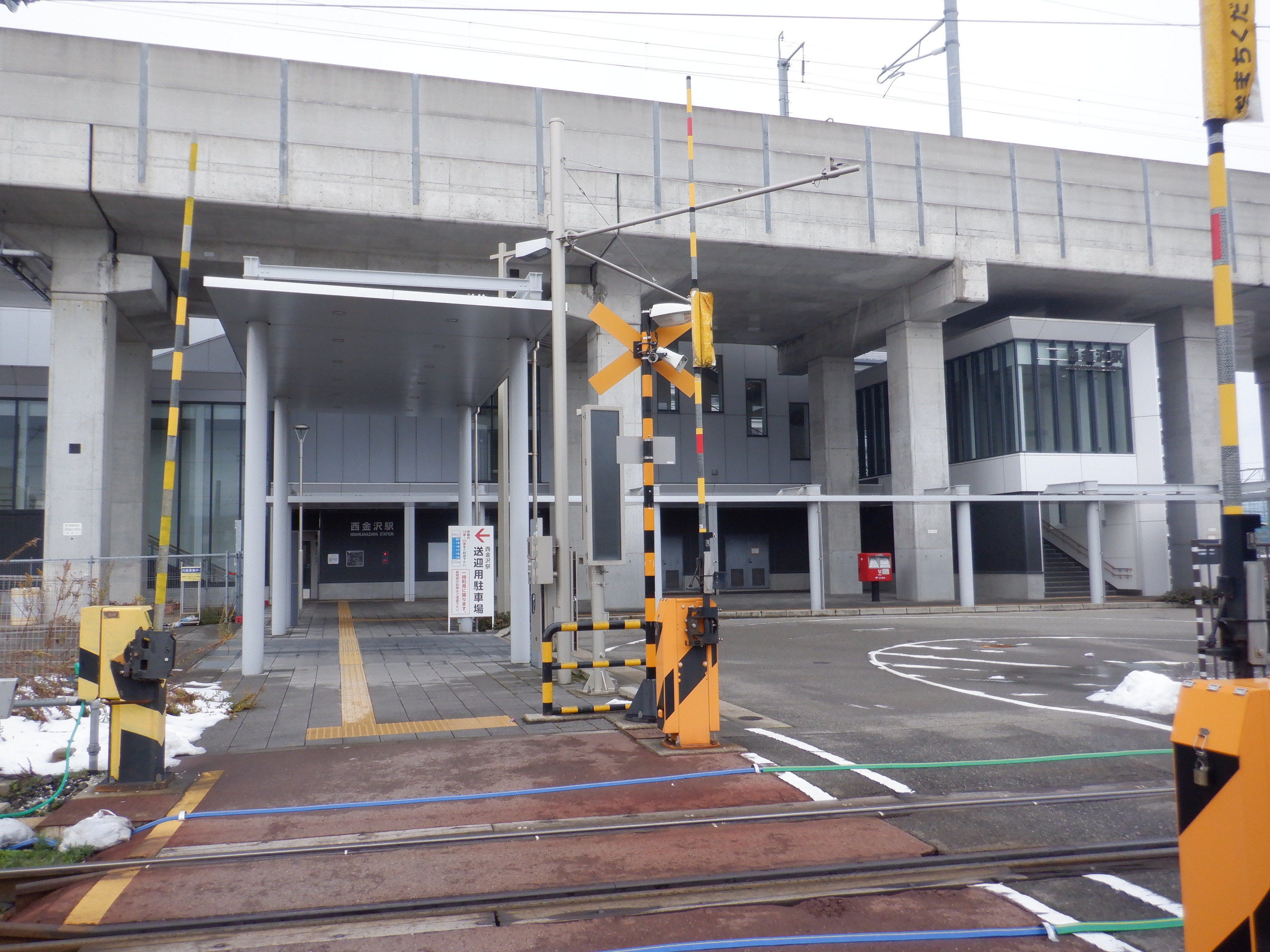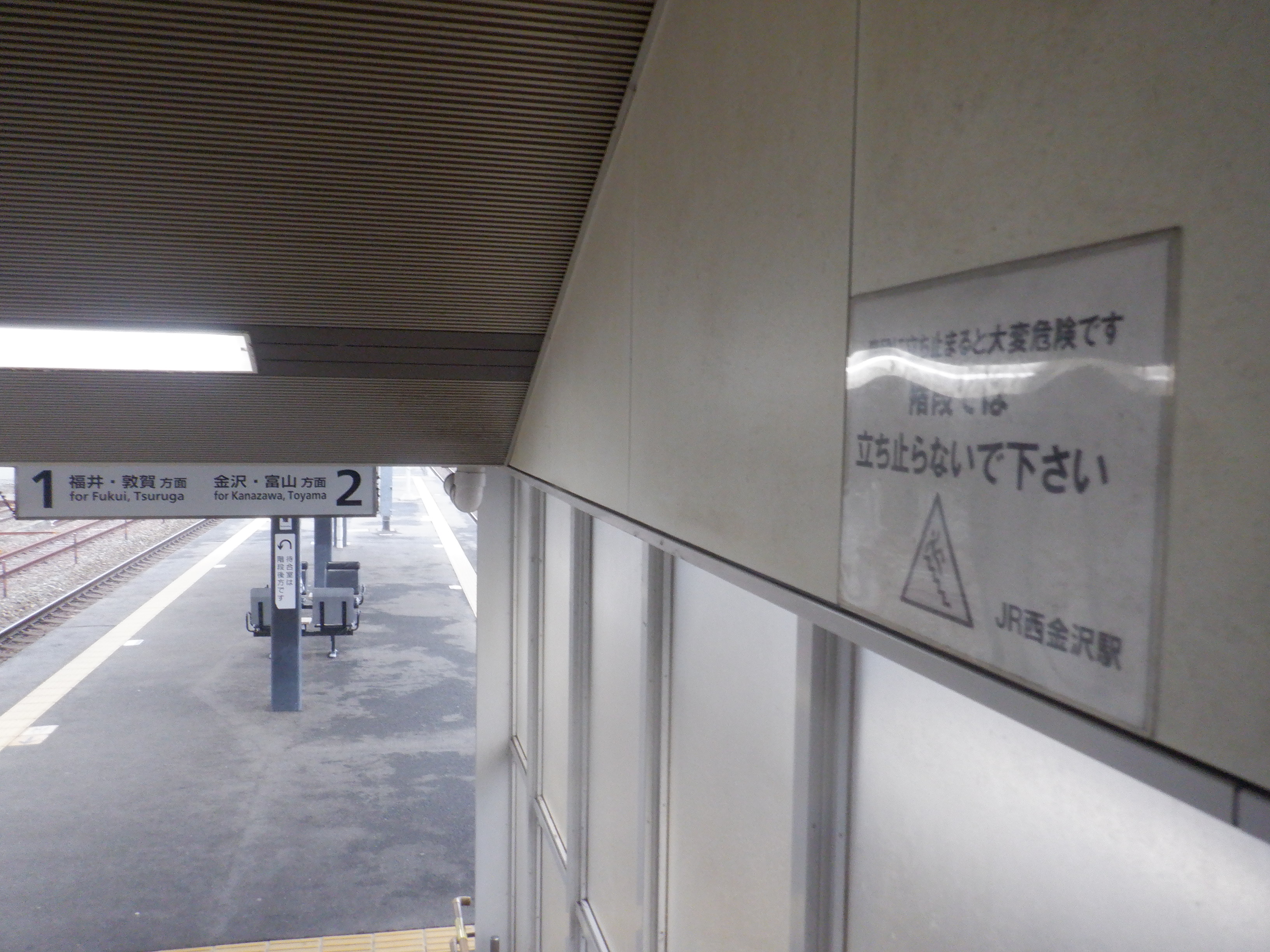 階段付近のJR西金沢駅と書かれた注意書き、スケボー禁止の表示はこの時点で残っています。