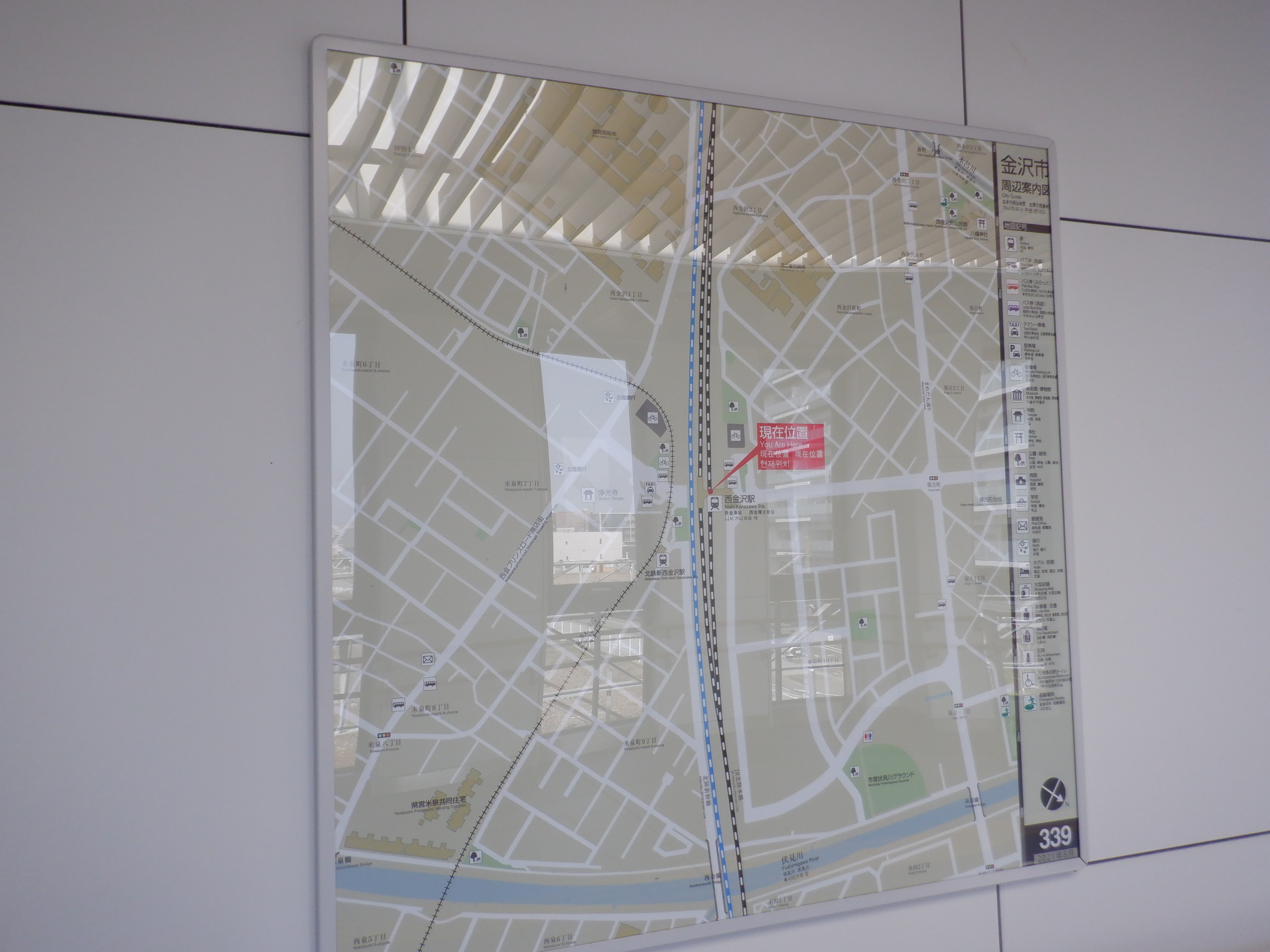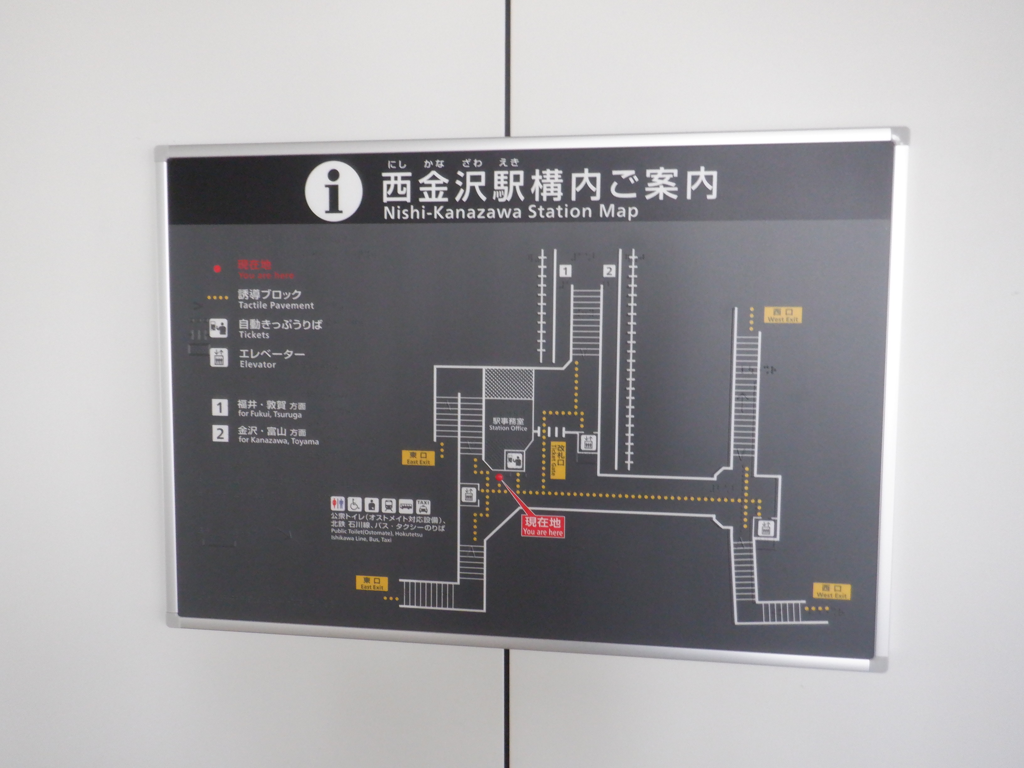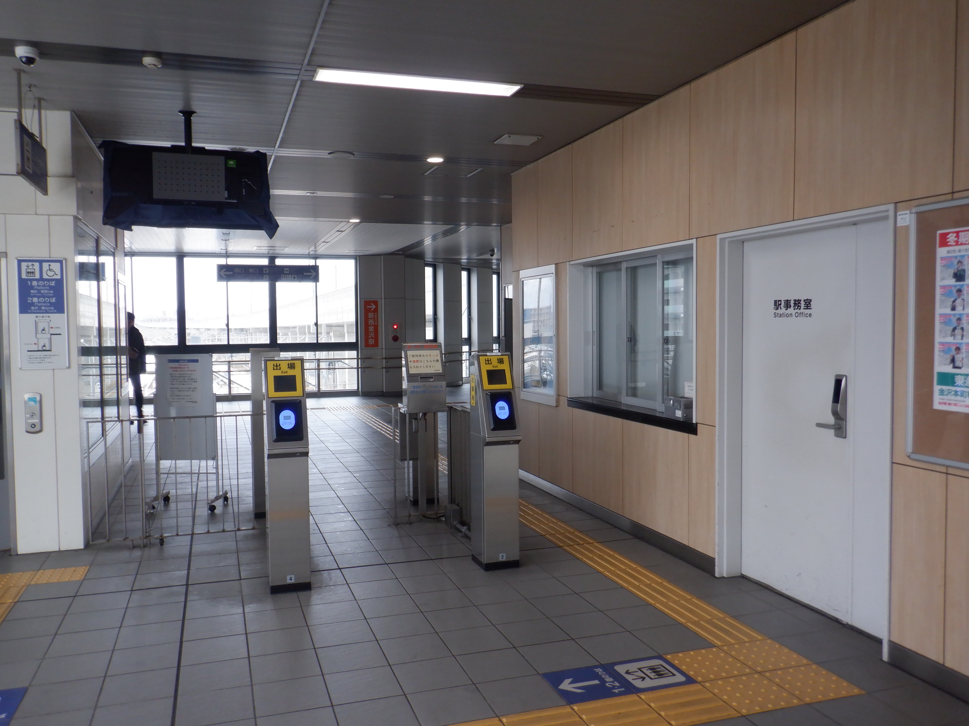 改札を出たところの新西金沢駅への案内。北鉄のカラーが使われています。