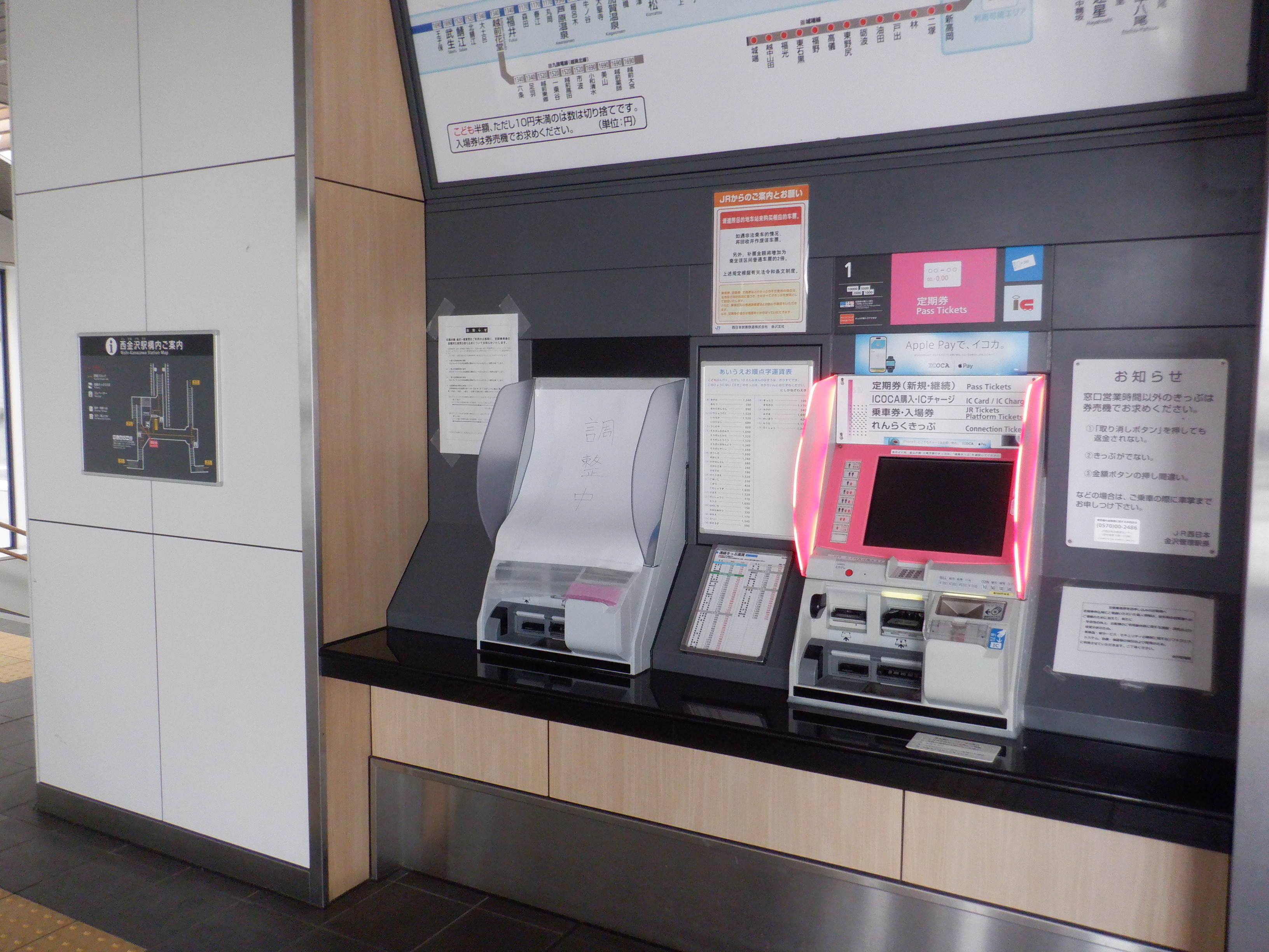券売機の様子。カバーが外され、IRいしかわ鉄道の券売機が見えていました。