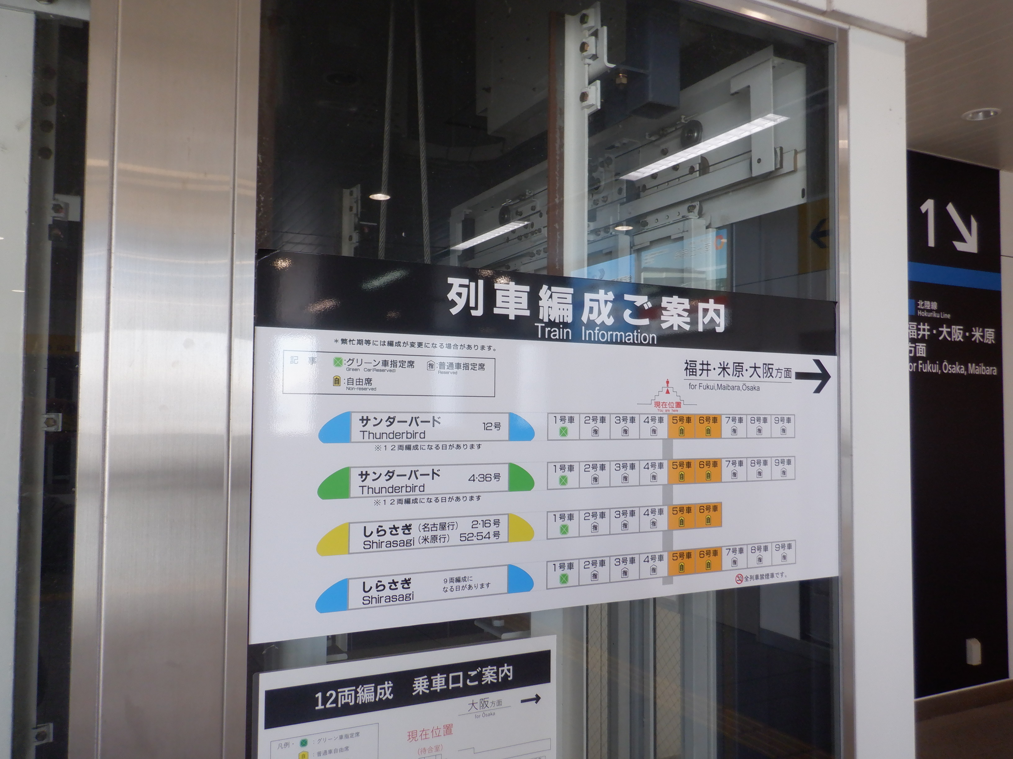 エレベーターのところの特急列車の編成案内。