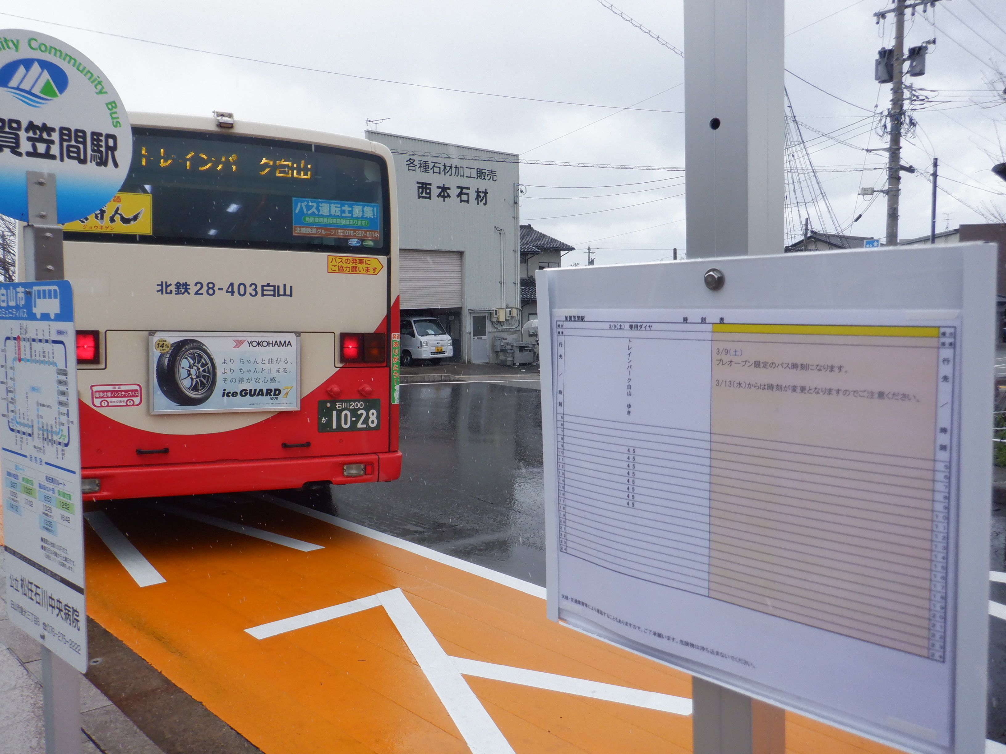 トレインパークのプレオープンに合わせて、加賀笠間駅前からトレインパークを経由して道の駅へのバスが出ていました。この駅前に北鉄バスのバス停が出来ました。