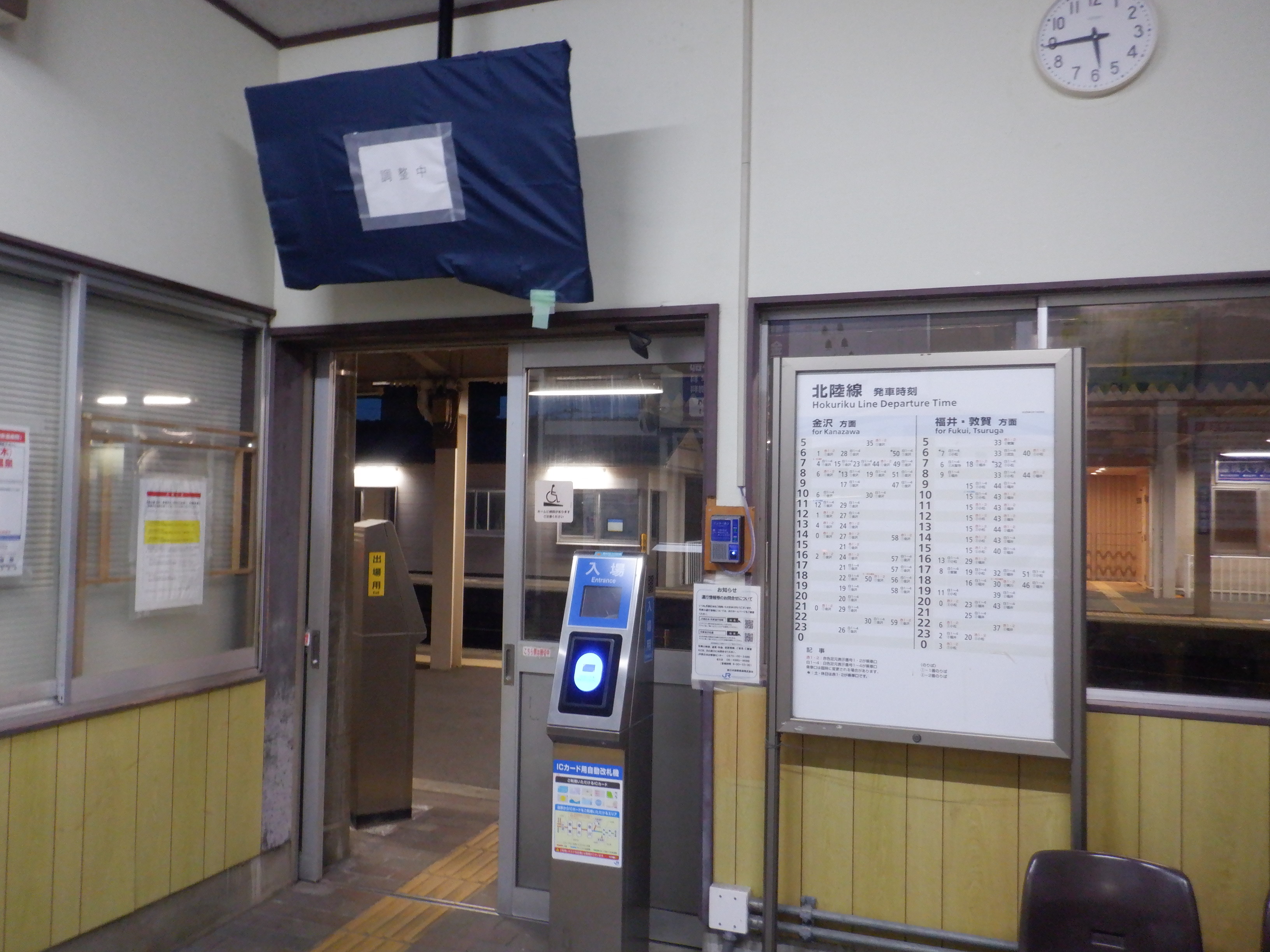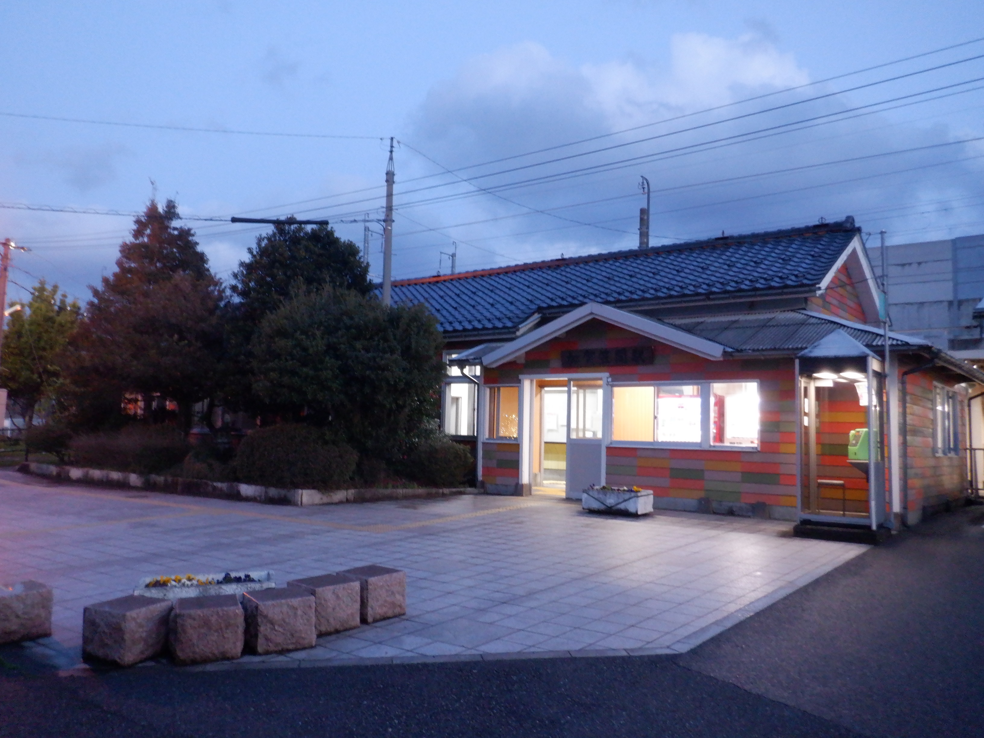ここでは加賀笠間駅の2024年の移管前の様子をご紹介します。東口のJRロゴの撤去が他駅より遅かったので、その経過を見るために、暗くなってから立ち寄ることが多かったです。