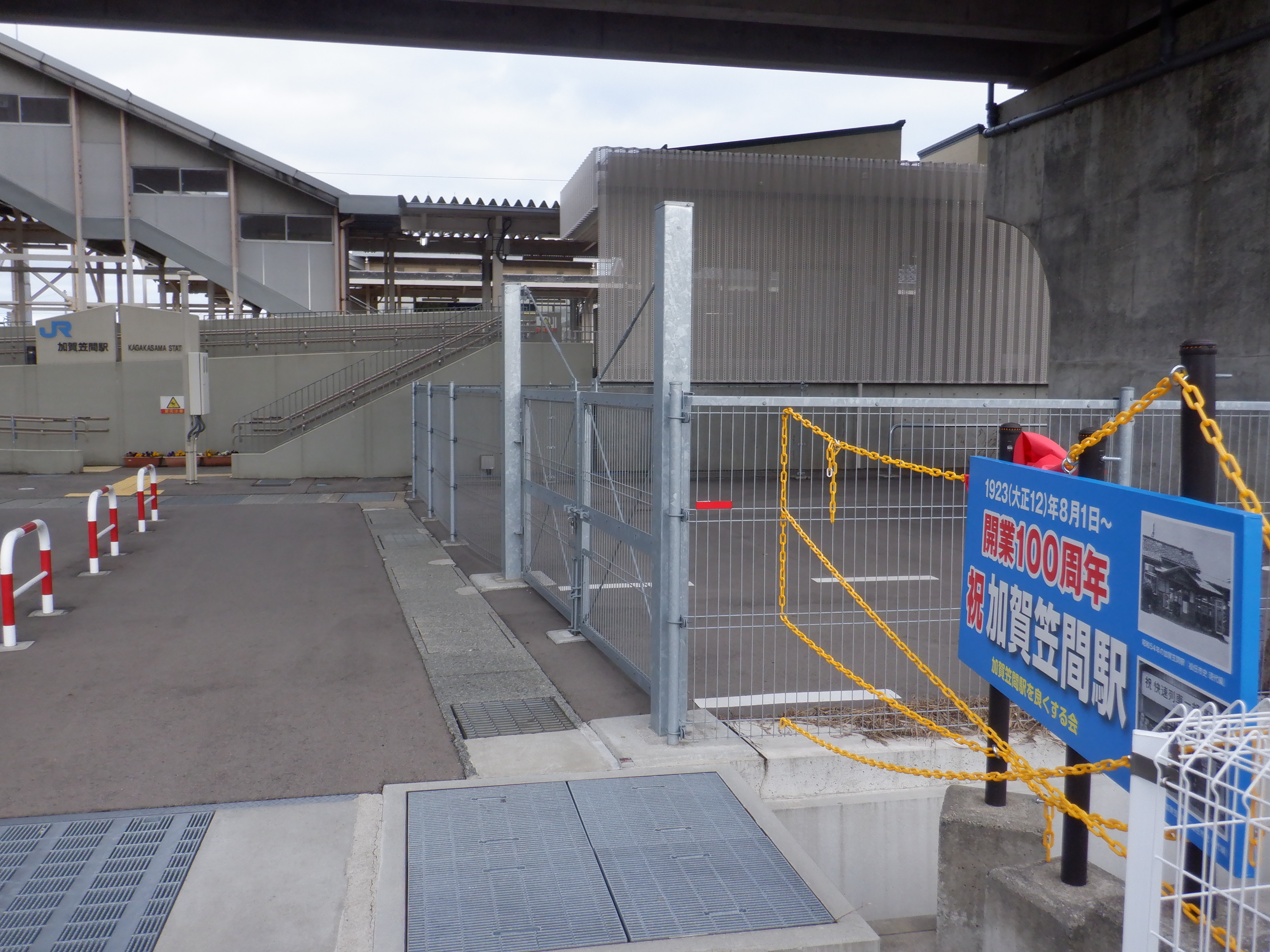 加賀笠間駅東口の実情を伝える掲示。