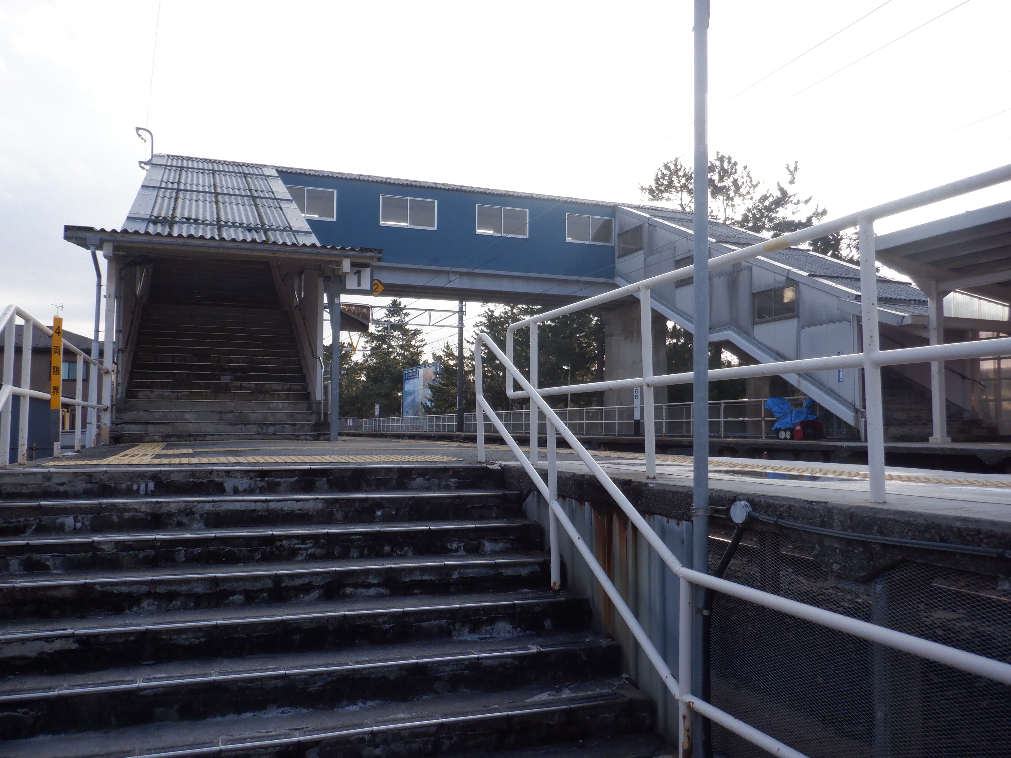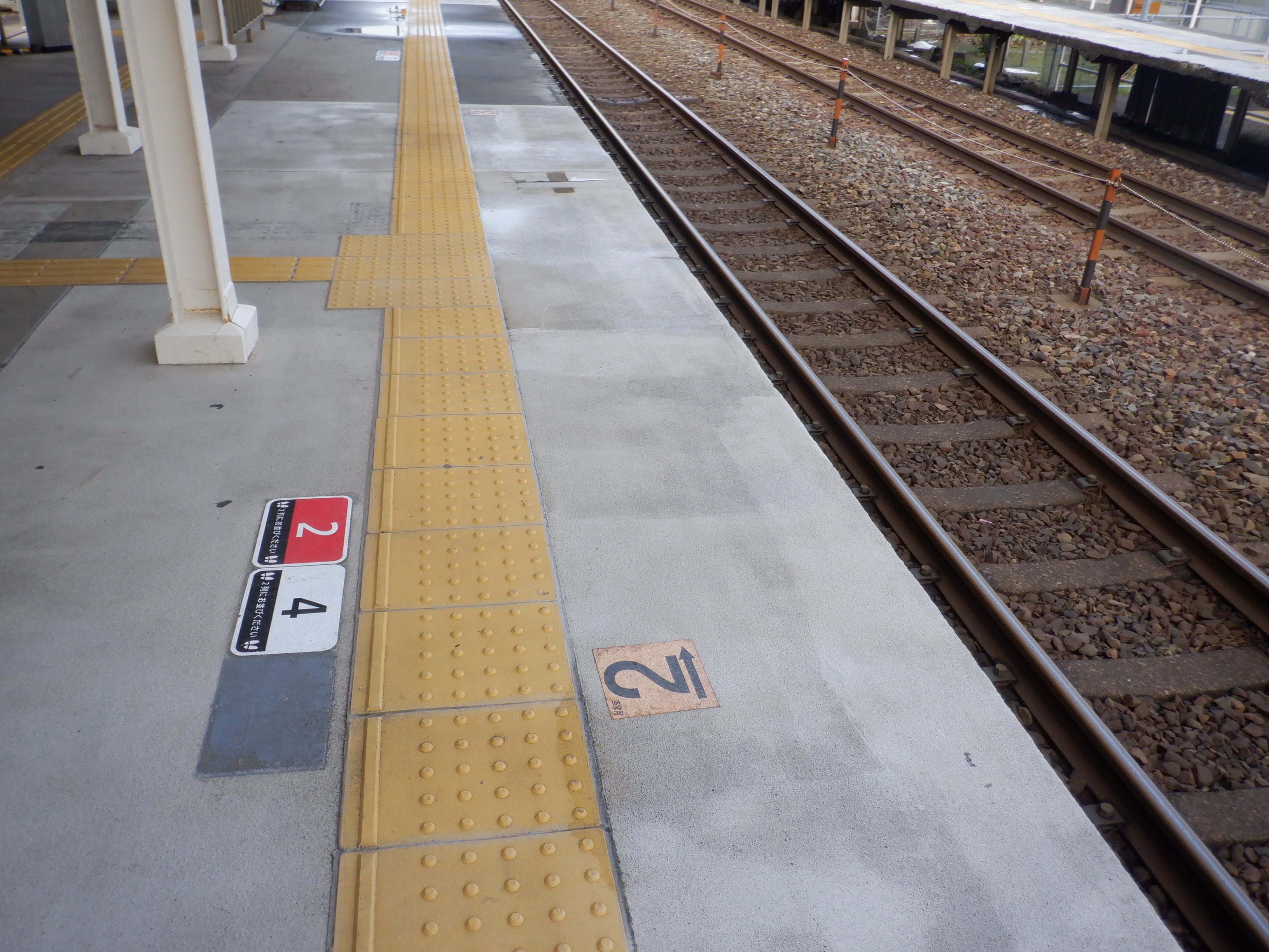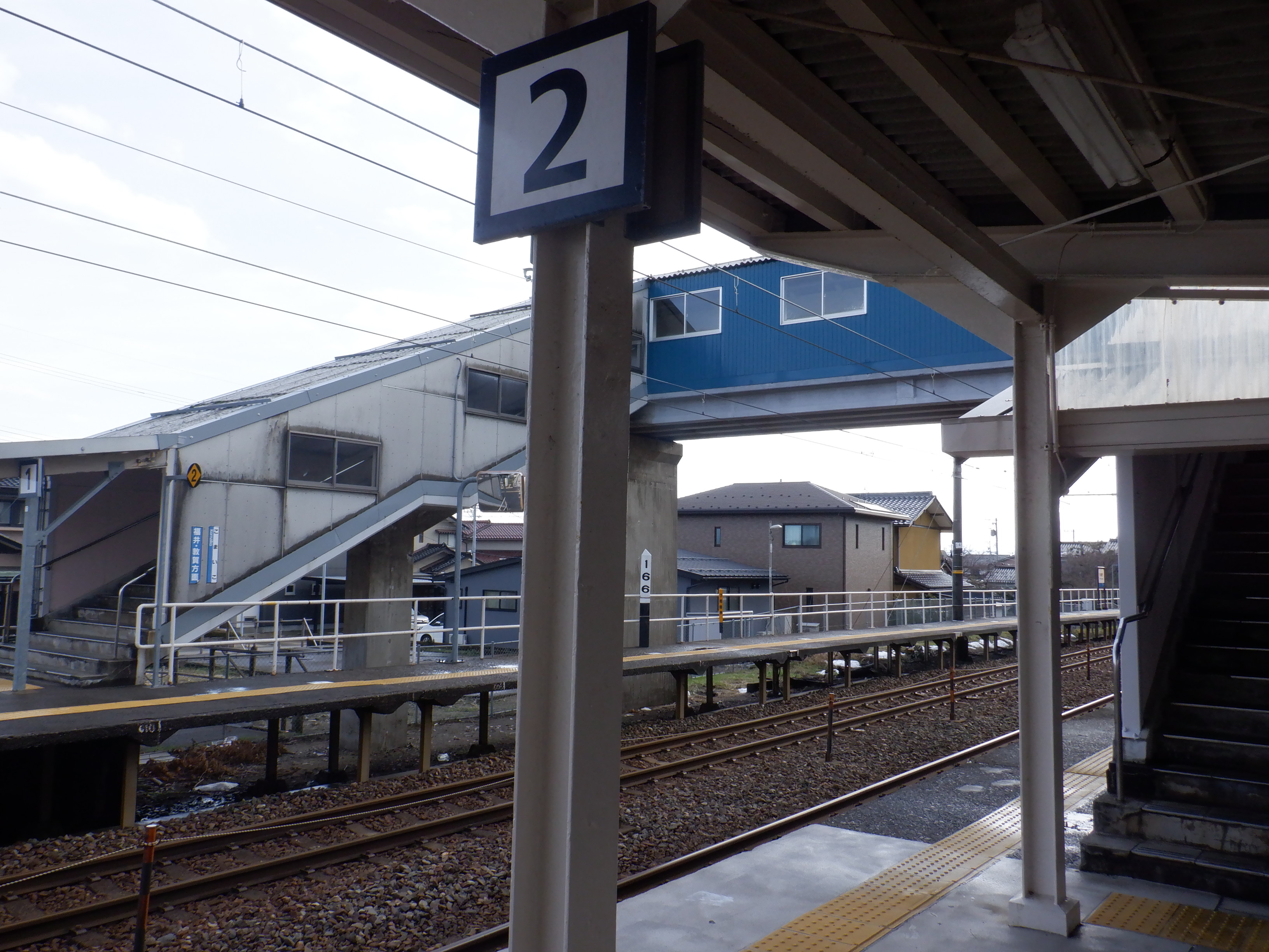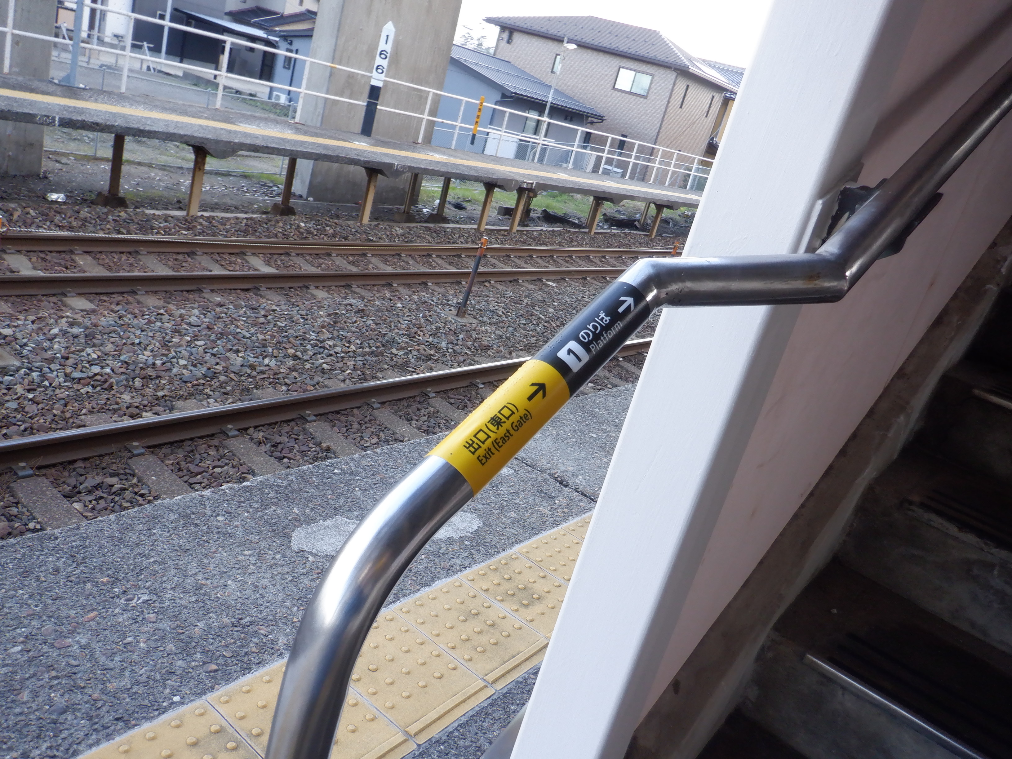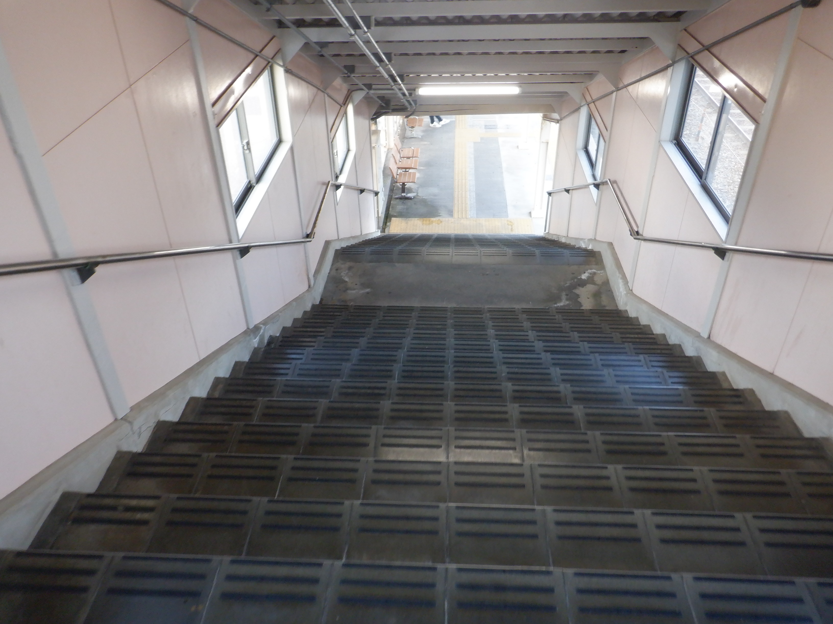 2番のりば上屋付近から。この時点で跨線橋階段の手すりの案内が新しくなったのが確認できます。