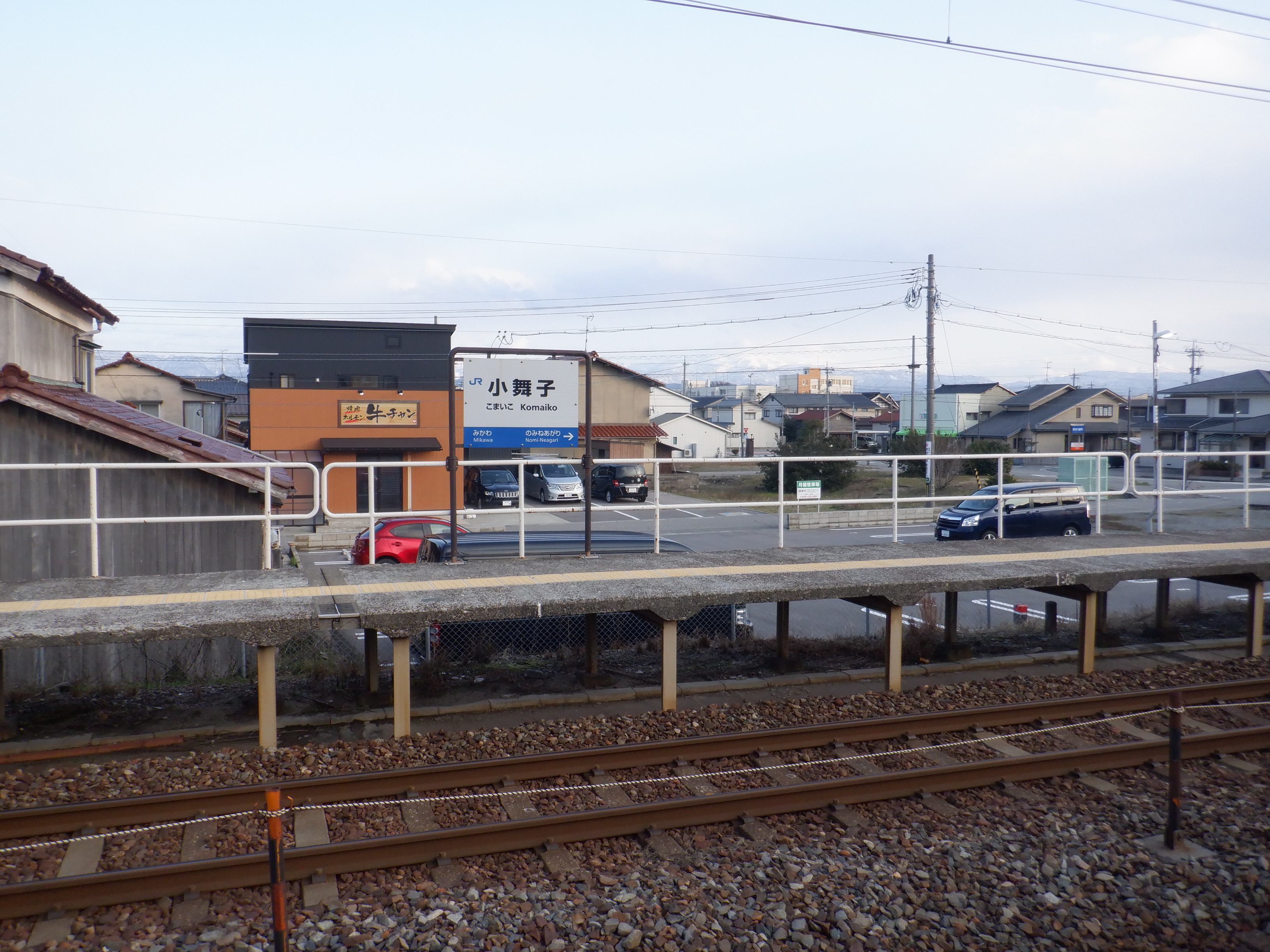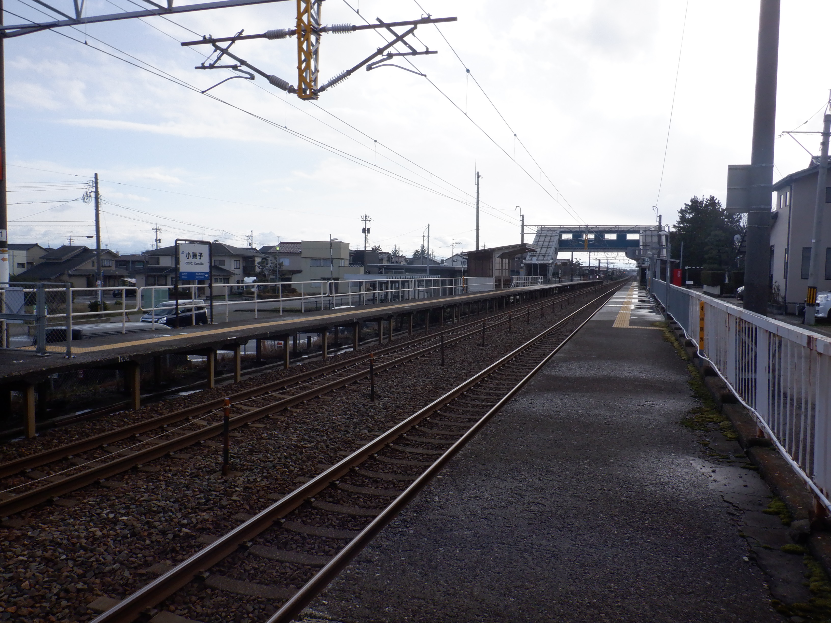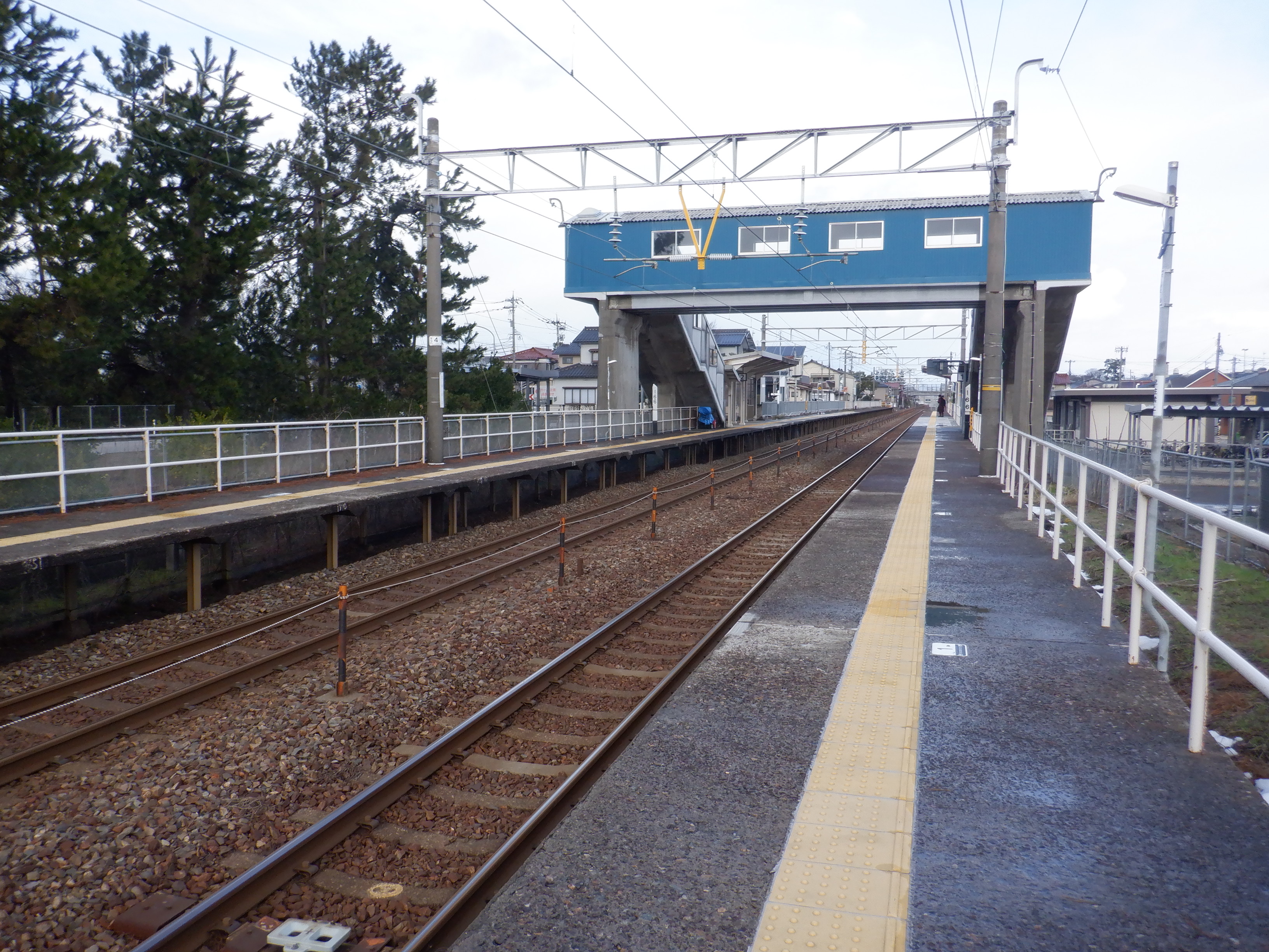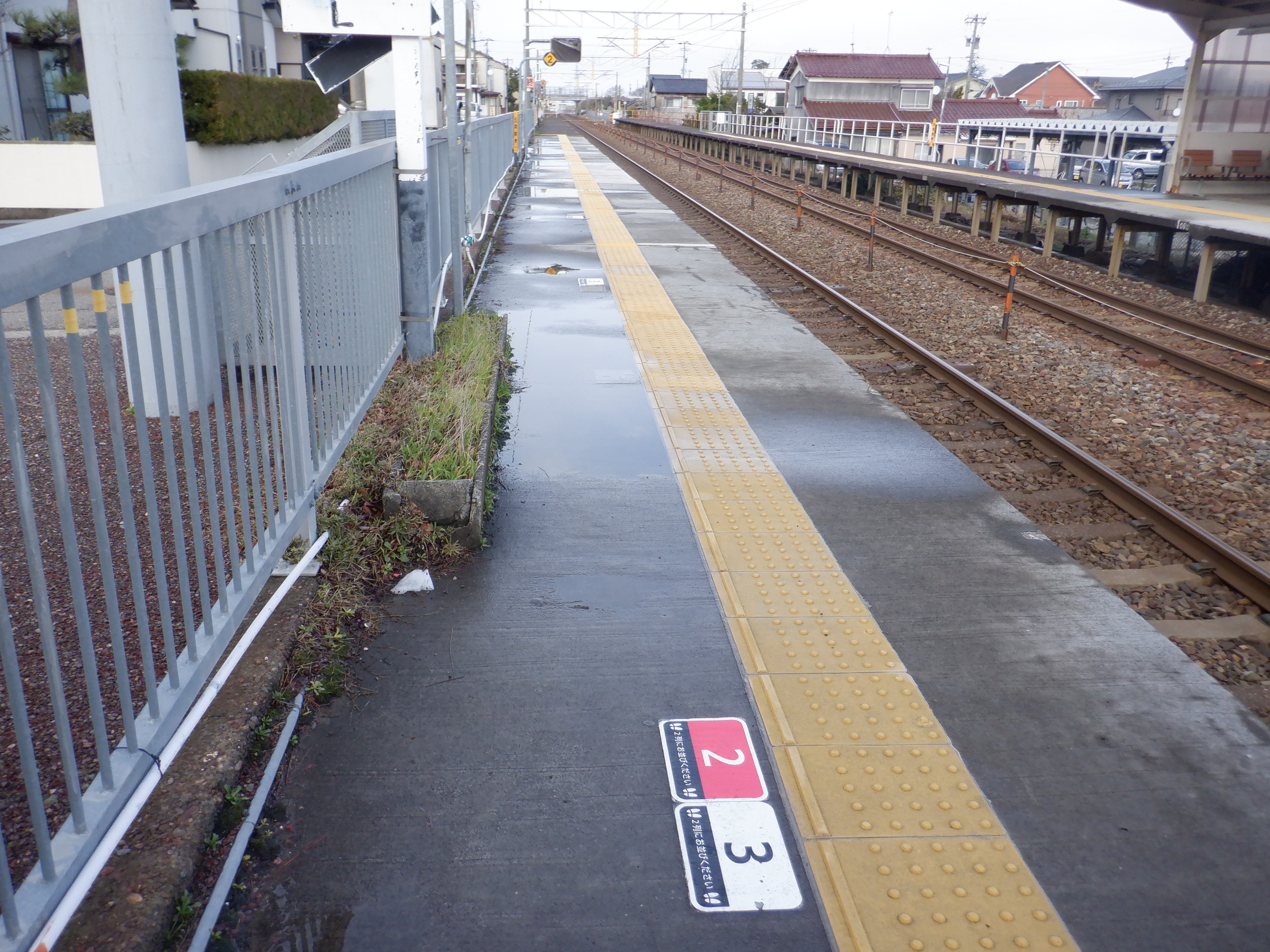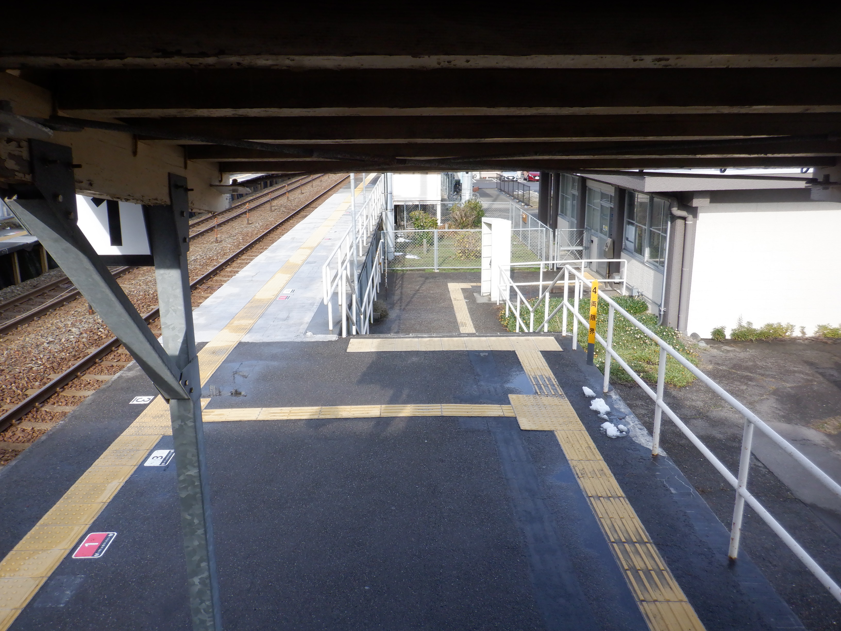 2番のりば上屋付近から。この時点で跨線橋階段の手すりの案内が新しくなったのが確認できます。
