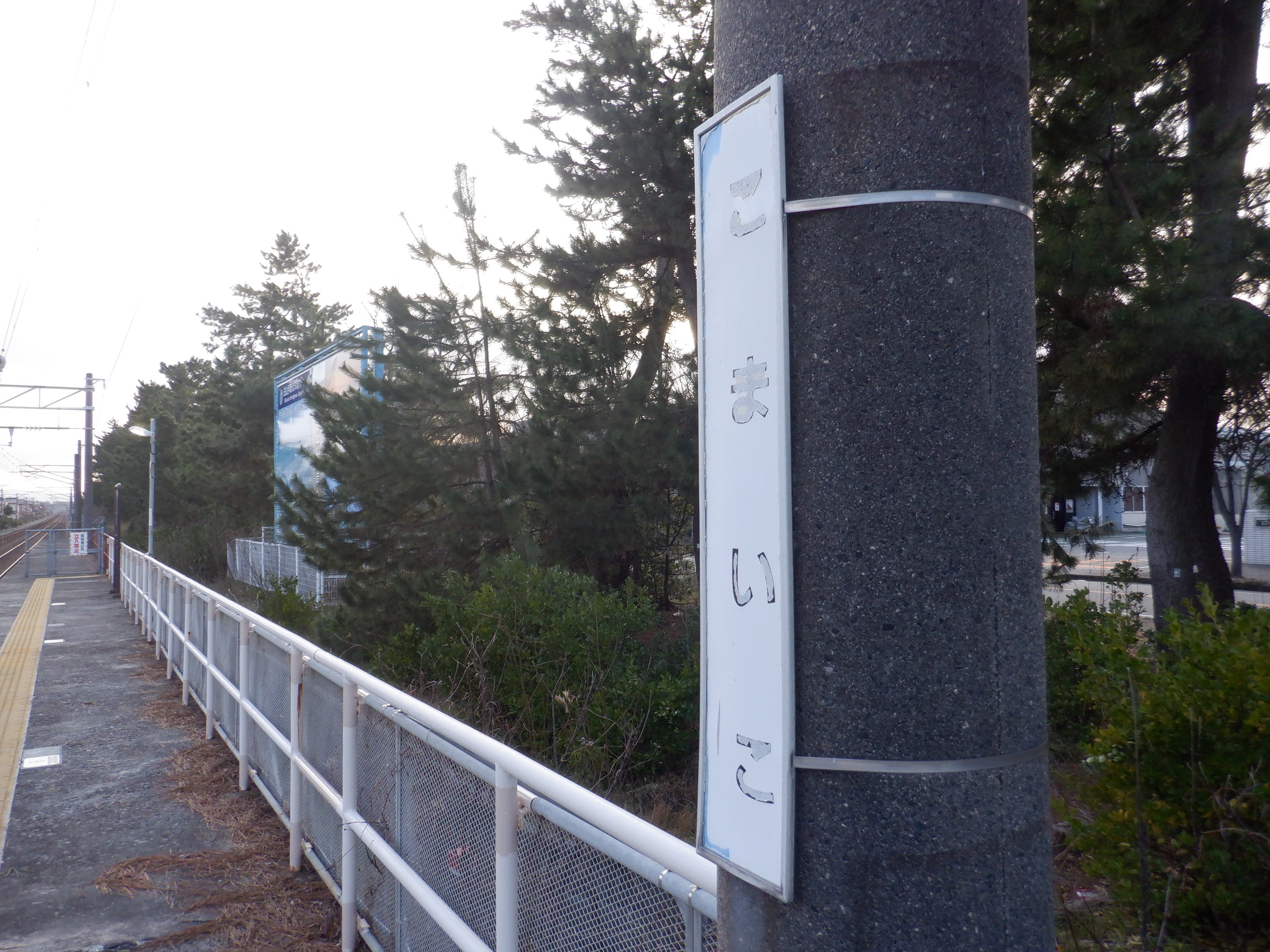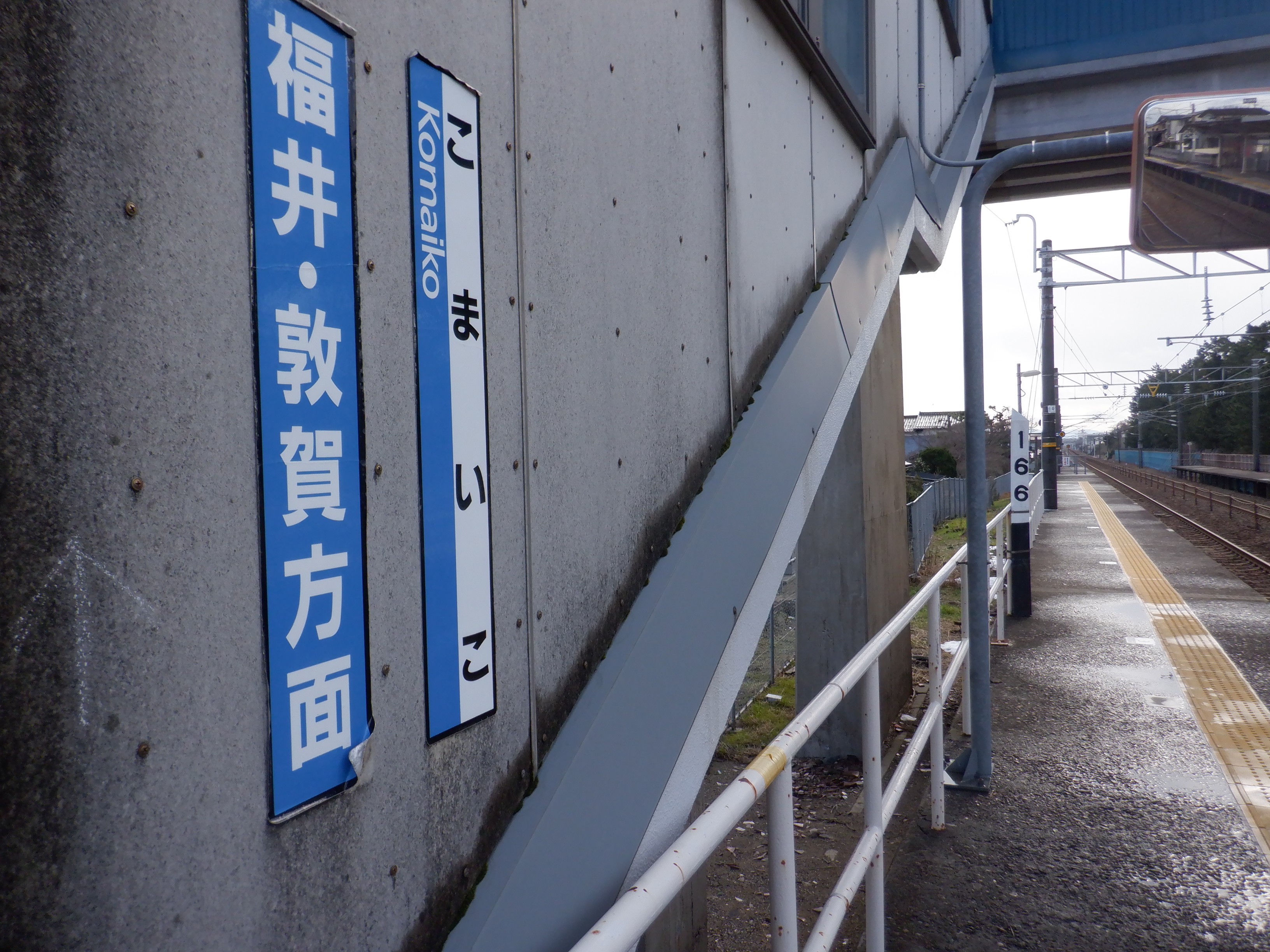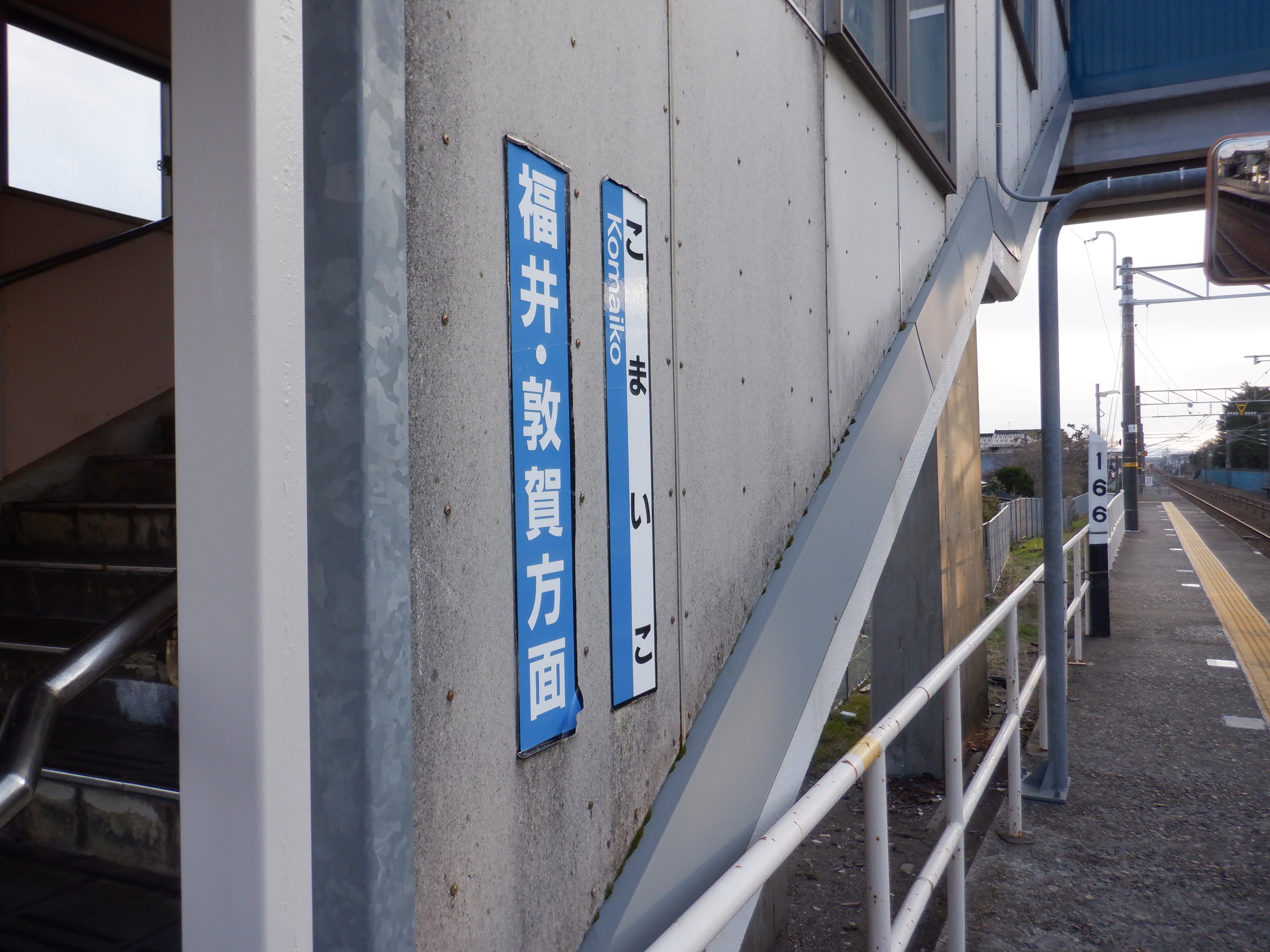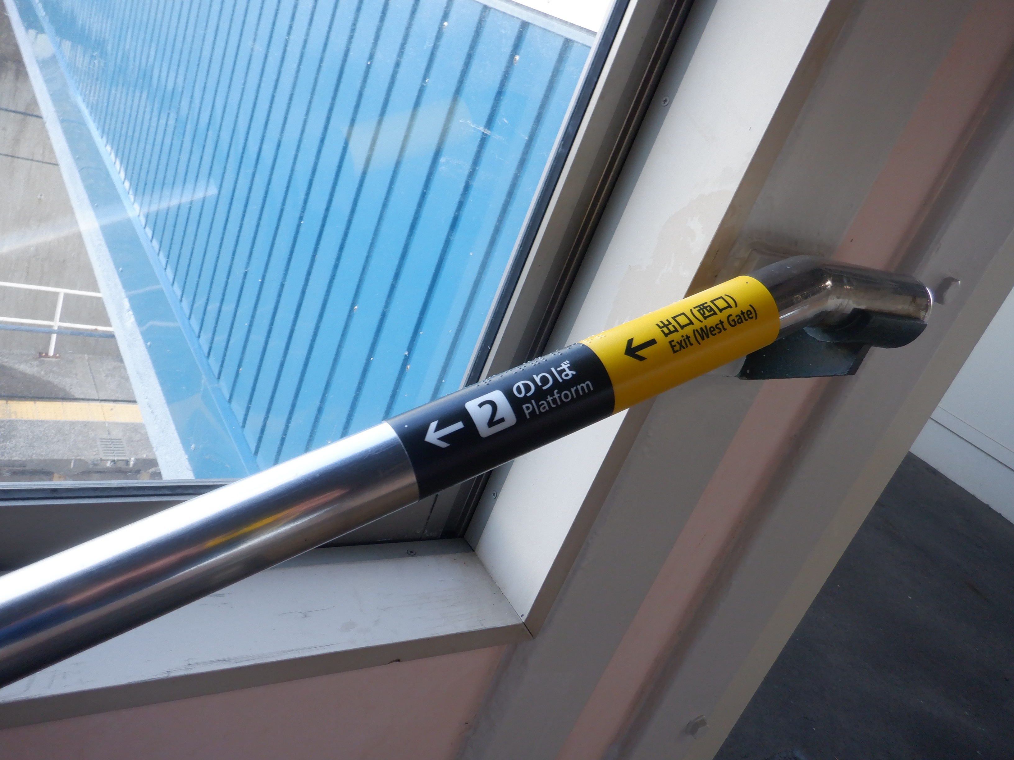 駅名標のJRロゴの上にはシールが貼られていました。また、跨線橋階段の手すりの案内が新しくなっているのですが、次回詳しく見ています。