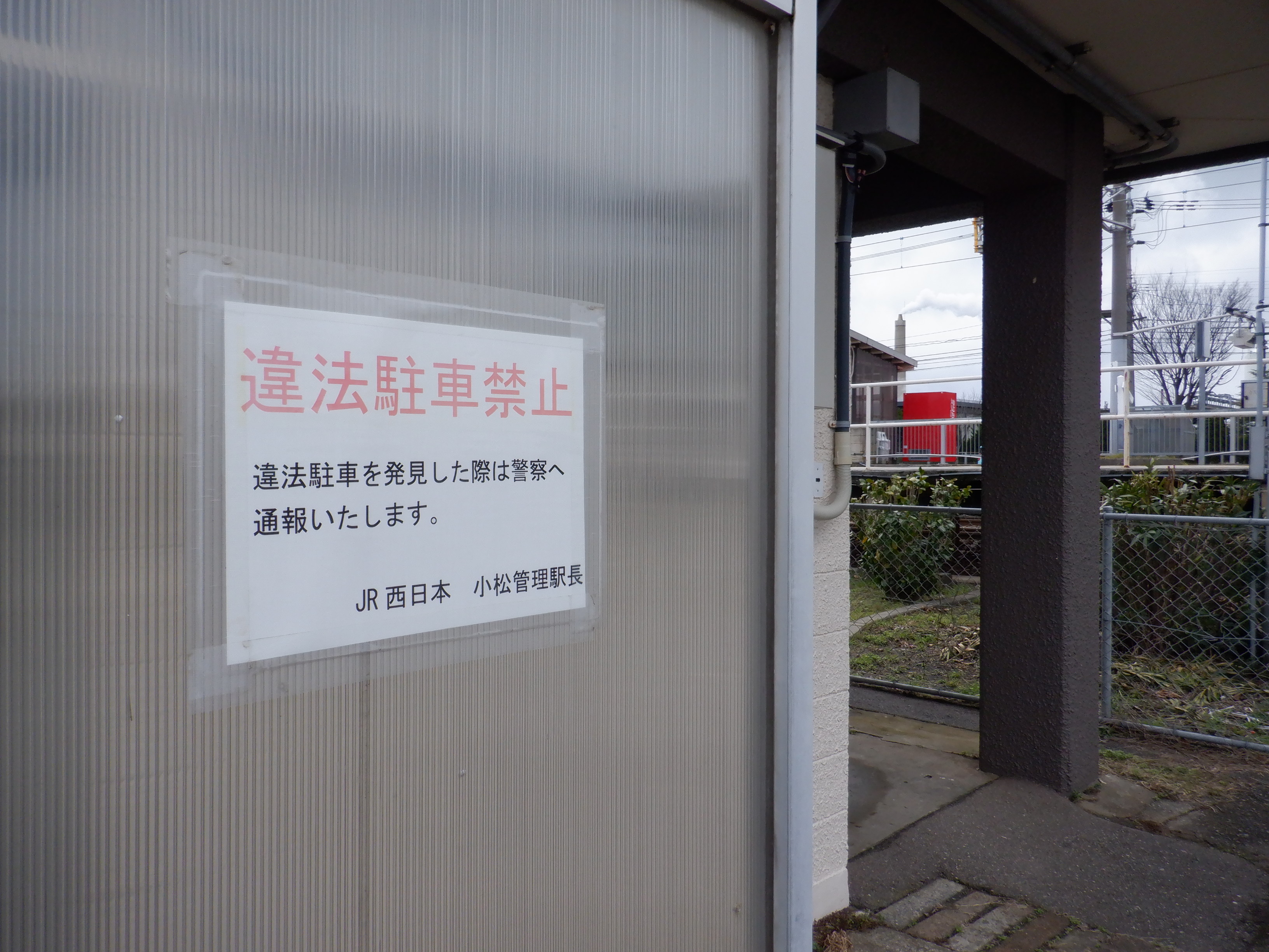 トイレのところの違法駐車禁止の貼り紙。JR西日本と書かれています。