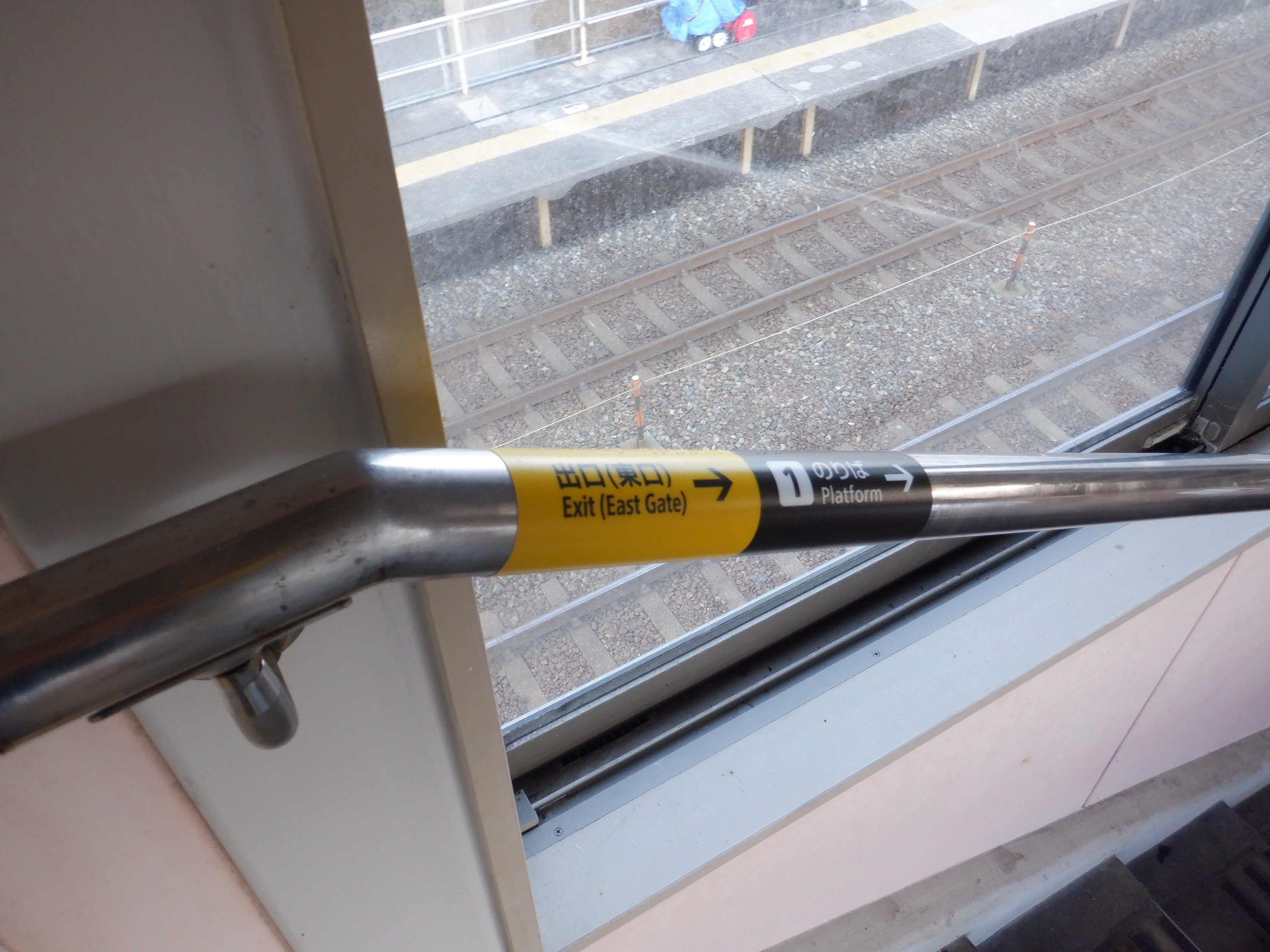 2番のりば側の跨線橋階段。手すりの案内は前回新しくなっていましたが、改めて今回見ています。