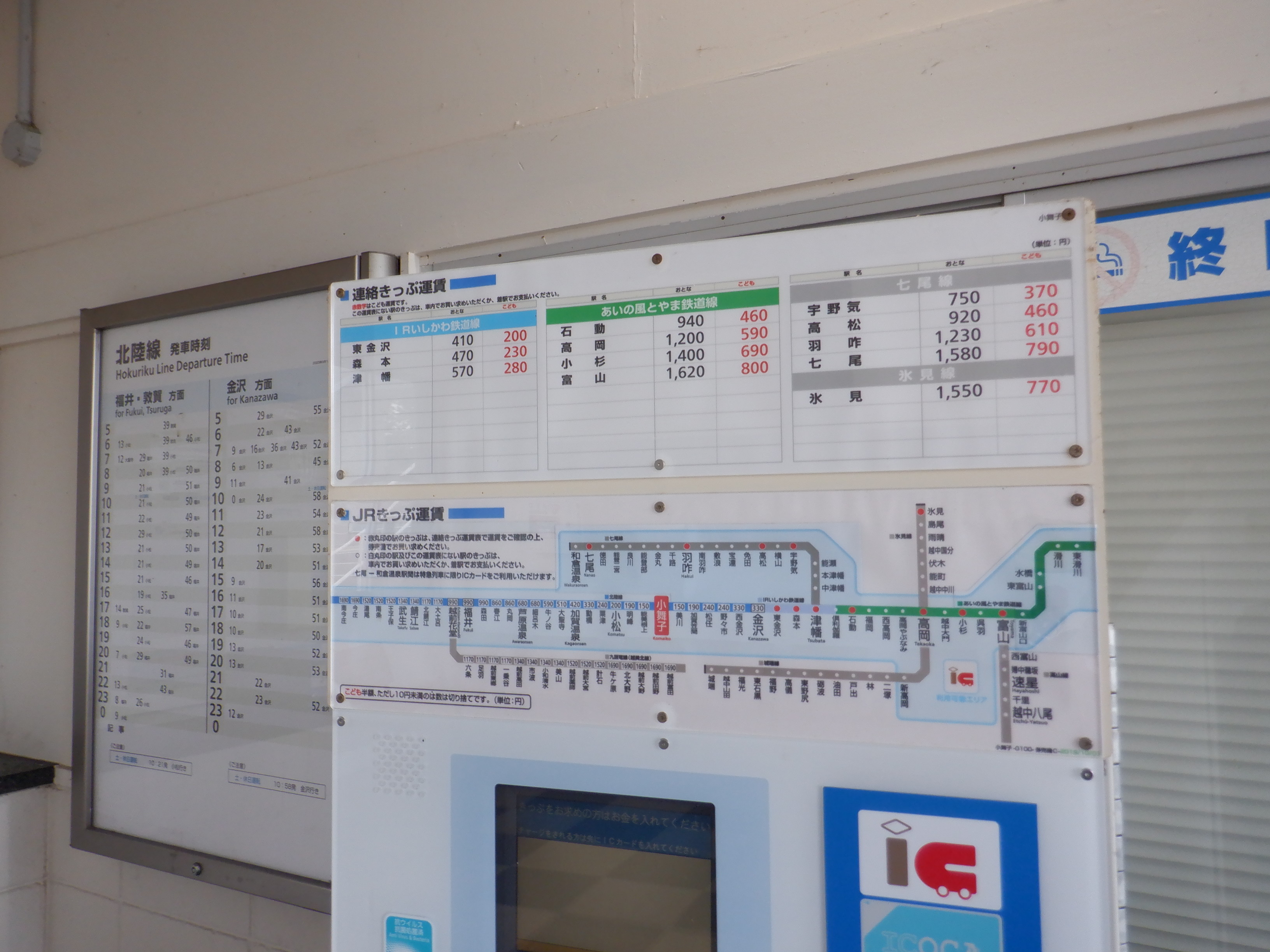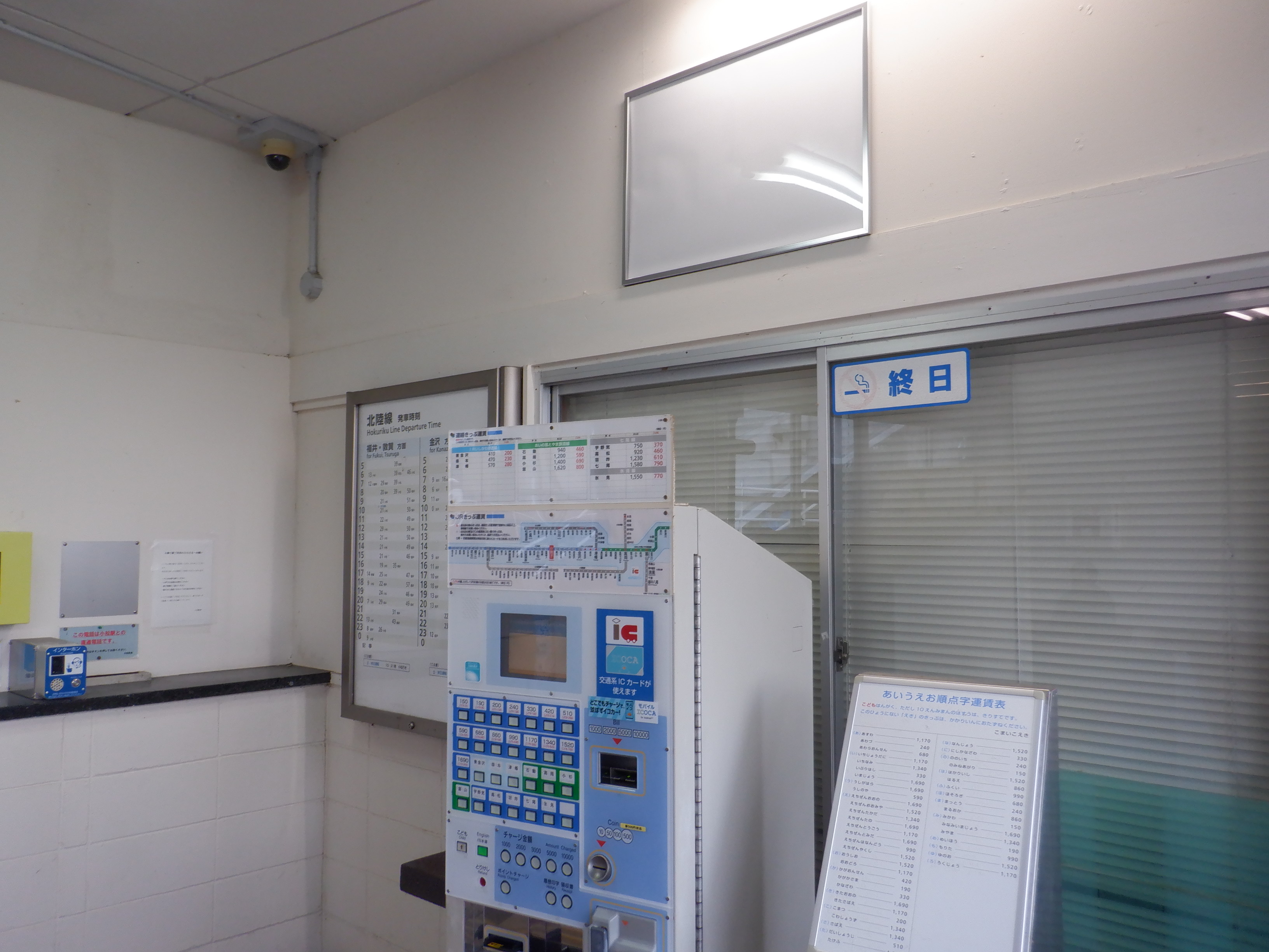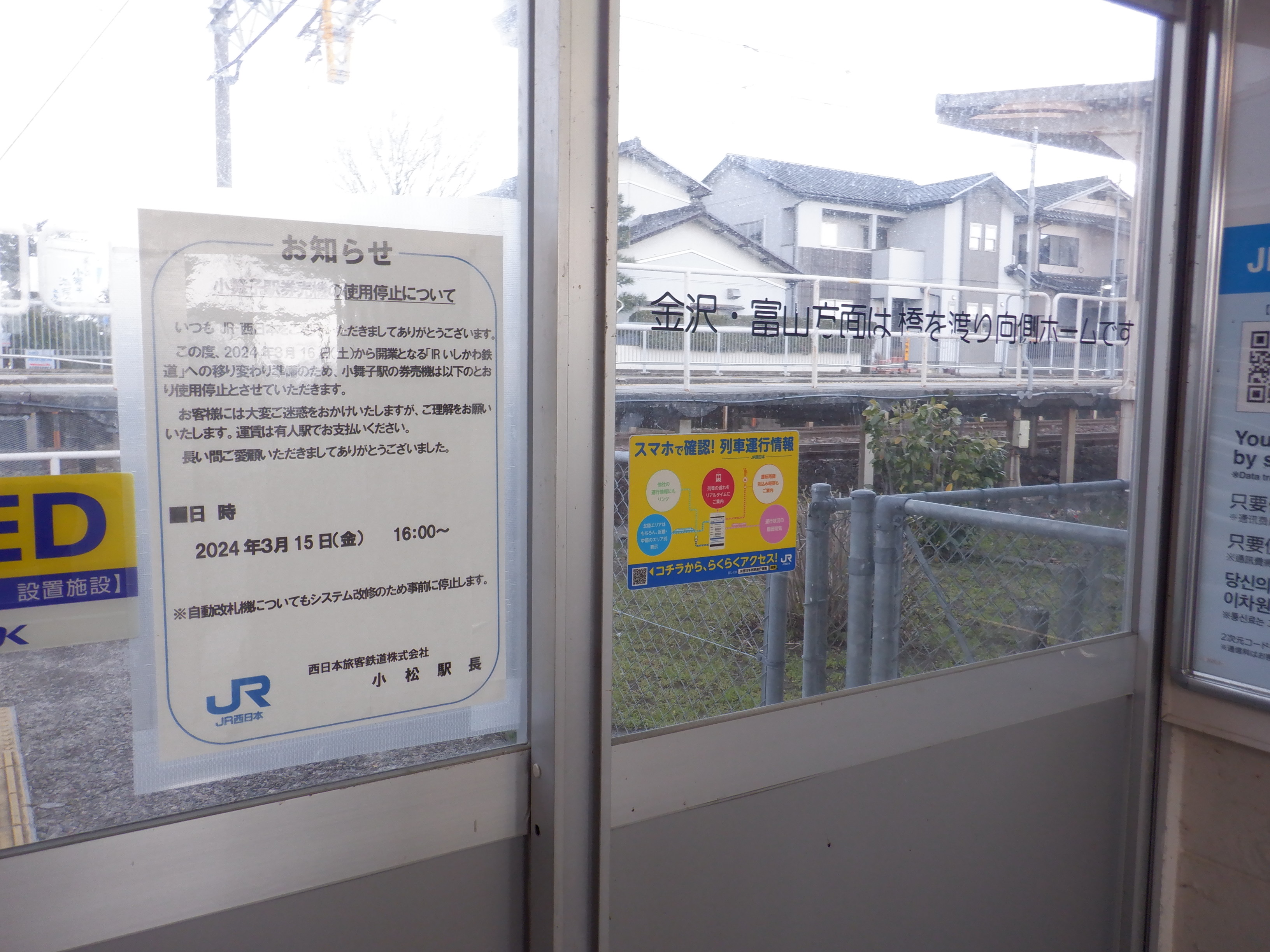 新しい券売機の背後のIRいしかわ鉄道県内全線開業ポスター。