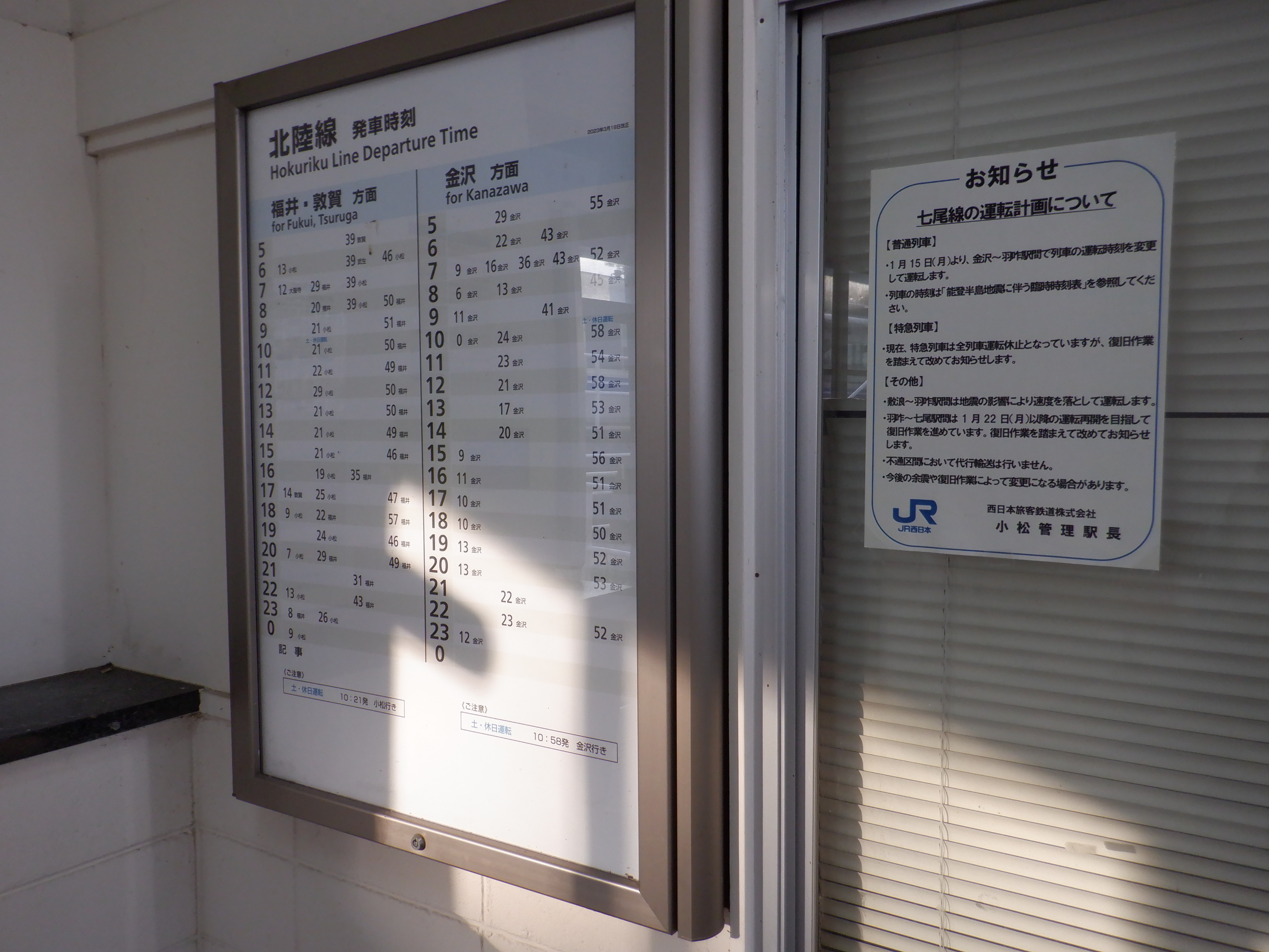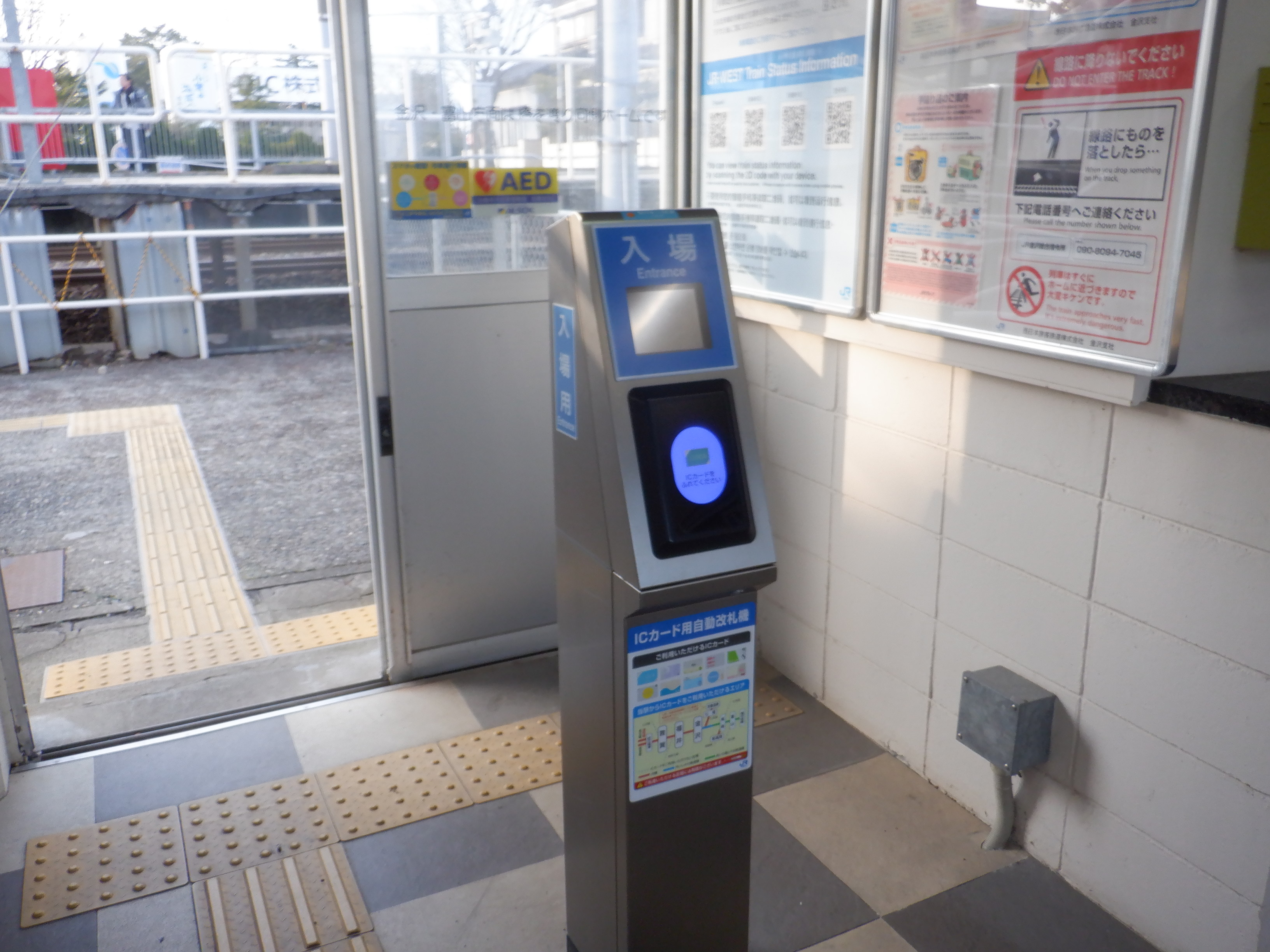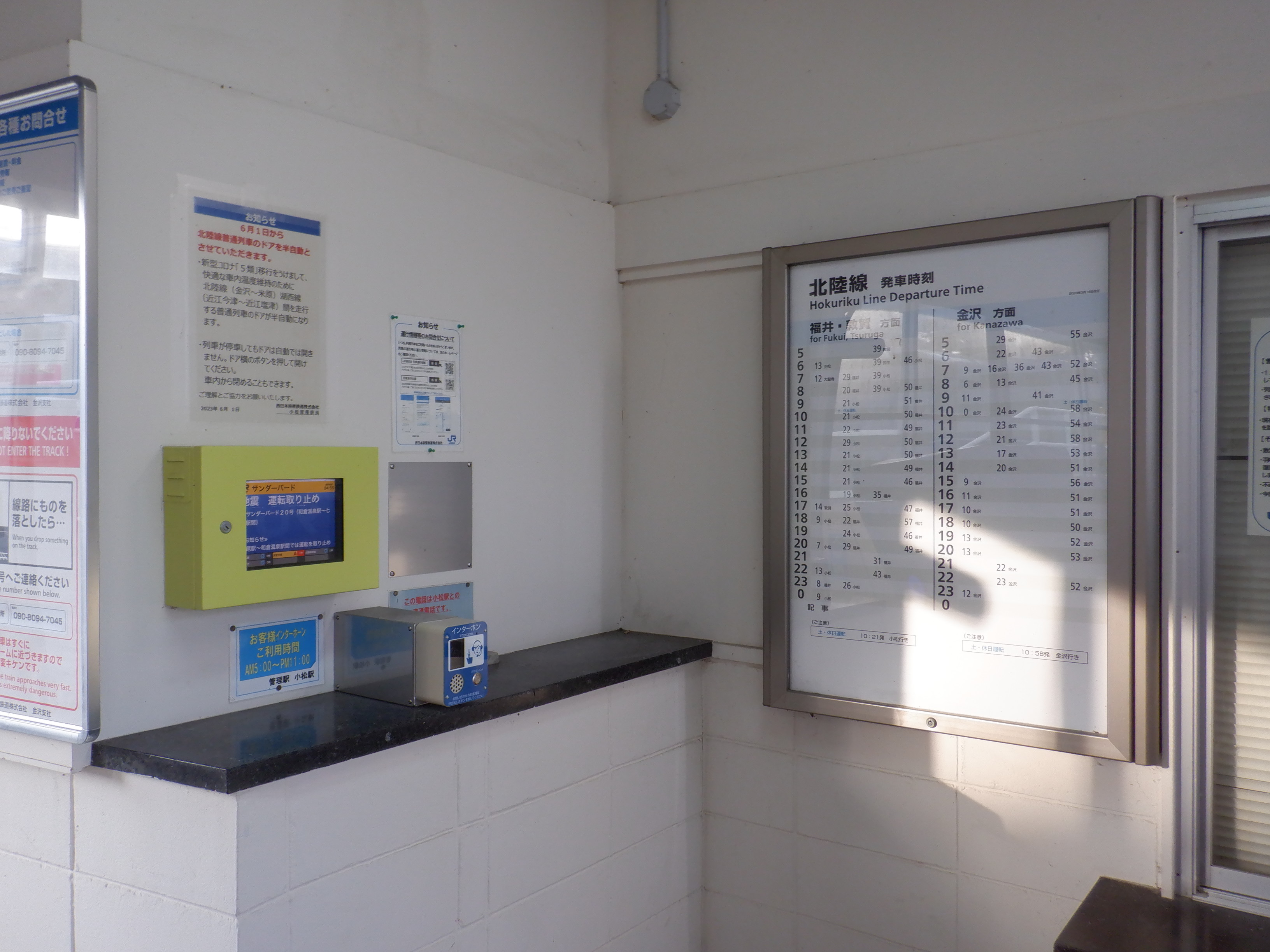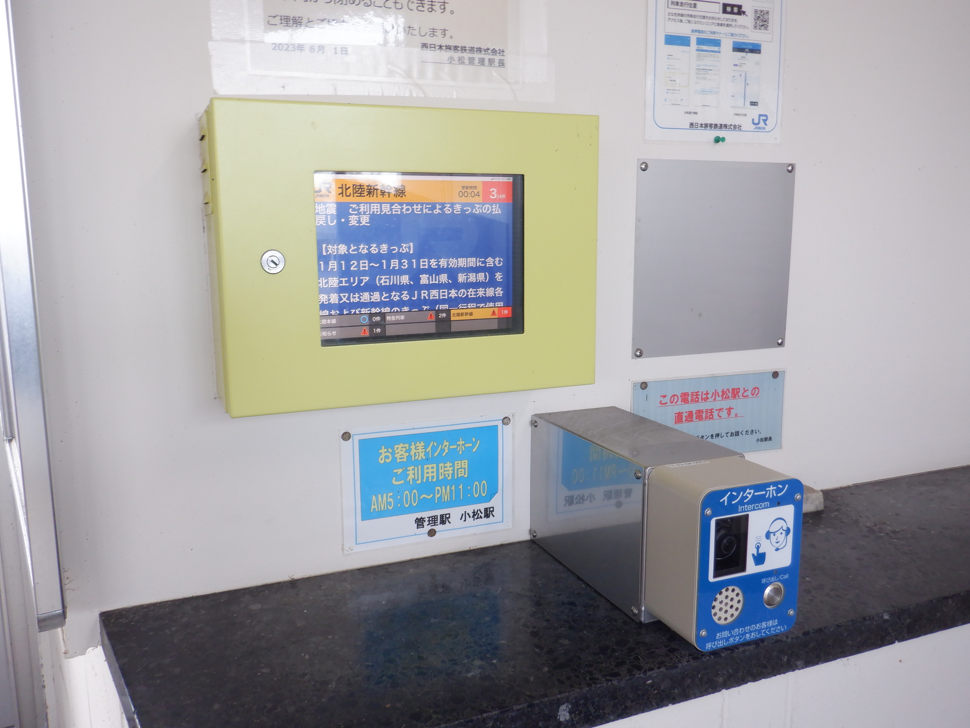 新しい券売機の背後のIRいしかわ鉄道県内全線開業ポスター。
