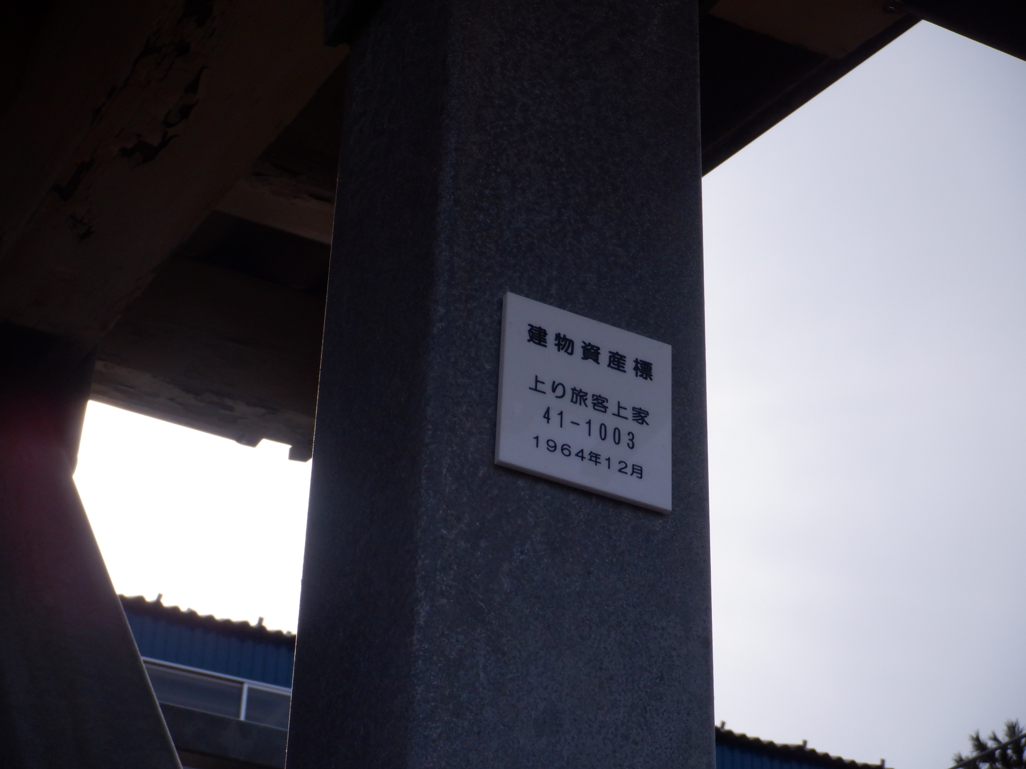 1番のりば側の跨線橋階段とそこから少し伸びている「上家」と称する部分の資産標。