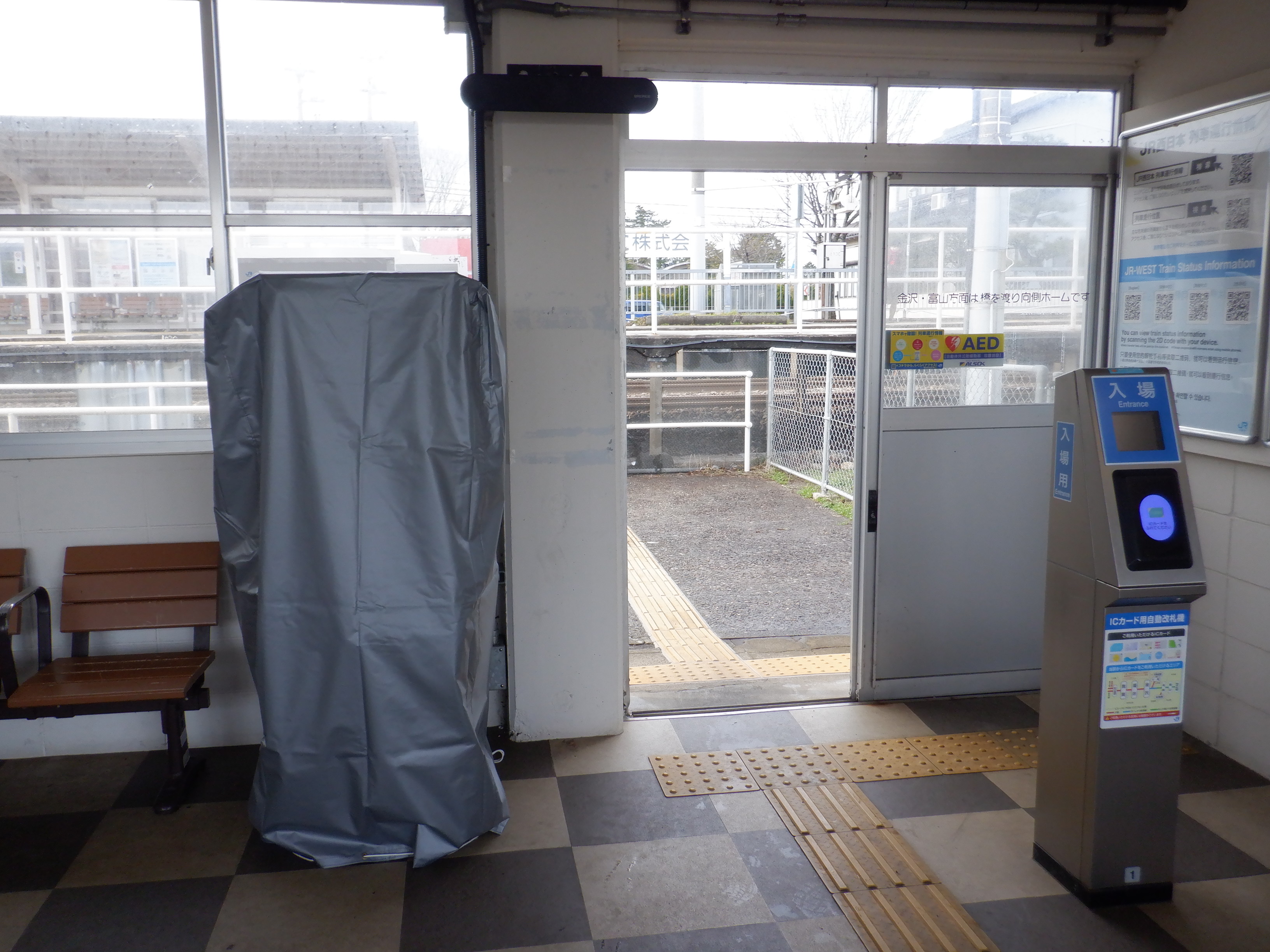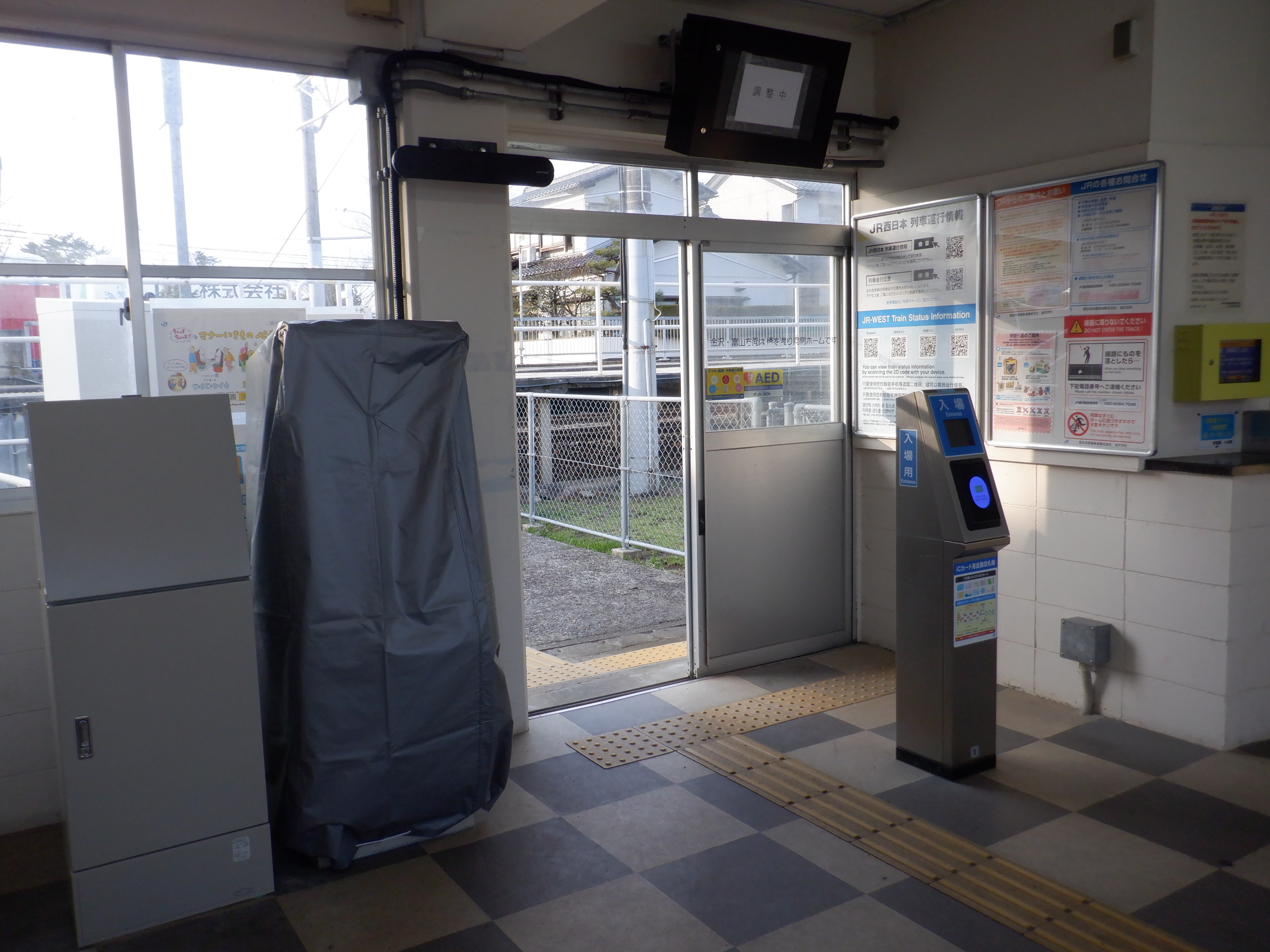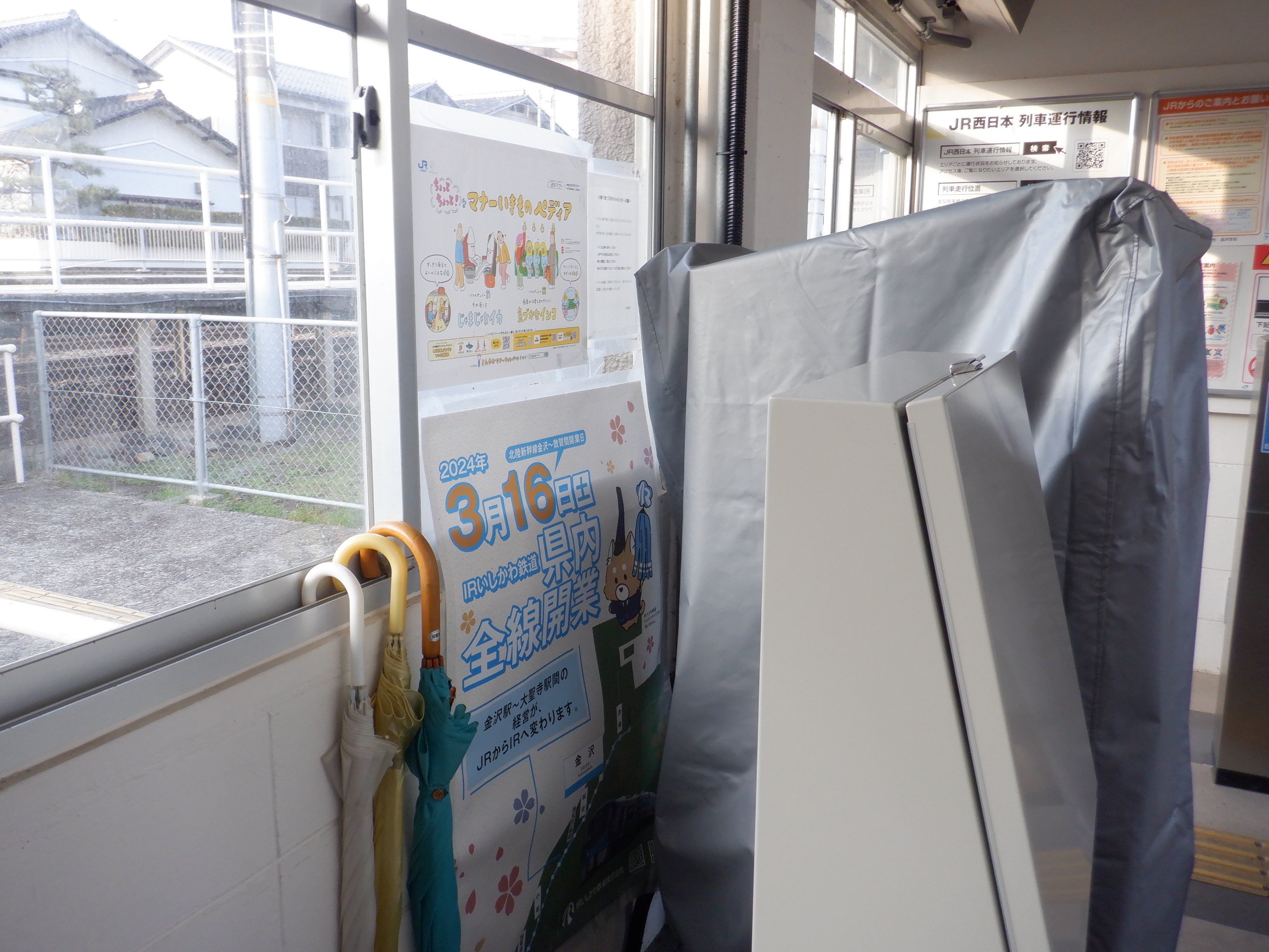 カバーを被った移管後の券売機。その後ろにIRいしかわ鉄道県内全線開業ポスターがあります。