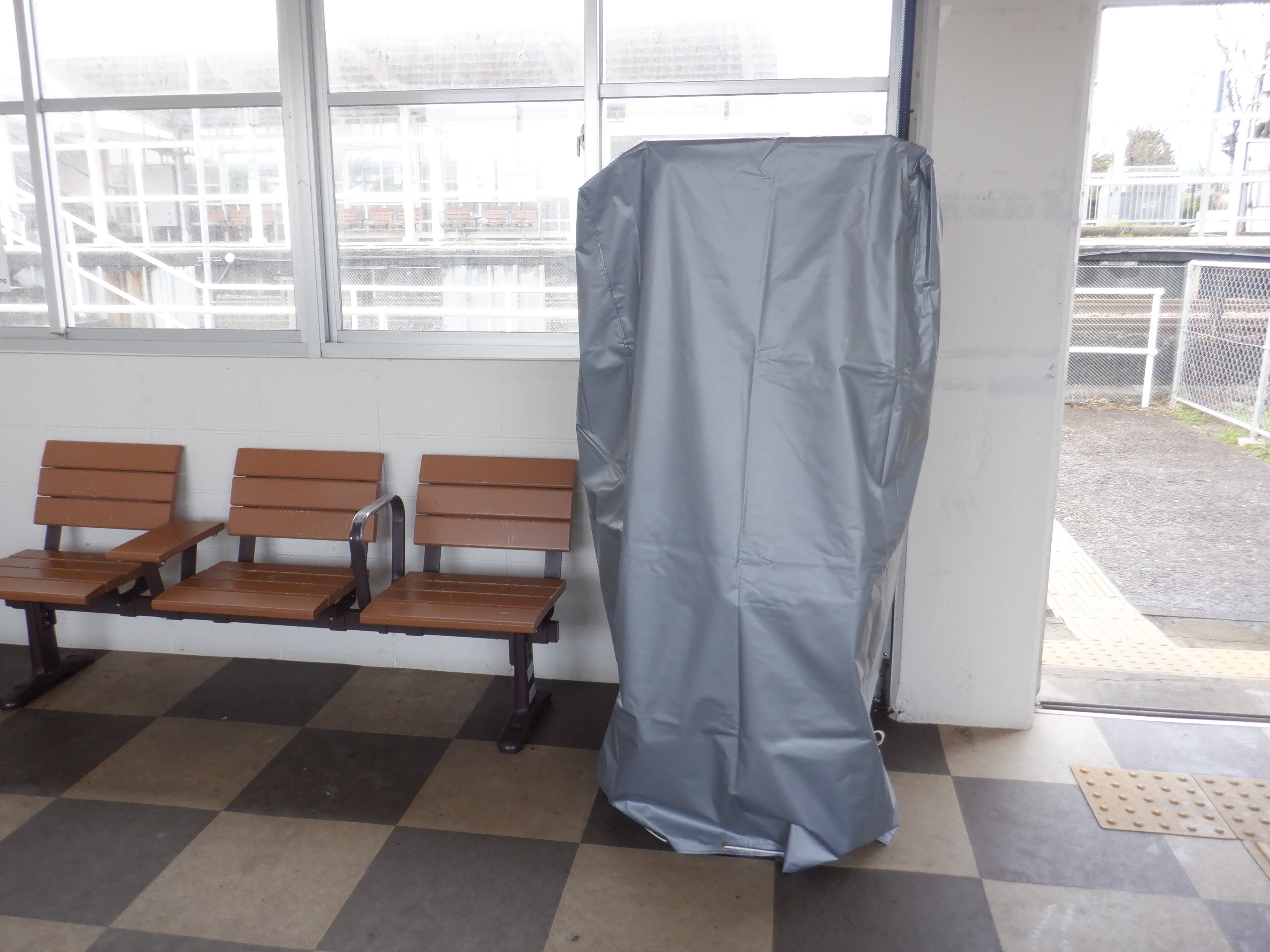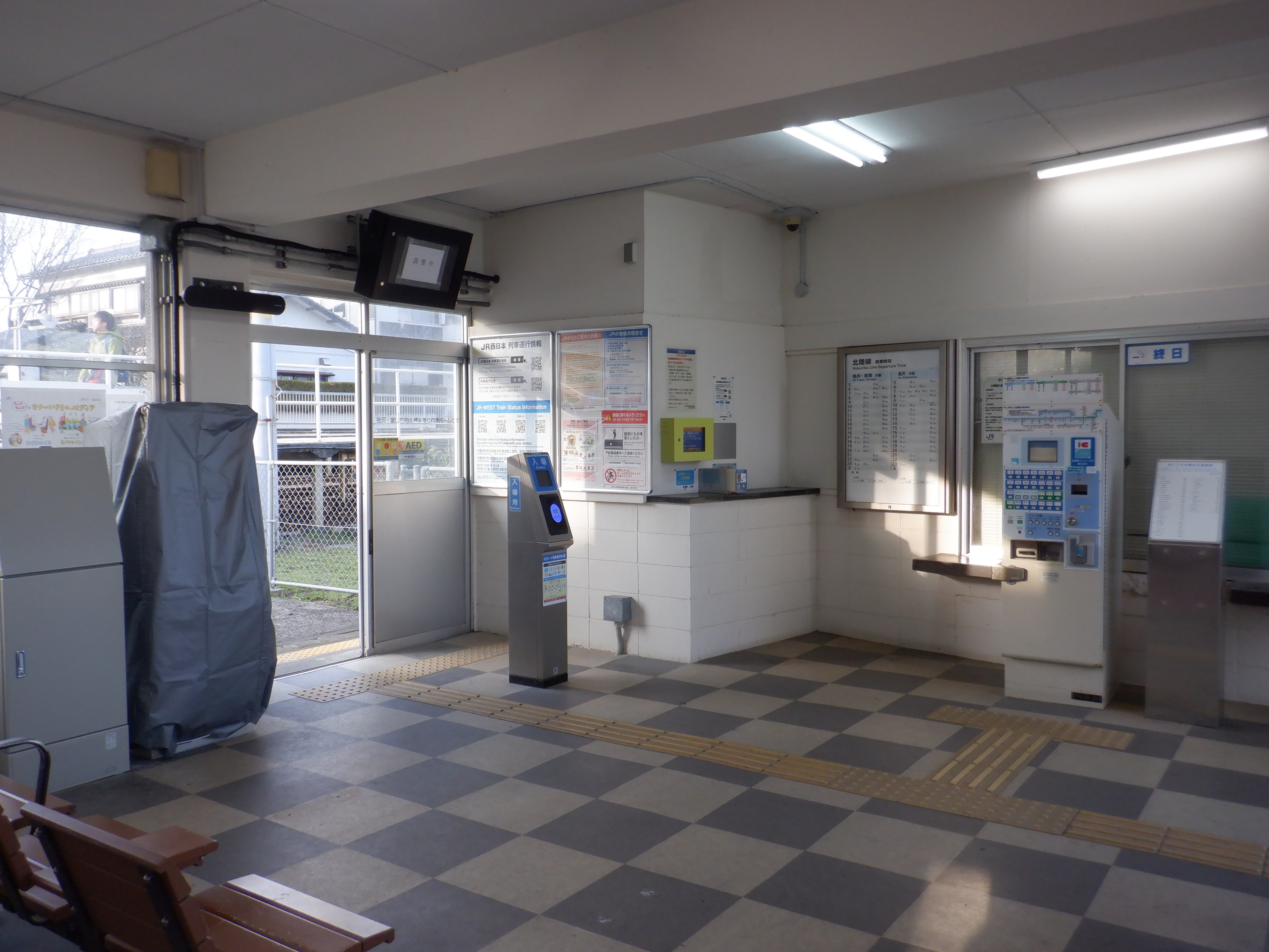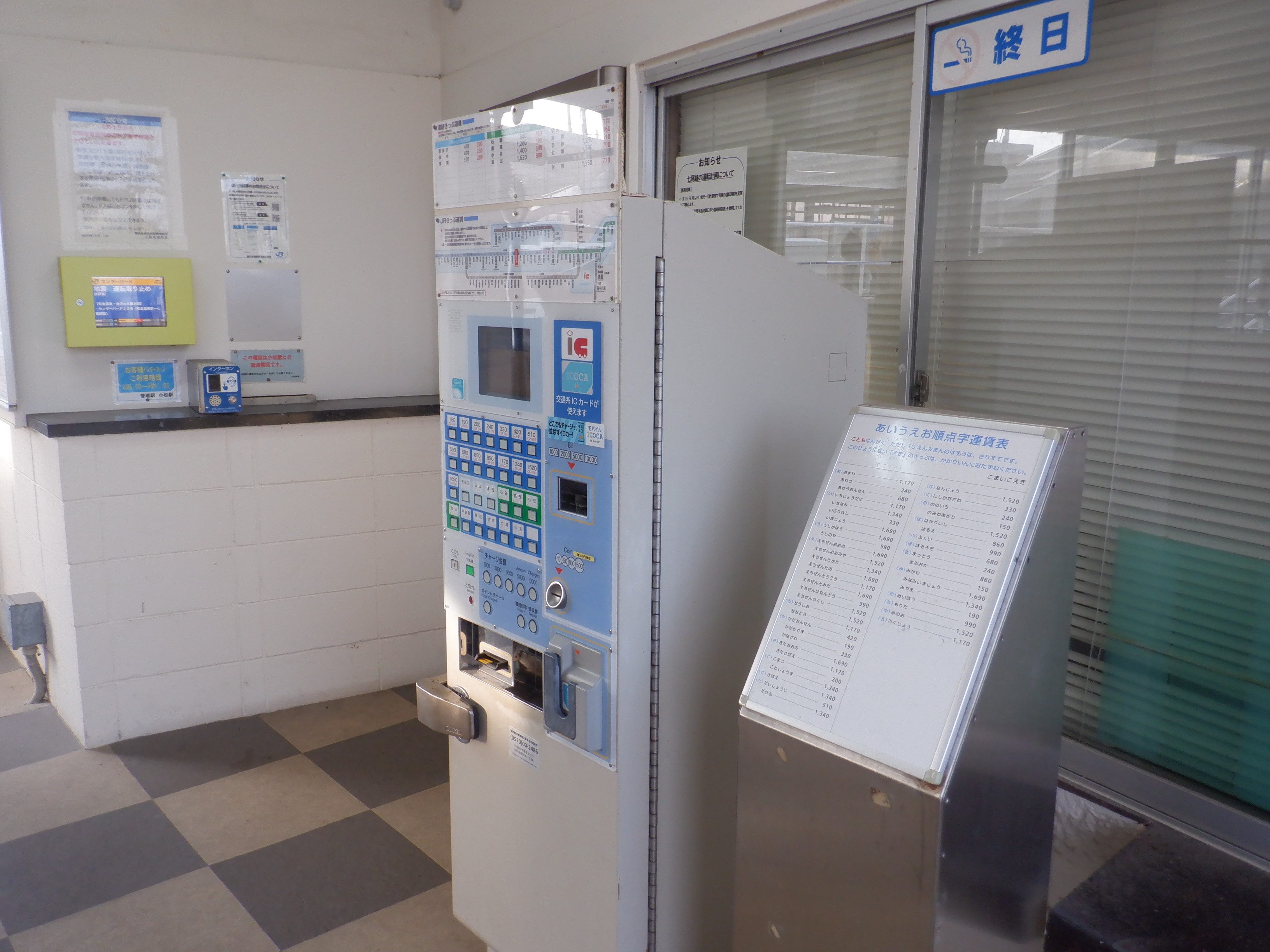 カバーを被った移管後の券売機。その後ろにIRいしかわ鉄道県内全線開業ポスターがあります。