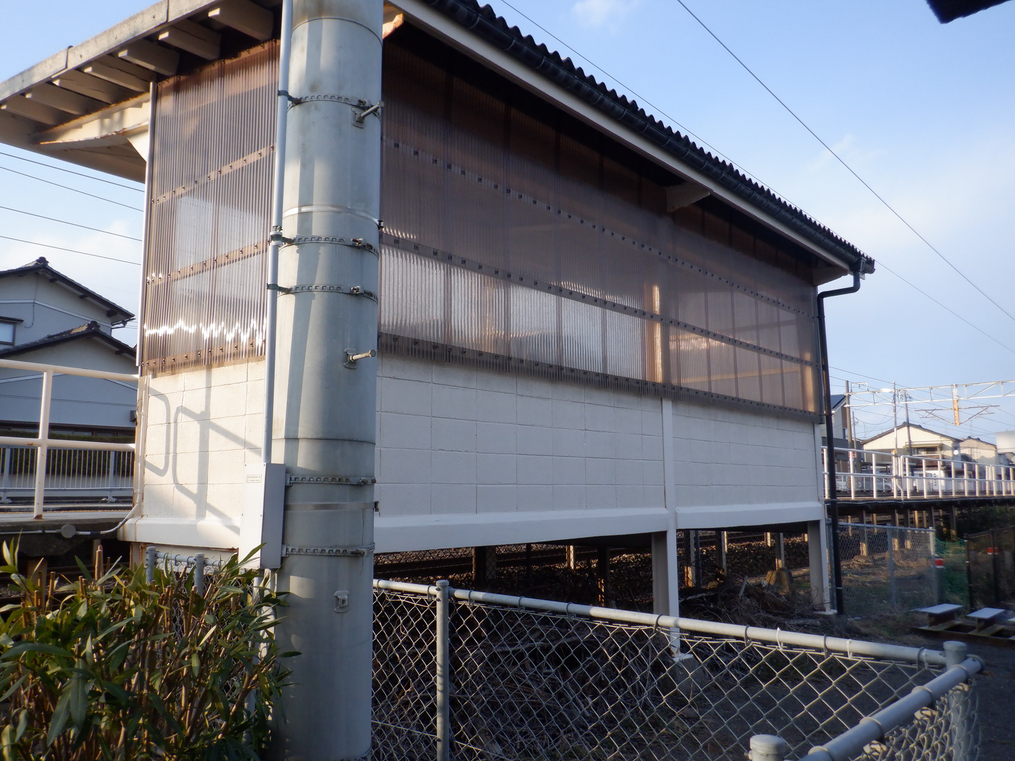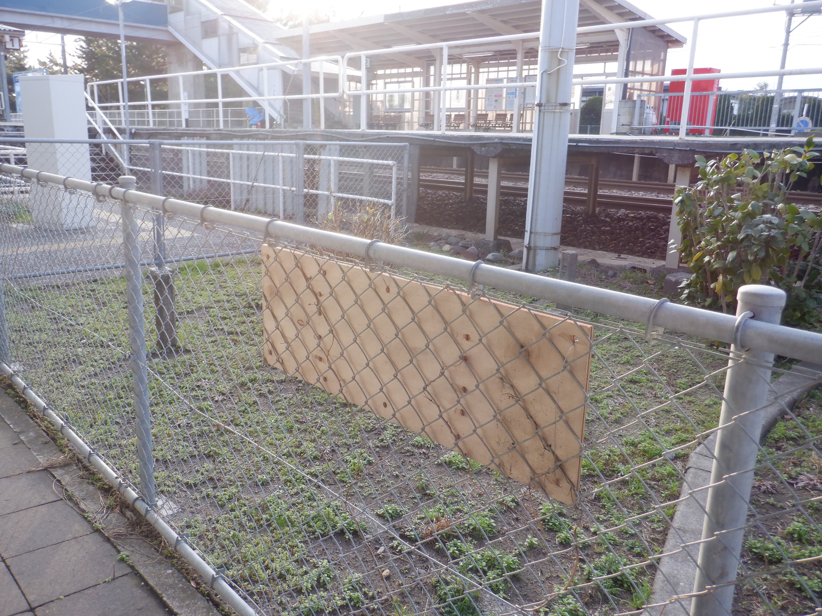 駅舎とホームの間の庭のフェンスに設置された錆実験。