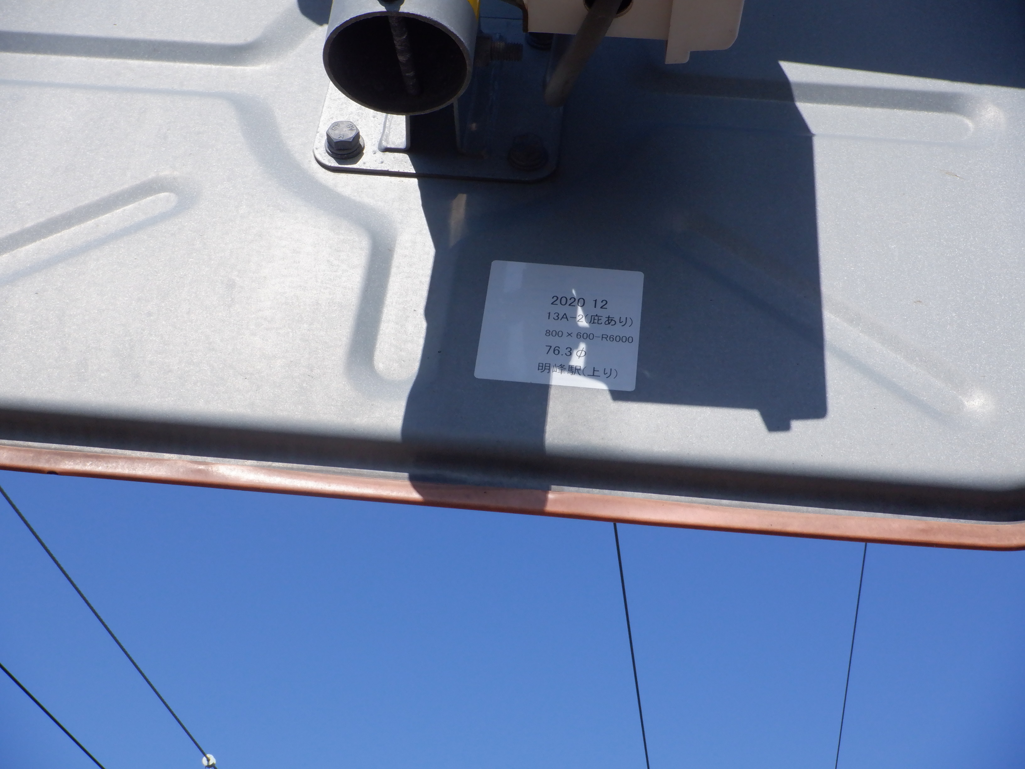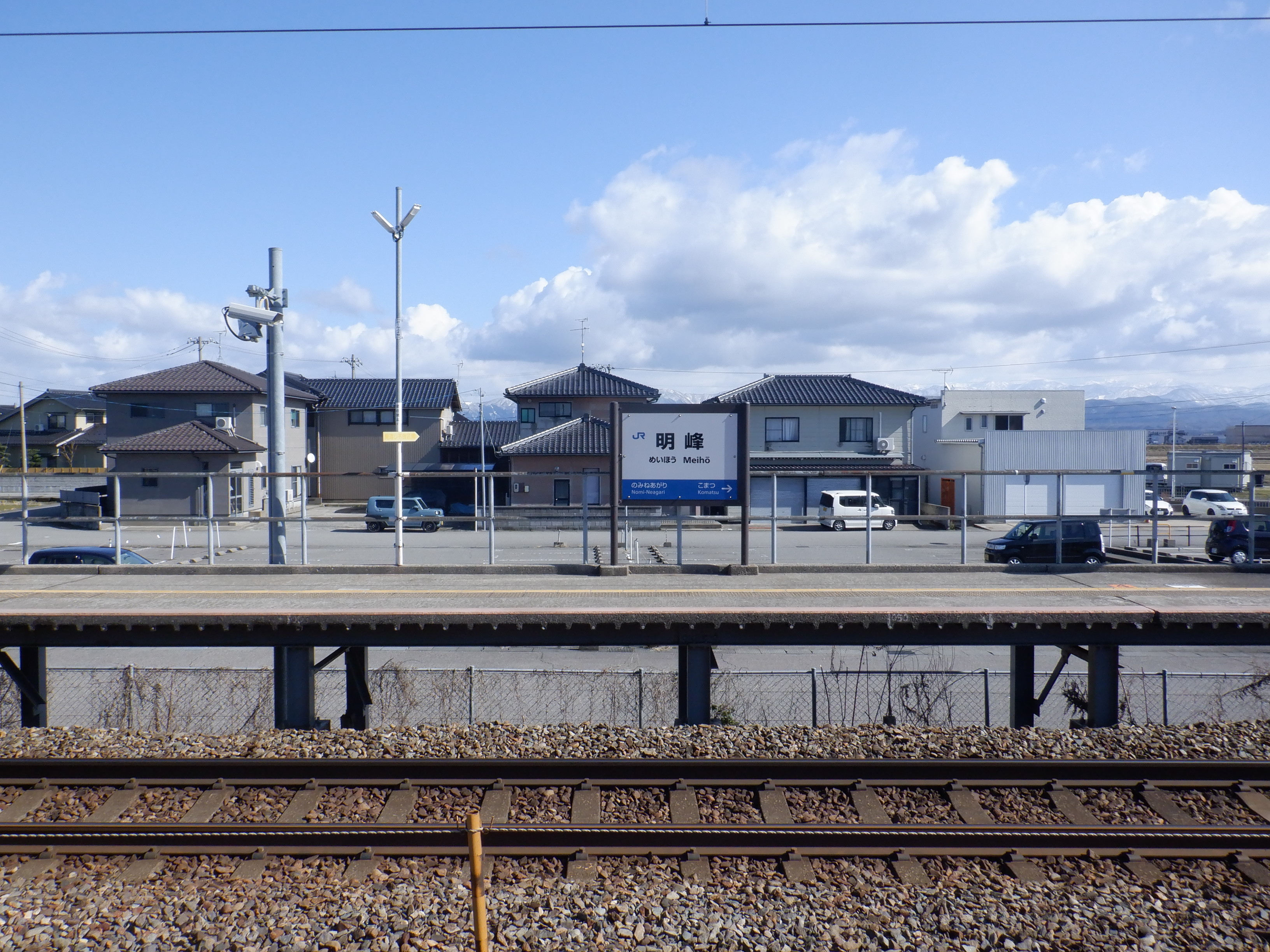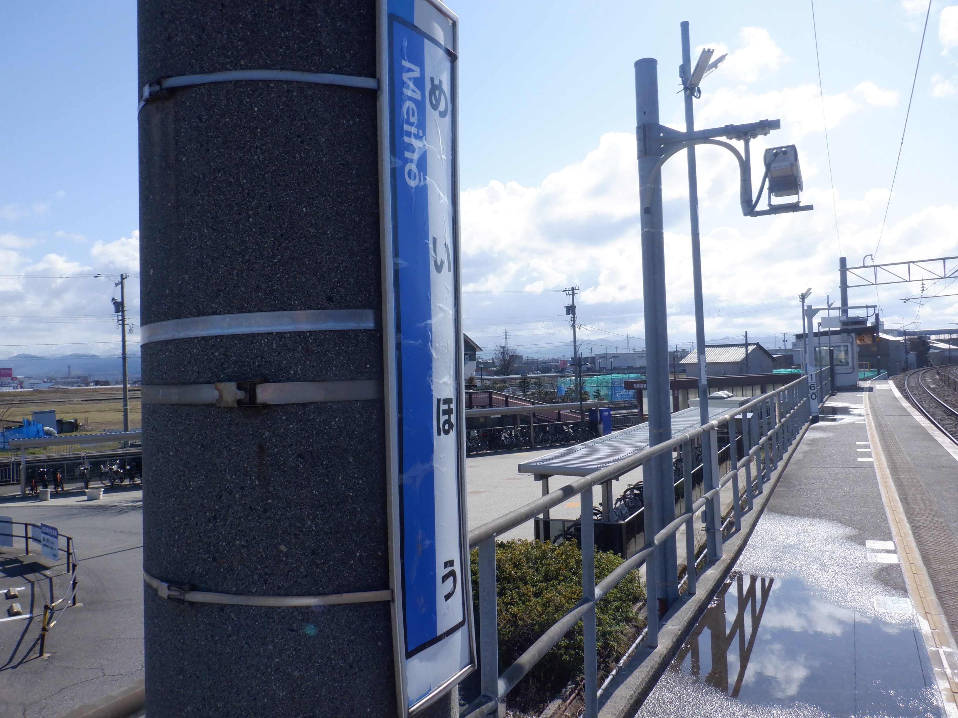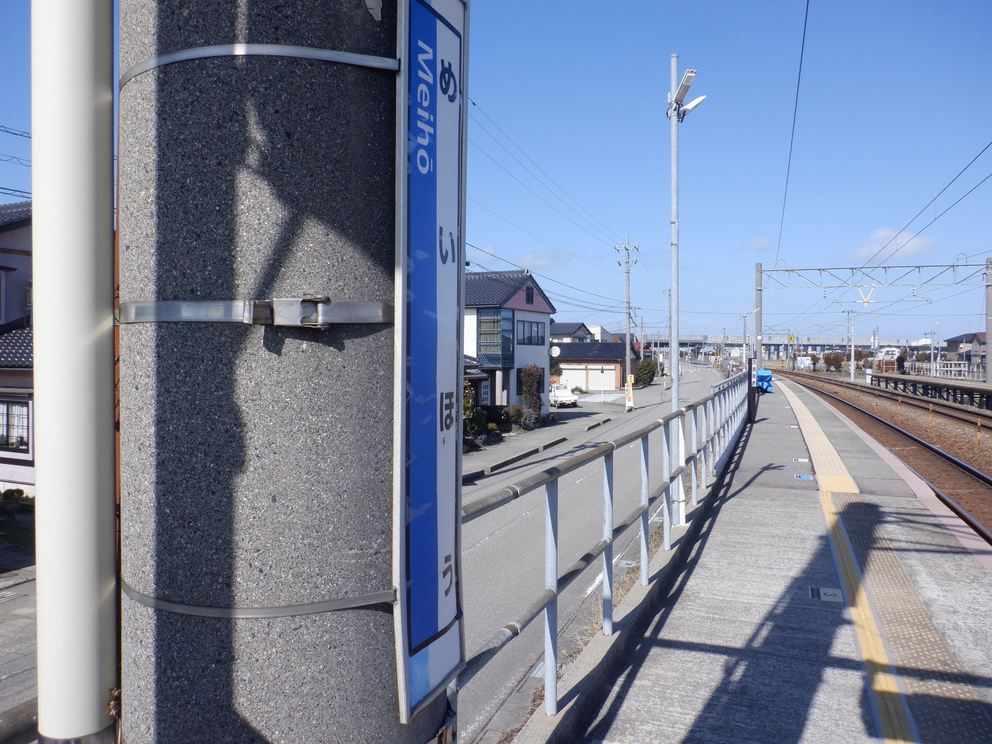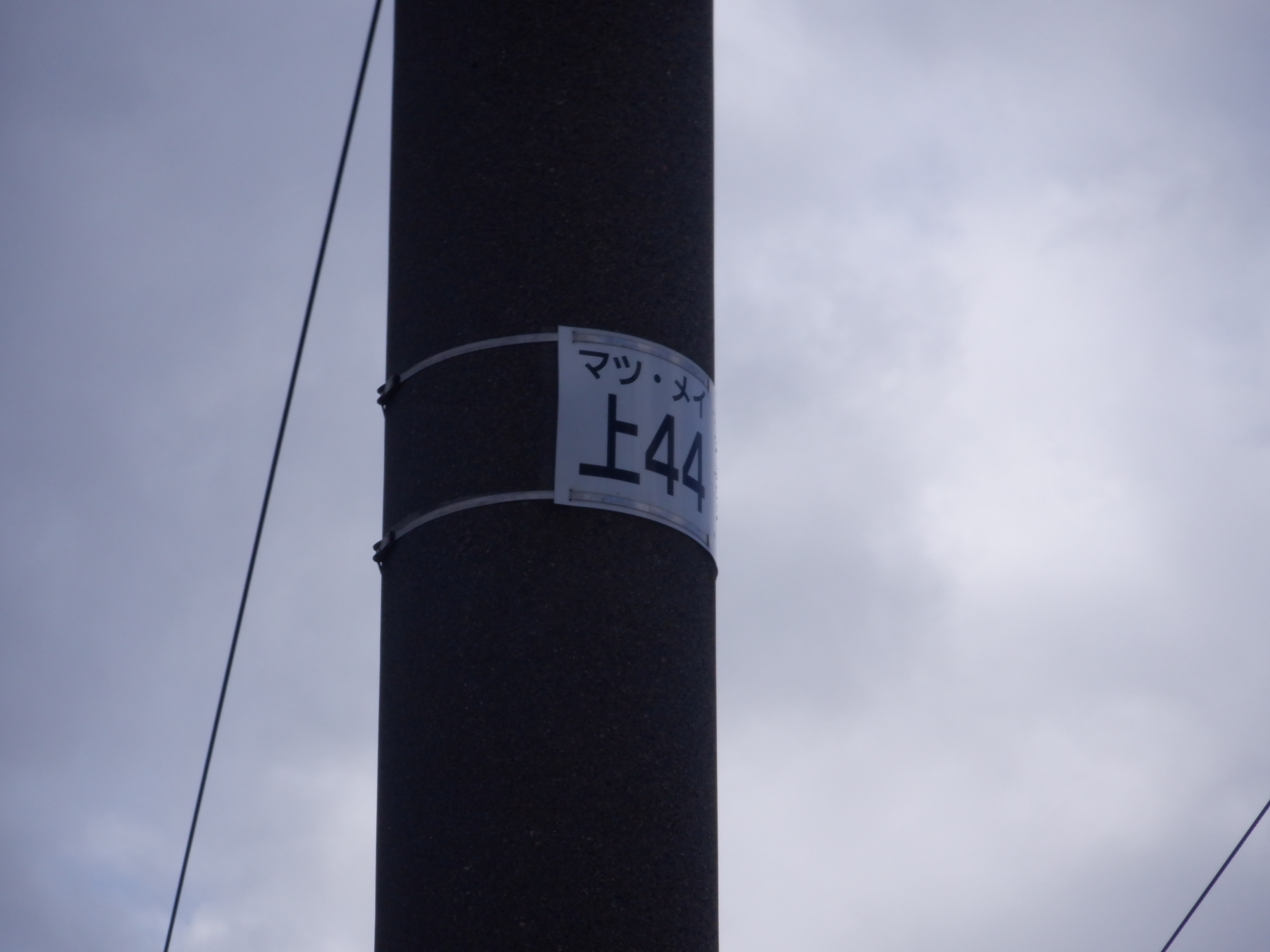 少し小松駅側に進んだところの架線柱の表示。「マツ・メイ」の表示があります。