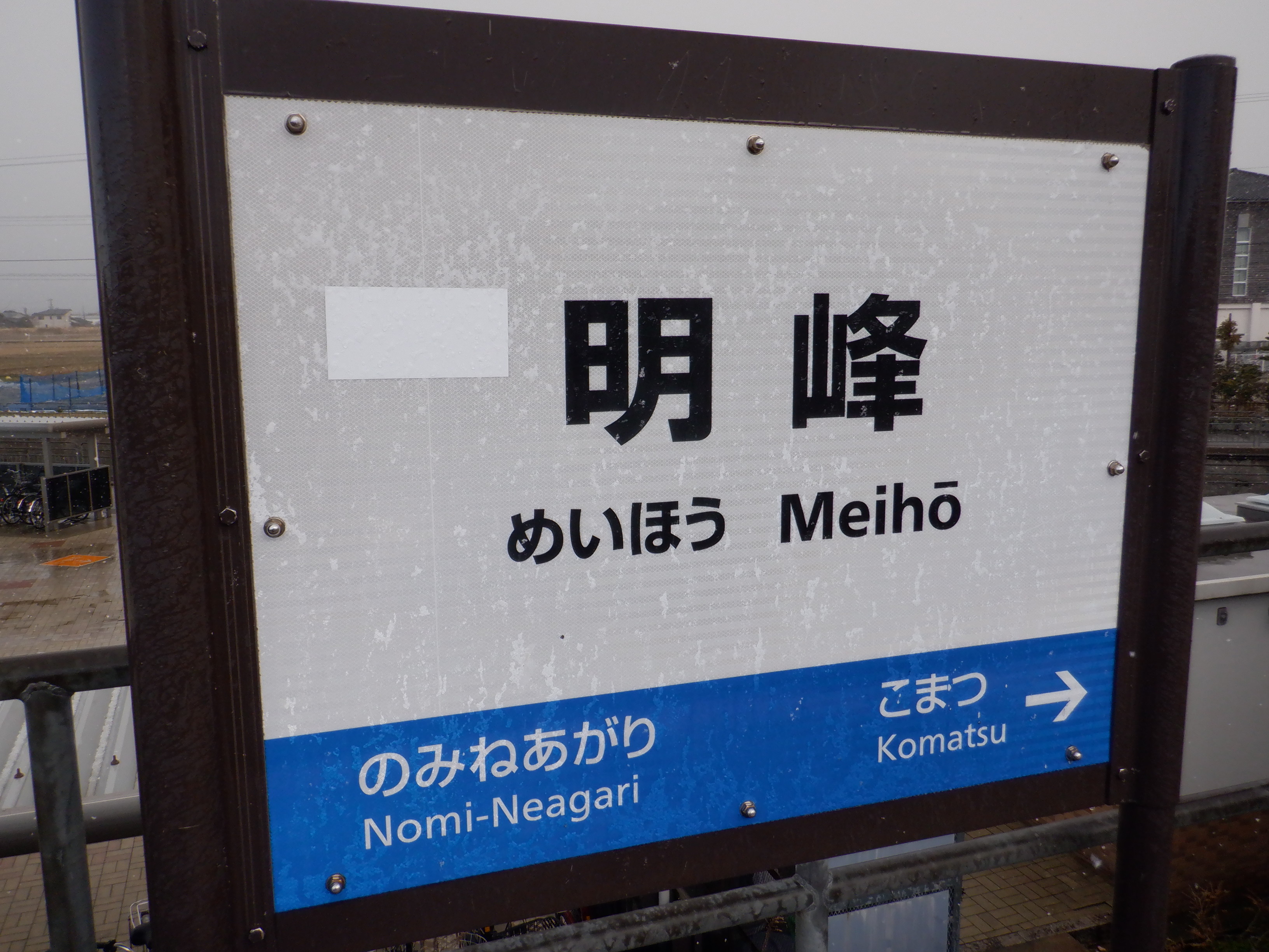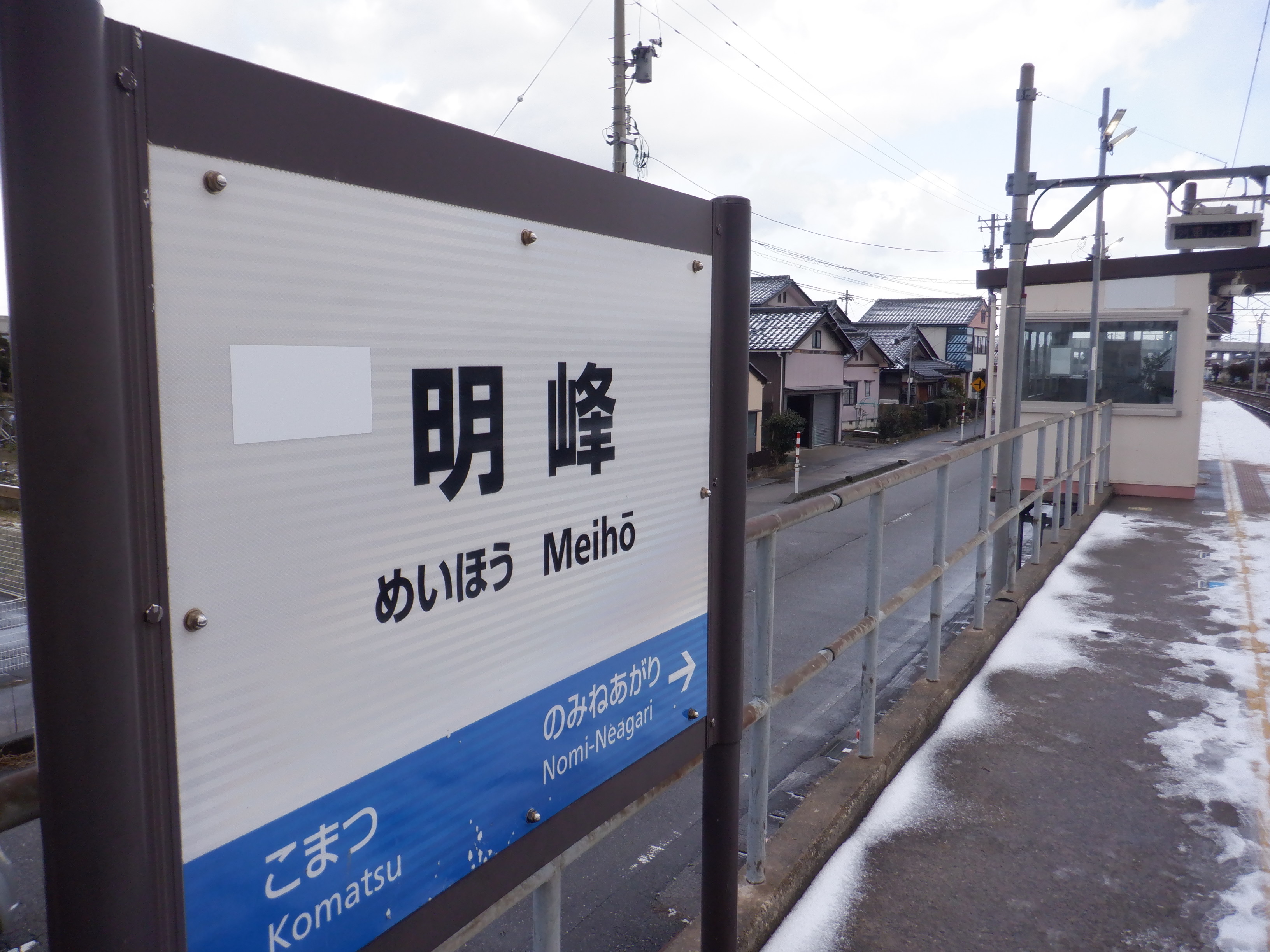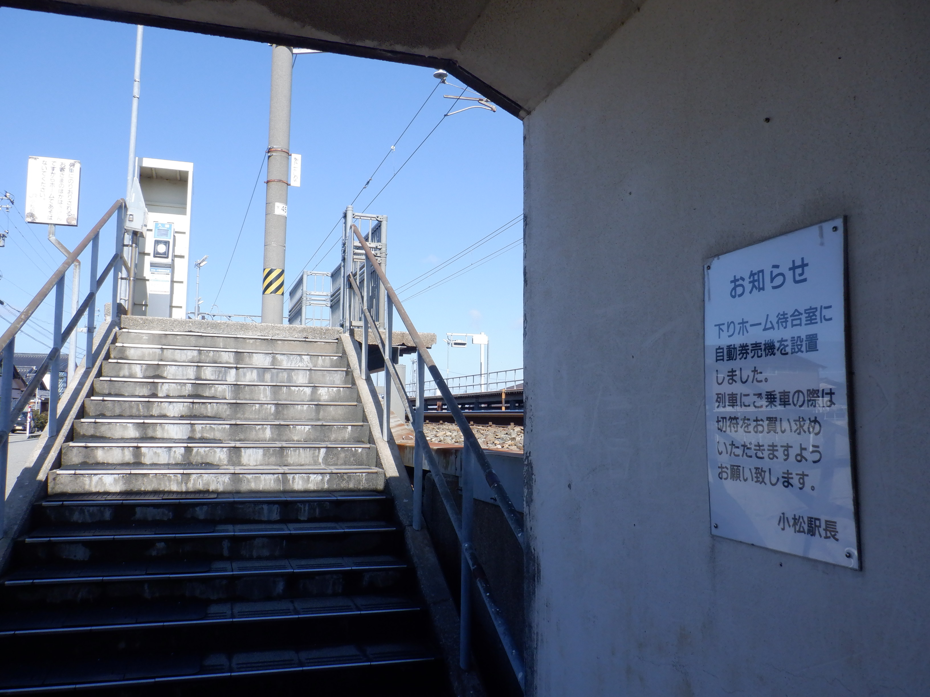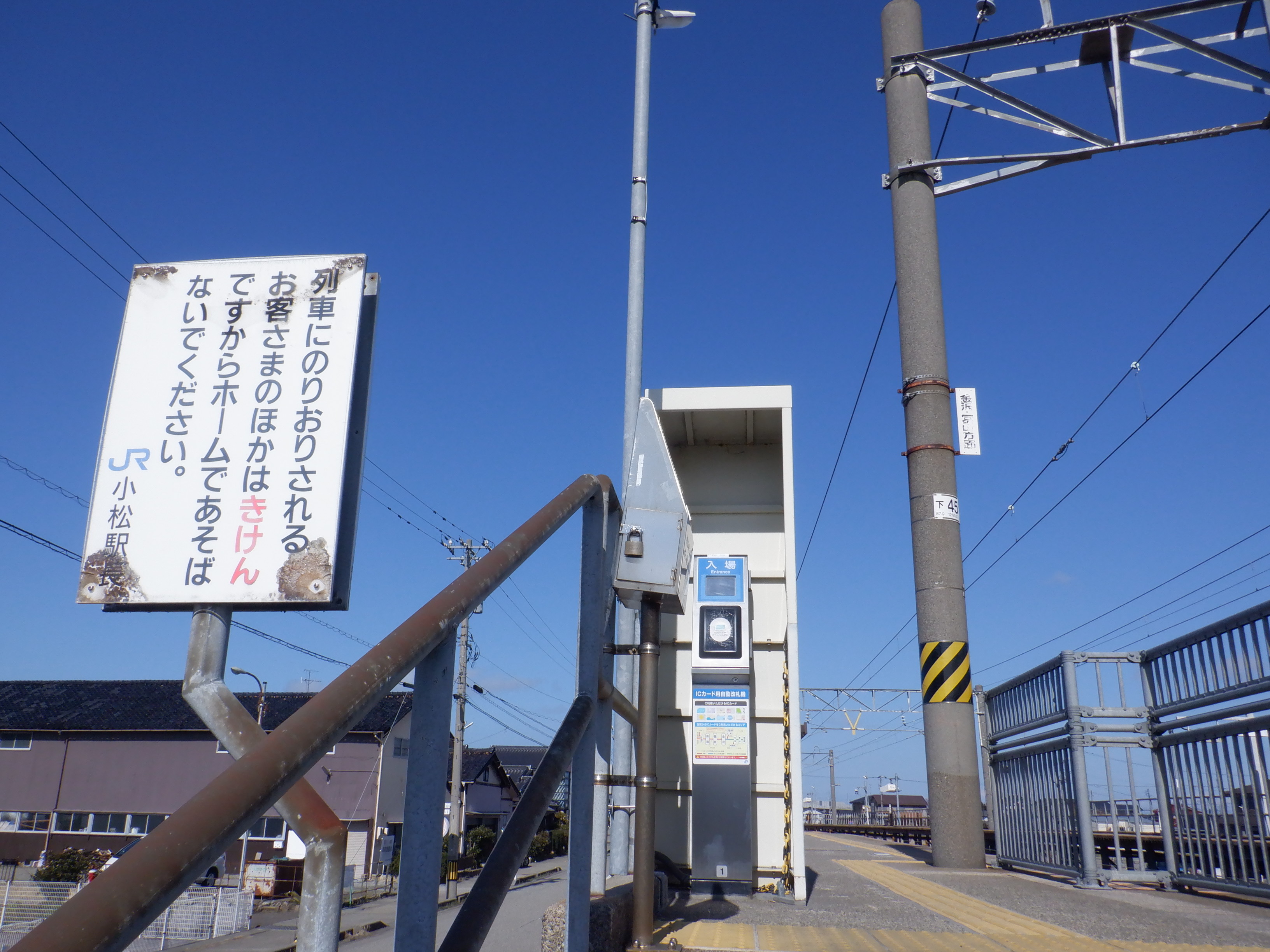 1番のりば小松駅側の駅名標。こちらは移管後はIRの駅名標となるのですが、この時点ではロゴが隠された状態でした。