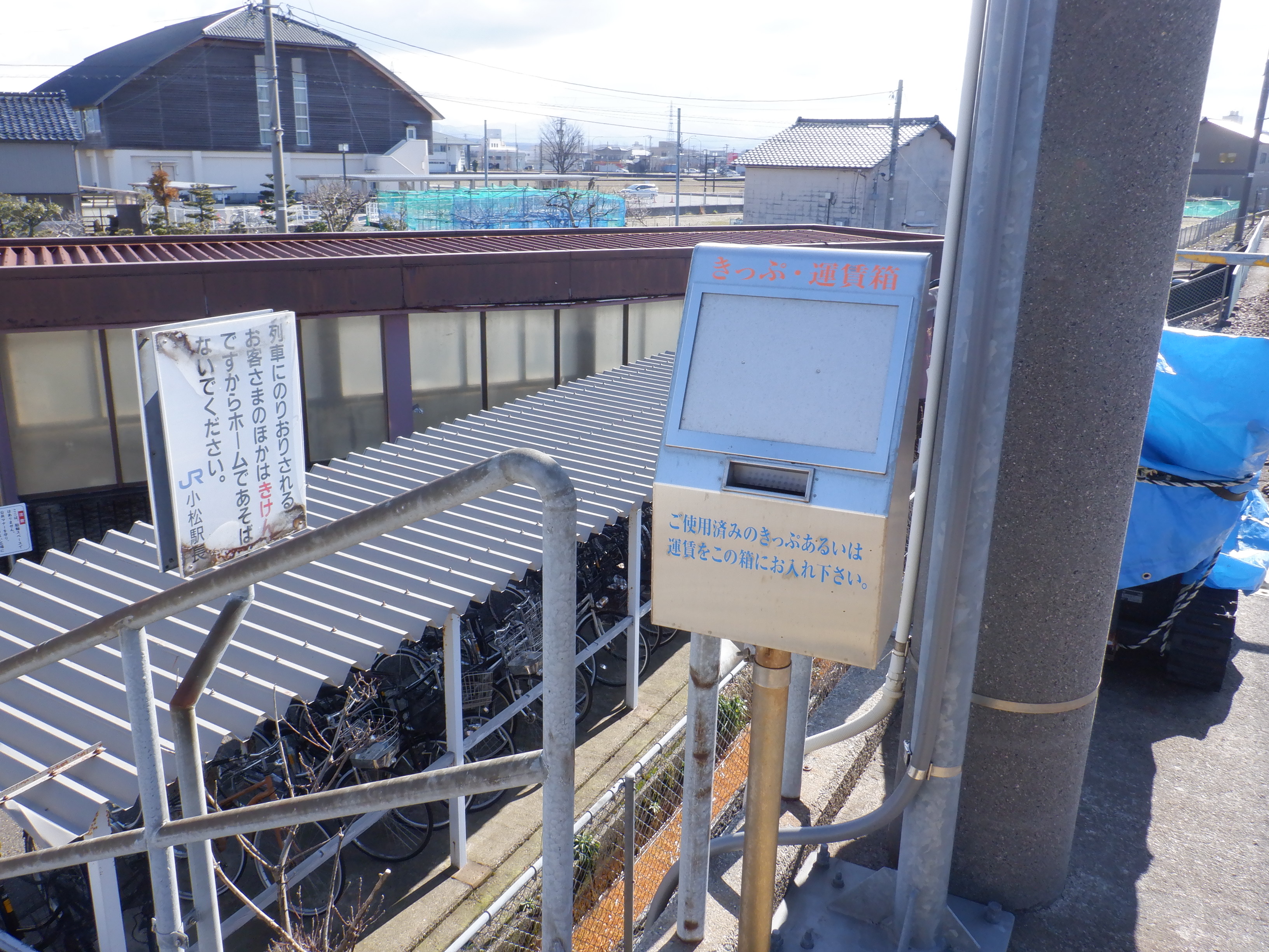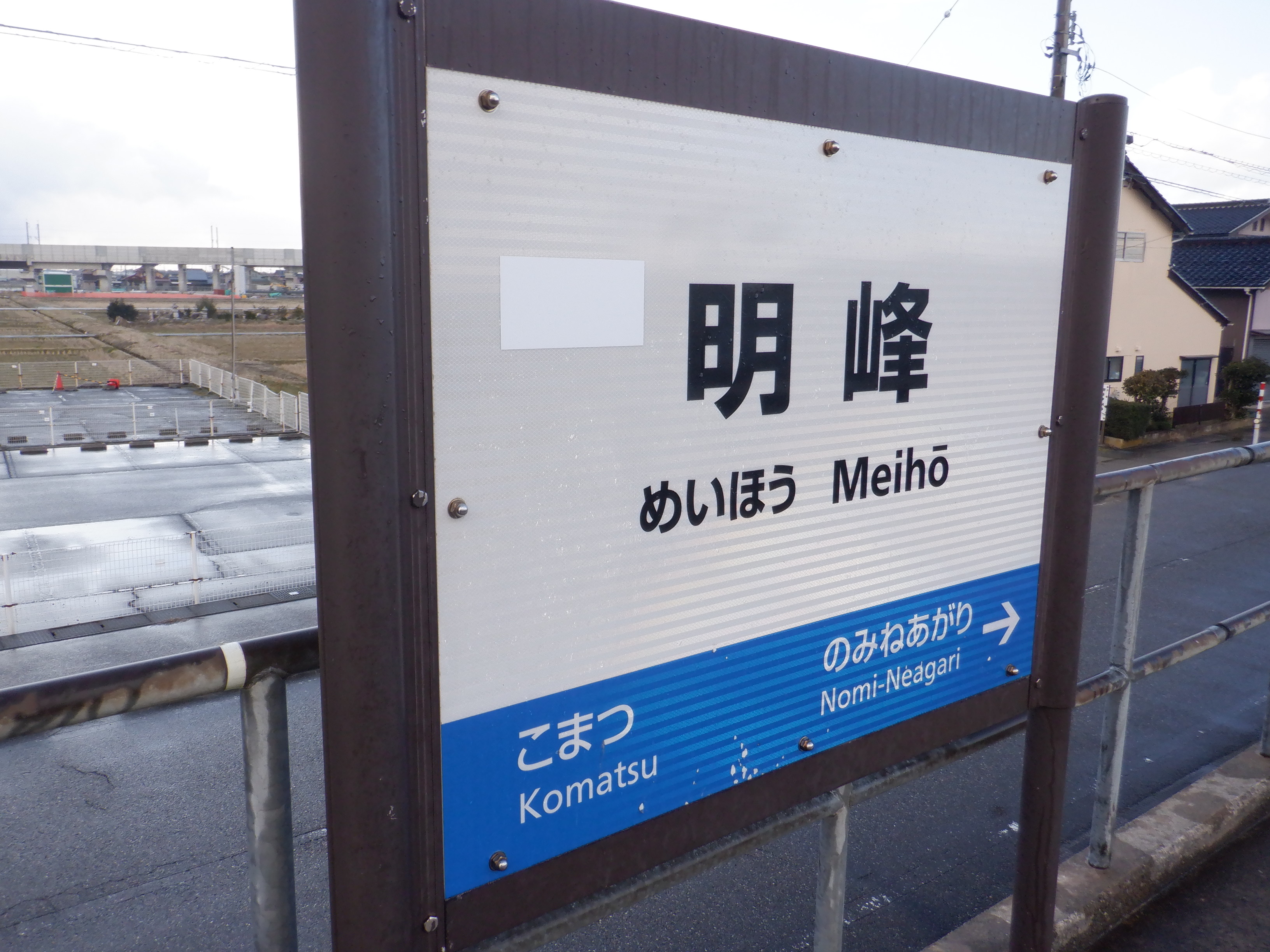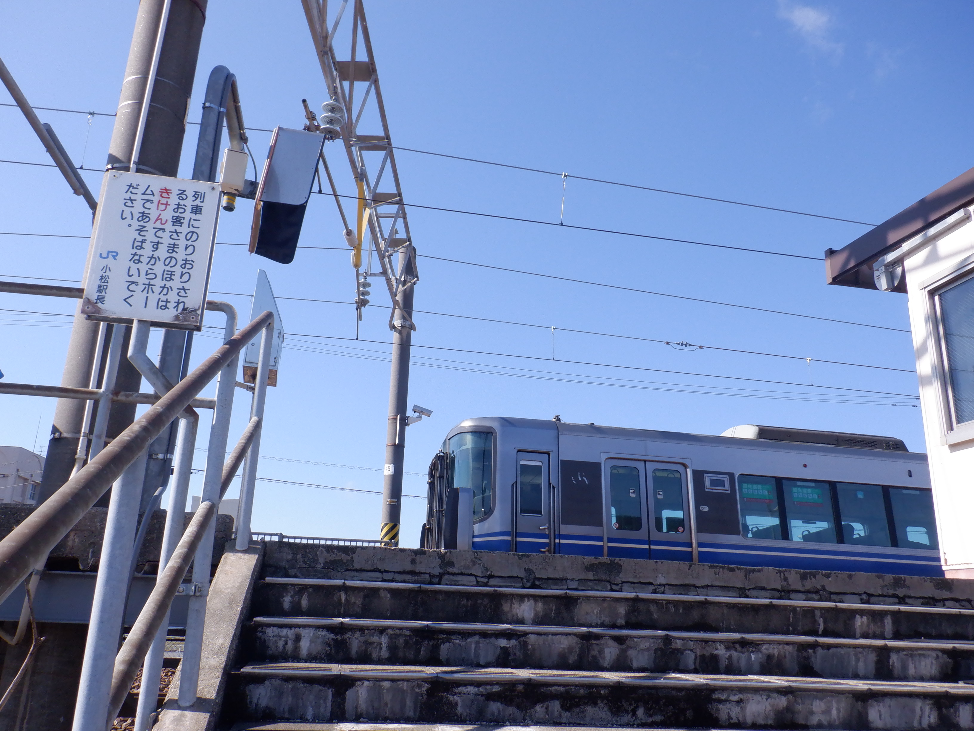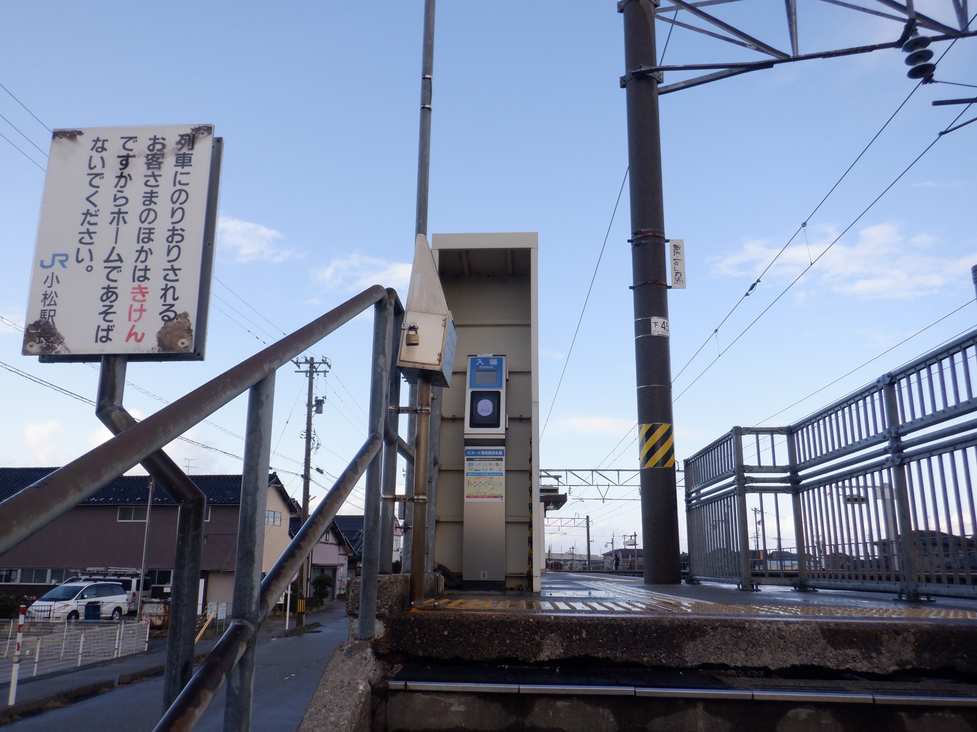 1番のりば小松駅側の駅名標。こちらは移管後はIRの駅名標となるのですが、この時点ではロゴが隠された状態でした。