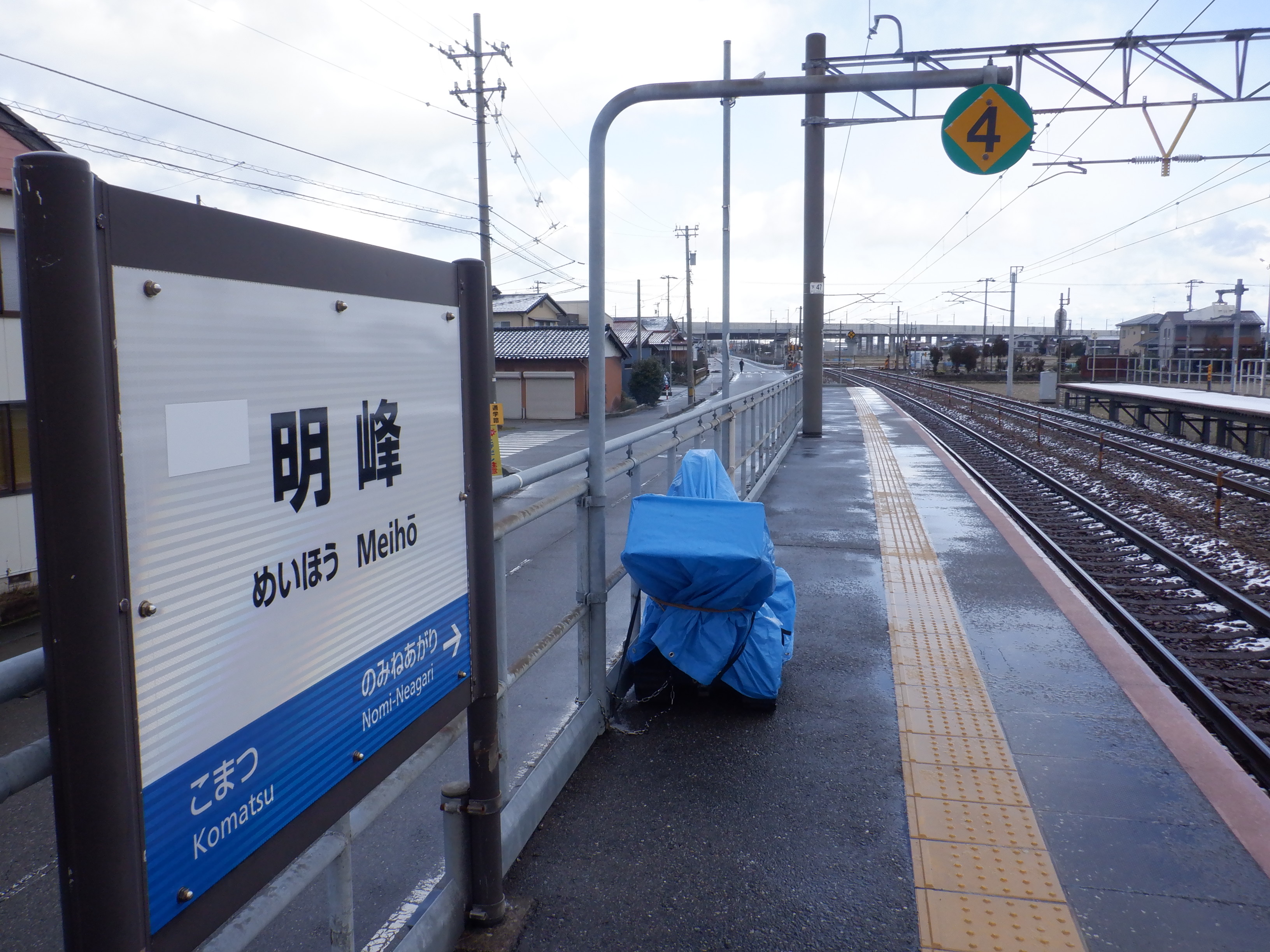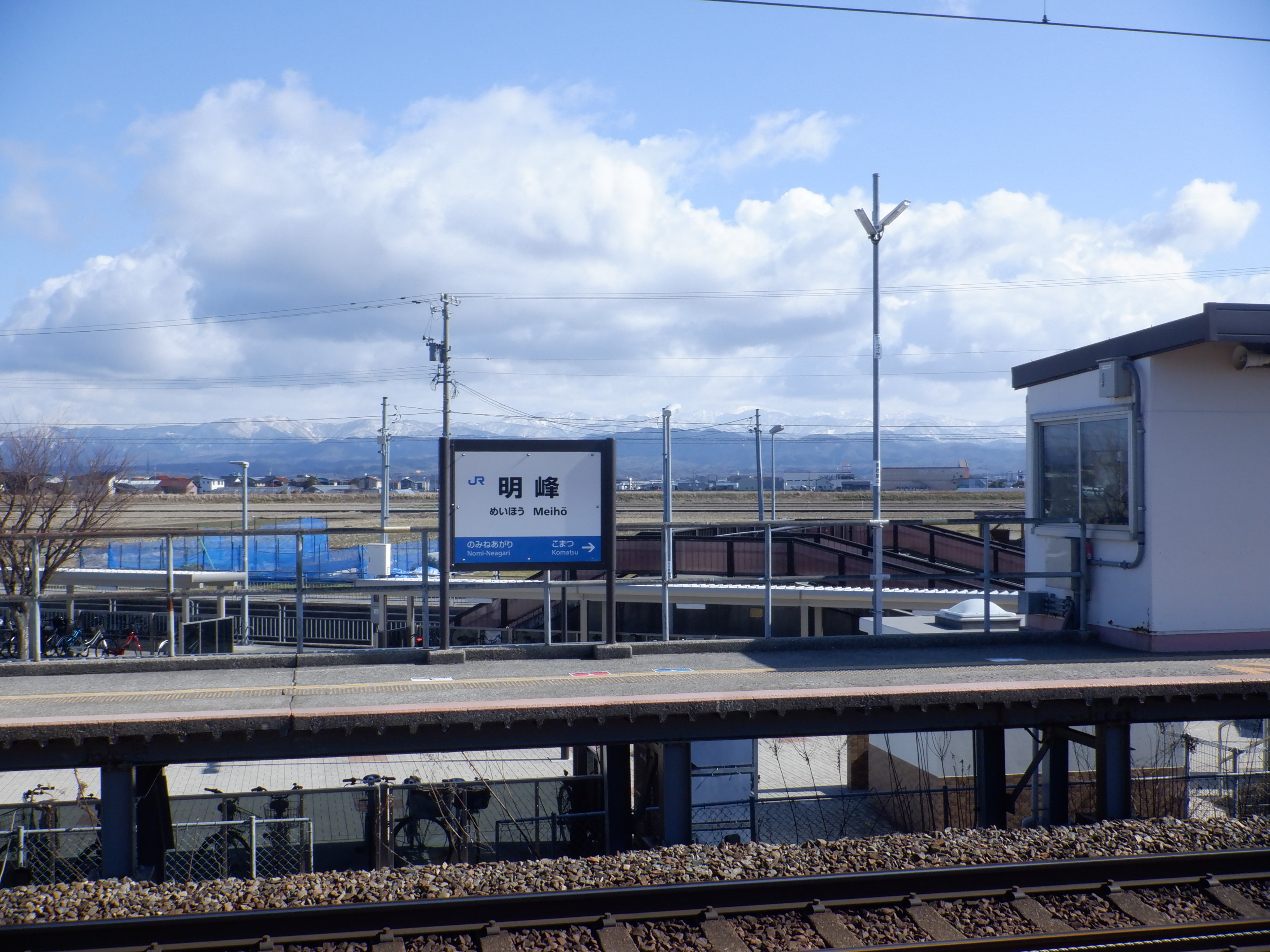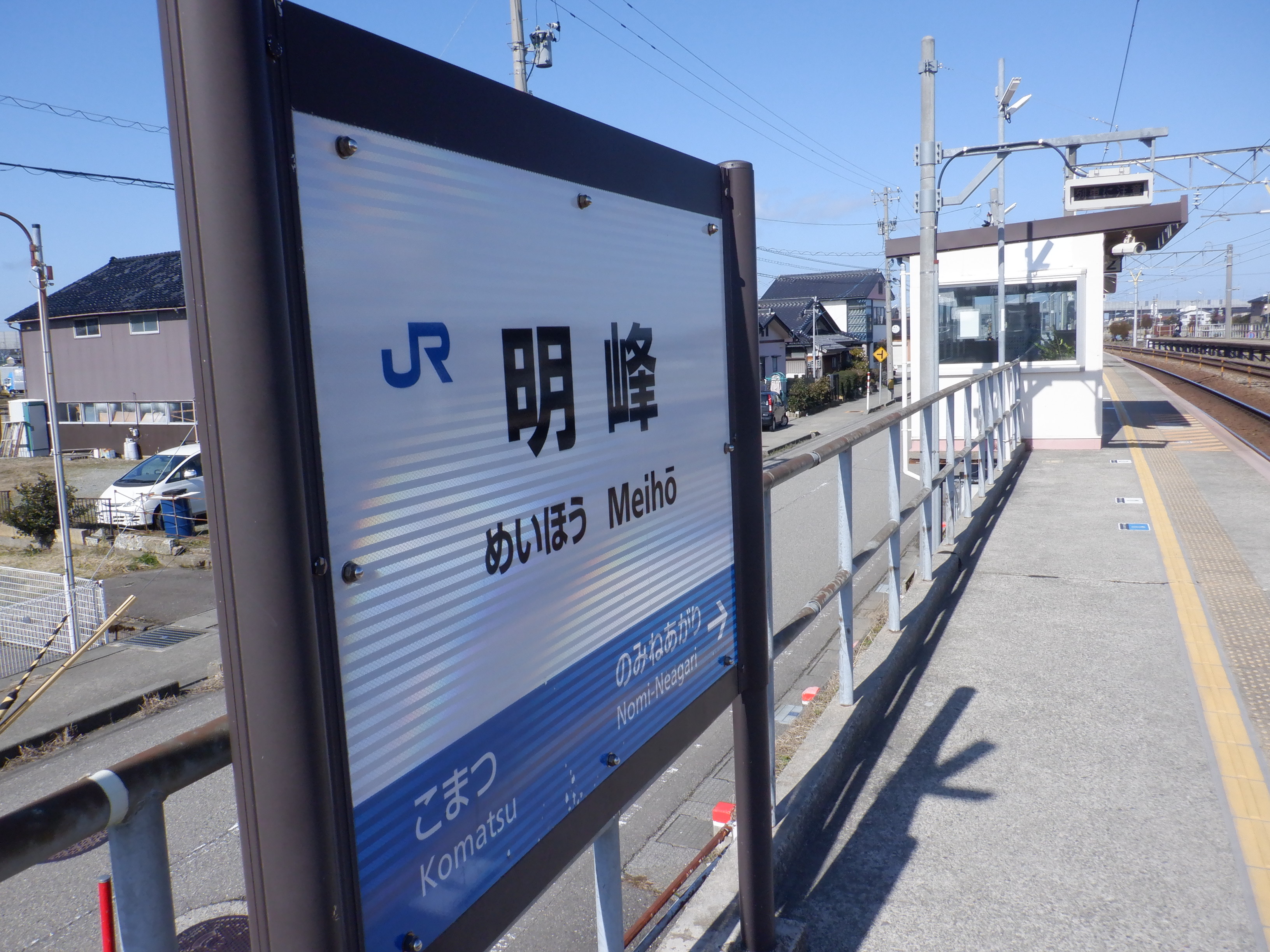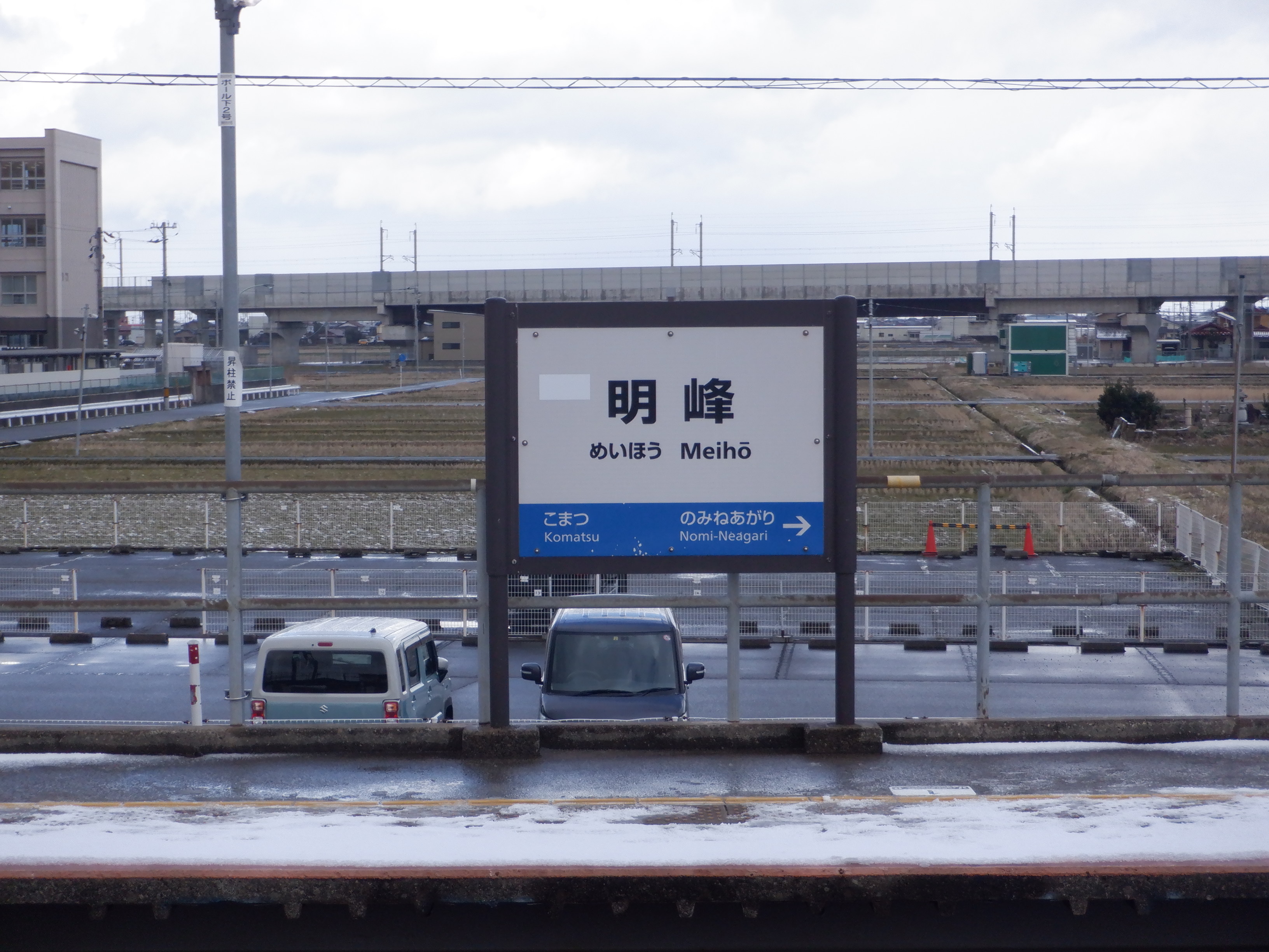 1番のりば小松駅側の駅名標。こちらは移管後はIRの駅名標となるのですが、この時点ではロゴが隠された状態でした。
