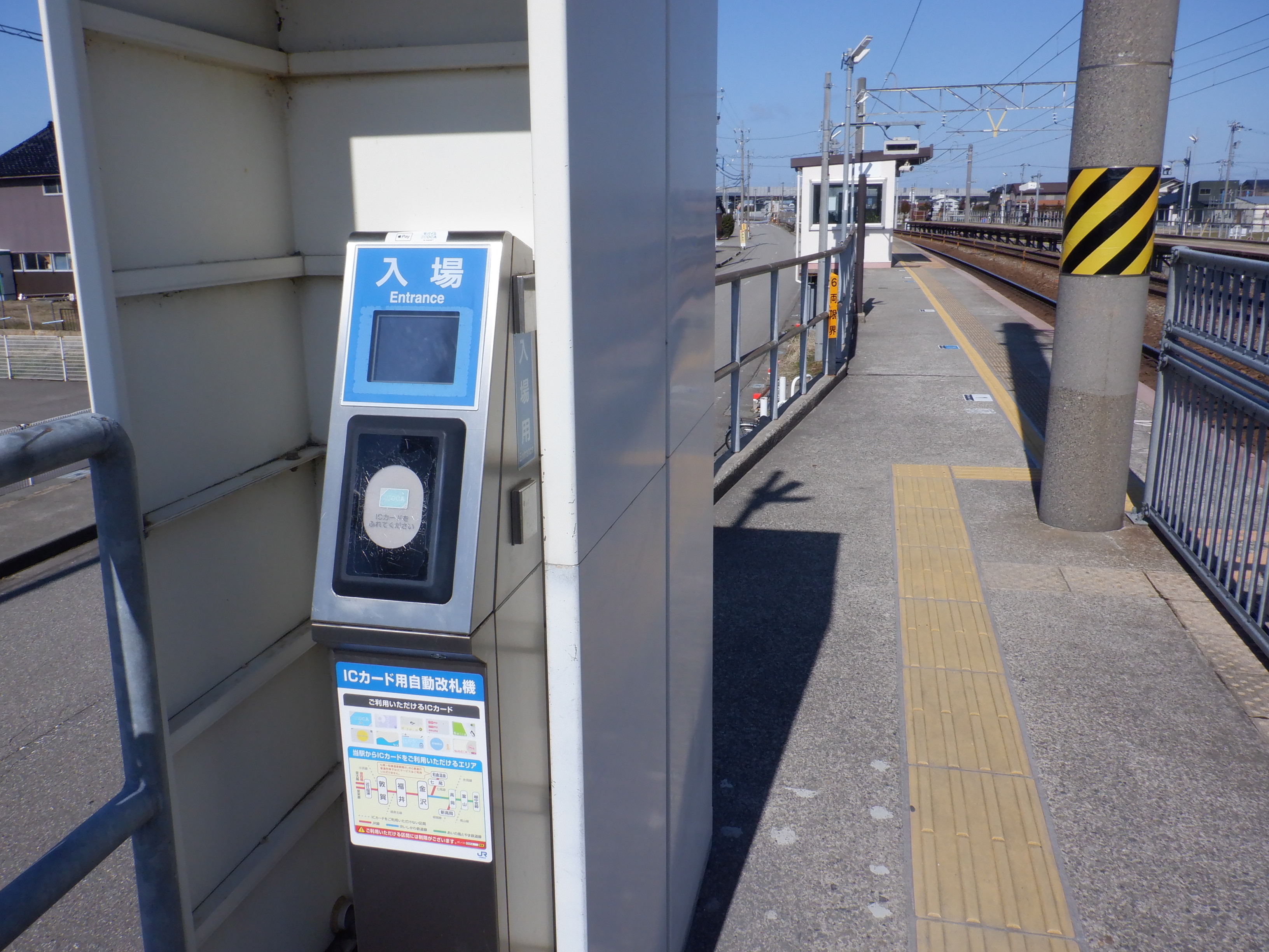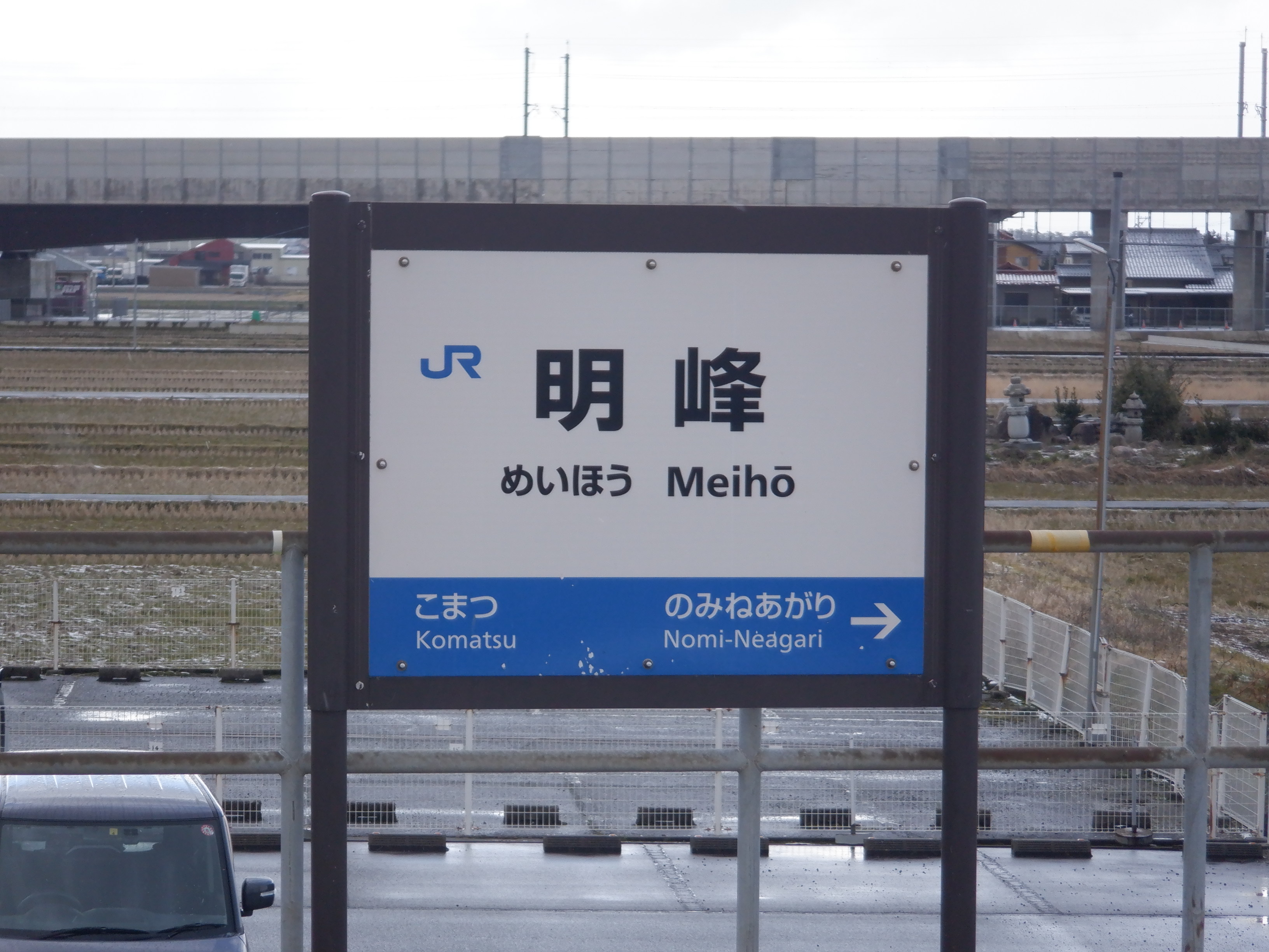 2番のりばの能美根上駅側の駅名標。この時点でJRロゴにシールが貼られました。