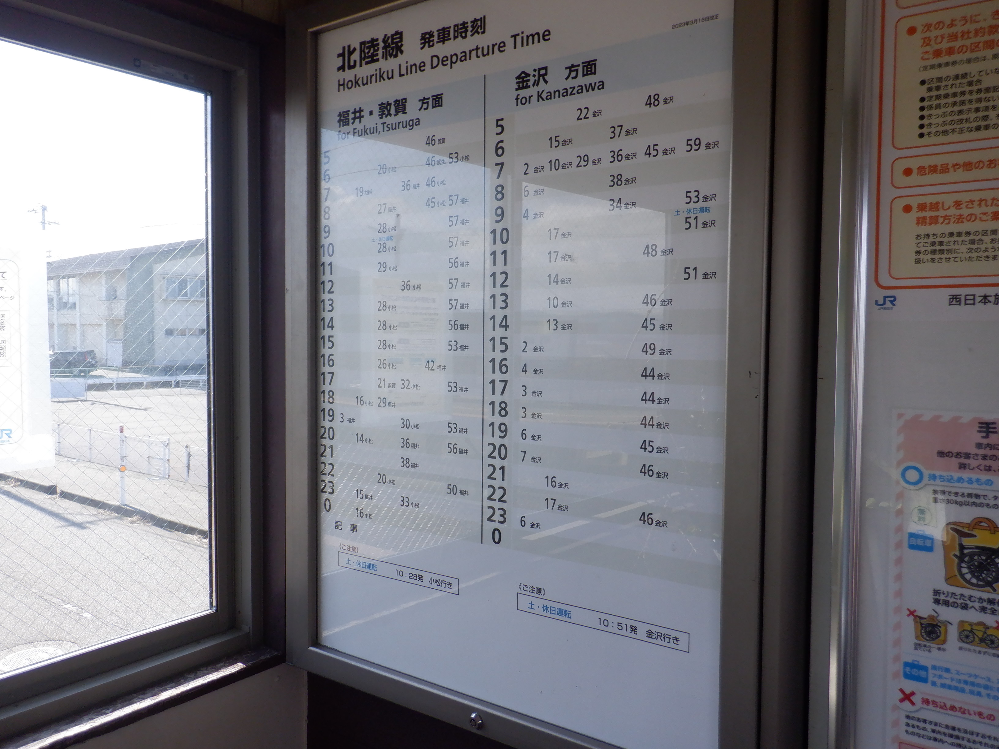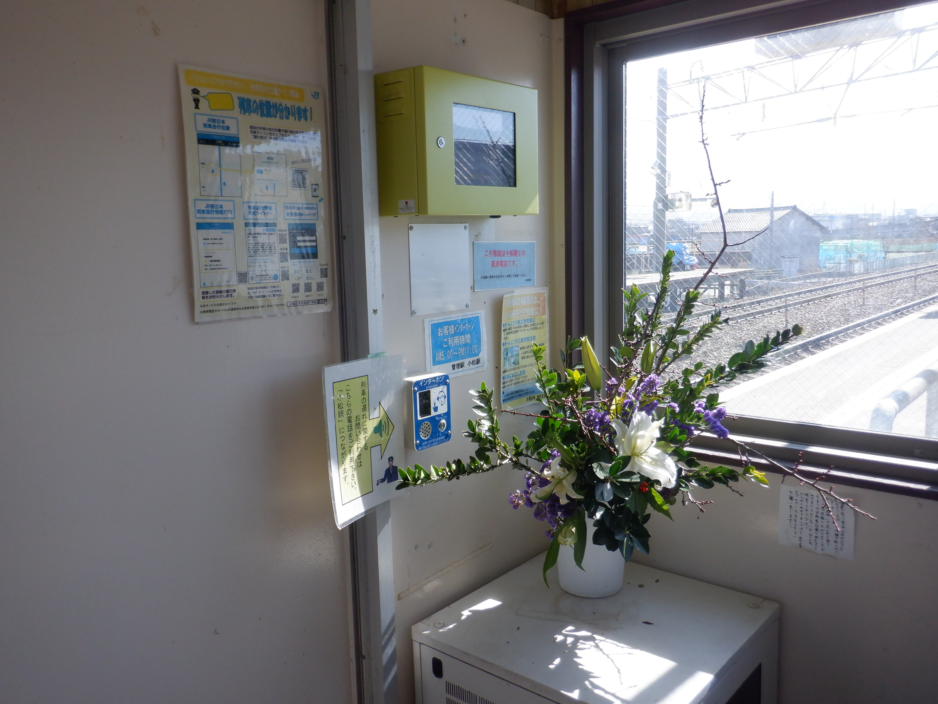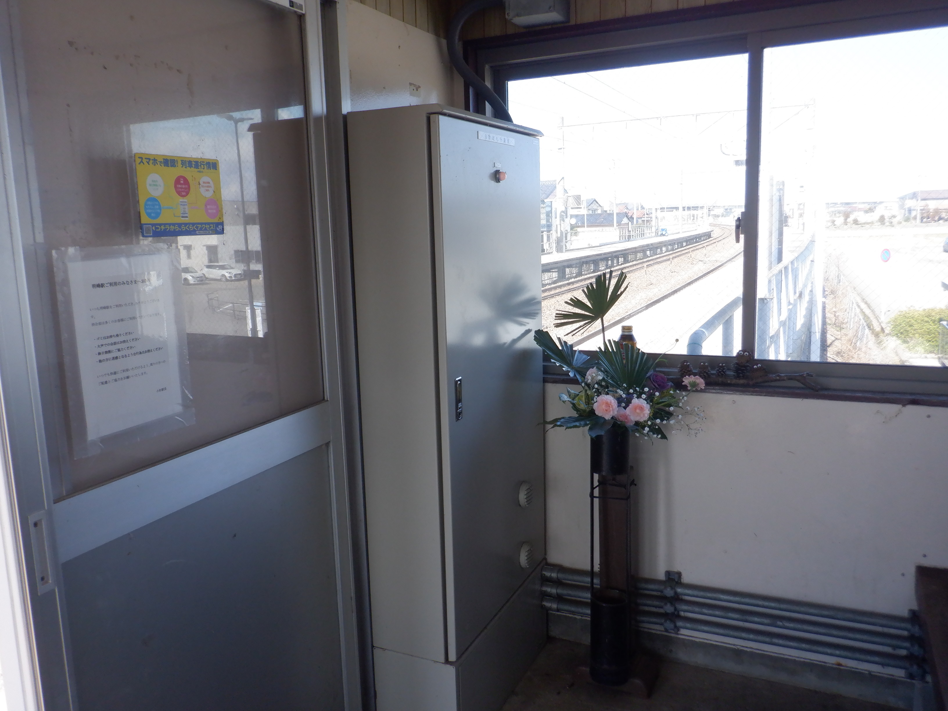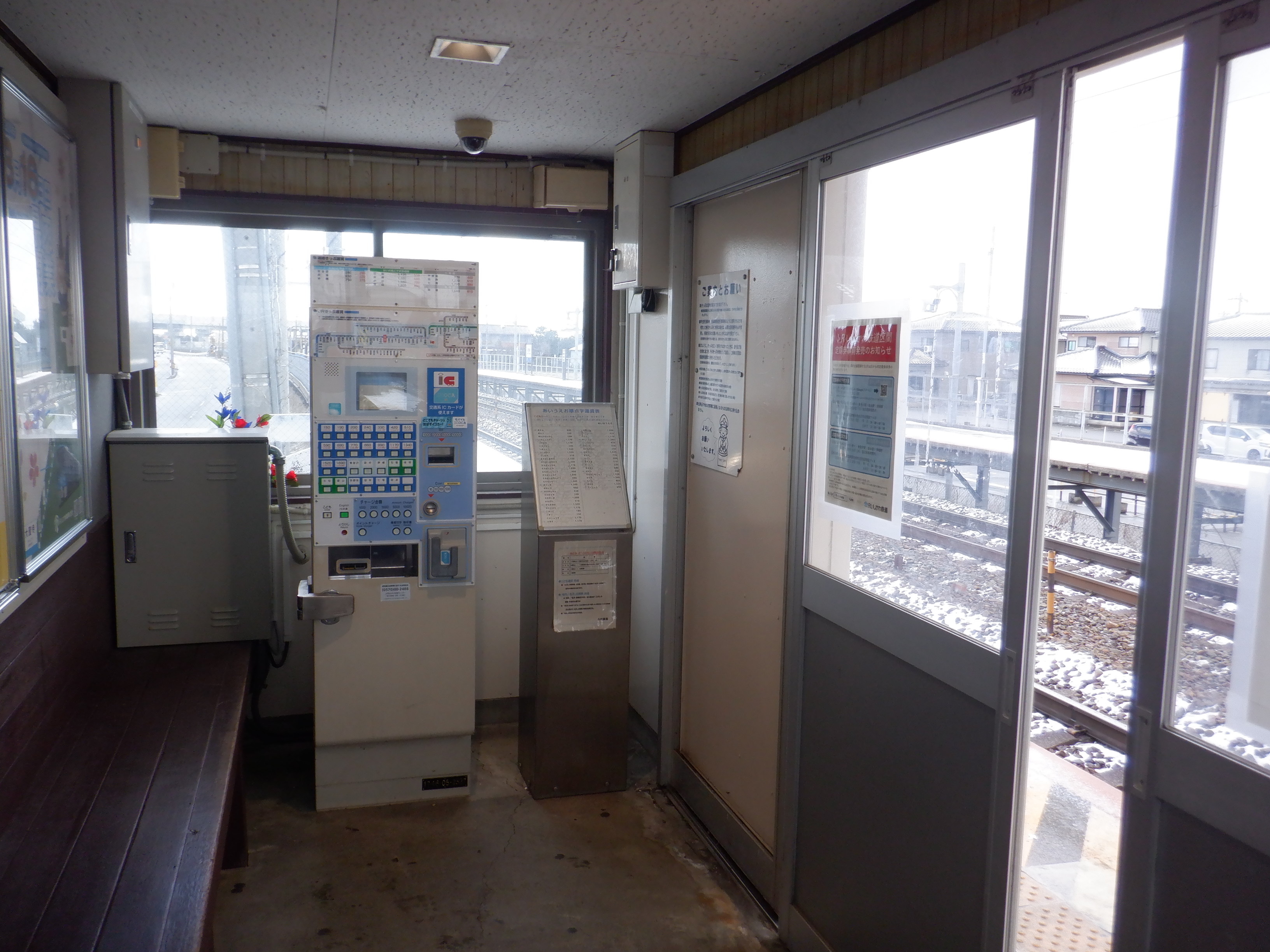 移管の1週間前となりました。待合室背後の第一種駅名標にIRのロゴが隠された状態で貼られていました。