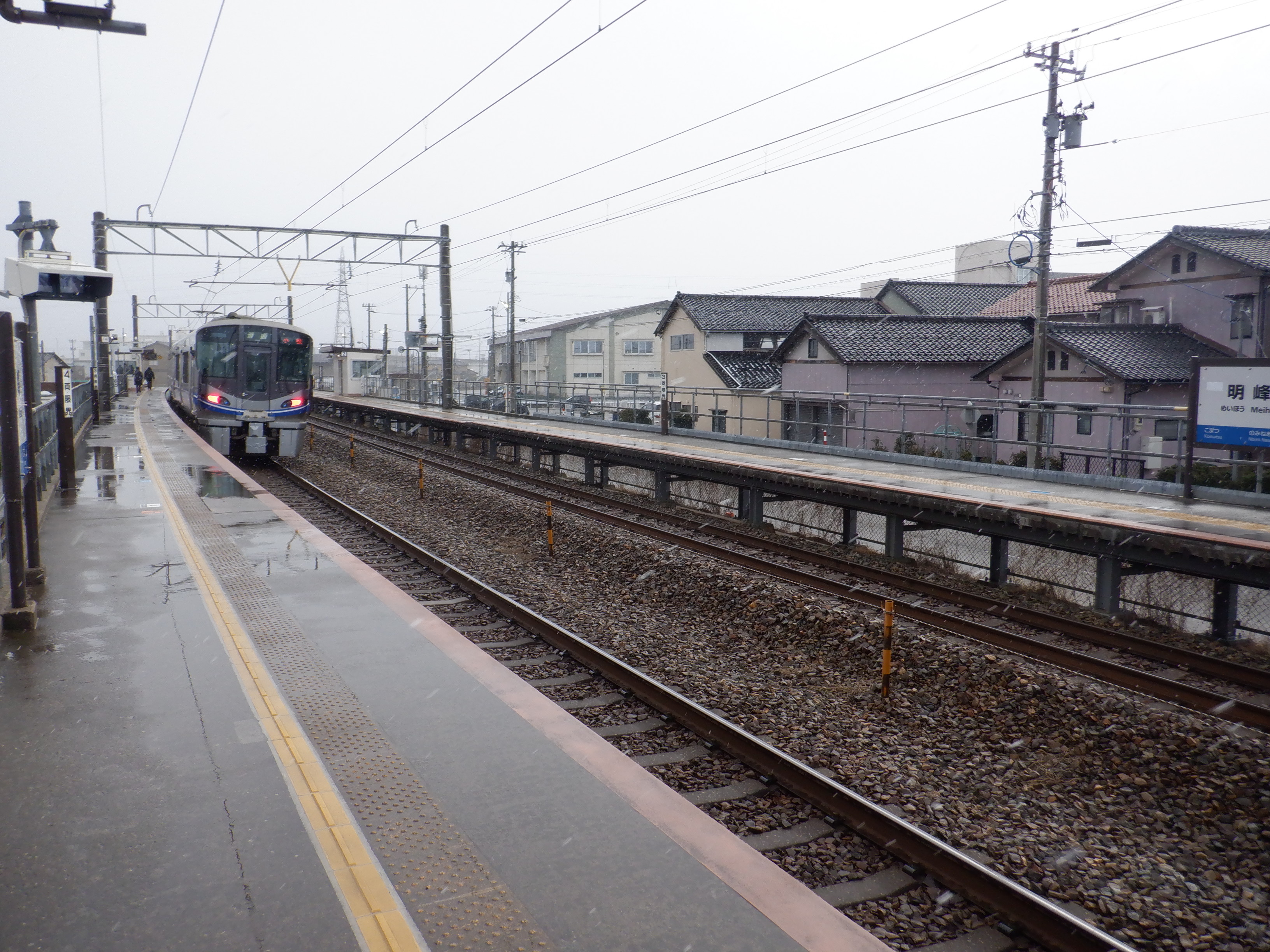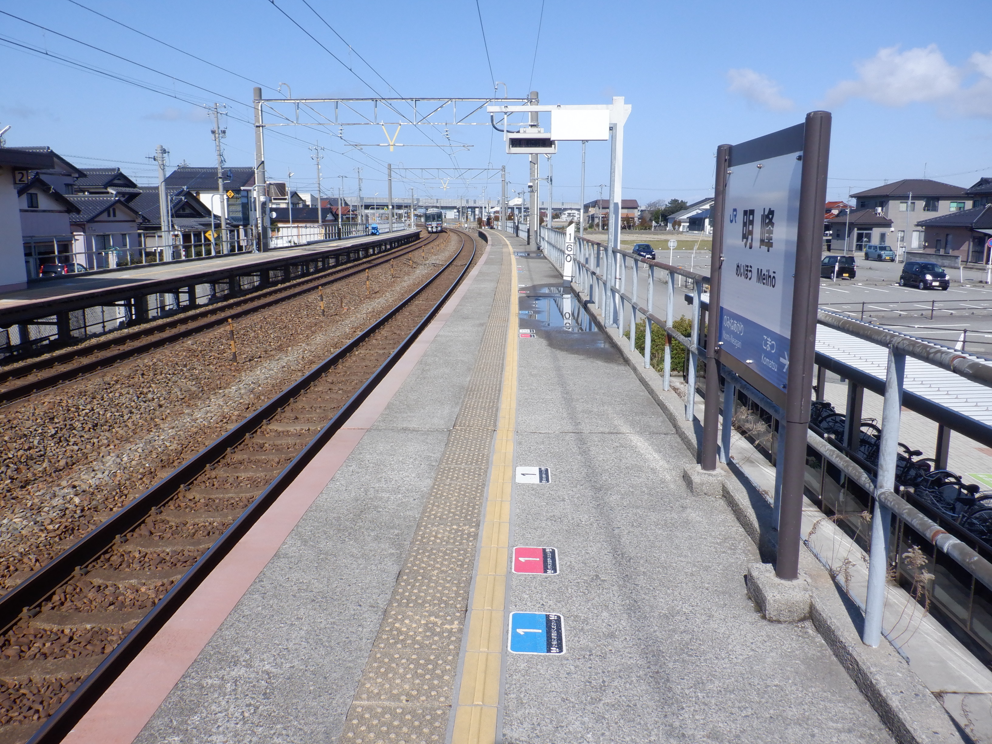1番のりば小松駅側の駅名標。この時点でJRロゴにシールが貼られました。