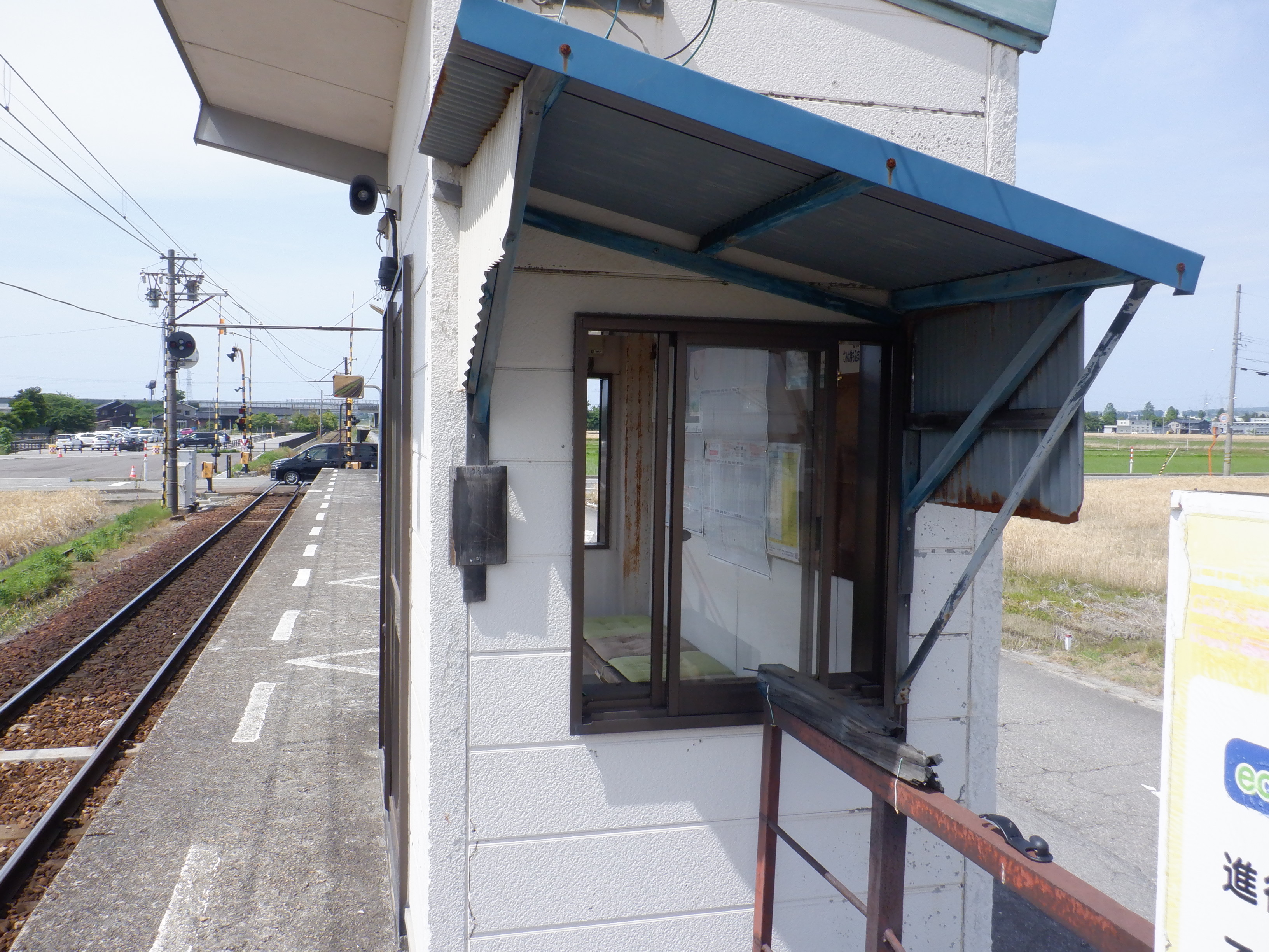 待合室の外観。上市駅側に小さな屋根が付いています。