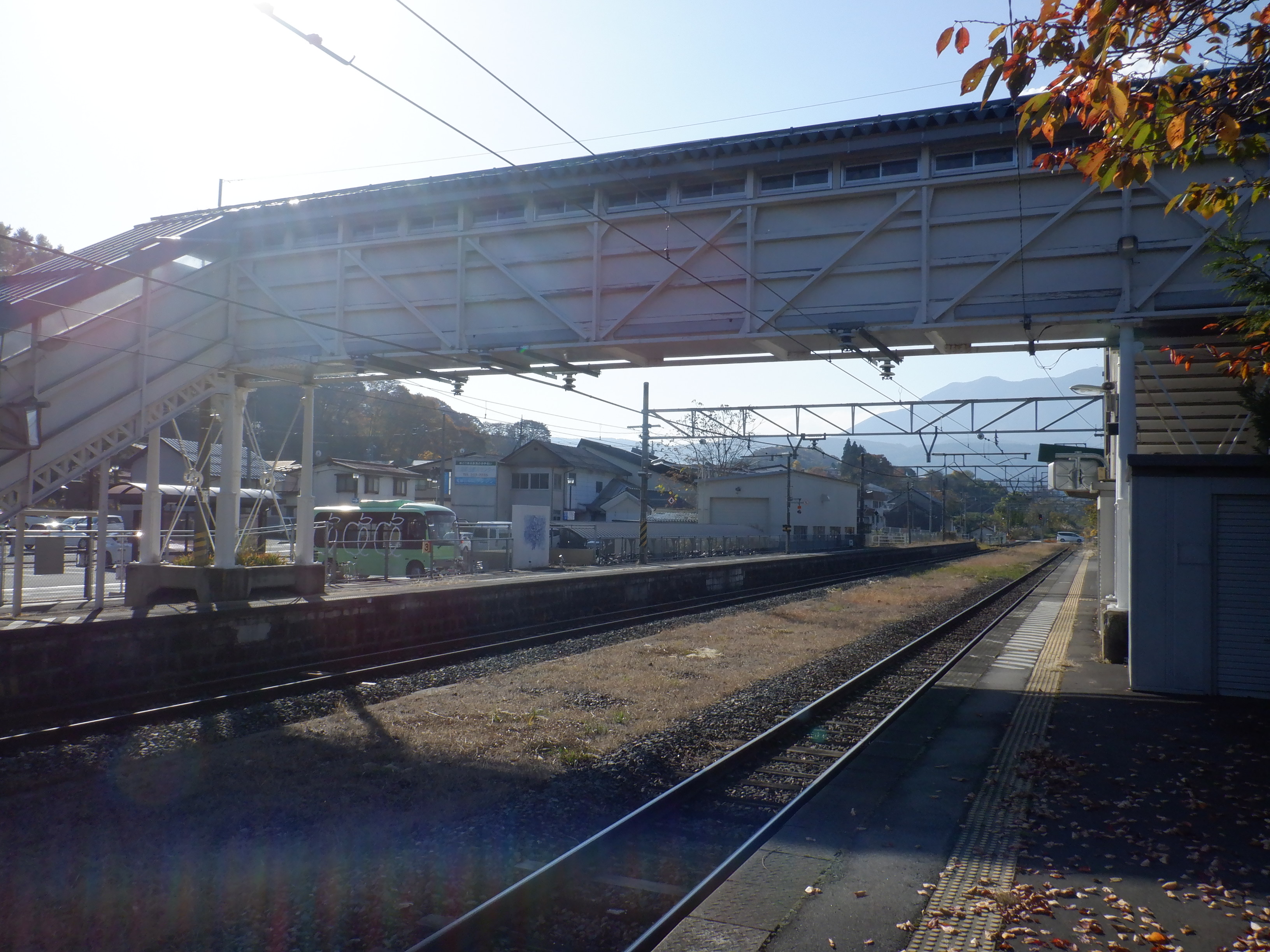 黒姫〜古間の間から北しなの線に寄り添っている鳥居川が駅の反対側にあります。両方向のホームは少し開いていて、歴史がある跨線橋が繋いでいます。駅を出ると右側には商店街が続きます。