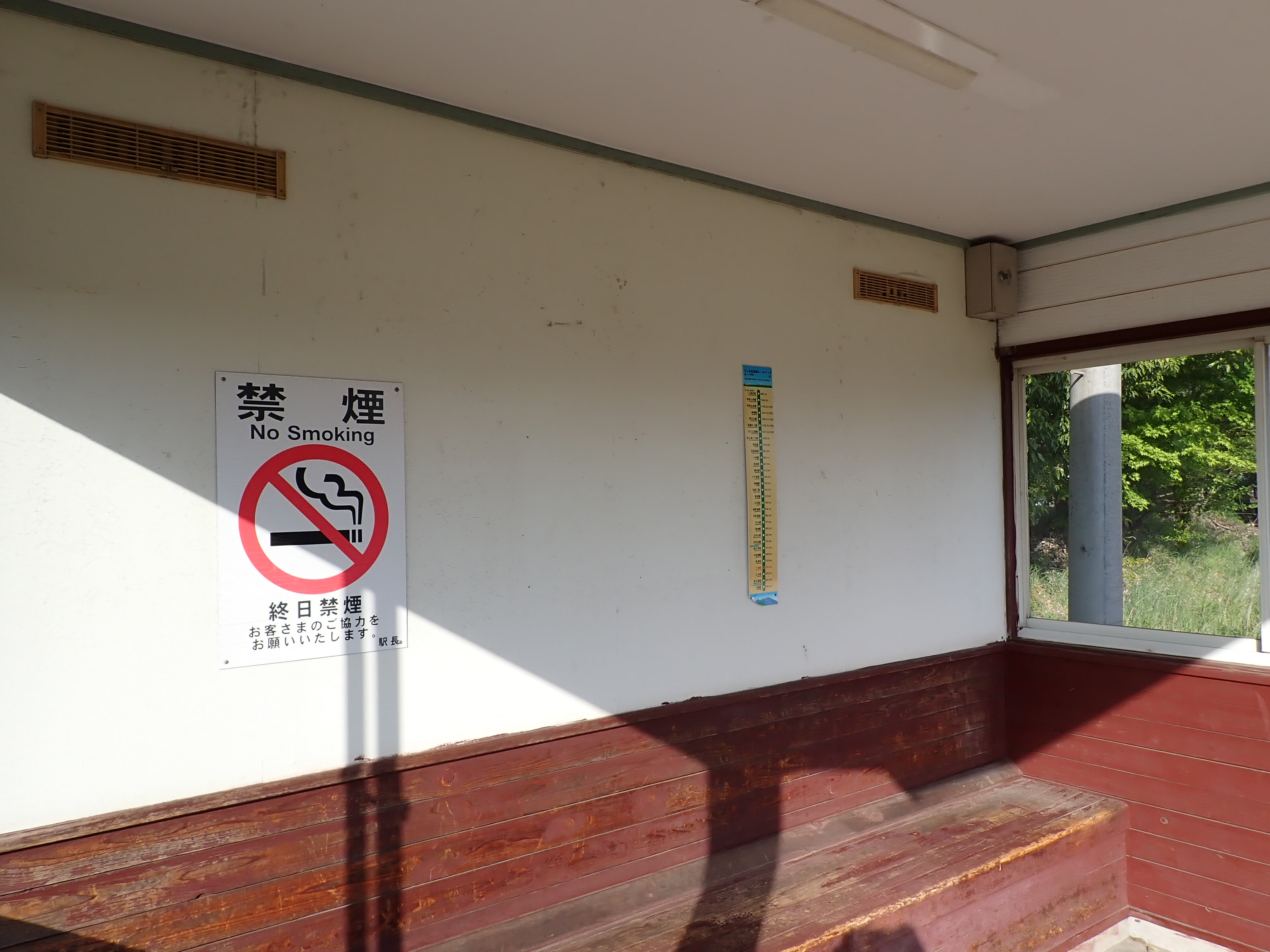 駅舎側のホームの駅名標と外にあるトイレ付近。