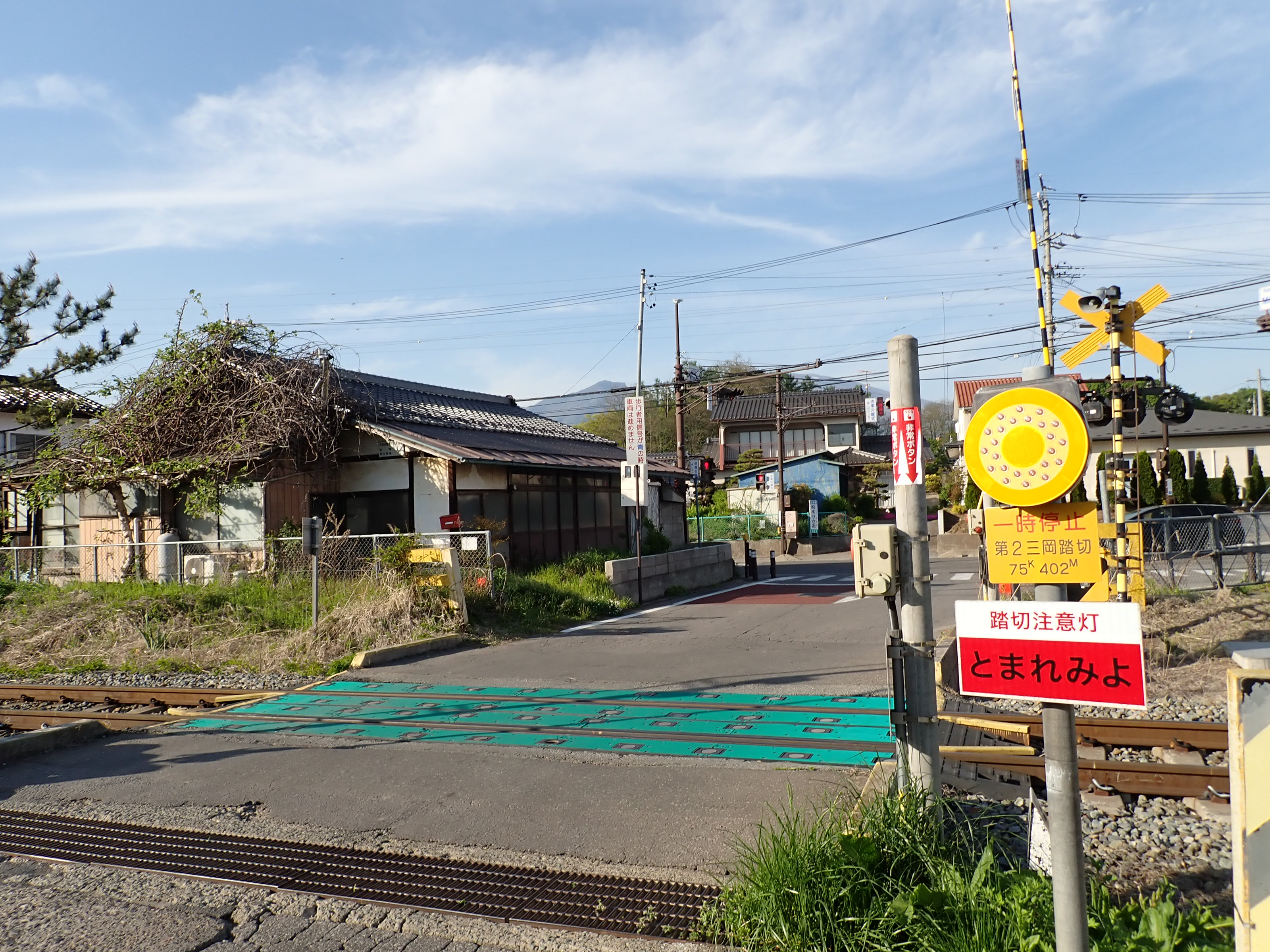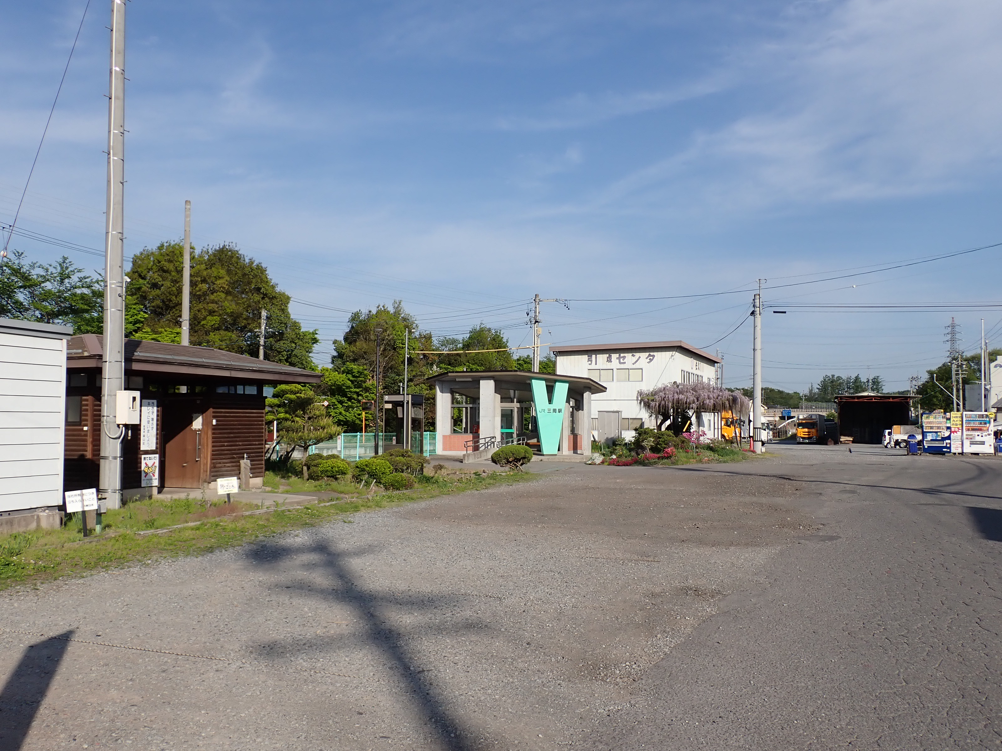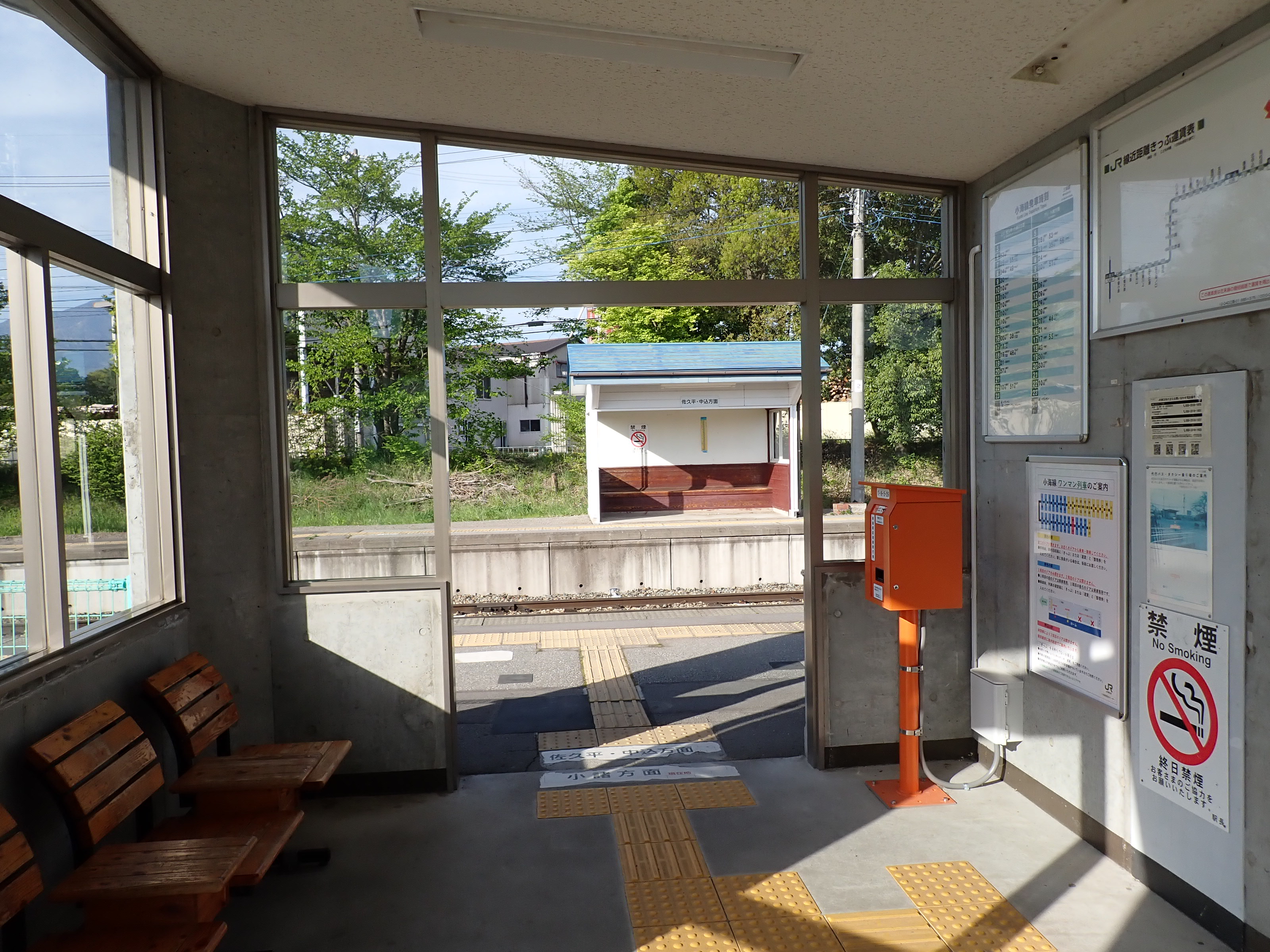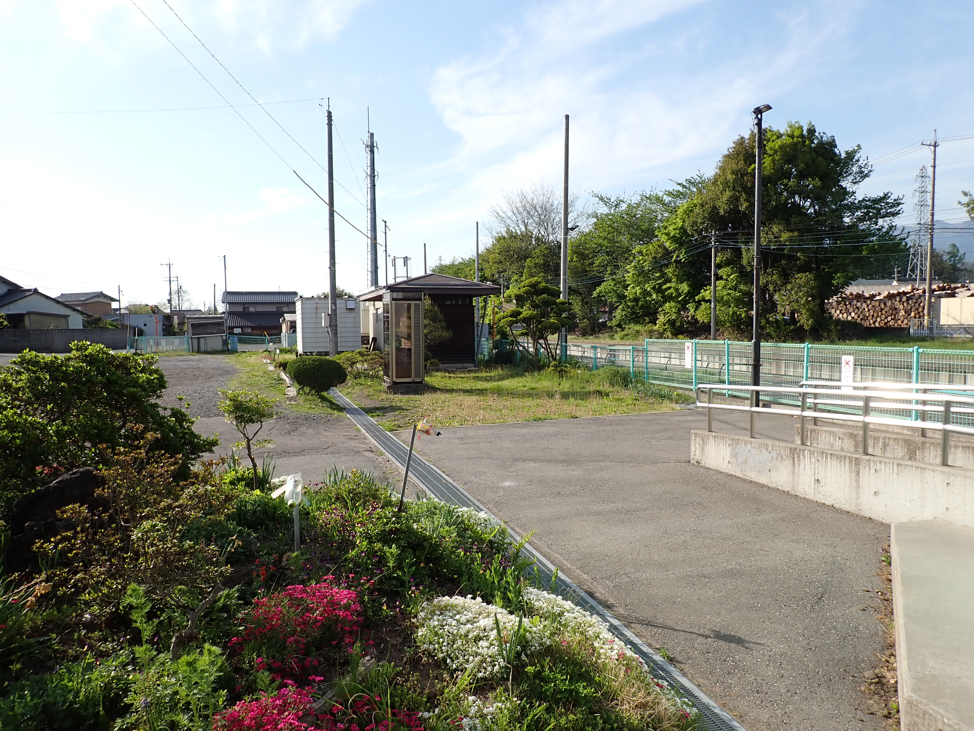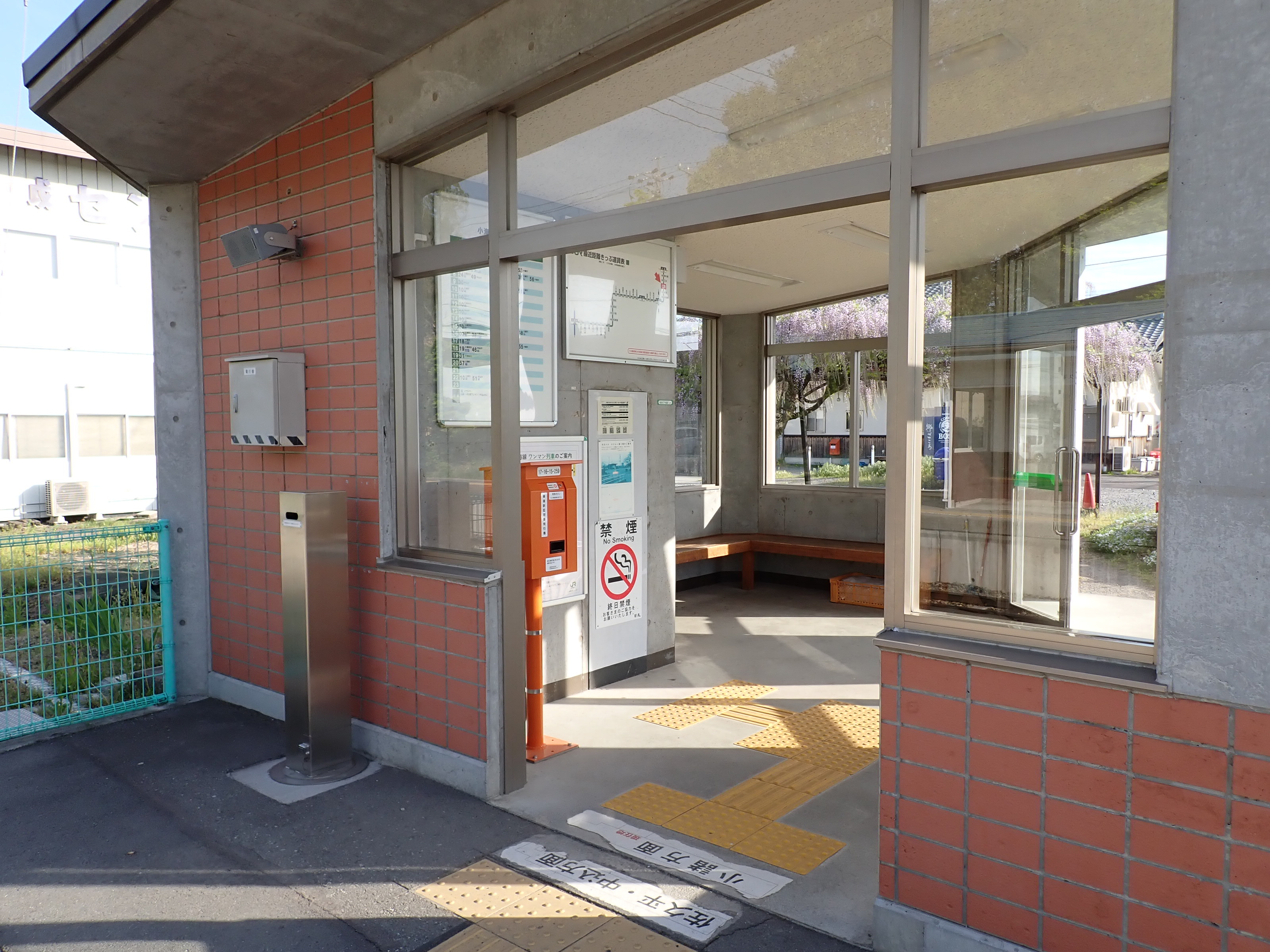 少し変わった形の駅舎です。交換ができる駅で、構内踏切で両側のホームが結ばれています。近くにある運送会社さんから、かつての貨物取扱駅であることが分かります。駅前の藤棚が印象的です。