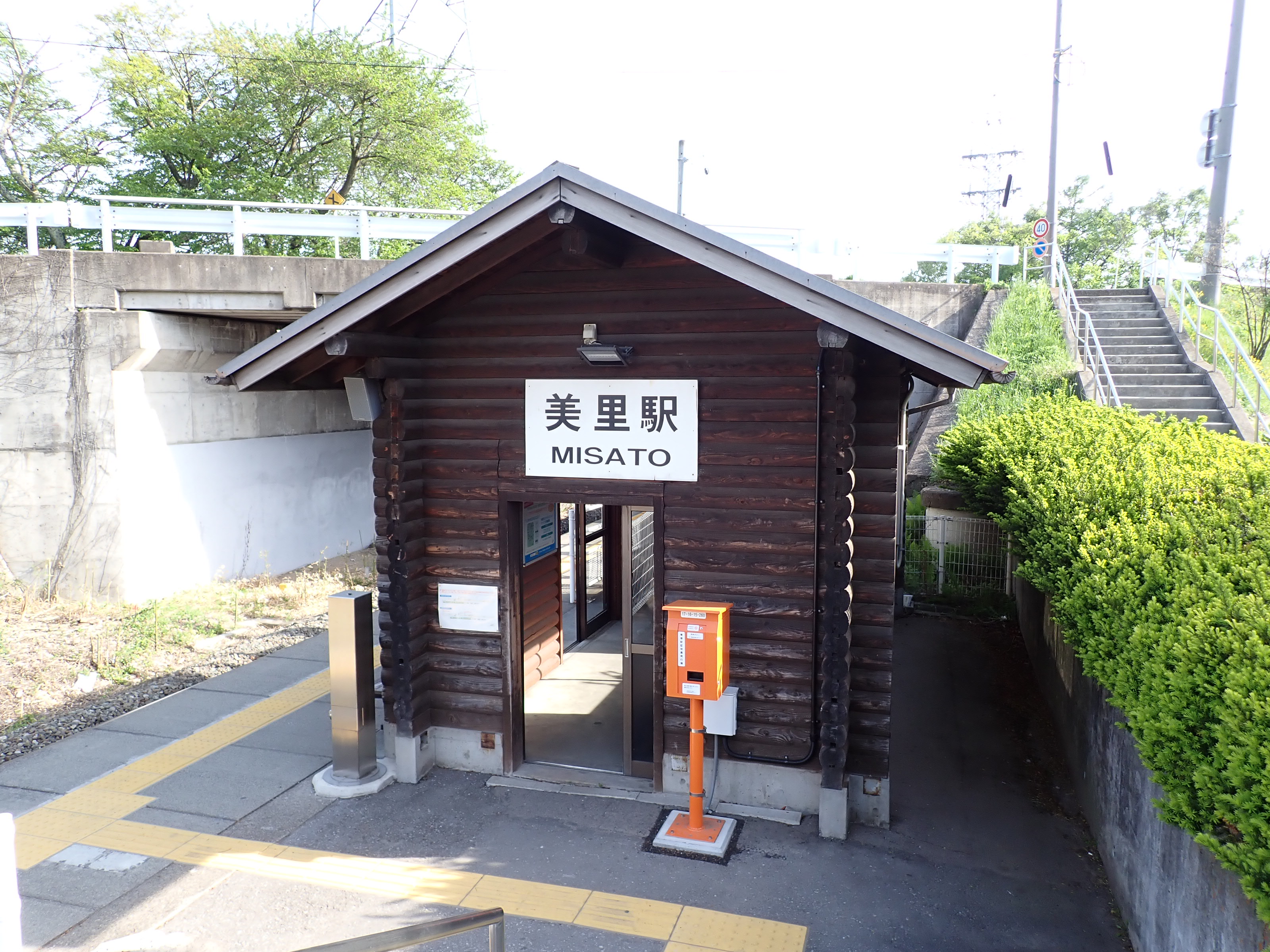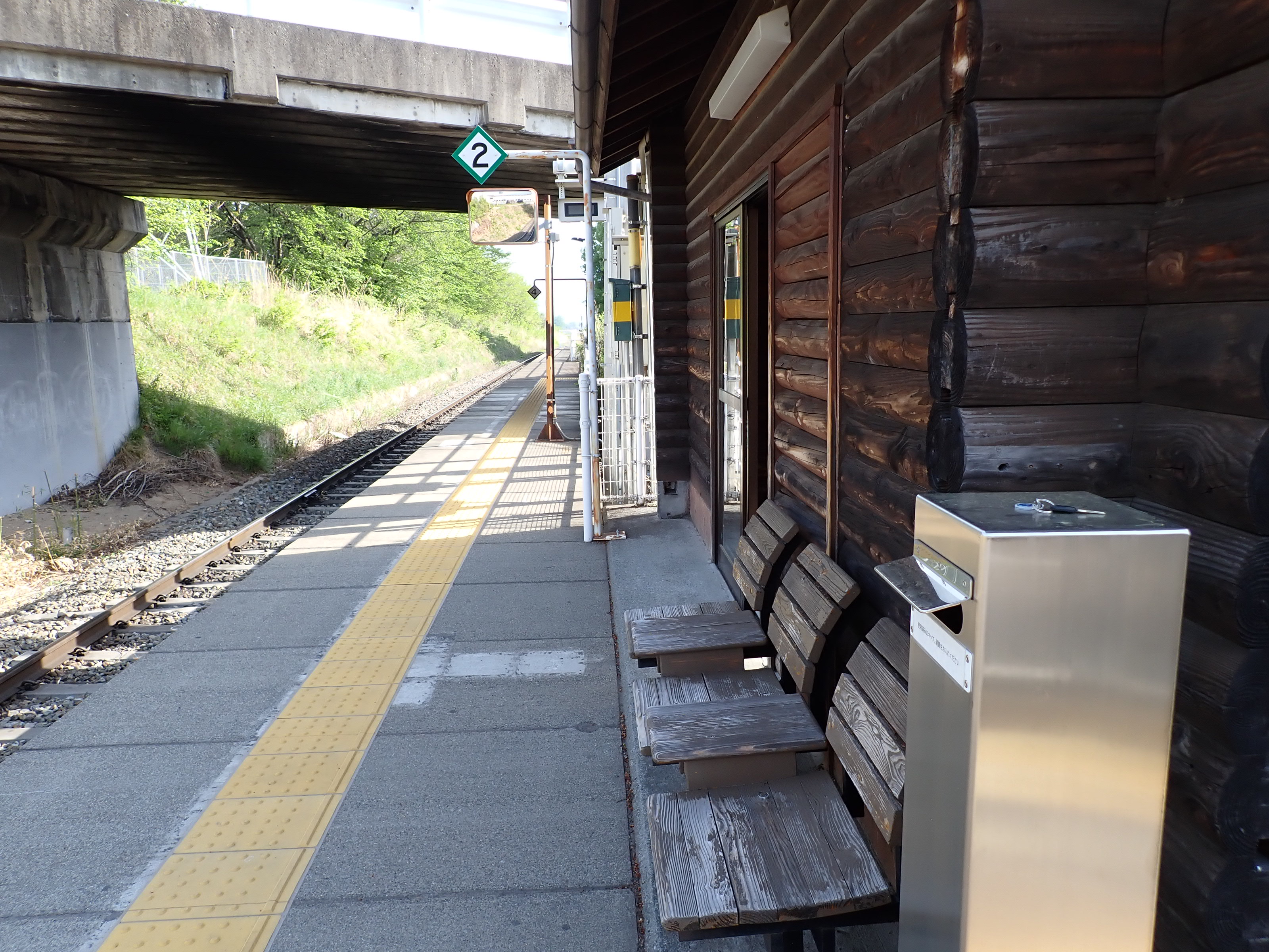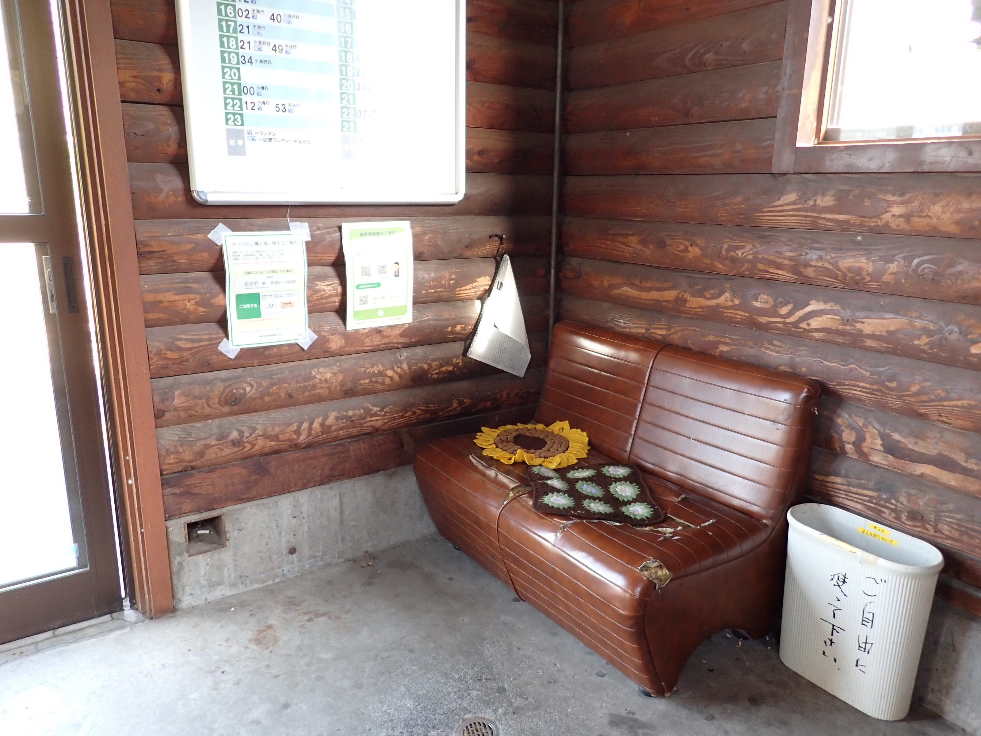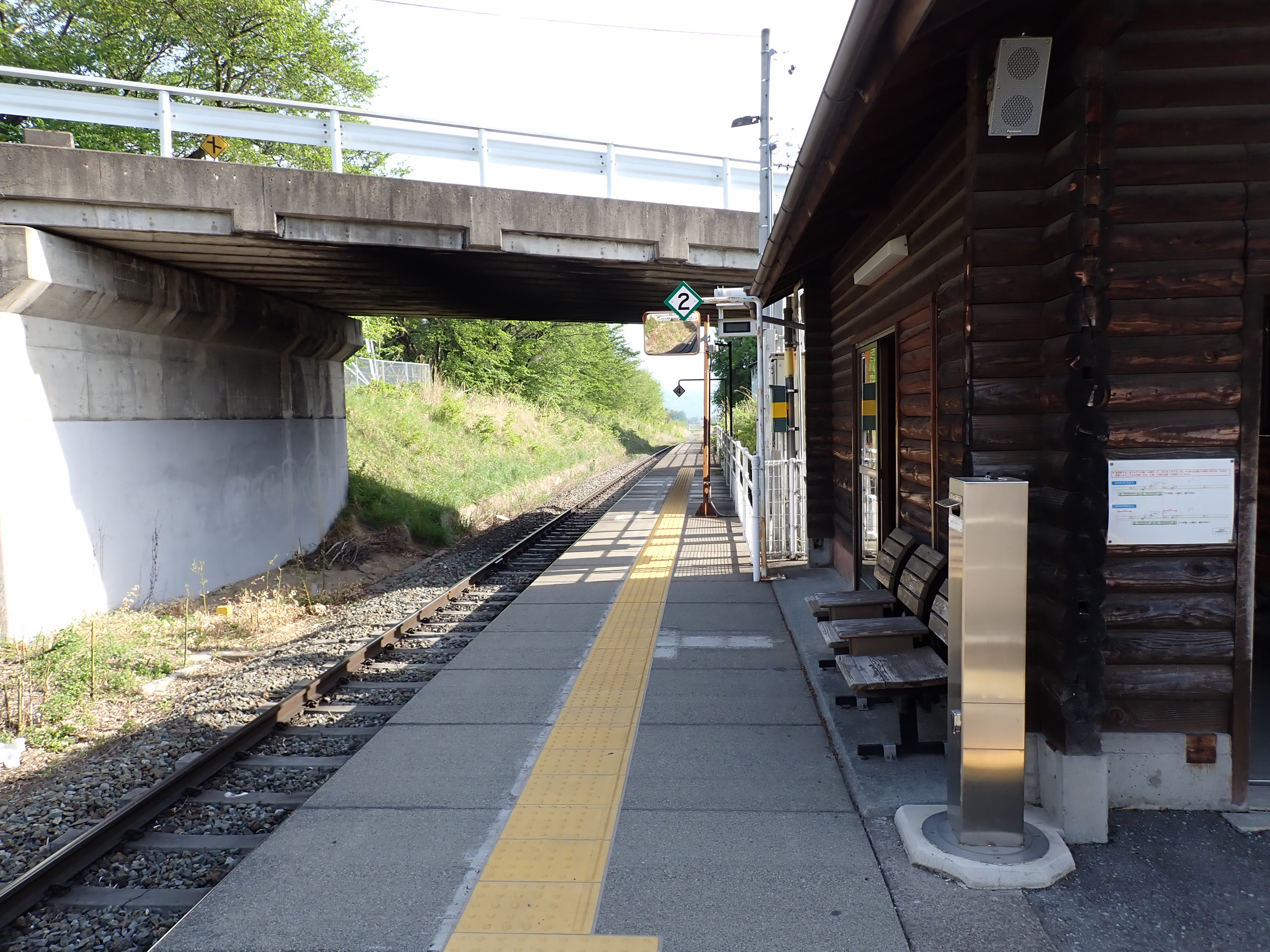 ログハウス風の待合室があり、森林組合による解説が書かれています。公園のような空間の奥に待合室やホームがある感じになっています。周辺には住宅や工場、果樹園などがあります。