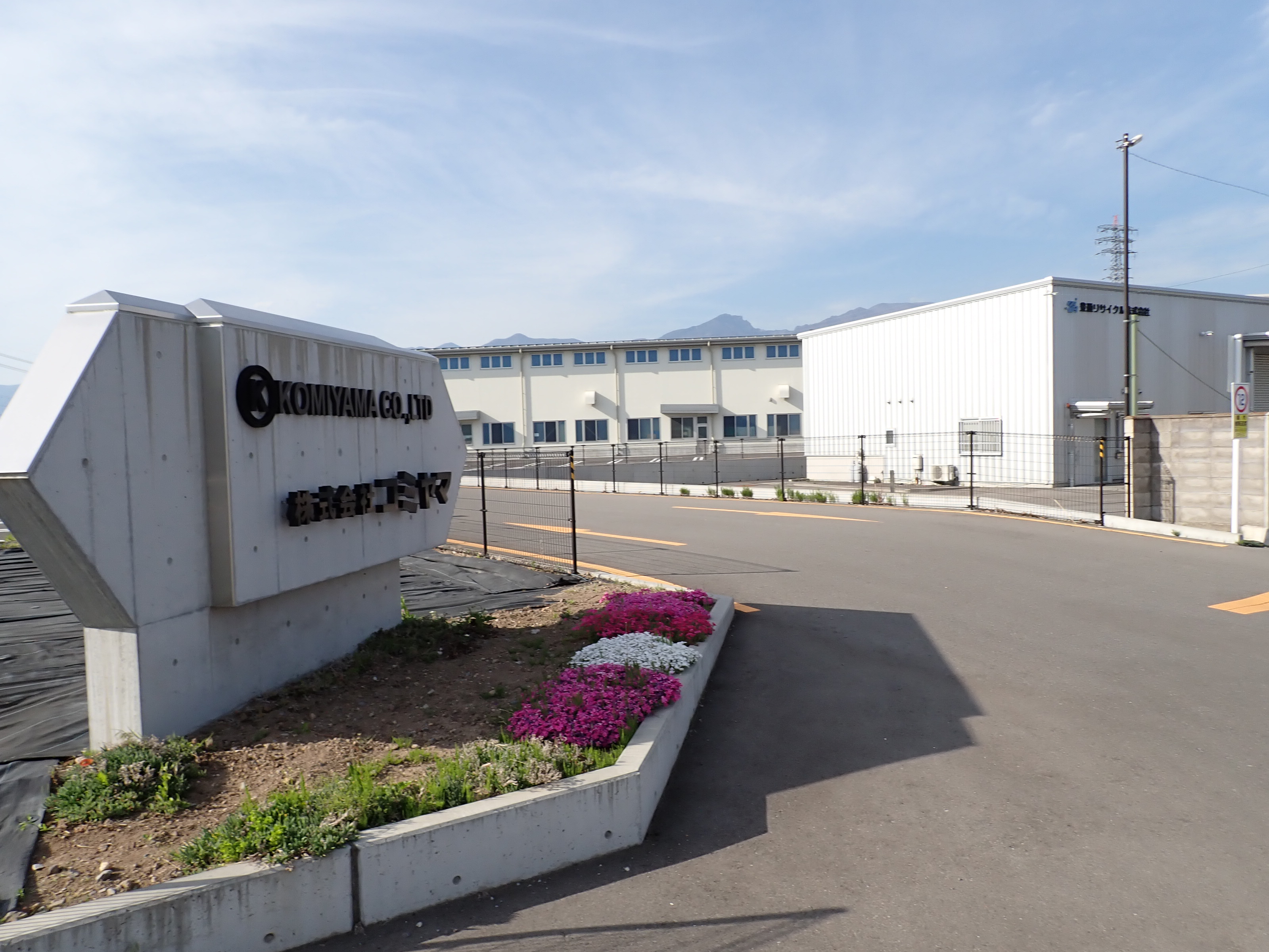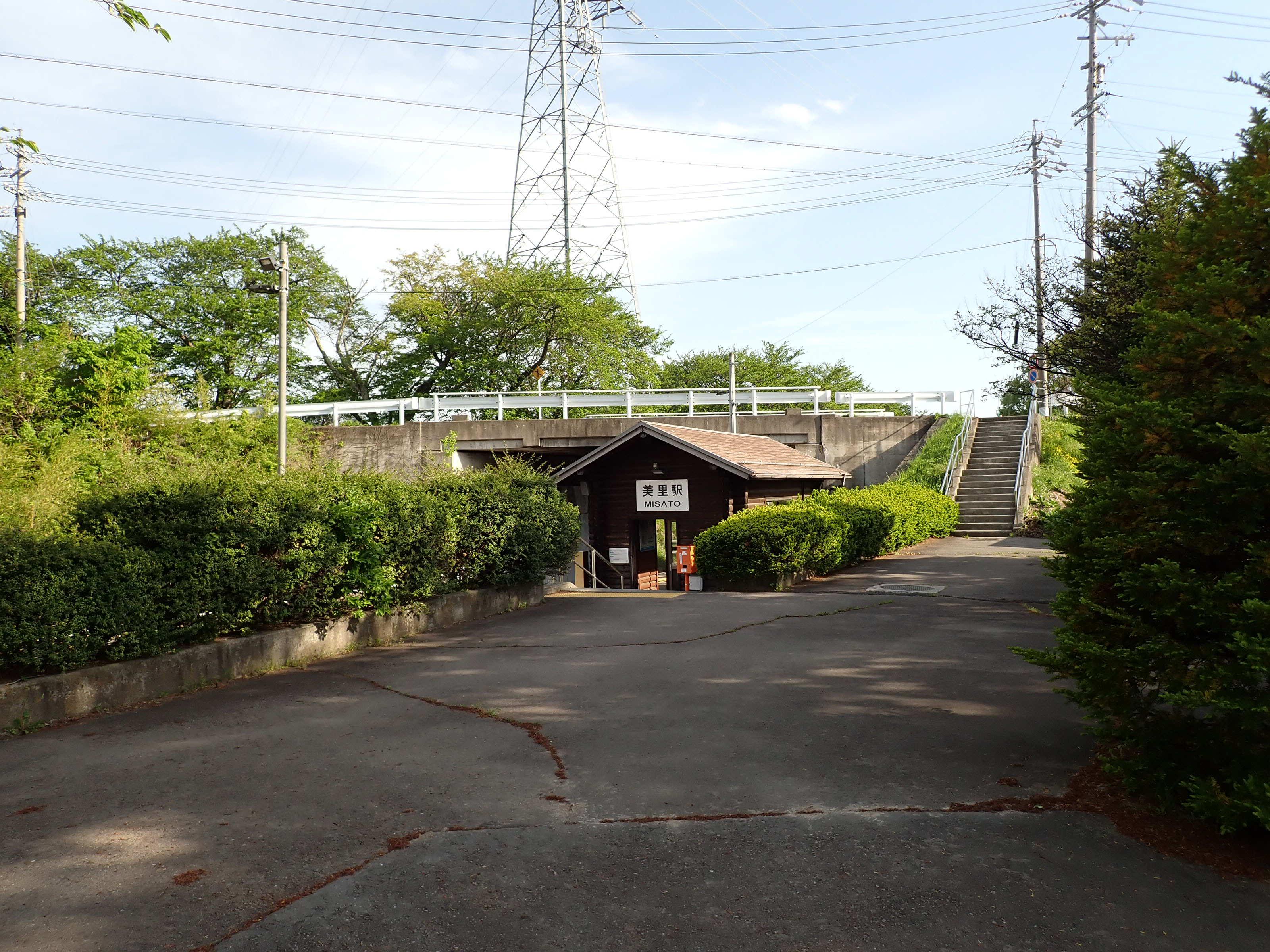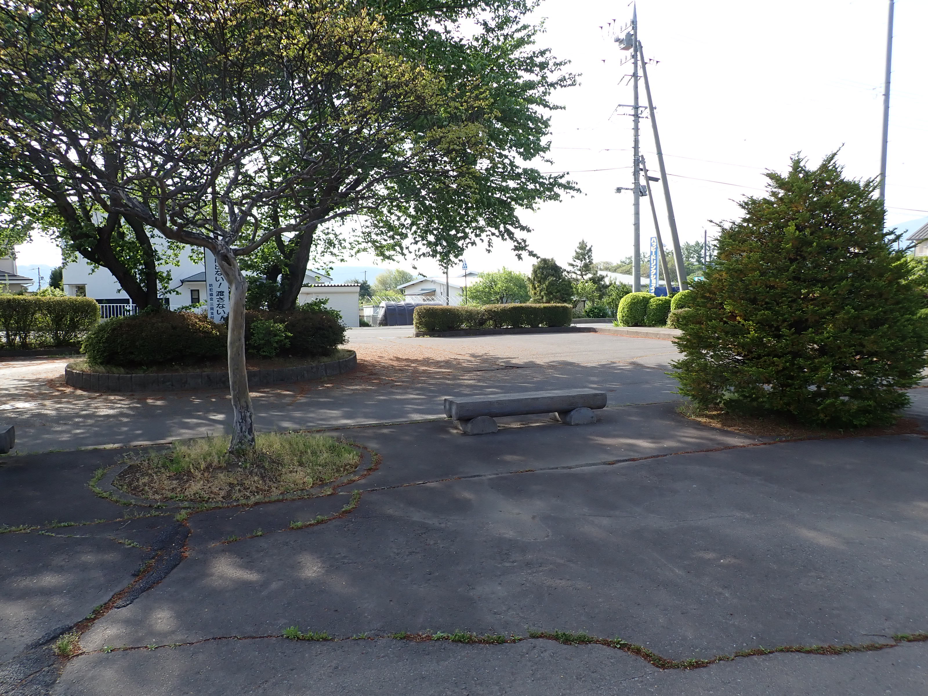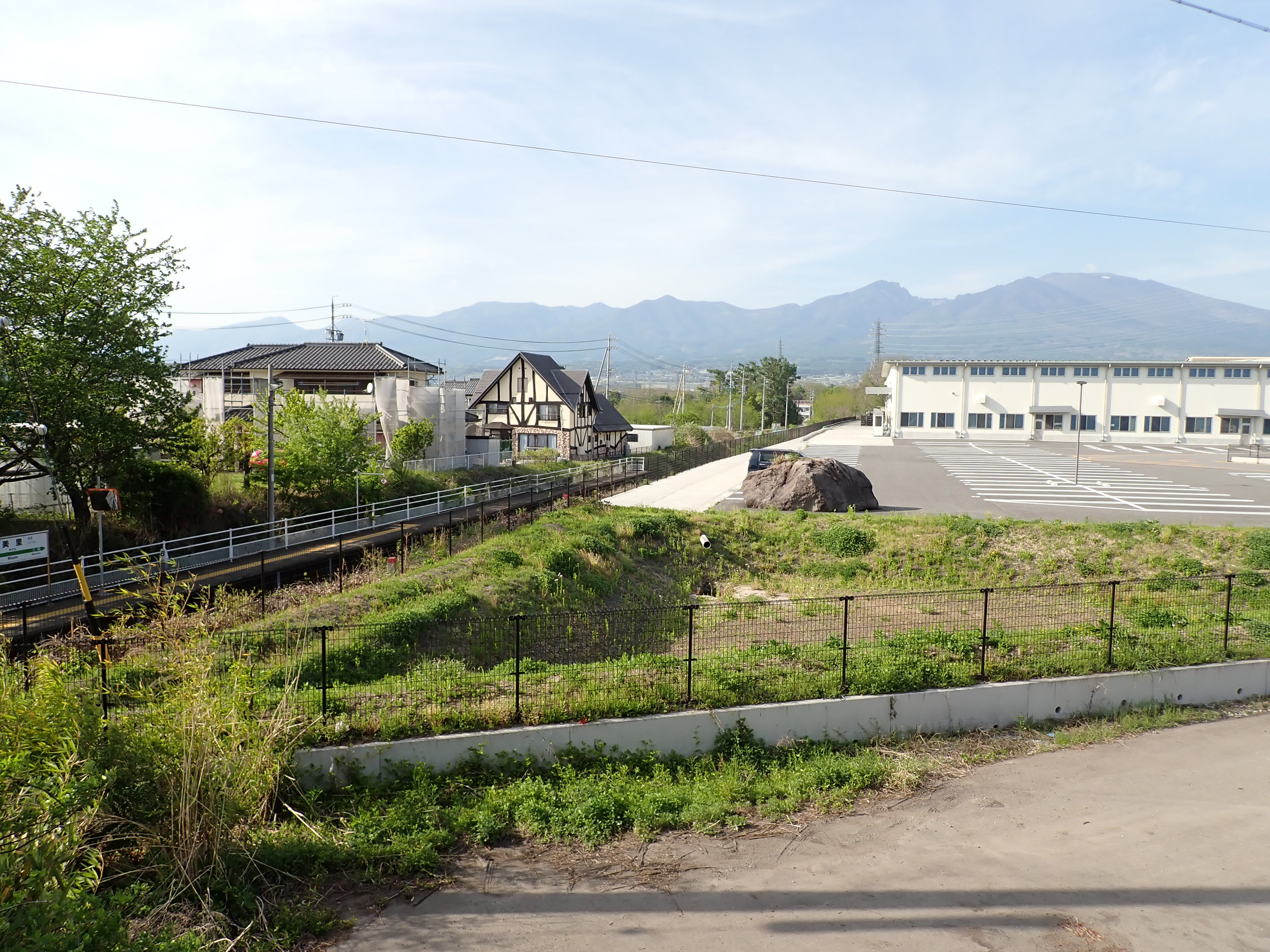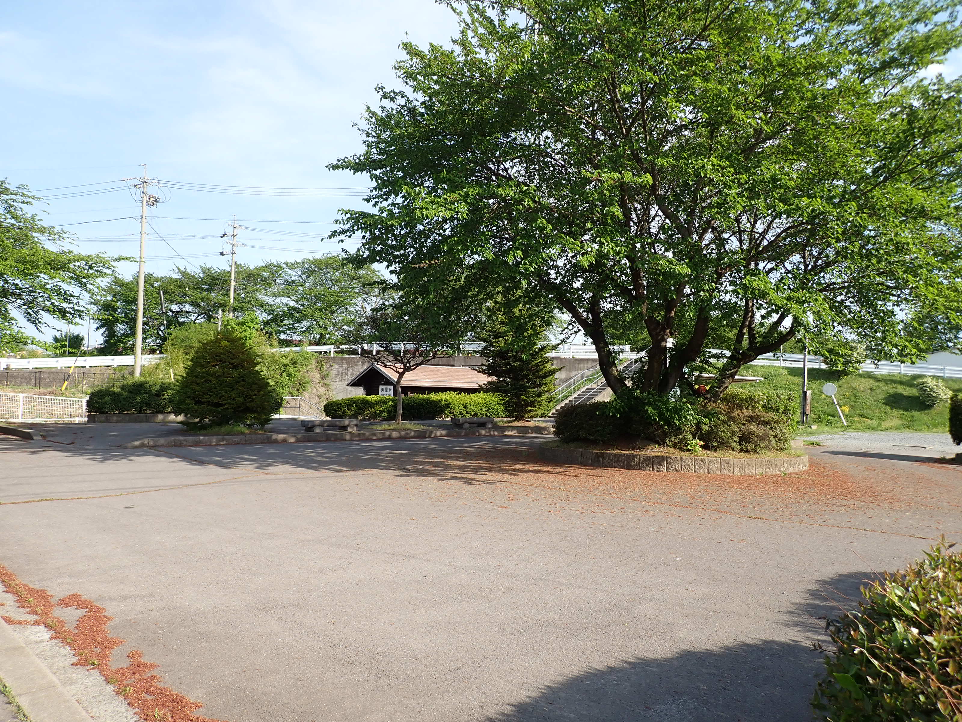 ログハウス風の待合室があり、森林組合による解説が書かれています。公園のような空間の奥に待合室やホームがある感じになっています。周辺には住宅や工場、果樹園などがあります。