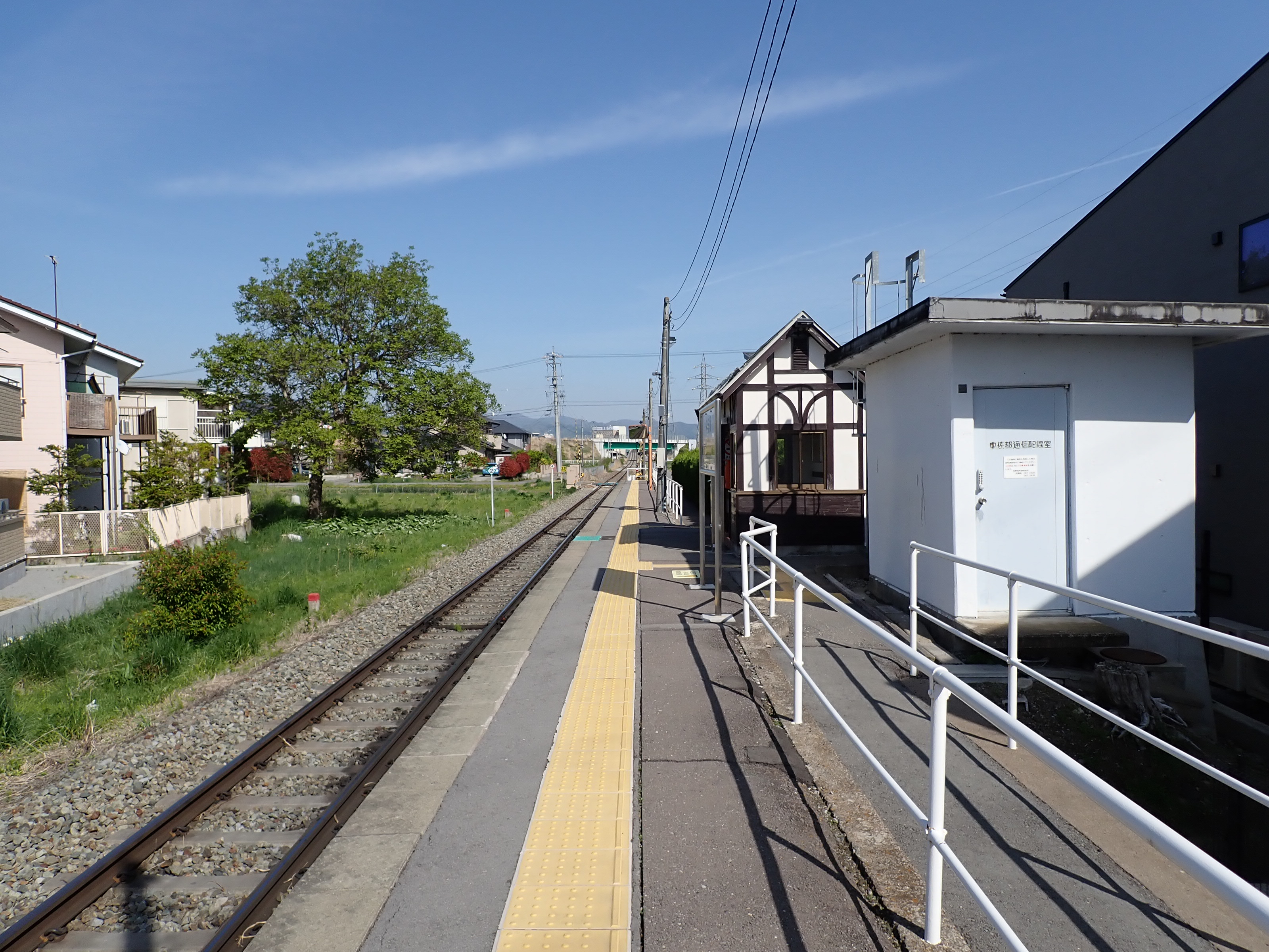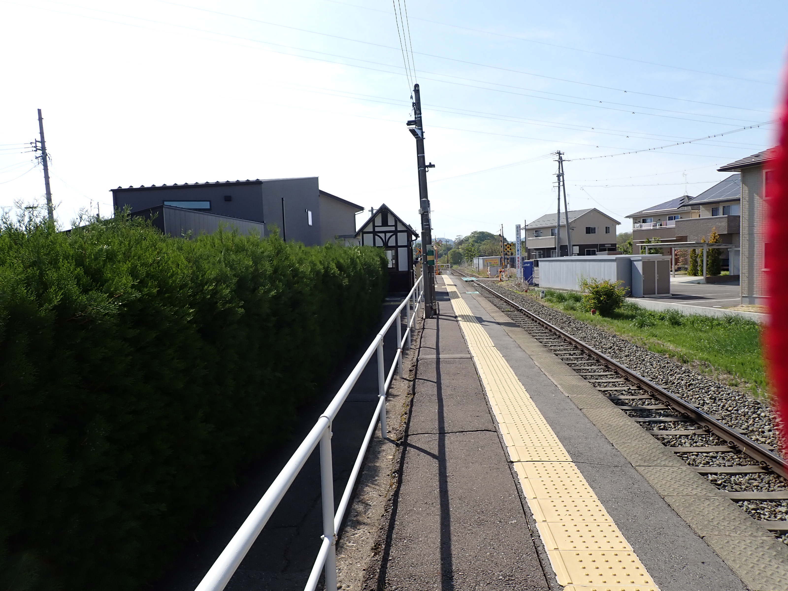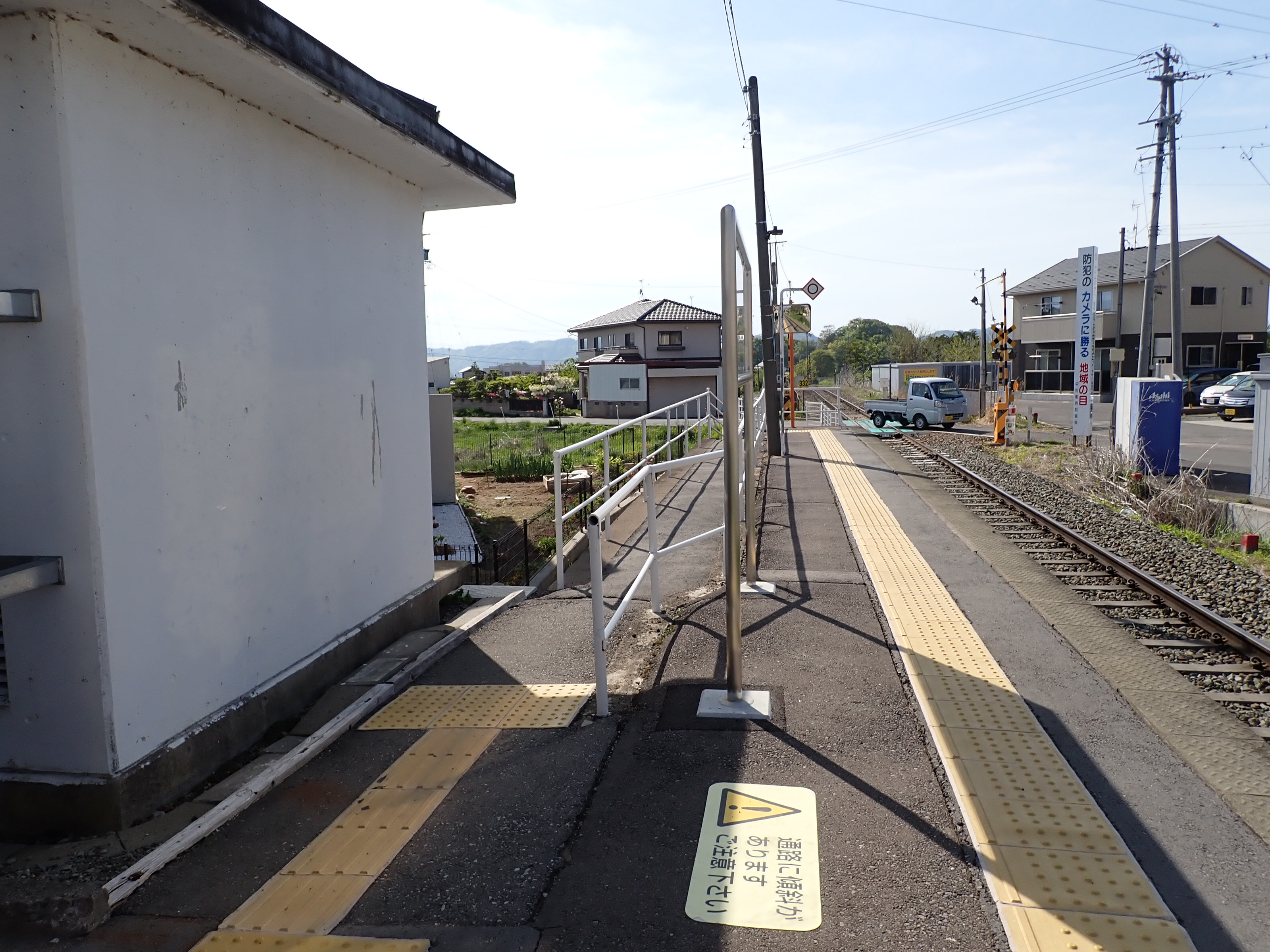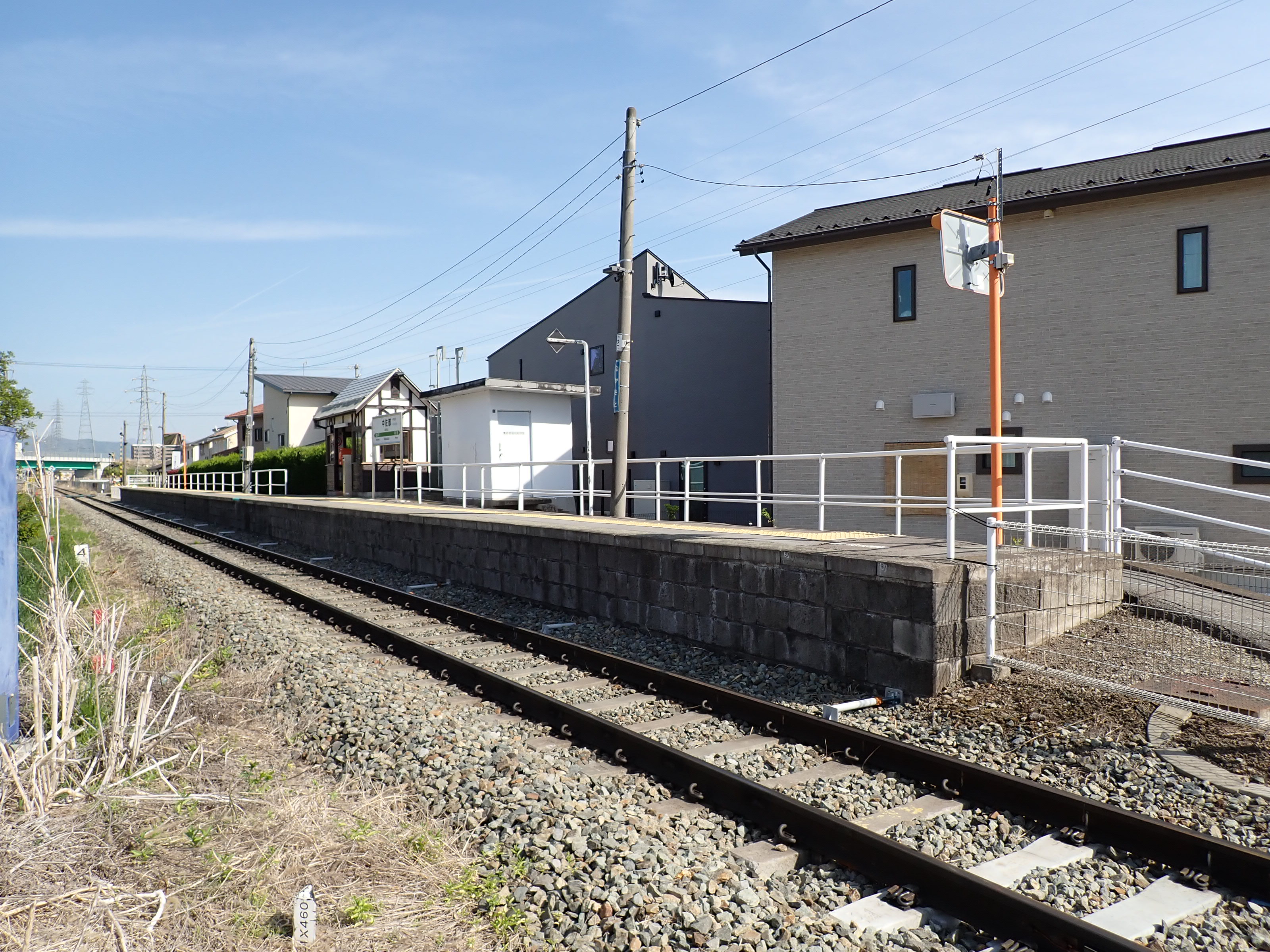 線路1本の駅で、ホームから見て両側の進行方向に出入口があり、それぞれに駐輪場があります。待合室の建物が洒落ています。周辺は新しい住宅も多くありながら、畑が広がるところです。
