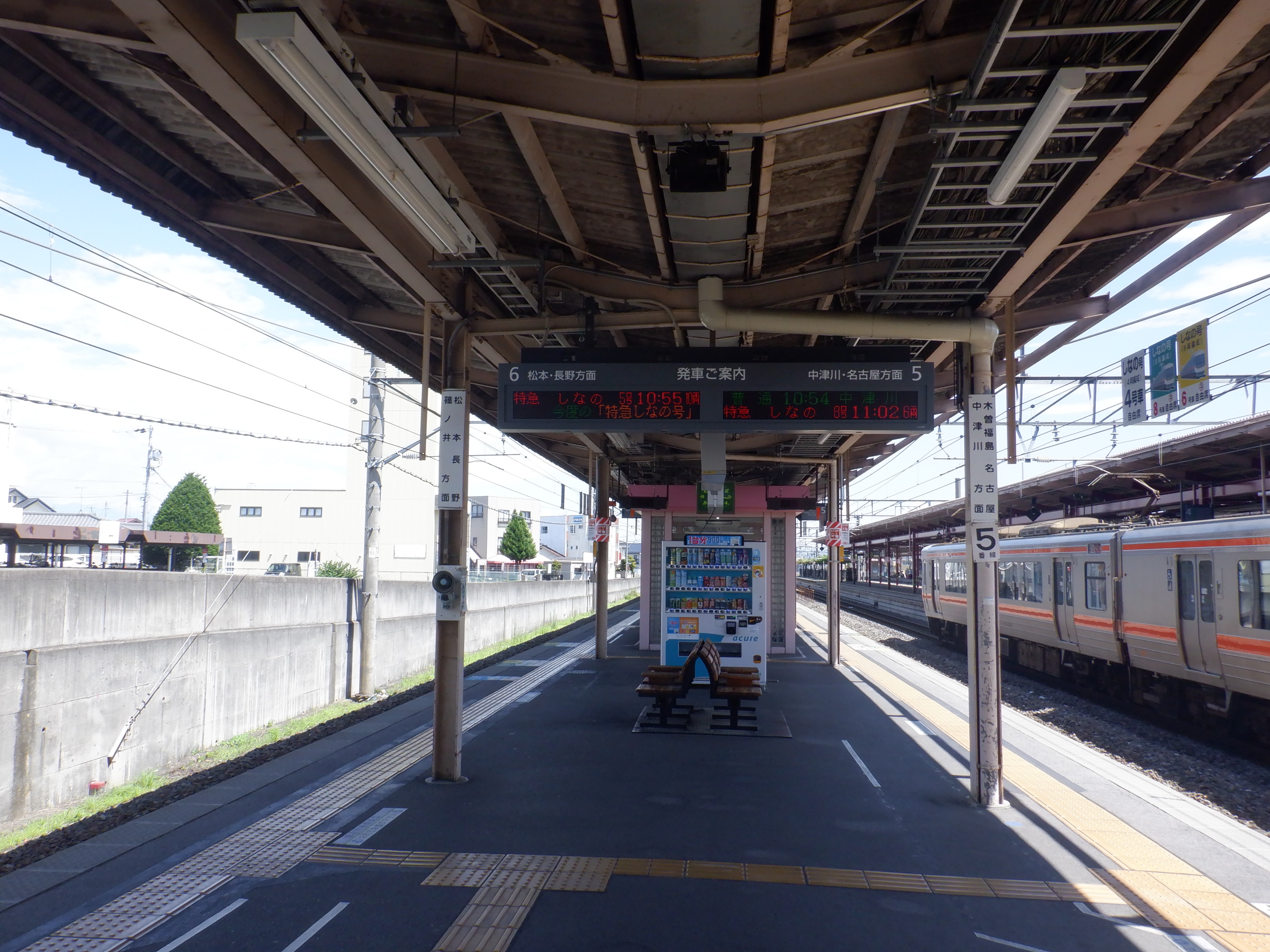 5・6番線の駅名標。吊り下げ式の方は洗馬駅側がJR東海の色になっています。