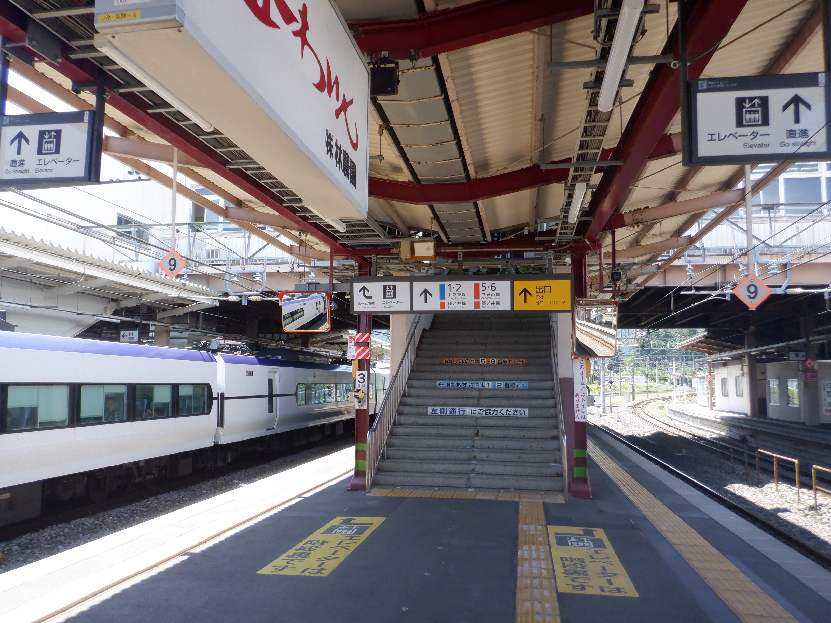 中央東線と中央西線が両方向に別れていく様子を見ることができる駅です。そして篠ノ井線に合流しますが、中央東線も2ルートに別れるため、駅名標は4方向に隣駅が表示されているものもあります。3・4番線の広丘駅側にはぶどう園があります。