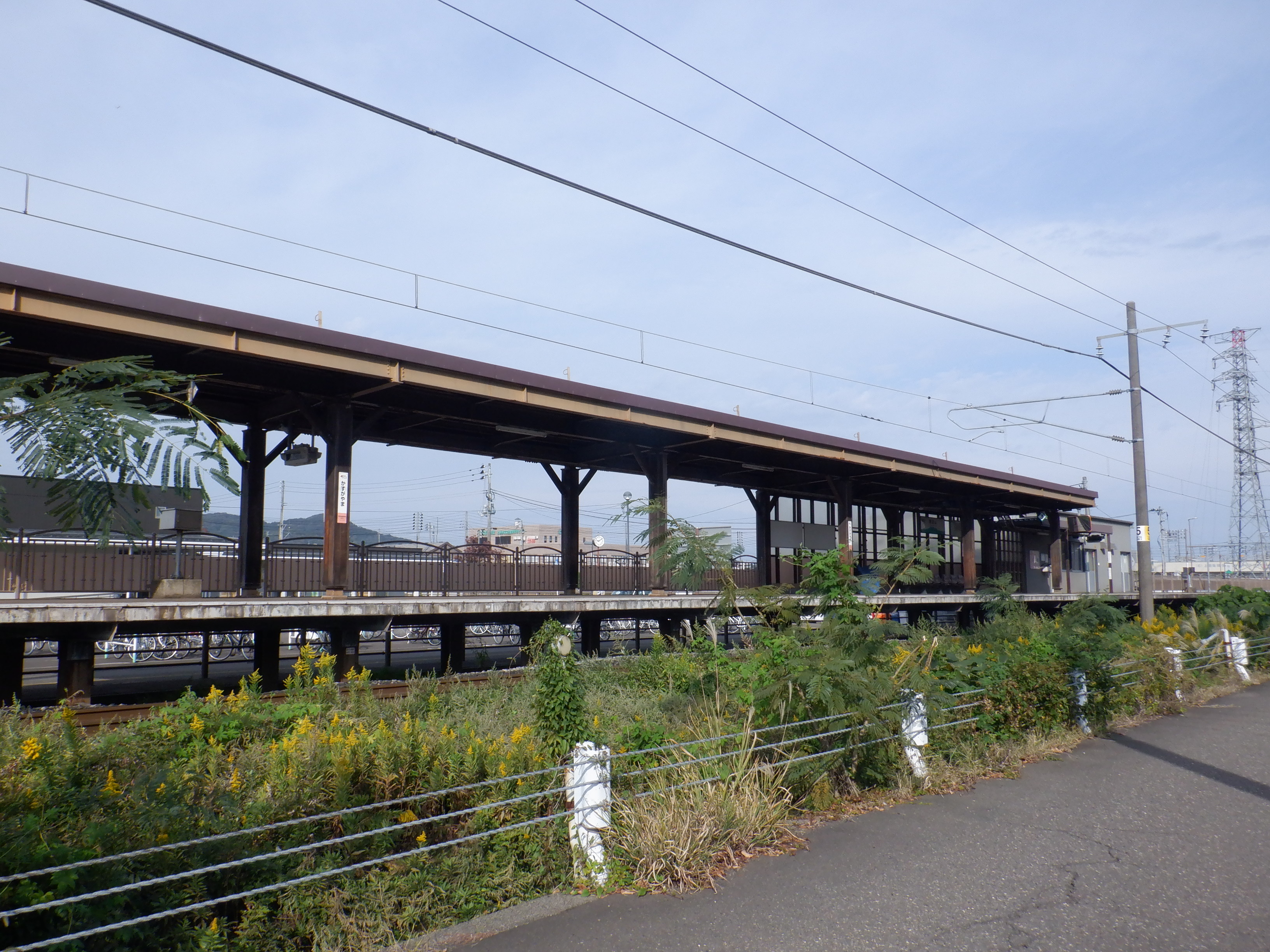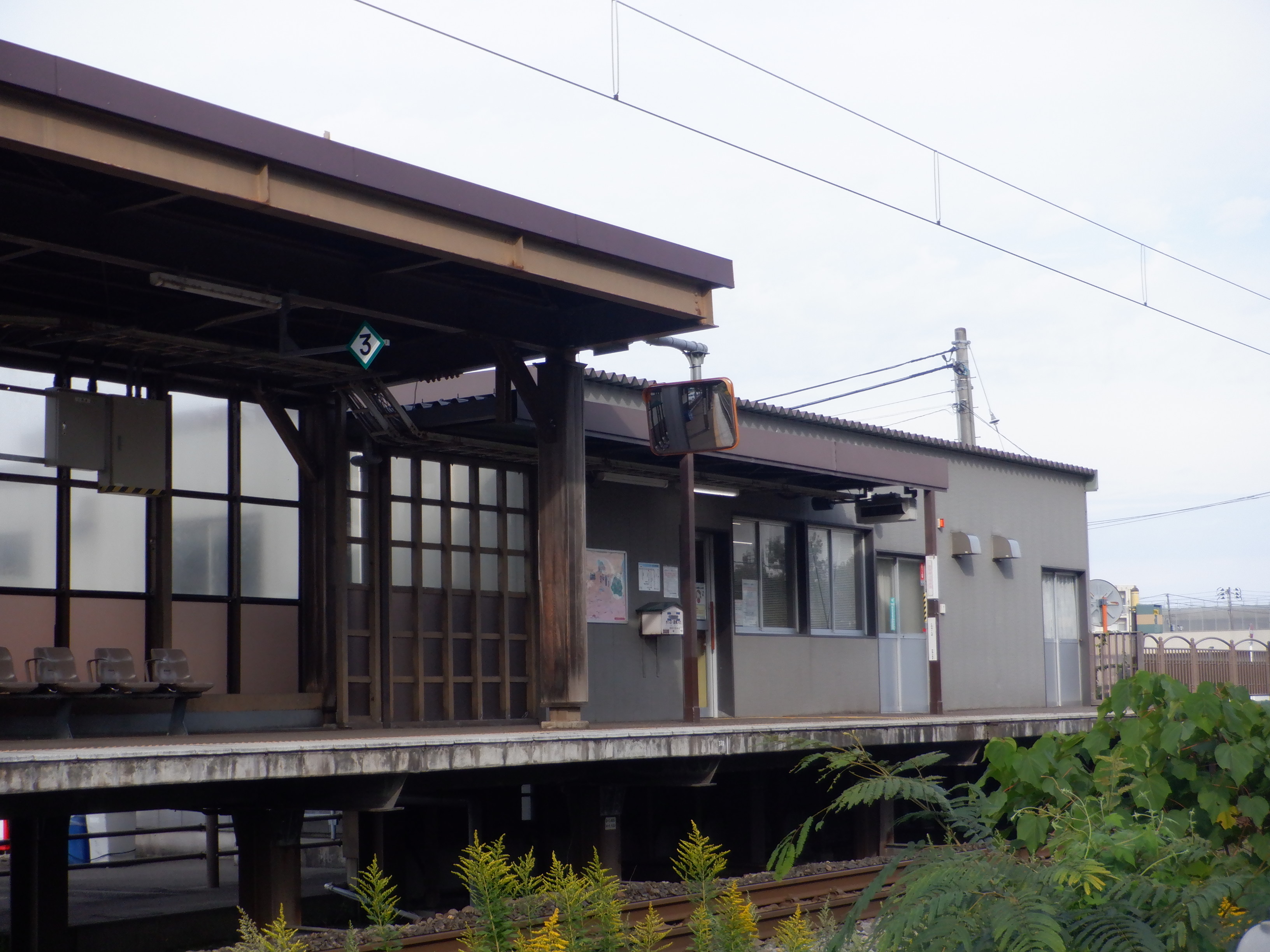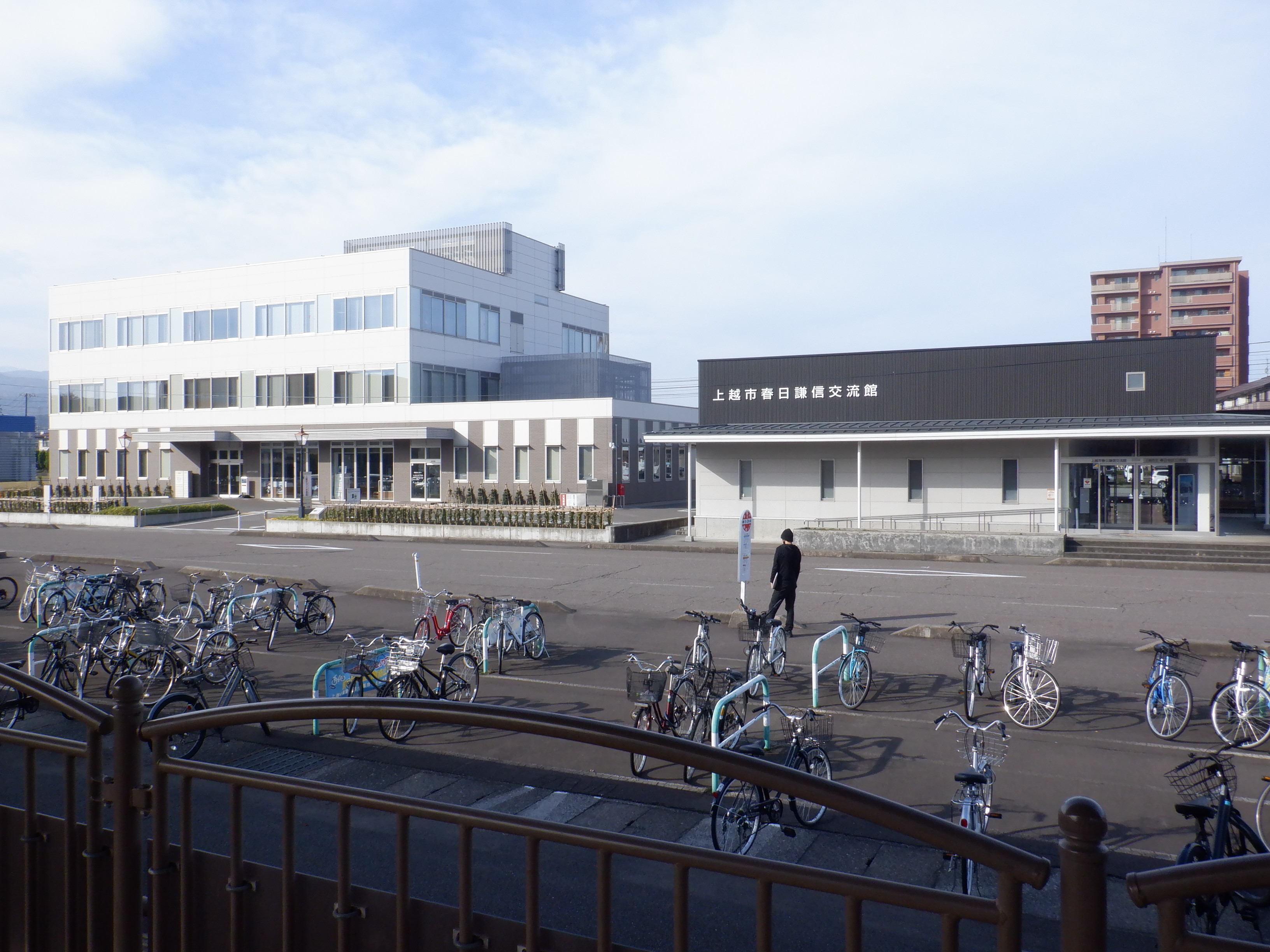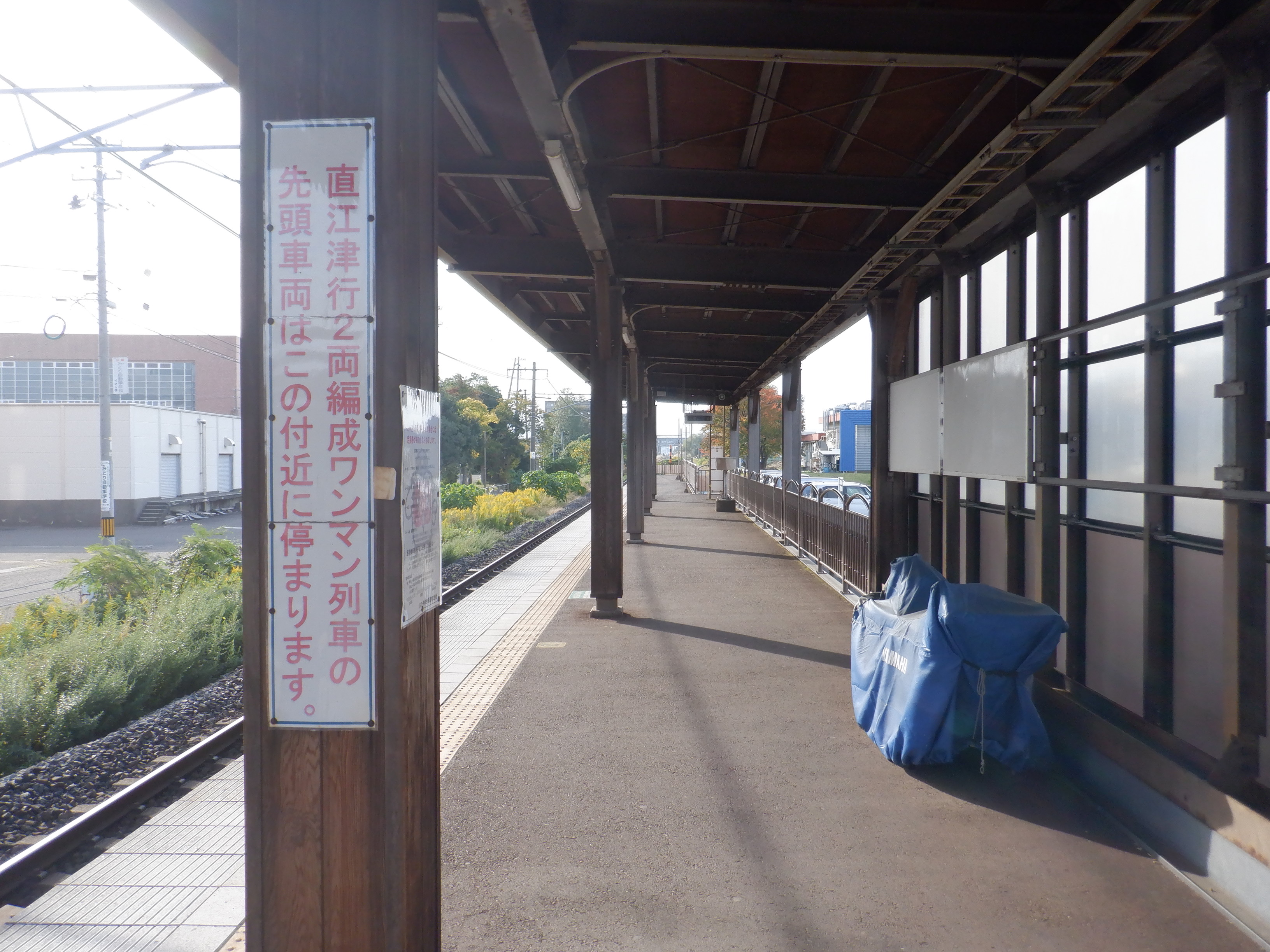 上越市役所の近くにある駅で、ホームからもその建物が見えます。ホームの下には謙信公大通りが交差しています。2002年に移転しているため駅舎・ホームともに新しいものになって、すっきりとした構造になっています。