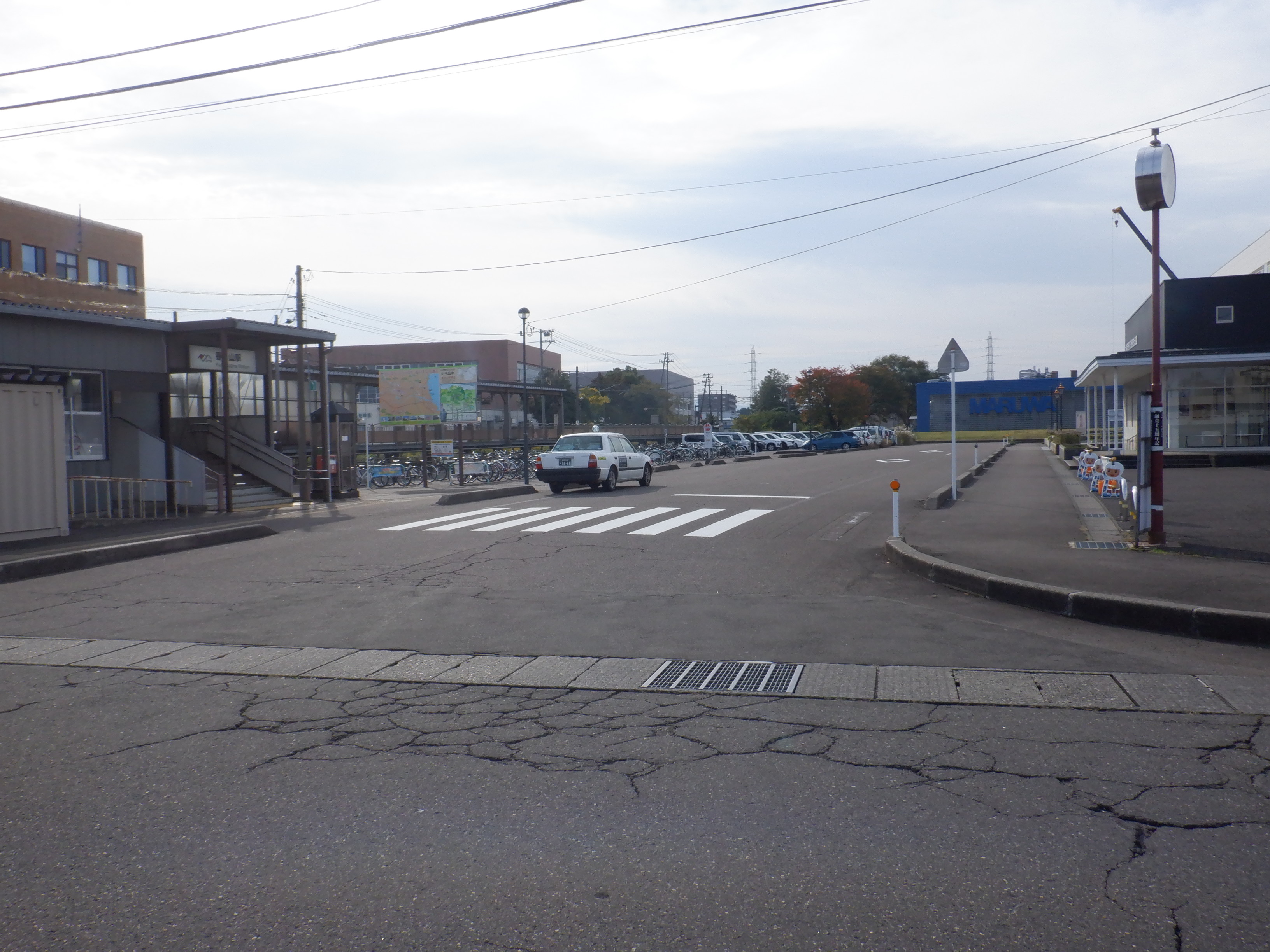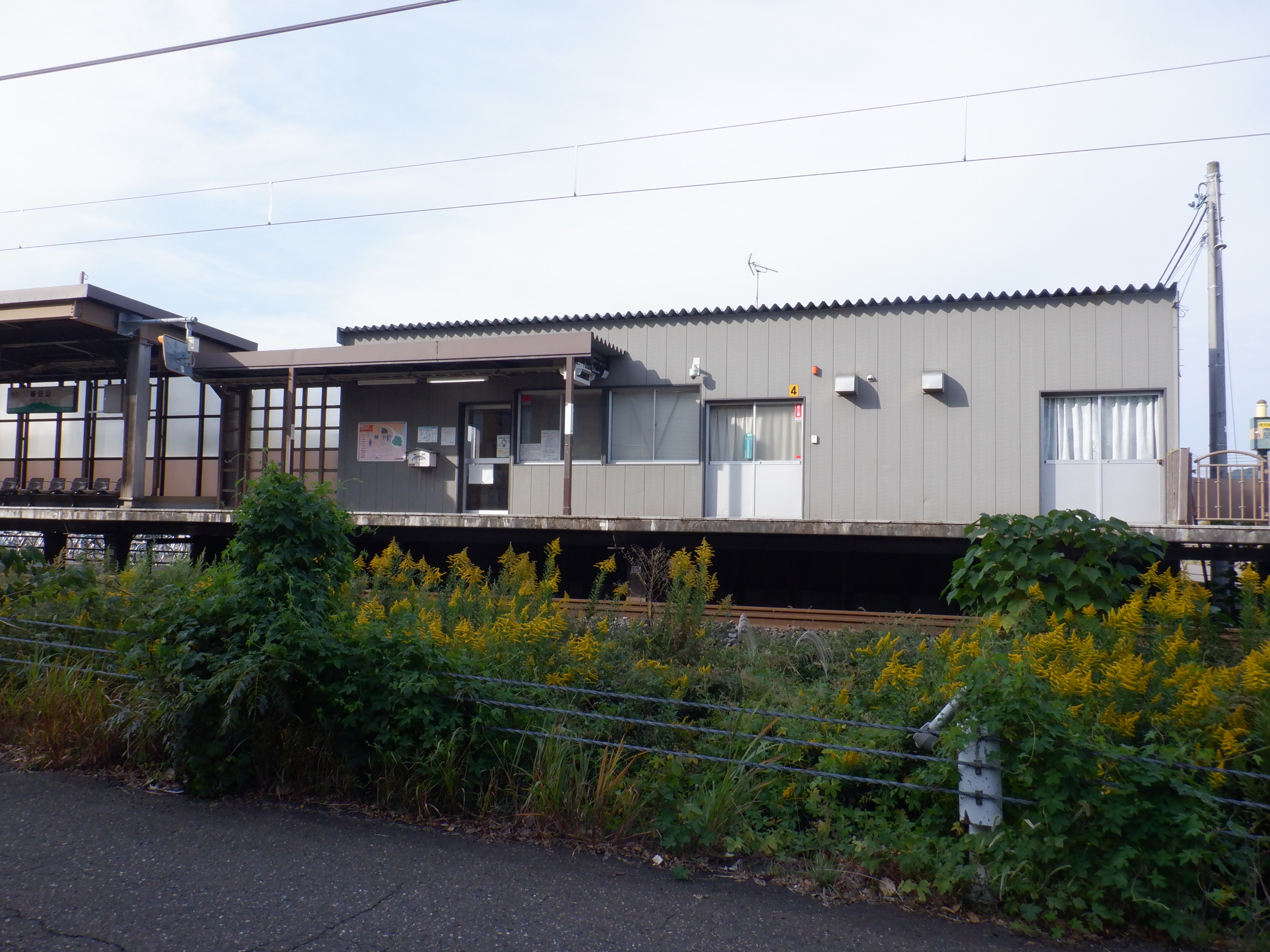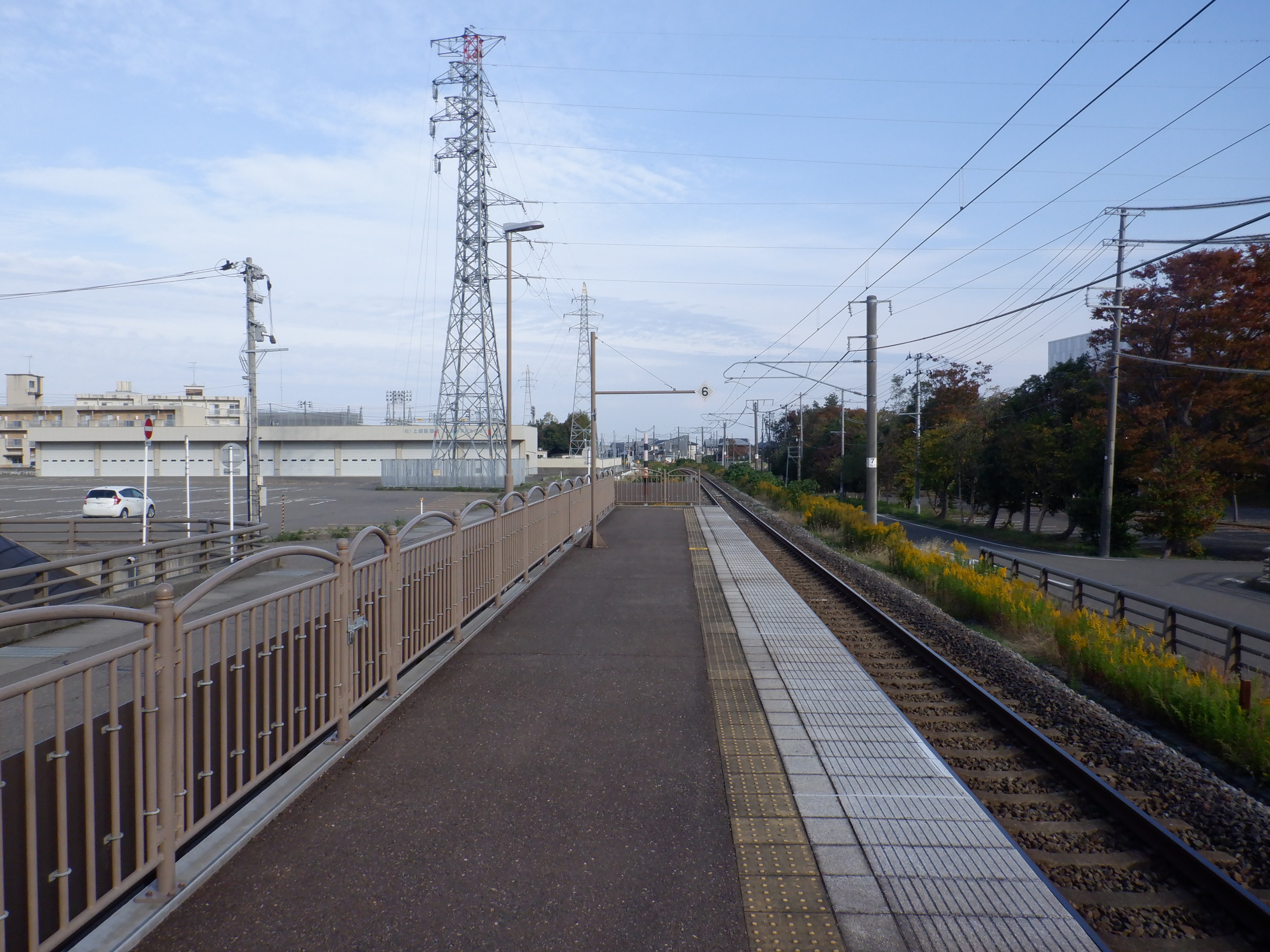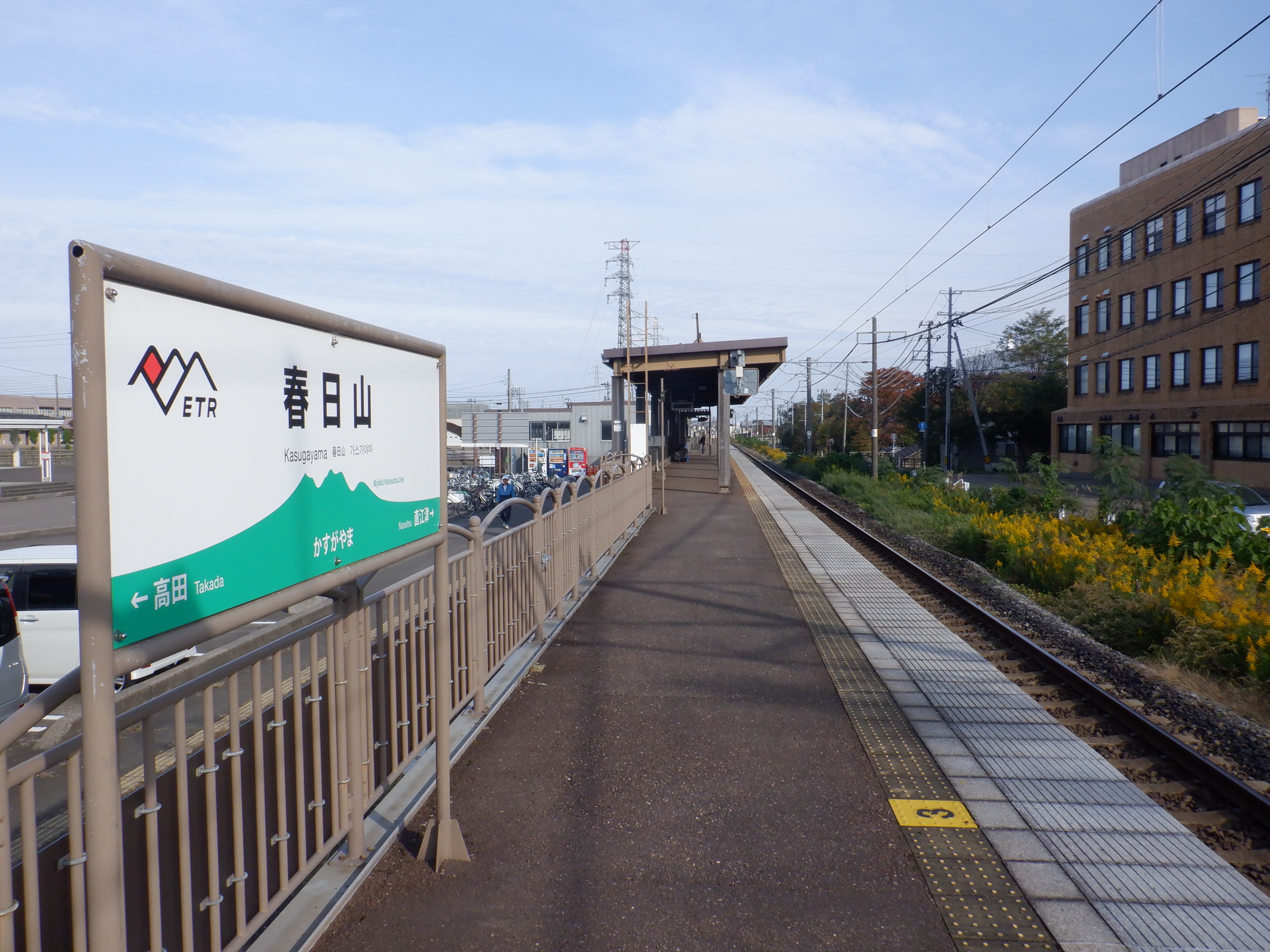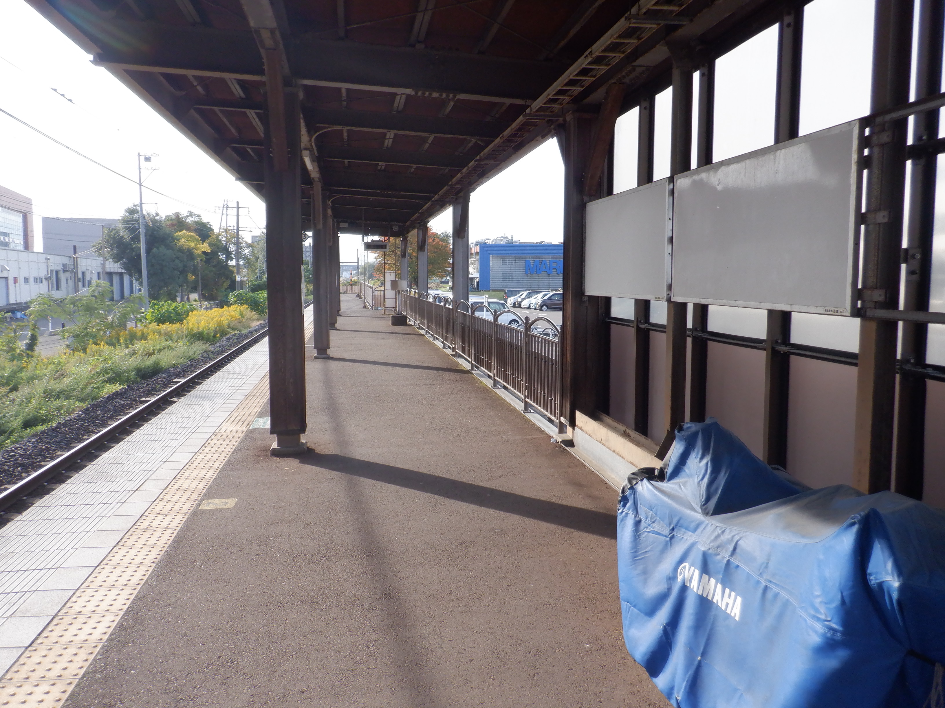 上越市役所の近くにある駅で、ホームからもその建物が見えます。ホームの下には謙信公大通りが交差しています。2002年に移転しているため駅舎・ホームともに新しいものになって、すっきりとした構造になっています。