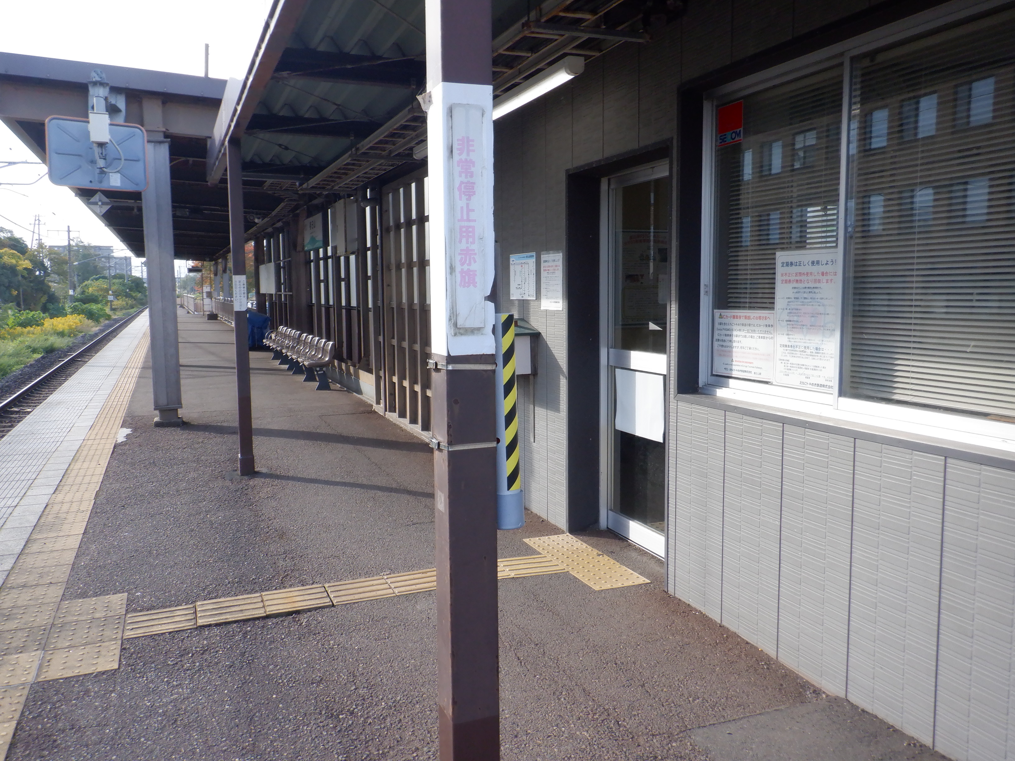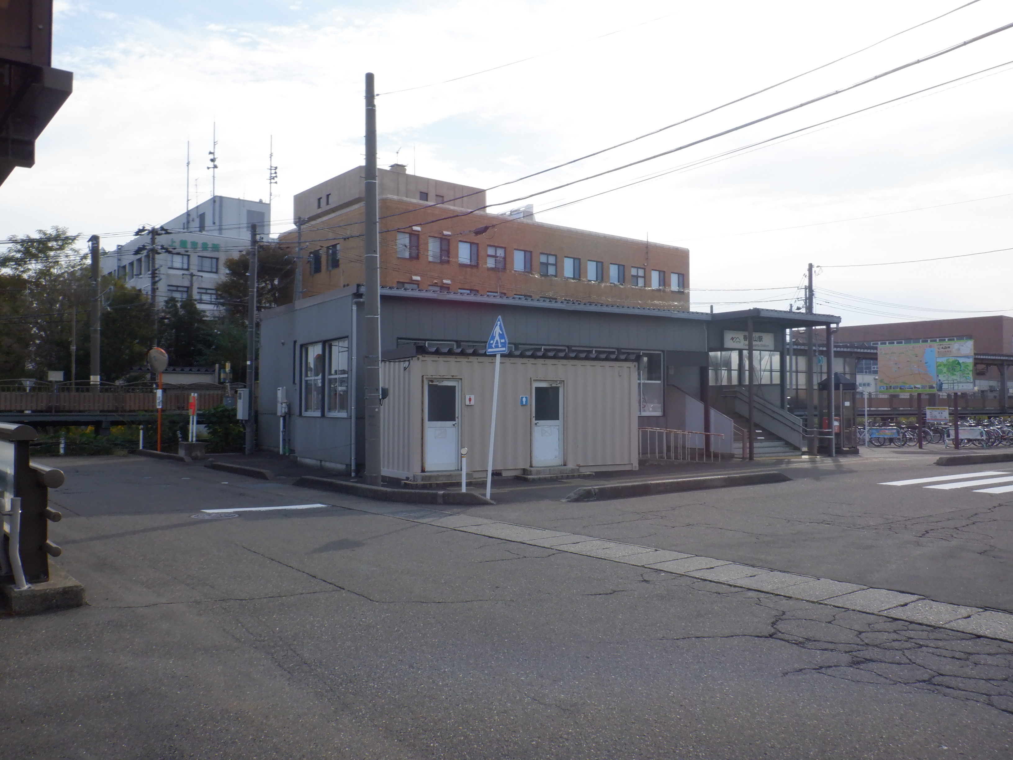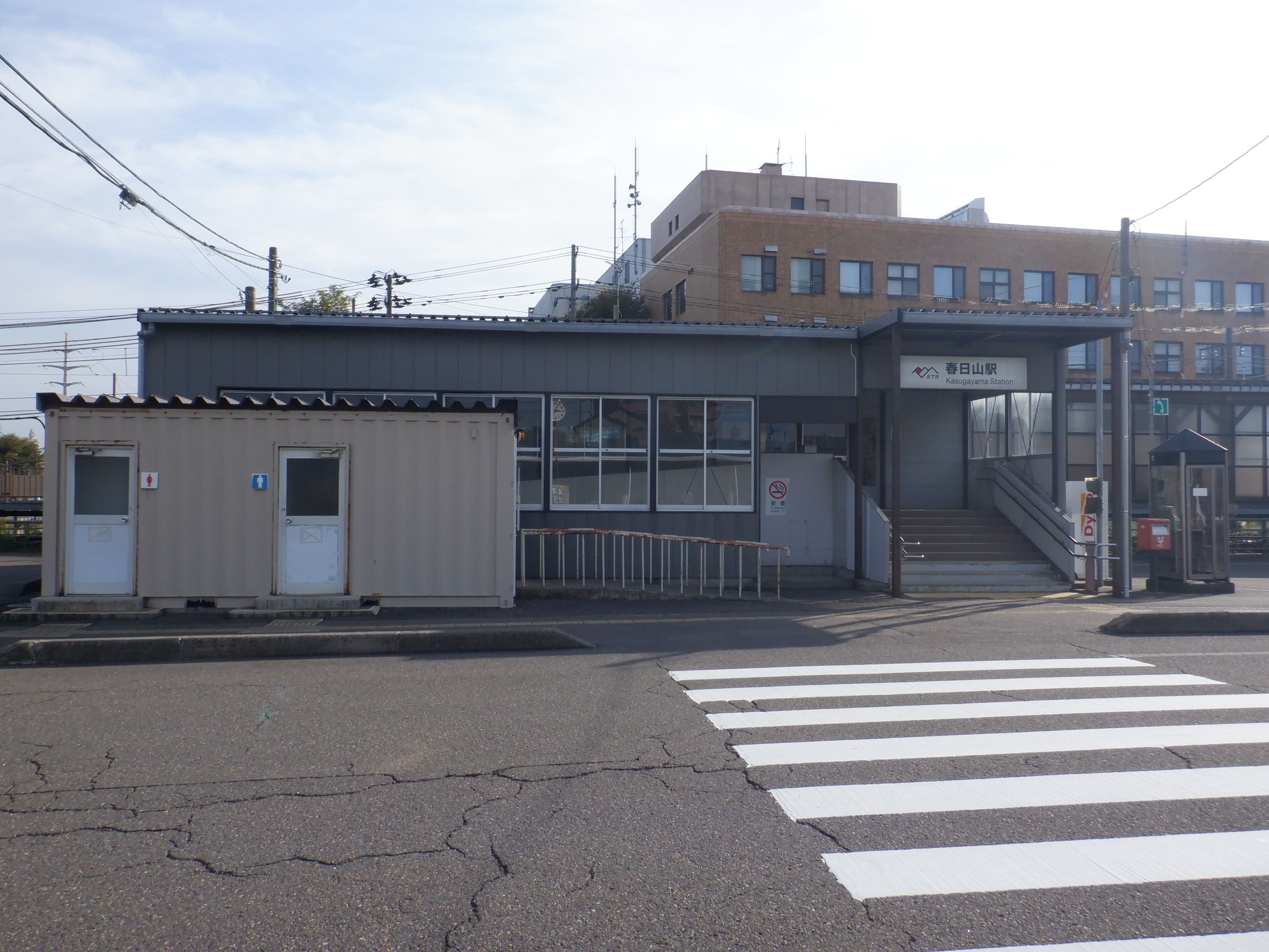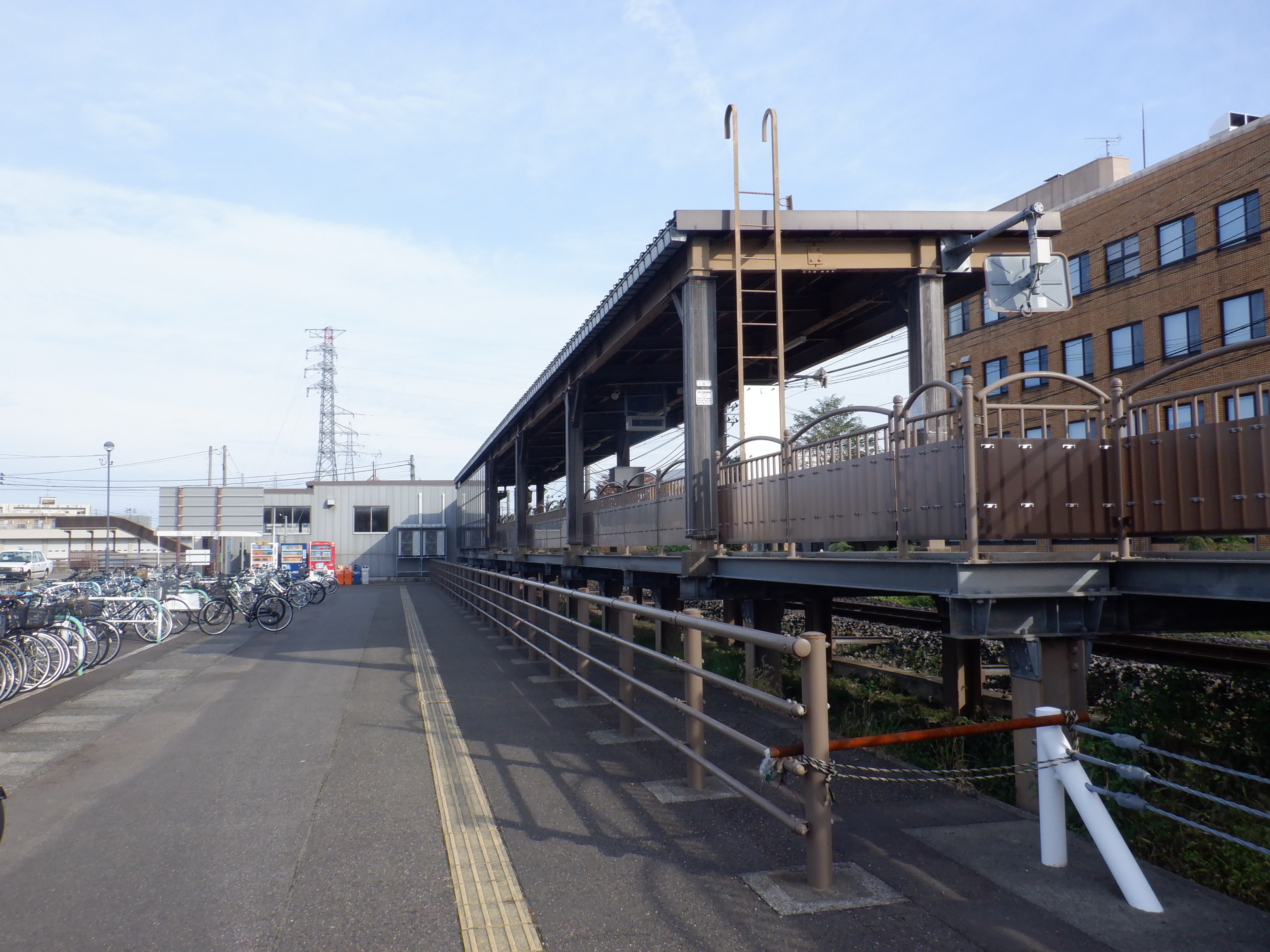 上越市役所の近くにある駅で、ホームからもその建物が見えます。ホームの下には謙信公大通りが交差しています。2002年に移転しているため駅舎・ホームともに新しいものになって、すっきりとした構造になっています。