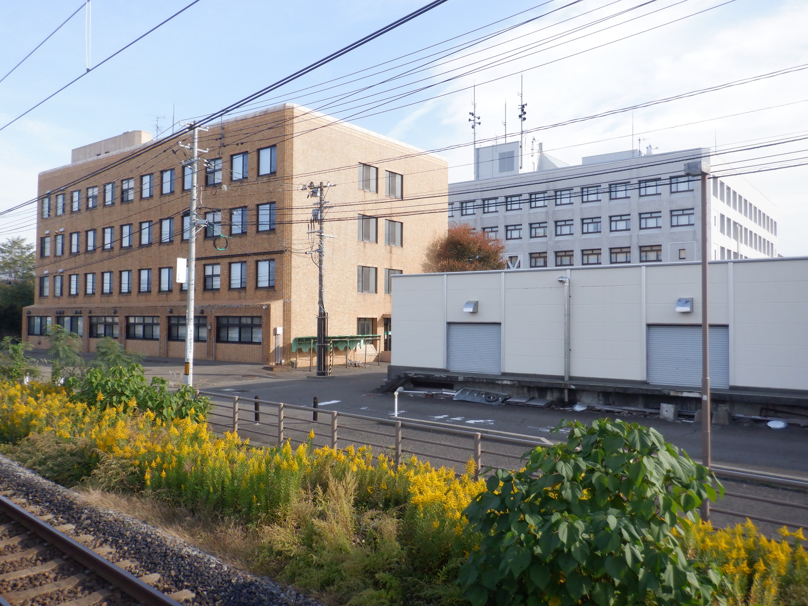 ホームから見た様子、駅舎と反対側。上越市役所があります。