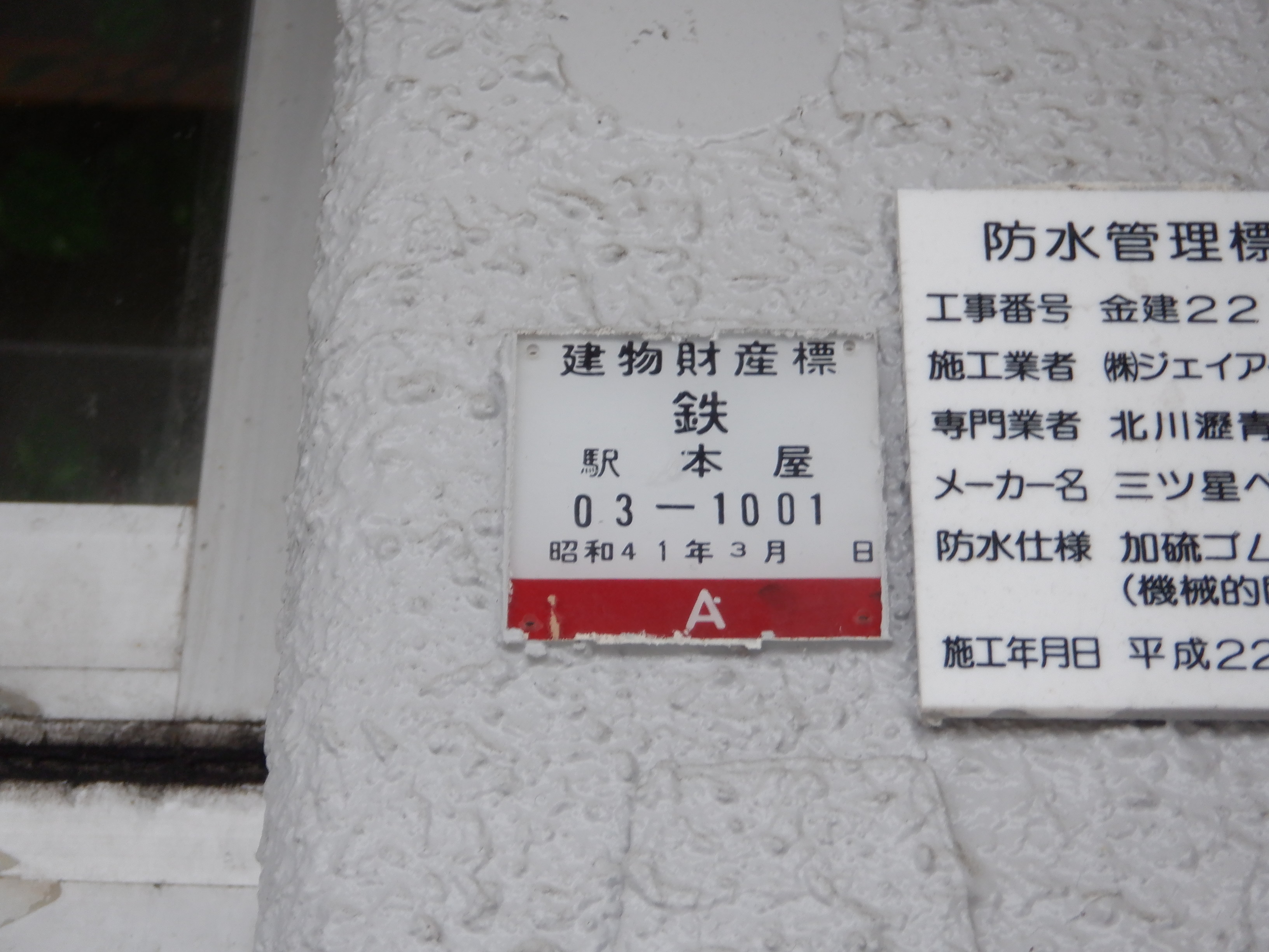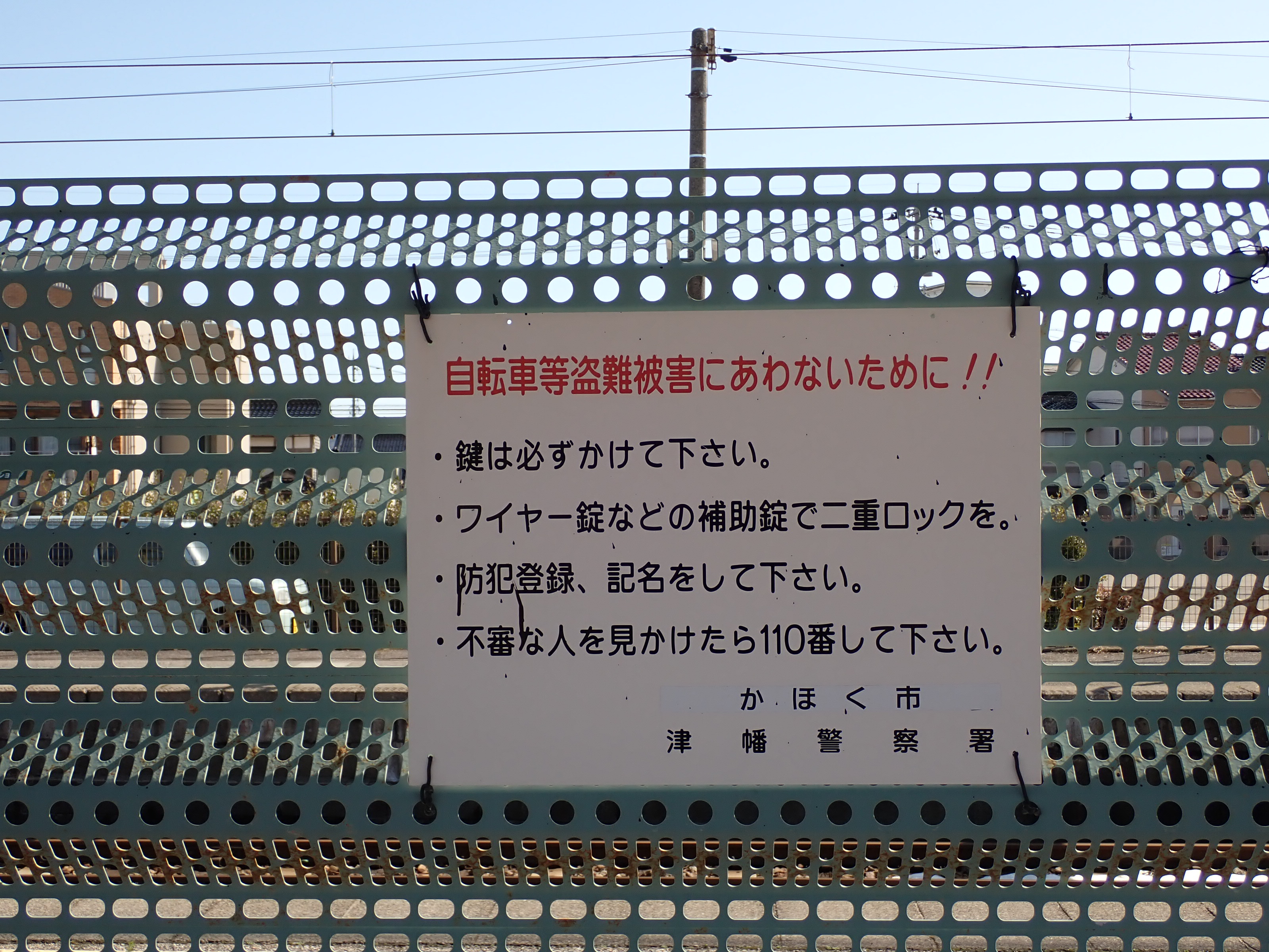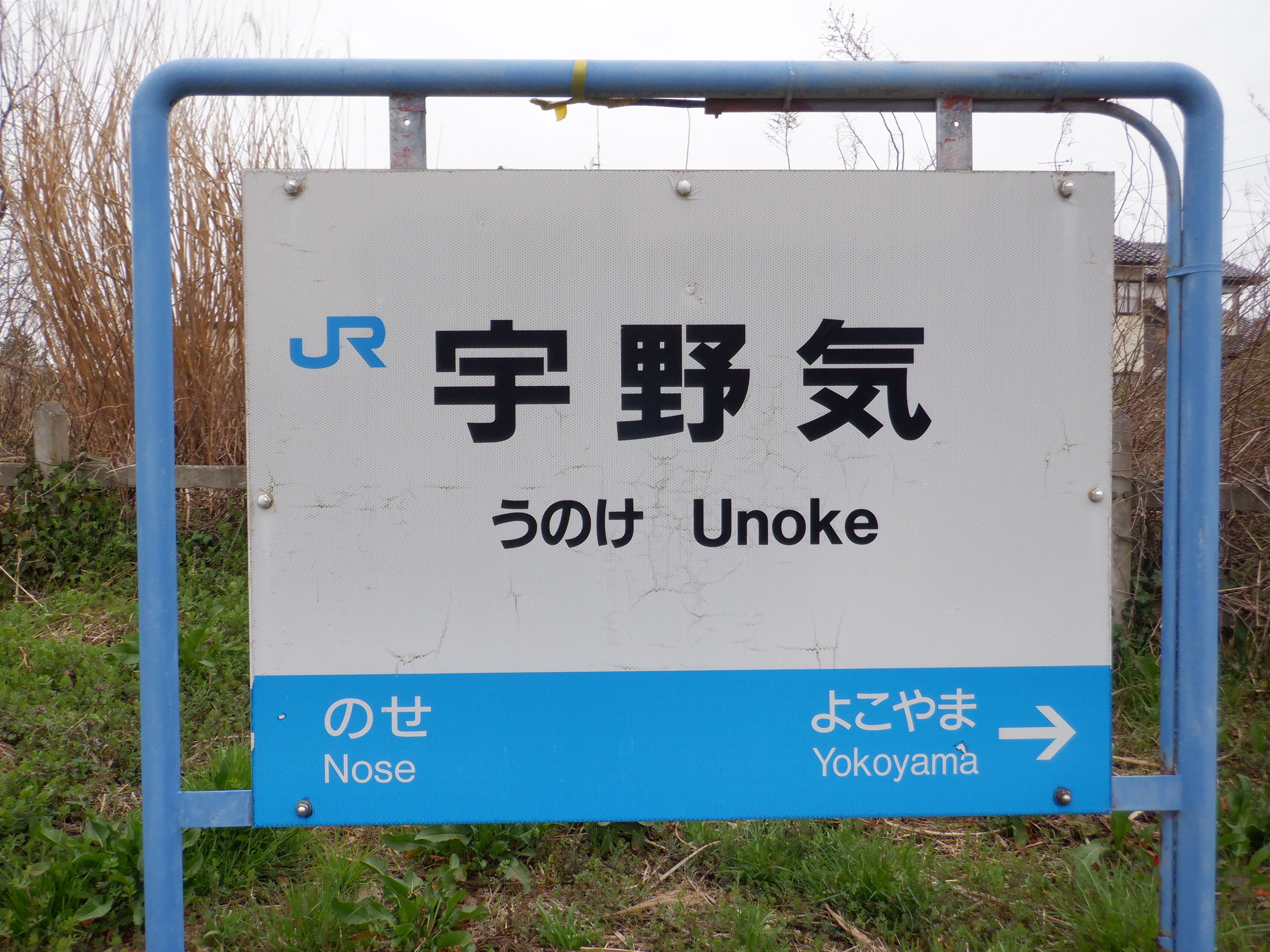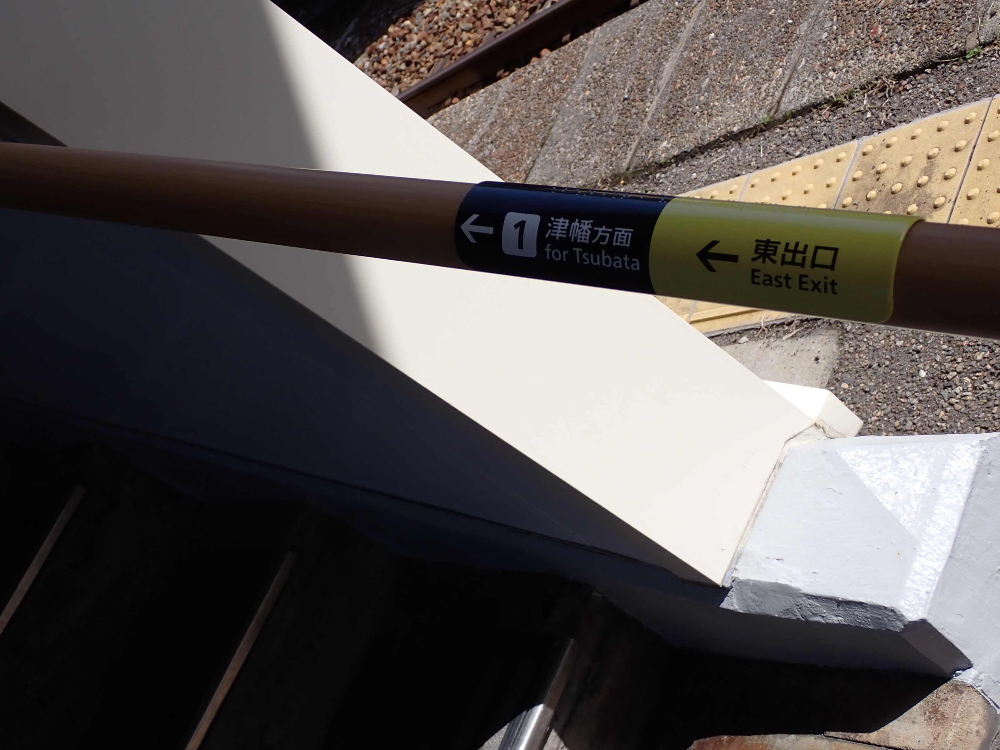 2番のりばの跨線橋壁にある縦型駅名標など。