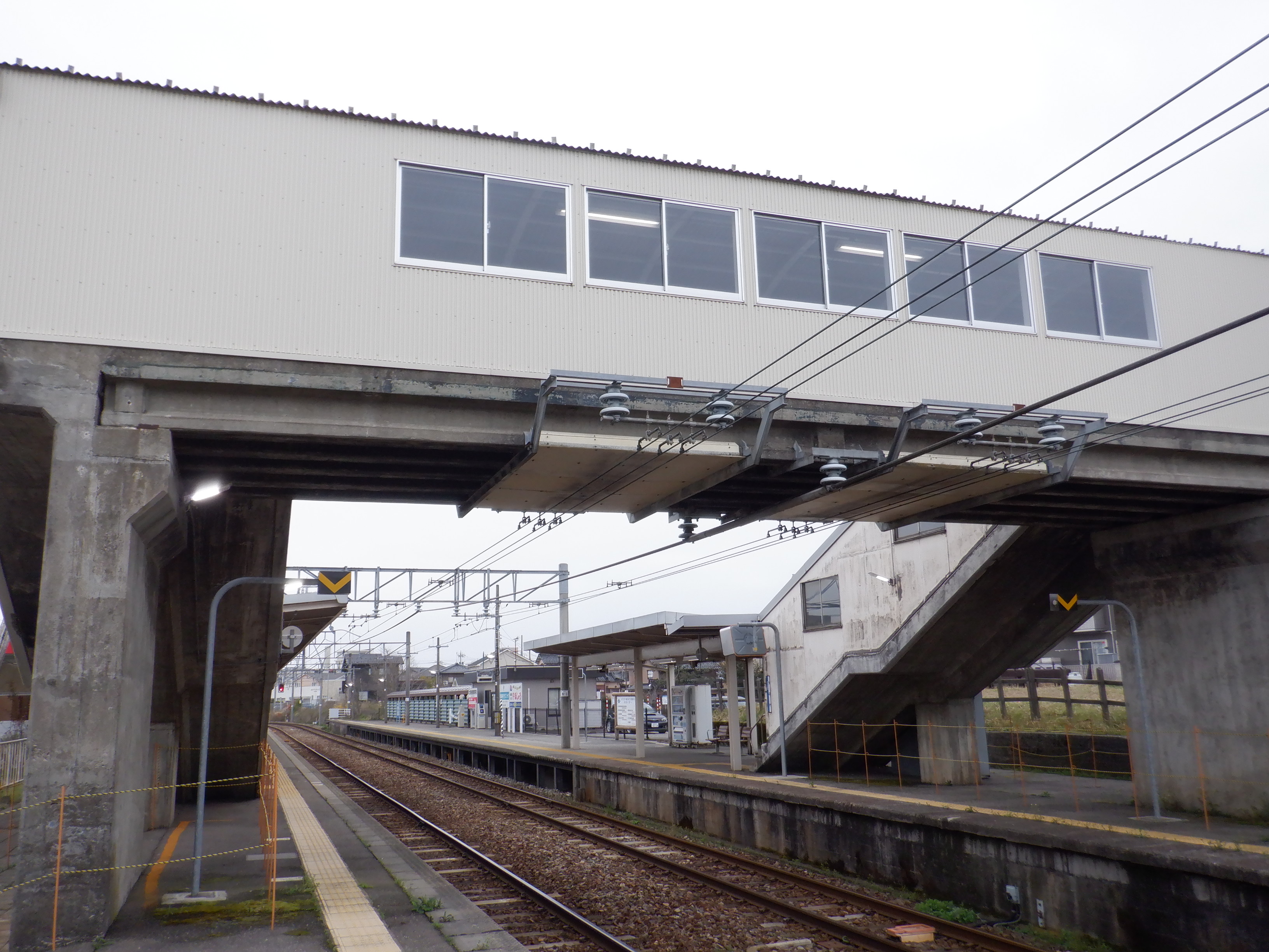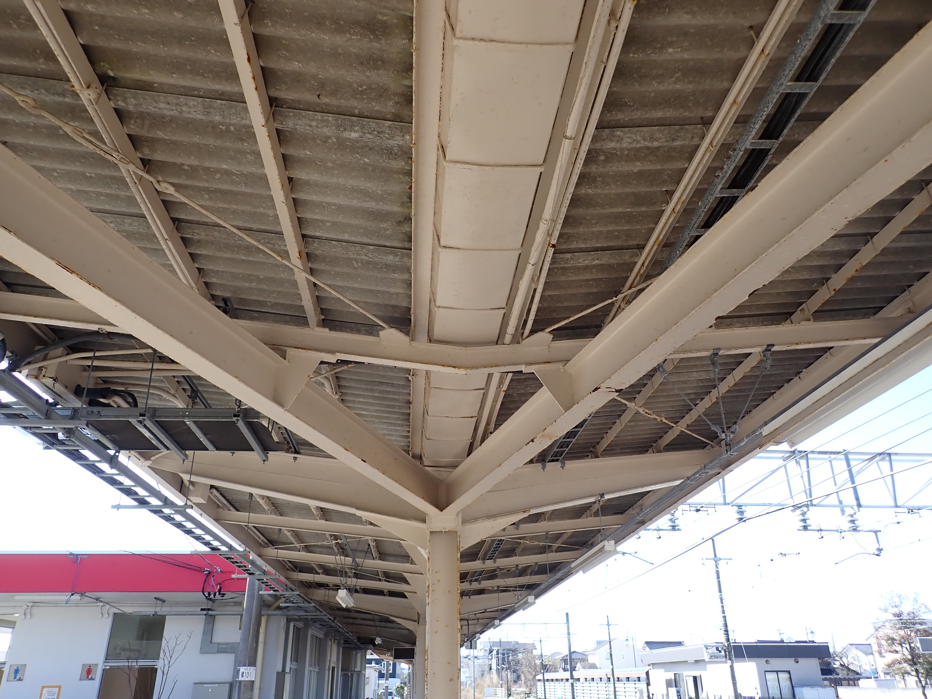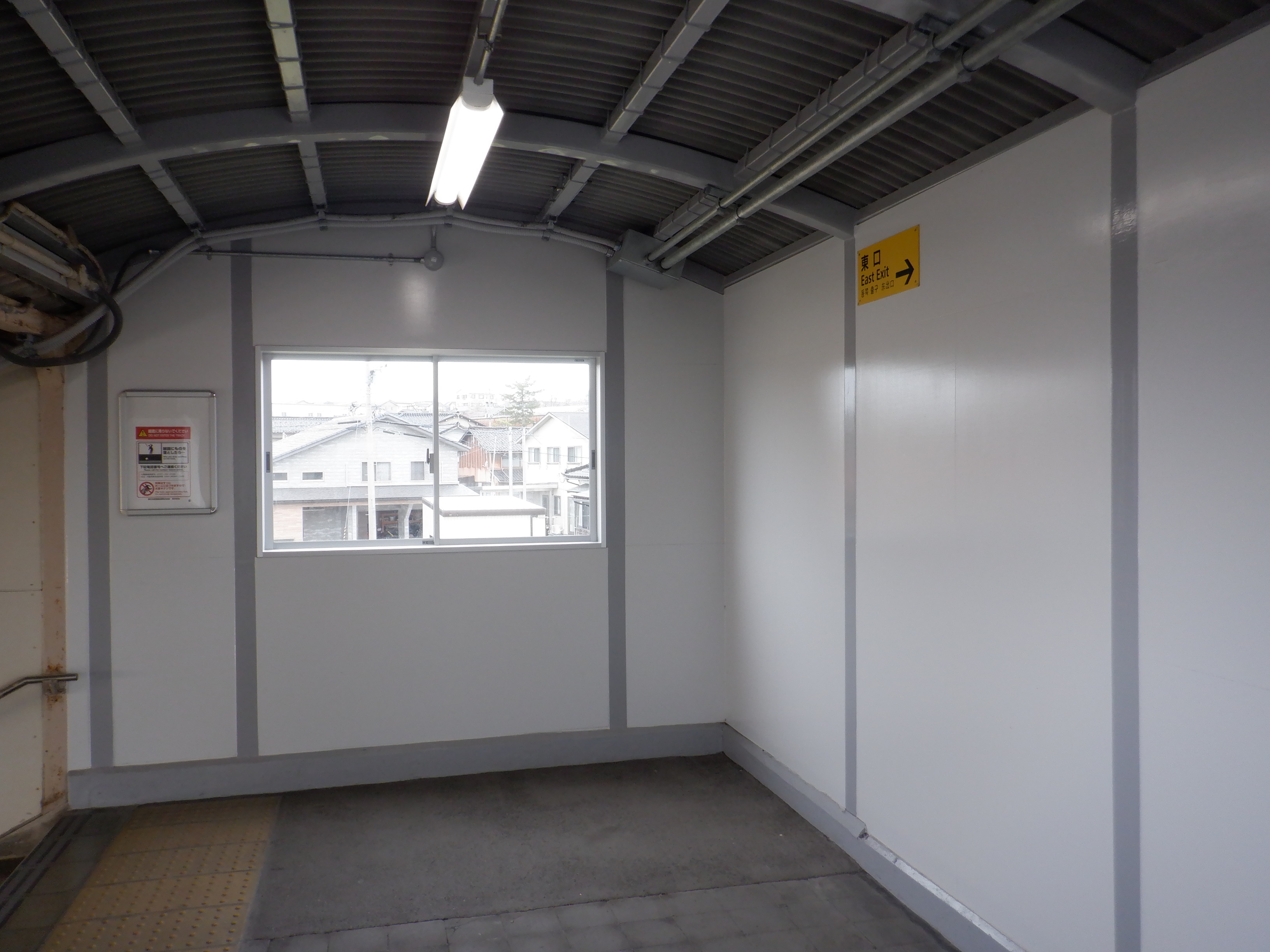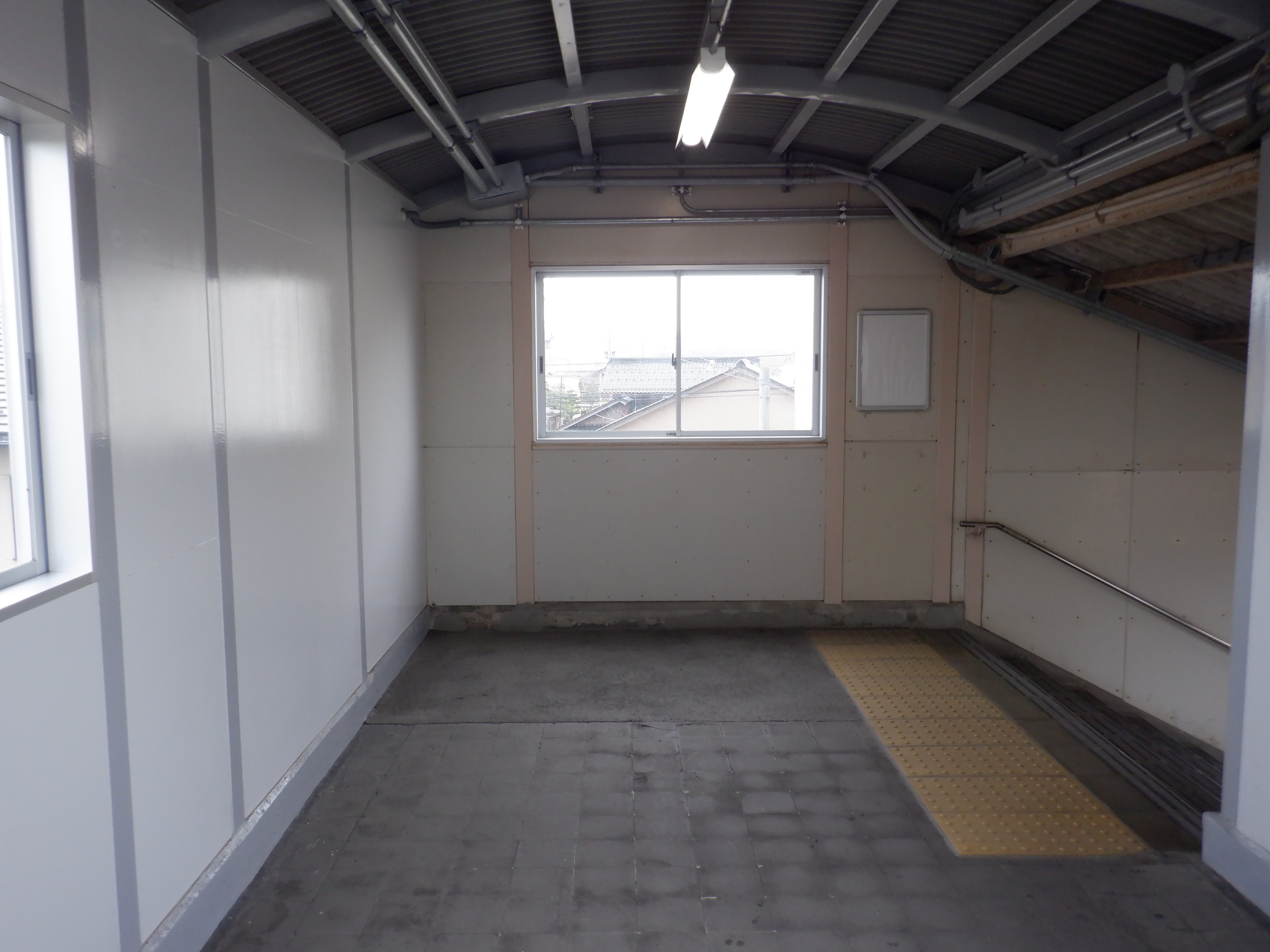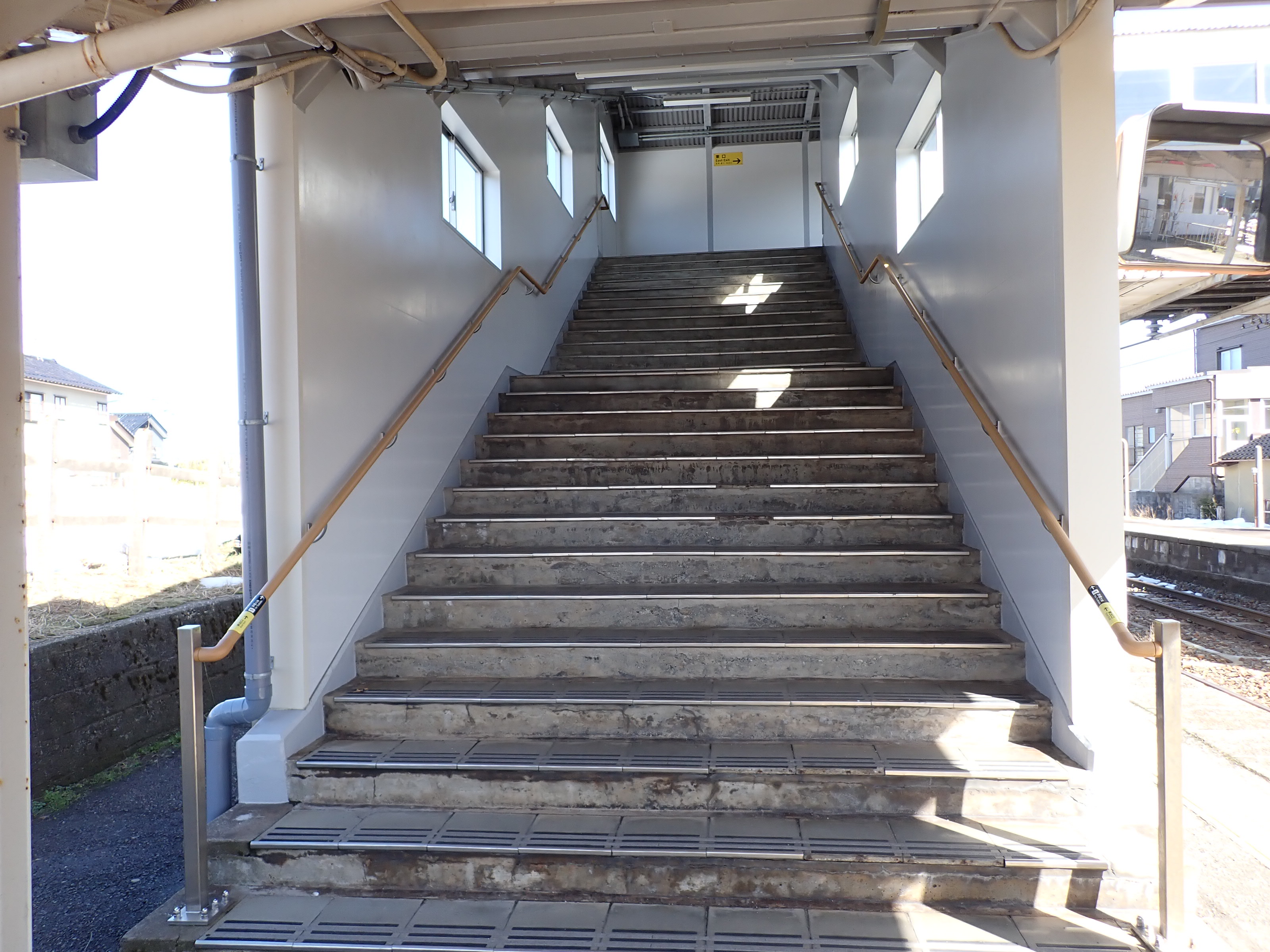 跨線橋の跨線部分、2番のりば側半分が古いままだったものが新しくなりました。施工時期が異なり、跨線部分の突き当たり(階段からの延長部分)が1番のりば側は古いまま、2番のりばは新しくなっているという違いが出てきました。