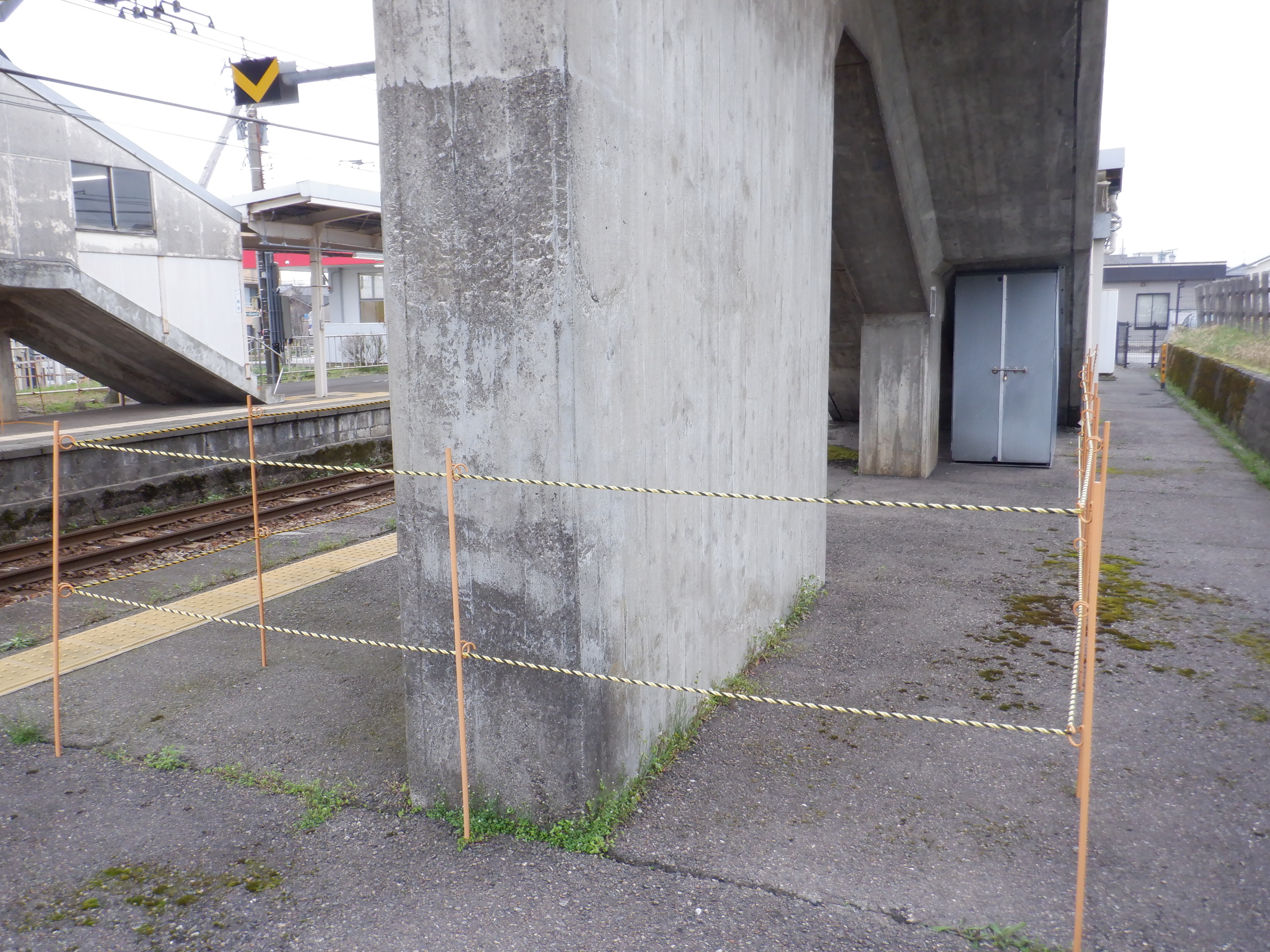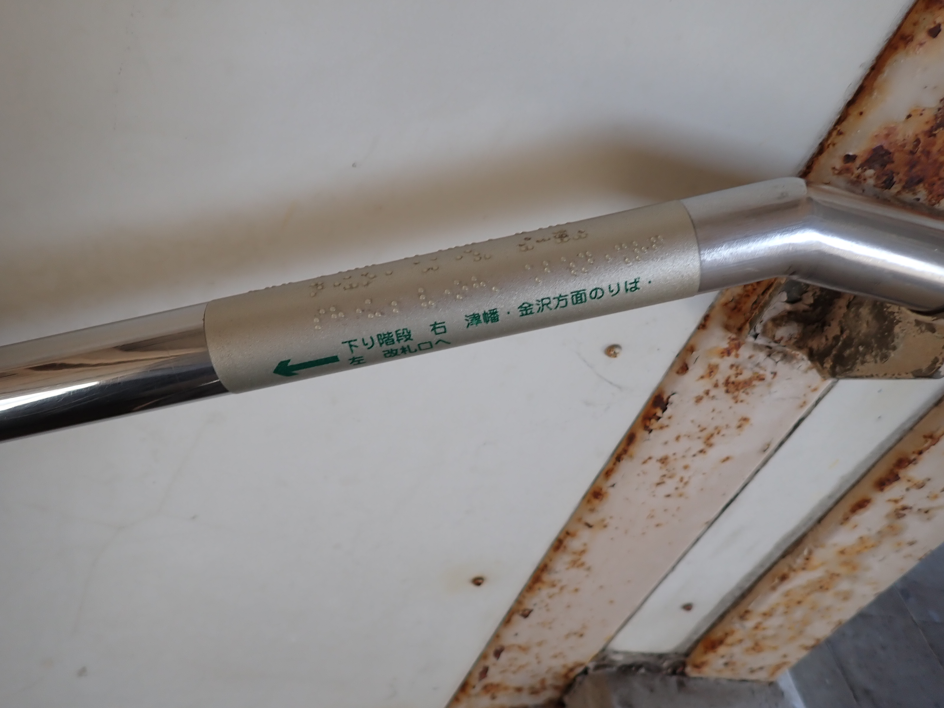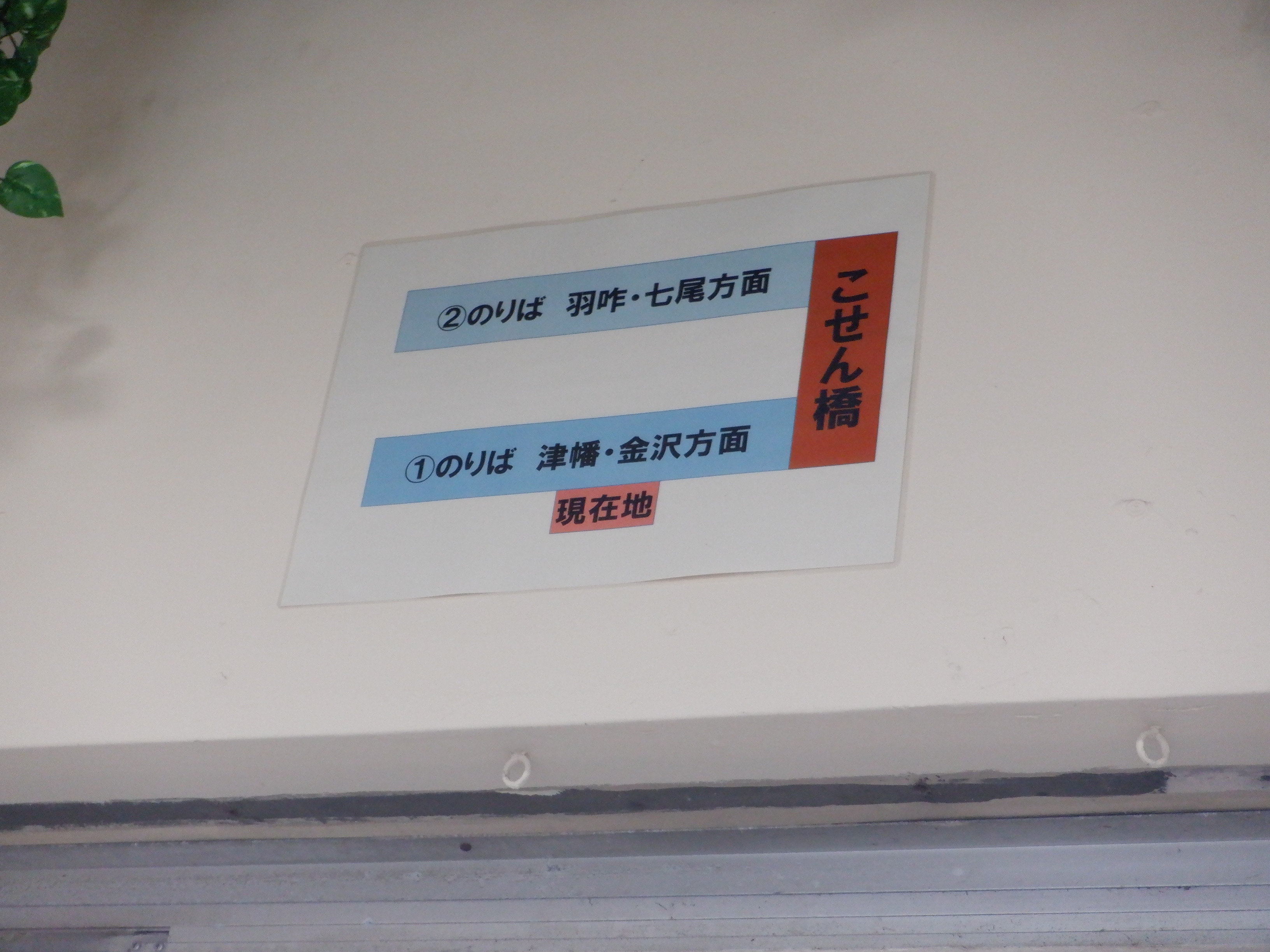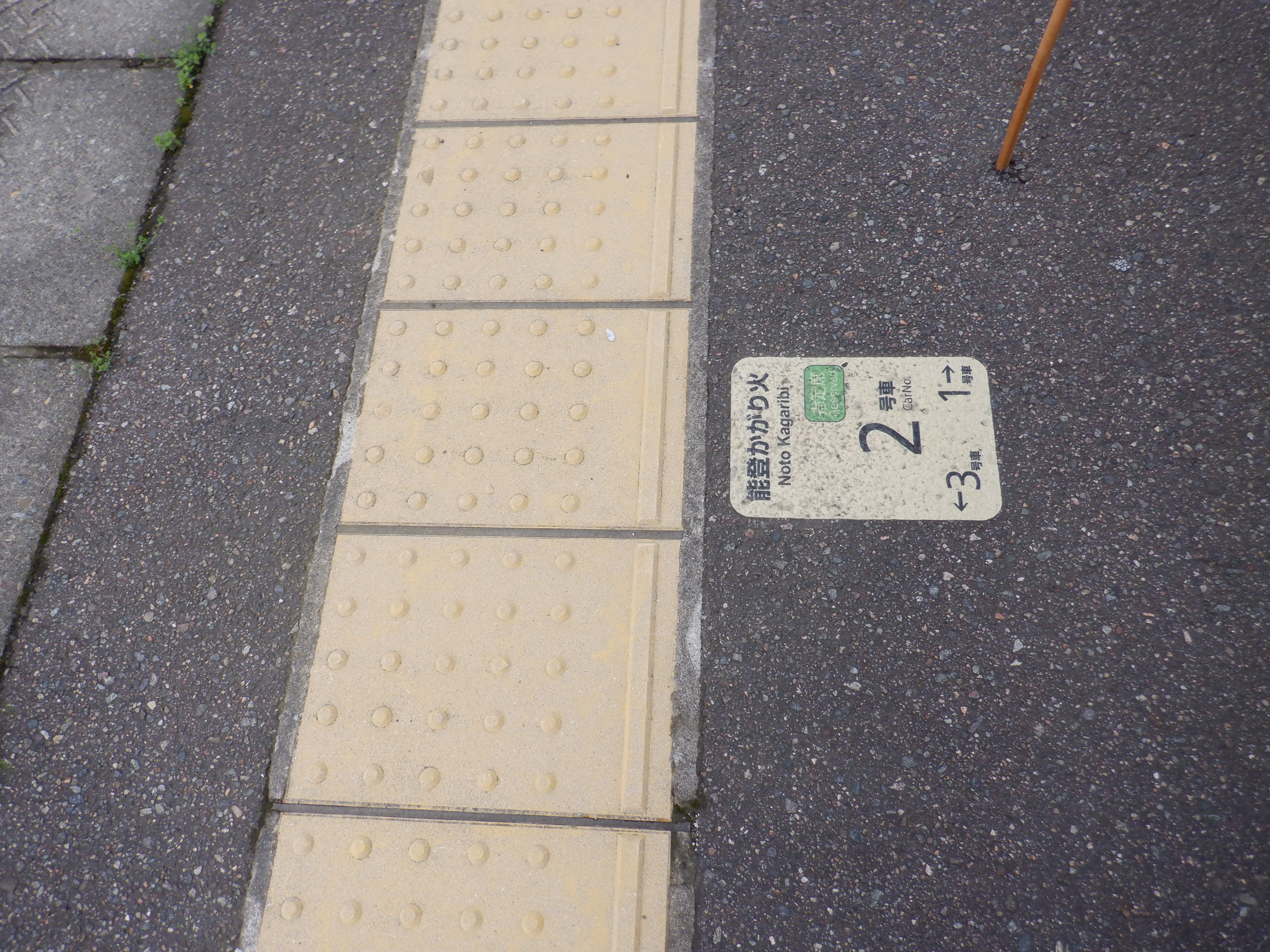 跨線橋階段下付近の能登かがり火乗車位置案内など。