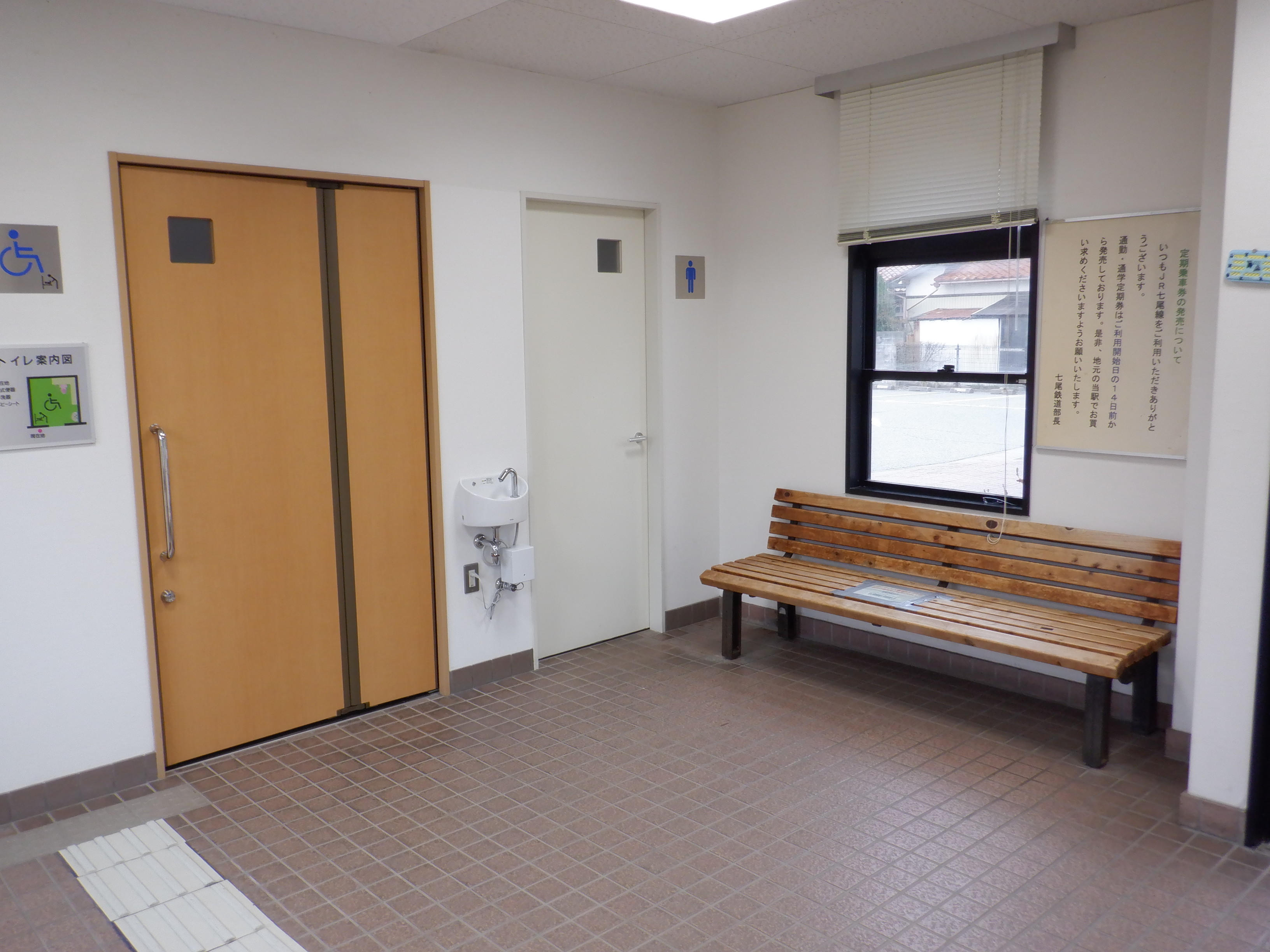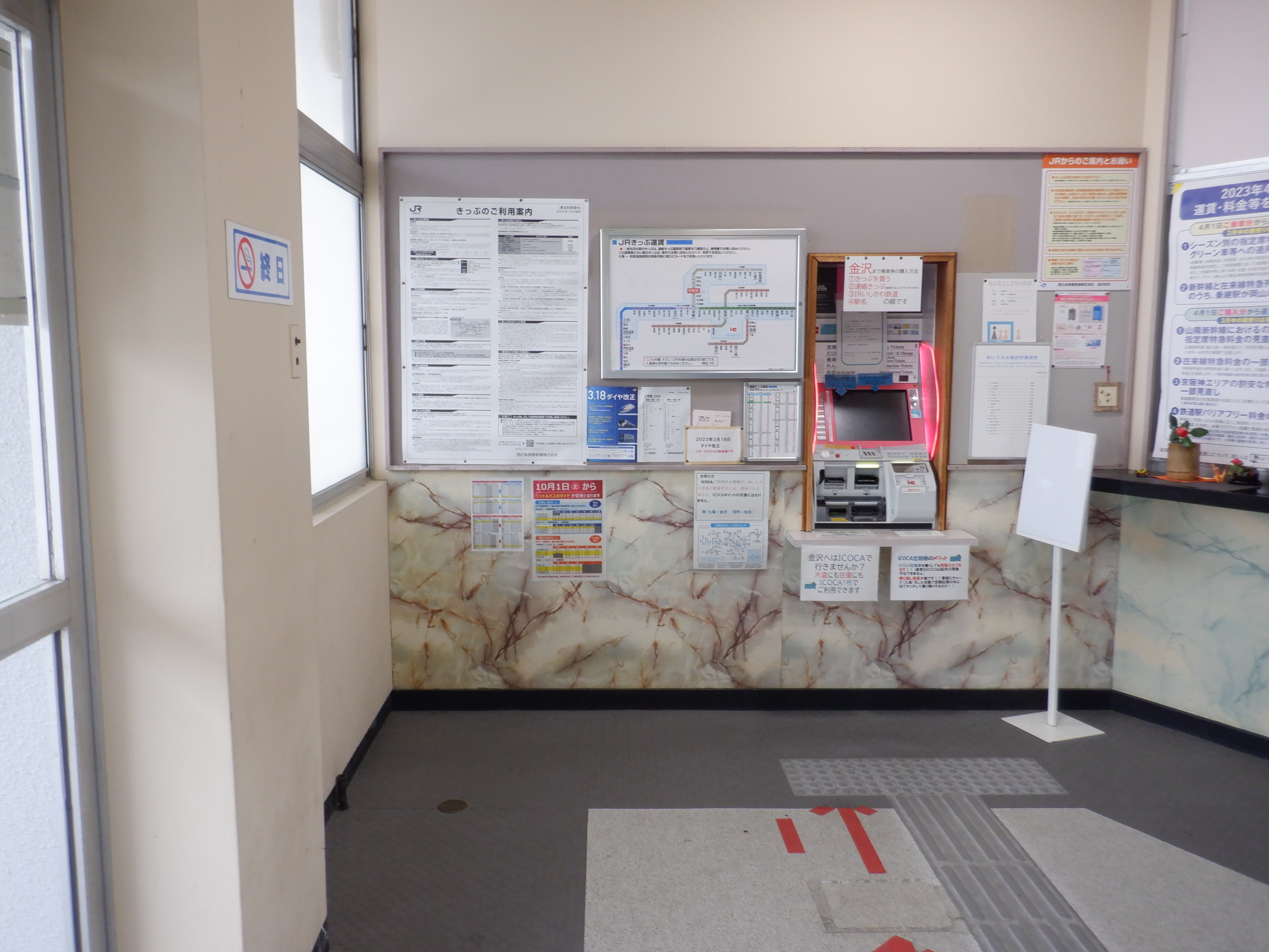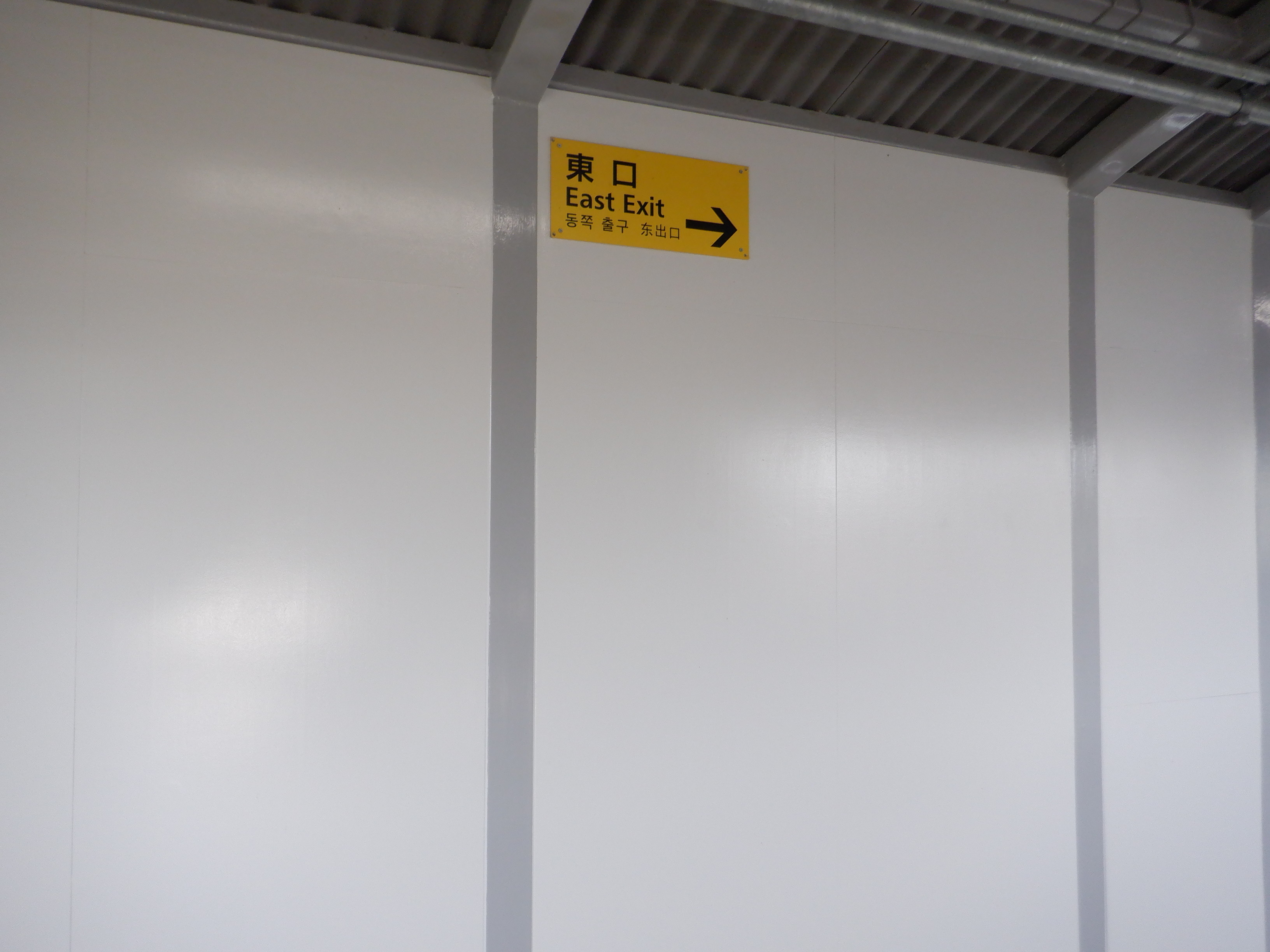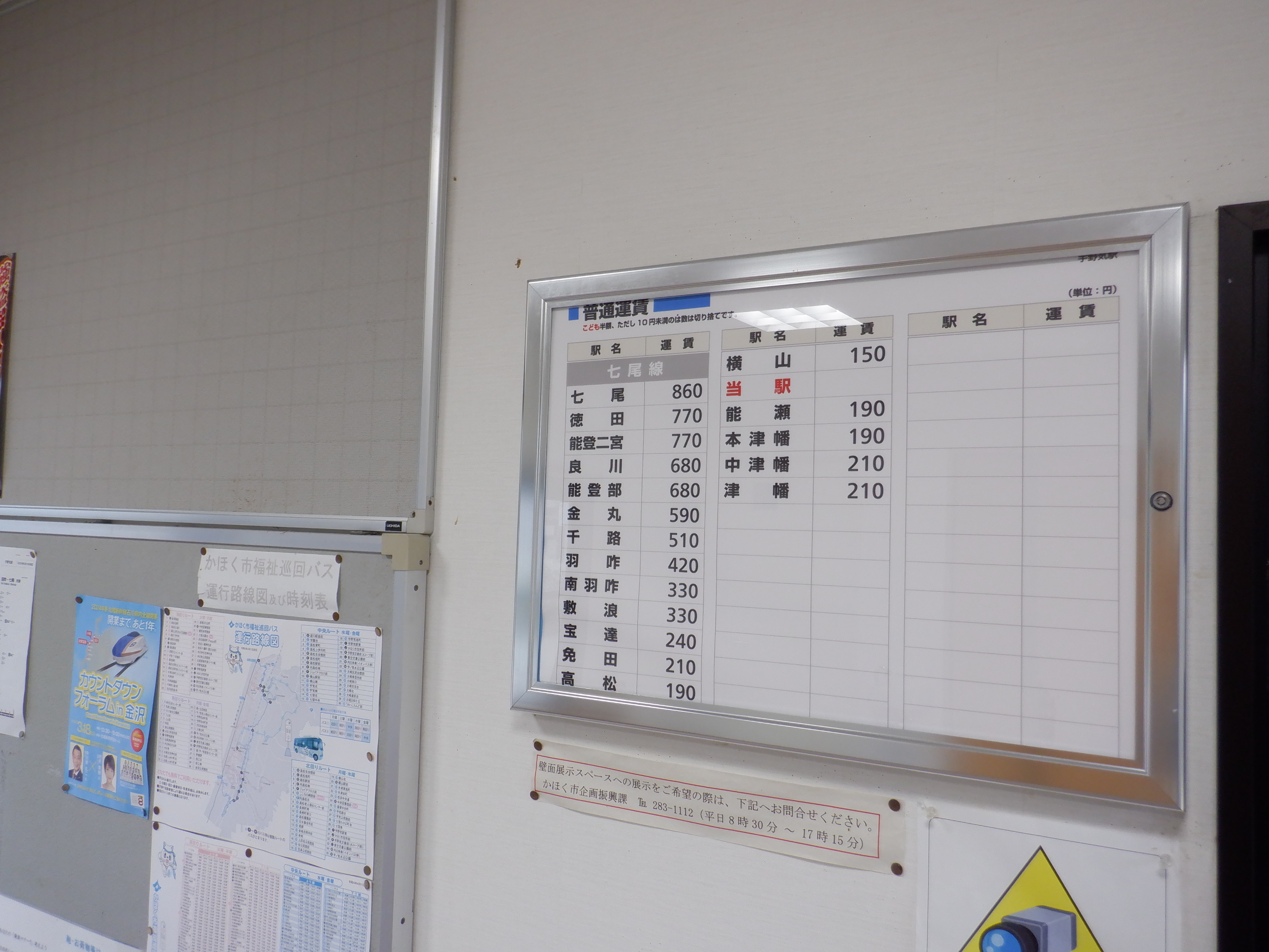 跨線橋階段下付近の能登かがり火乗車位置案内など。