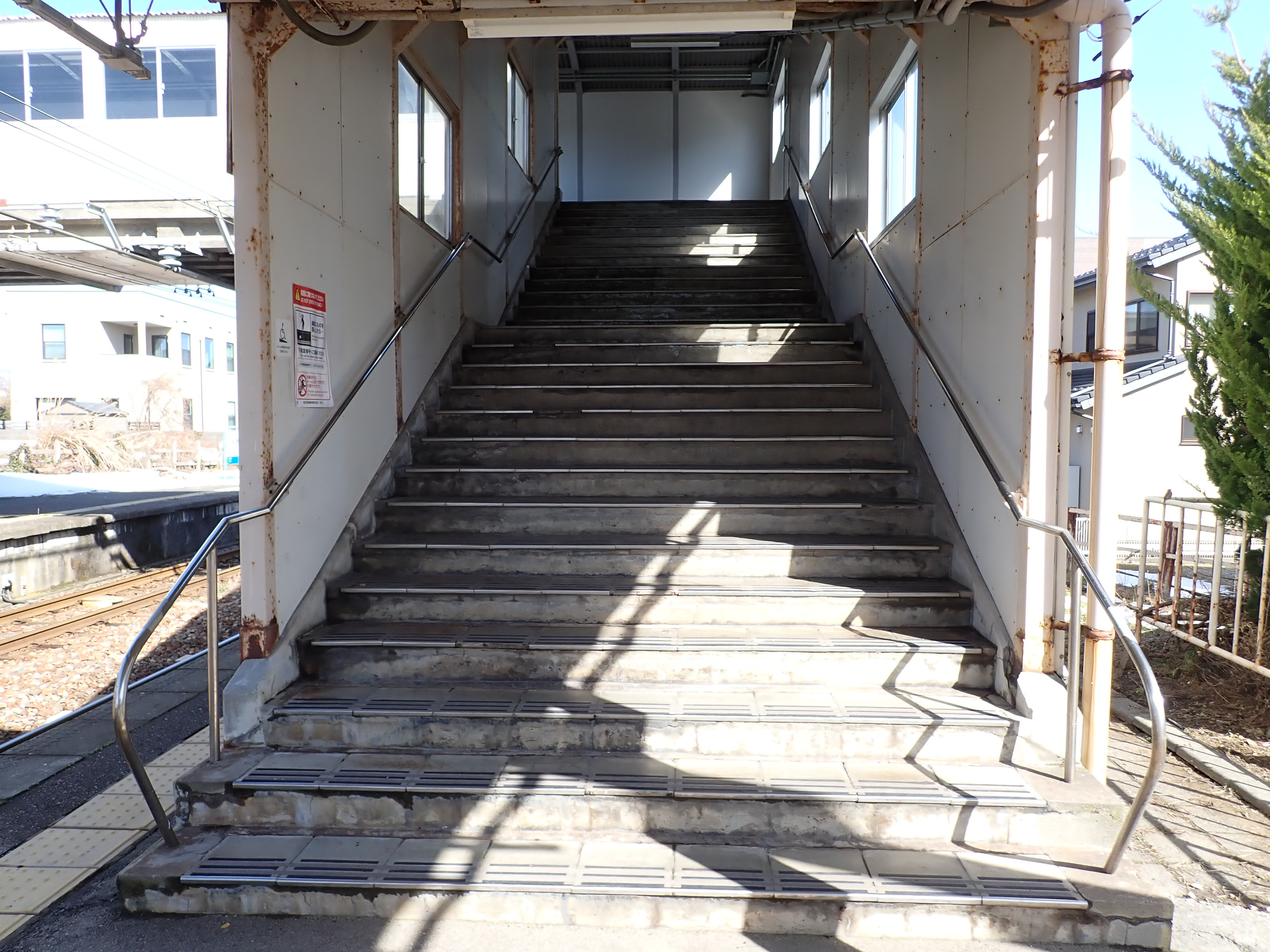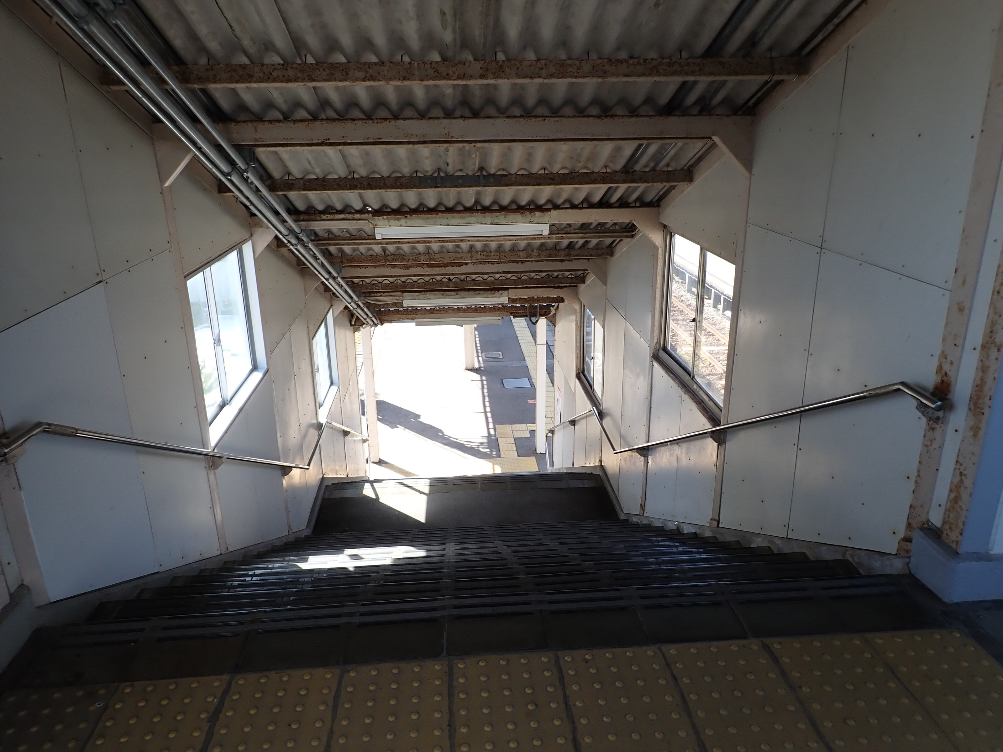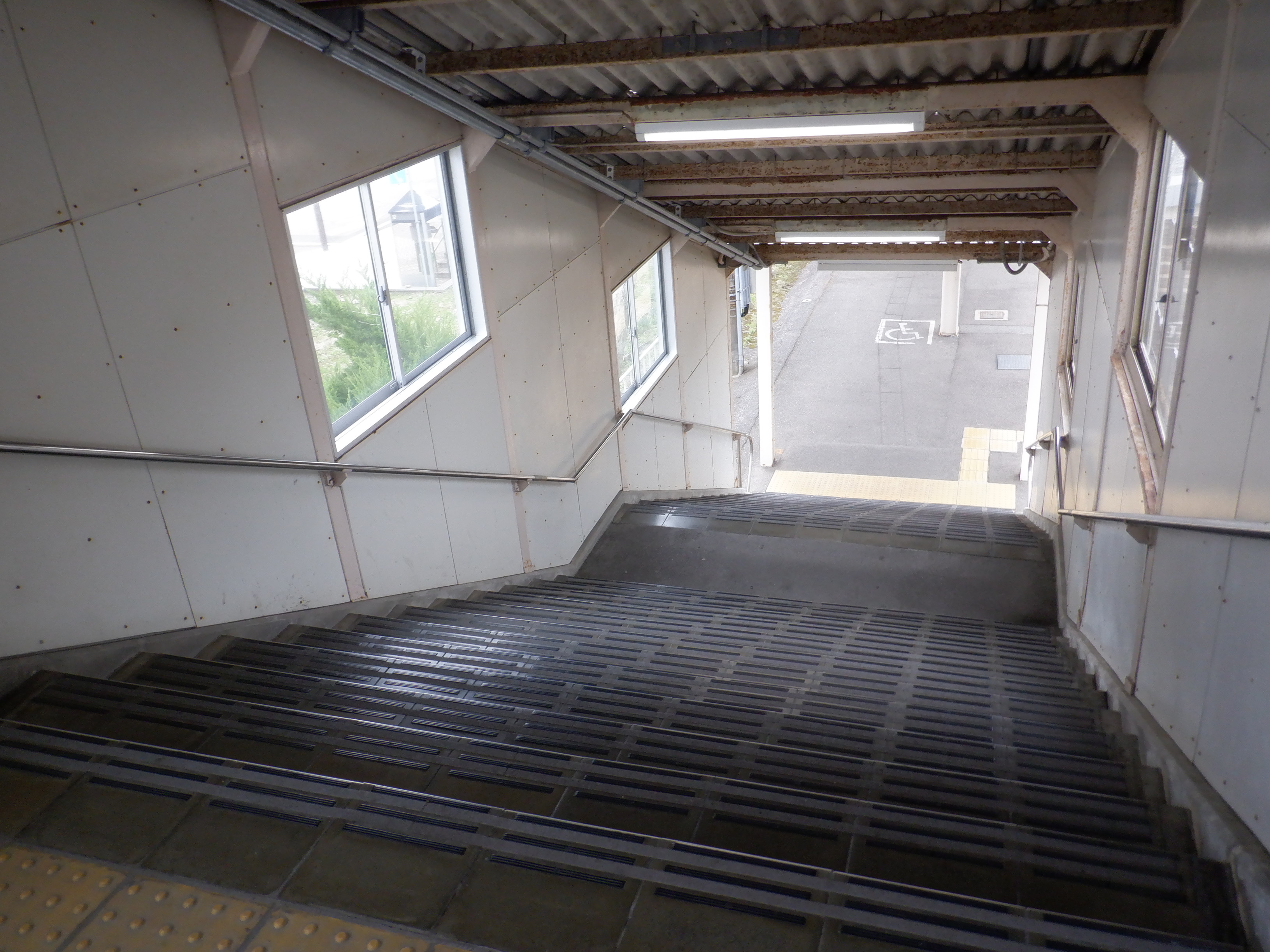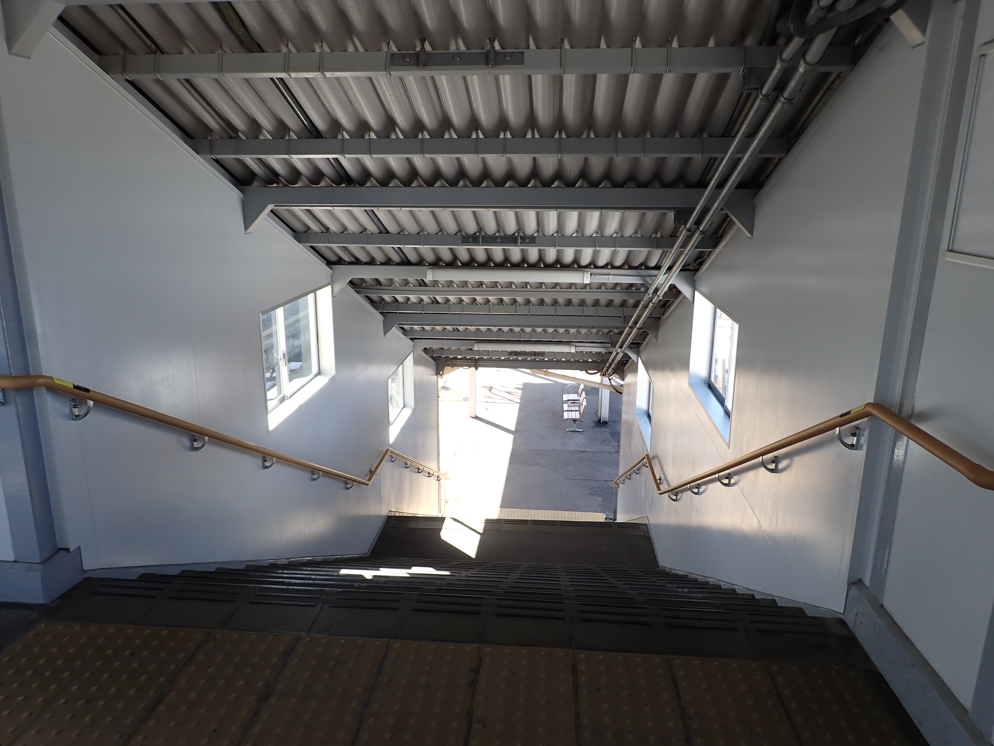 1番のりば側跨線橋階段とそこから降りていくところ。